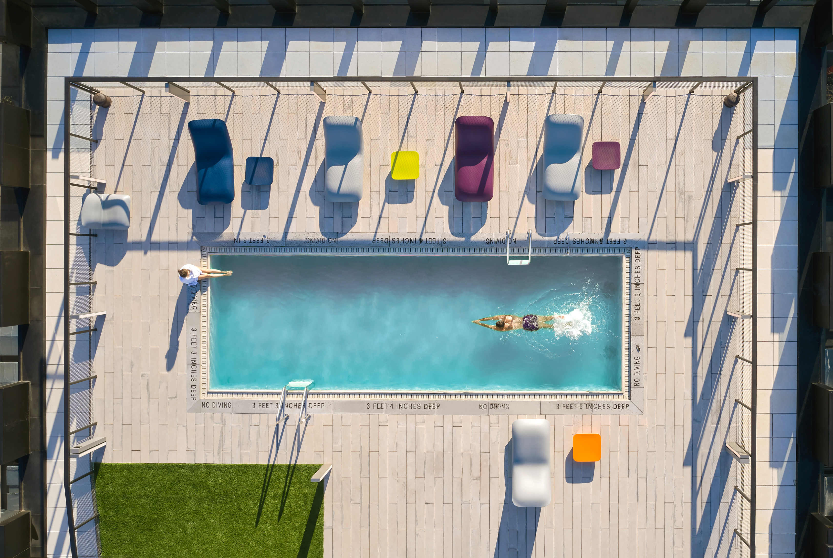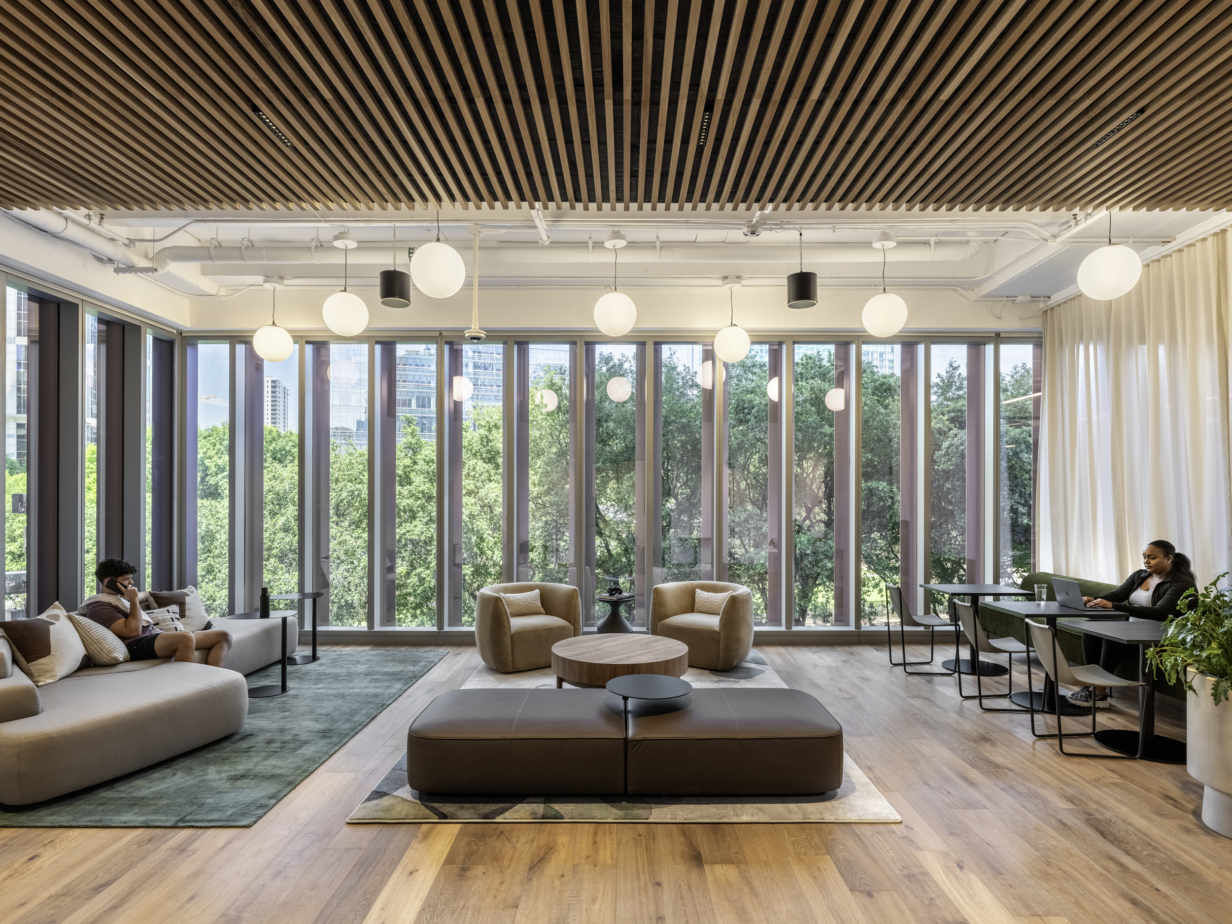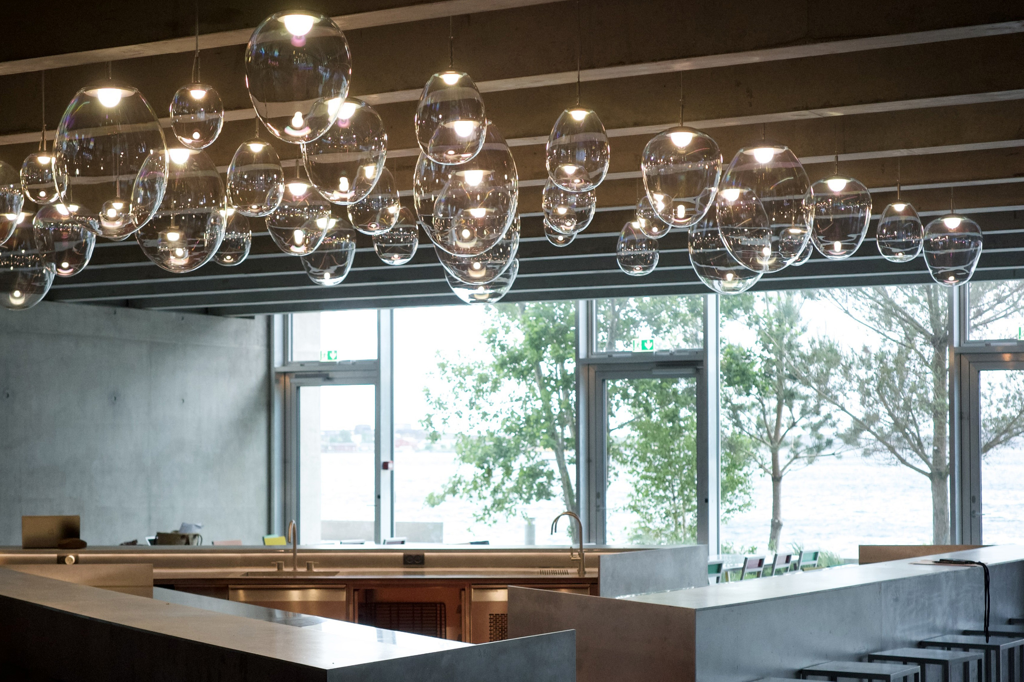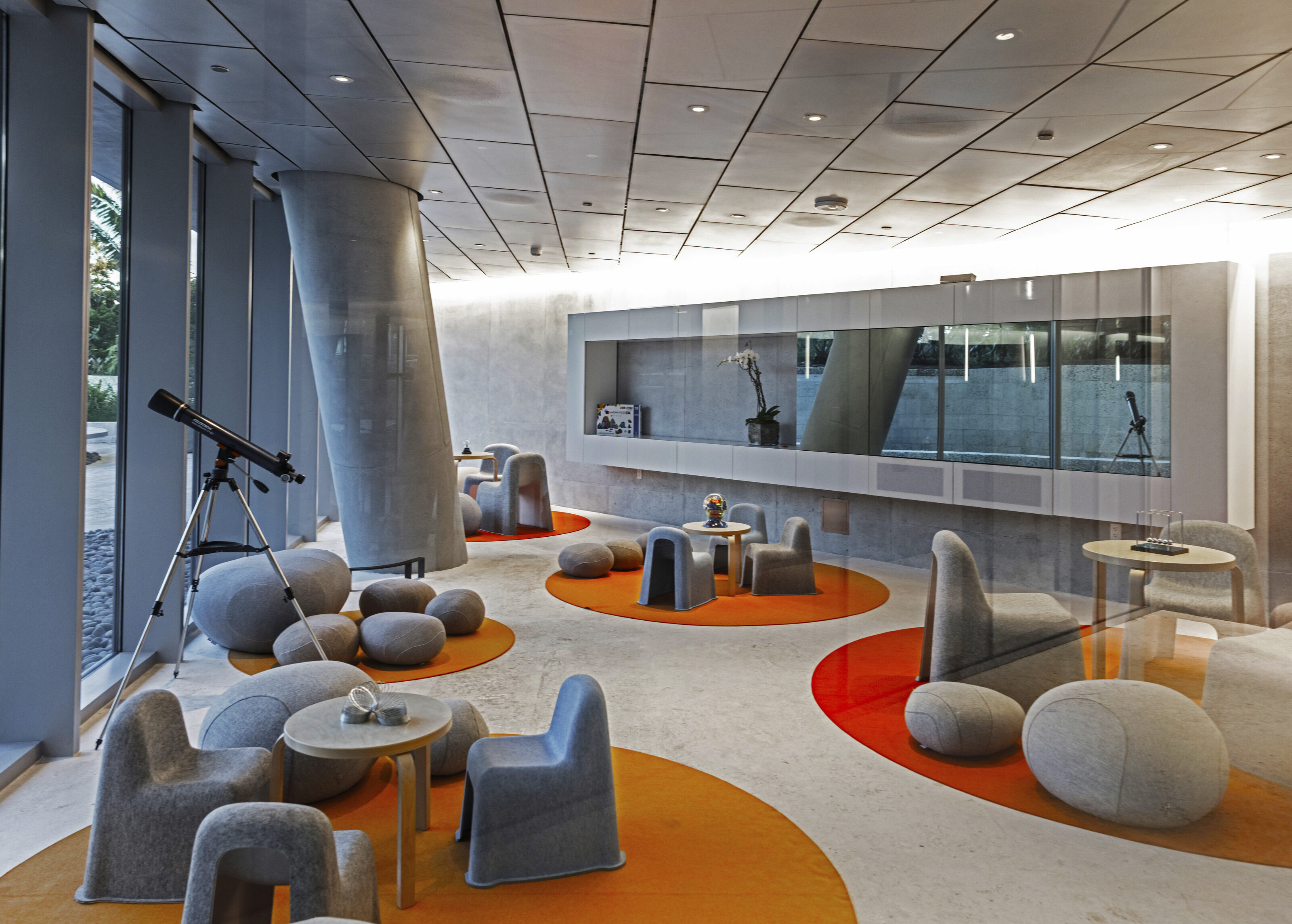 Elements often repeat and continue from one side of the space to another to reinforce the idea of space continuity: a grid of 150 Bulb fiction pendants designed by BIG Product across the north side, a grid of Artemide Alphabet of Light lights around columns throughout the space and larger pill shaped lights across all meeting rooms. Each conference room is furnished with Scoop chairs designed by BIG for Halle. The color of the chairs designates the room.