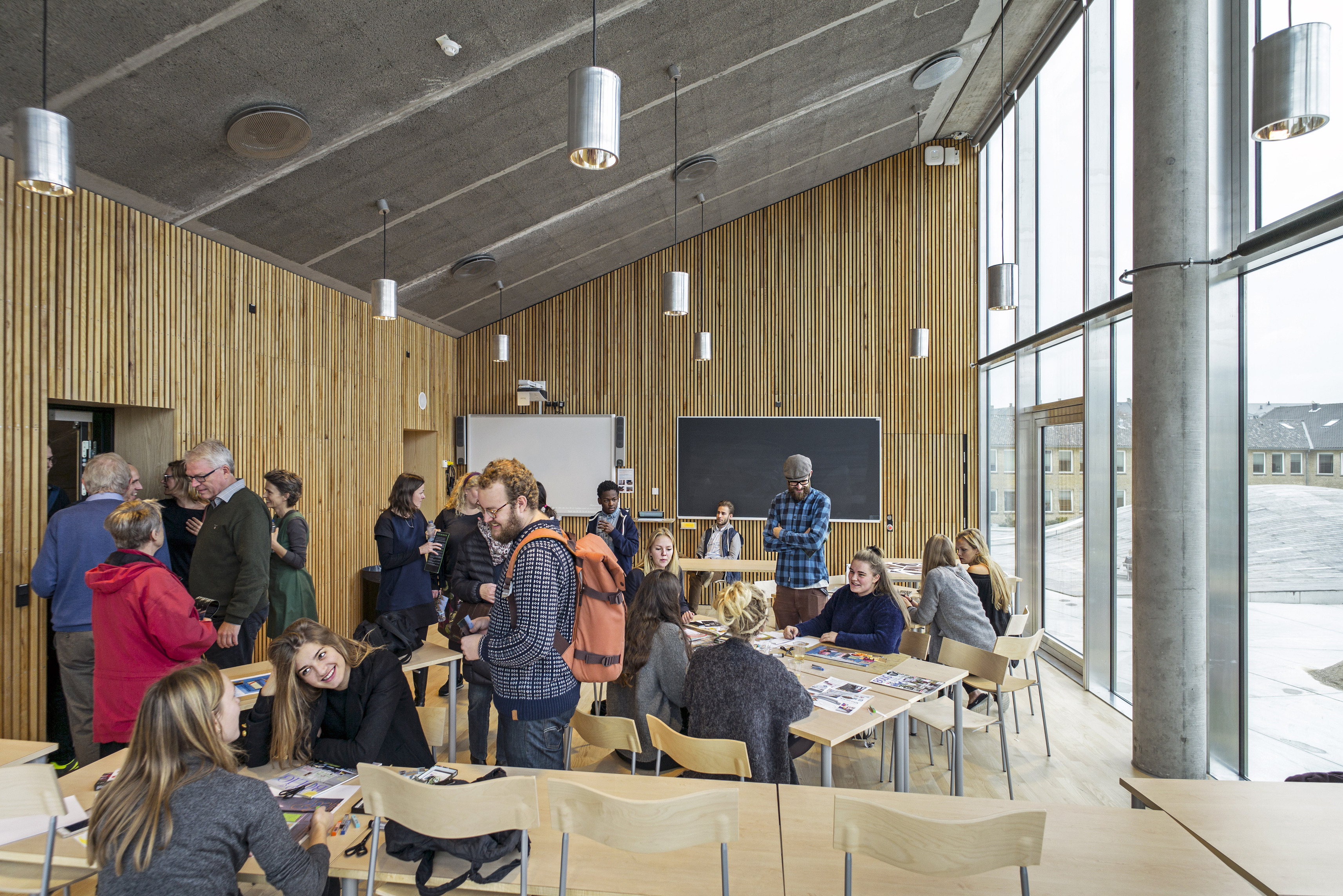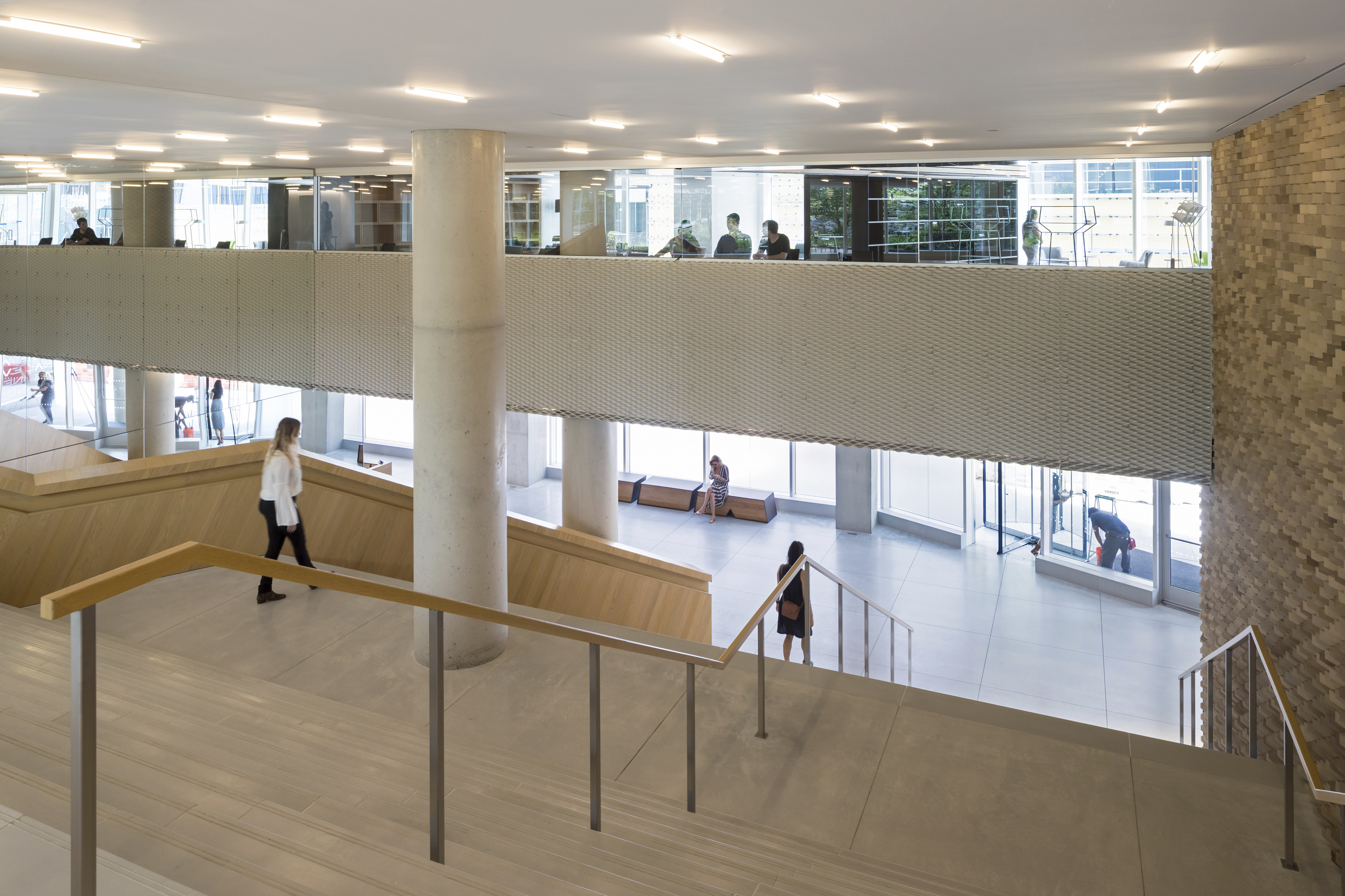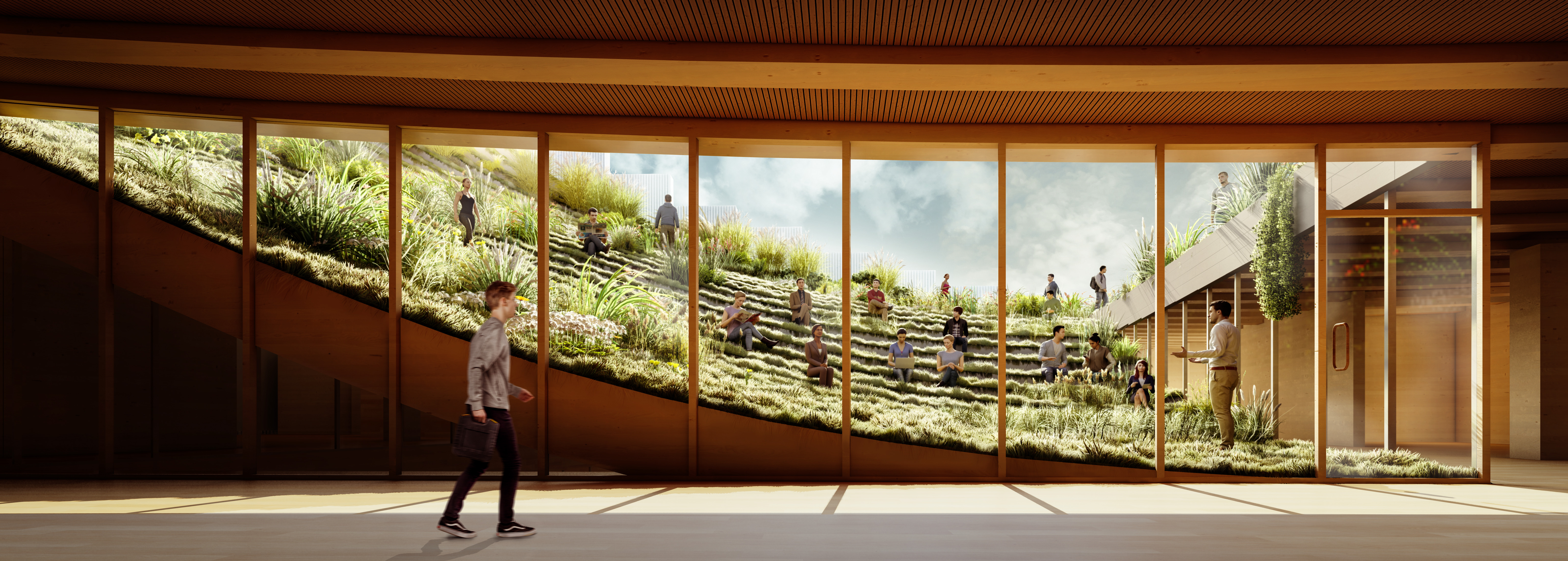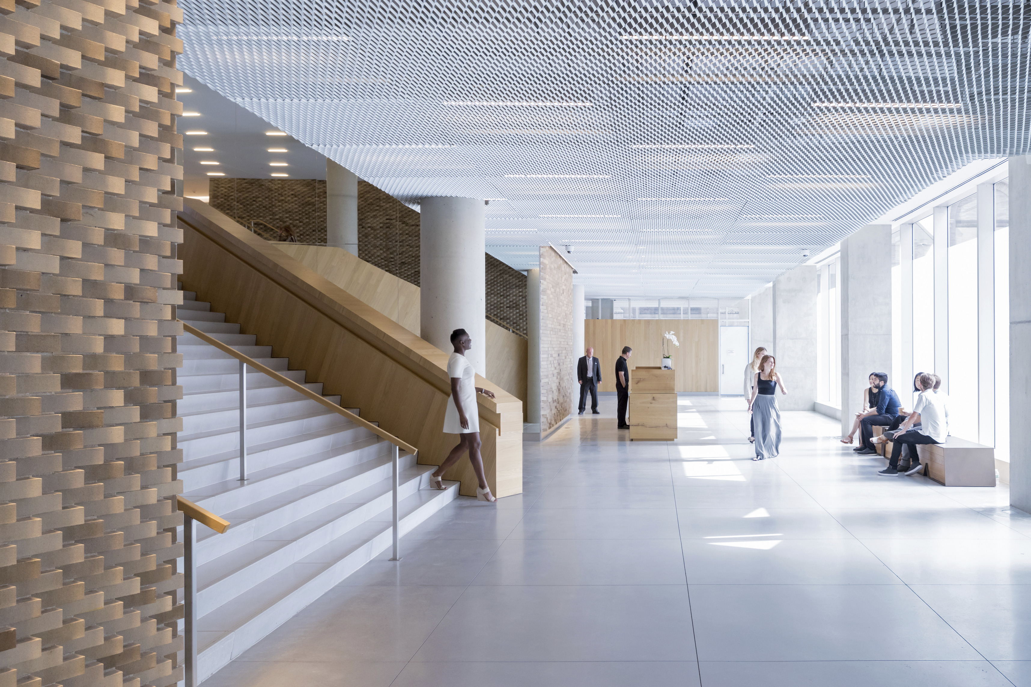 A forest of columns supports 29 “floating” cantilevered roof planes wrapped in glass shapes an interior that blurs the boundary between indoors and out. Shaped through in-depth research into the students’ needs, the building is transparent by design, welcoming daylight from all sides and offering views into the ever-changing mosaic of student life within.