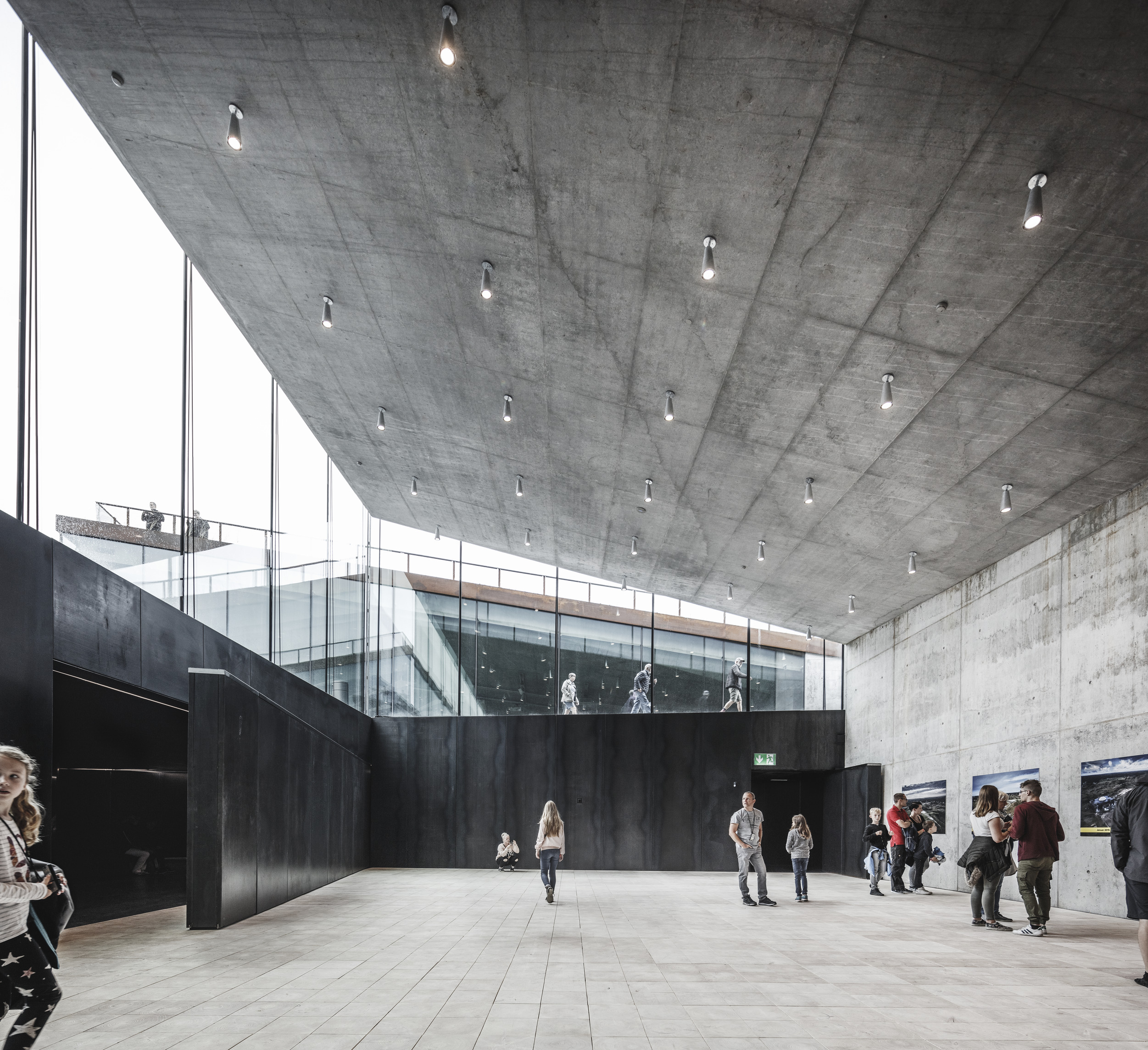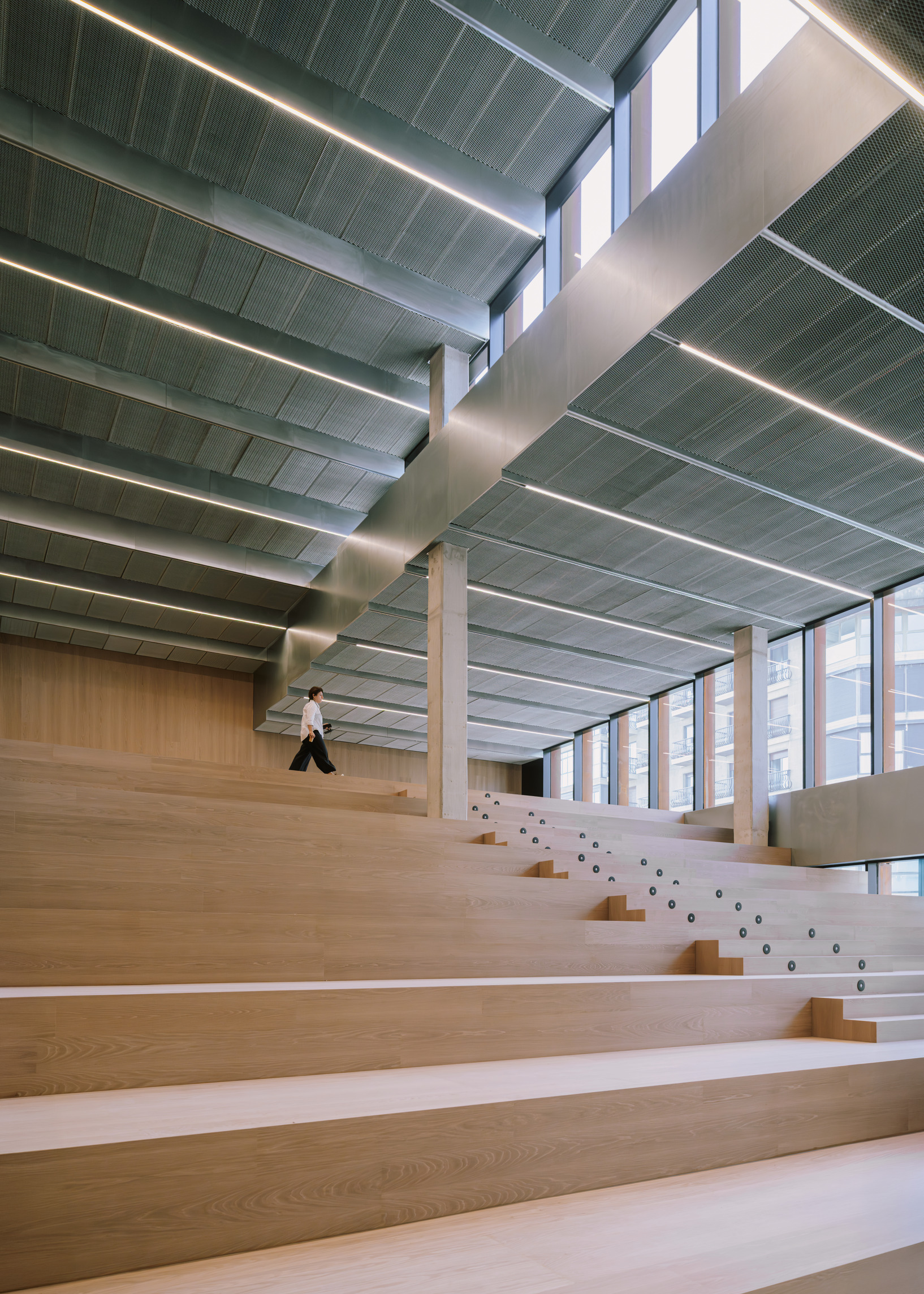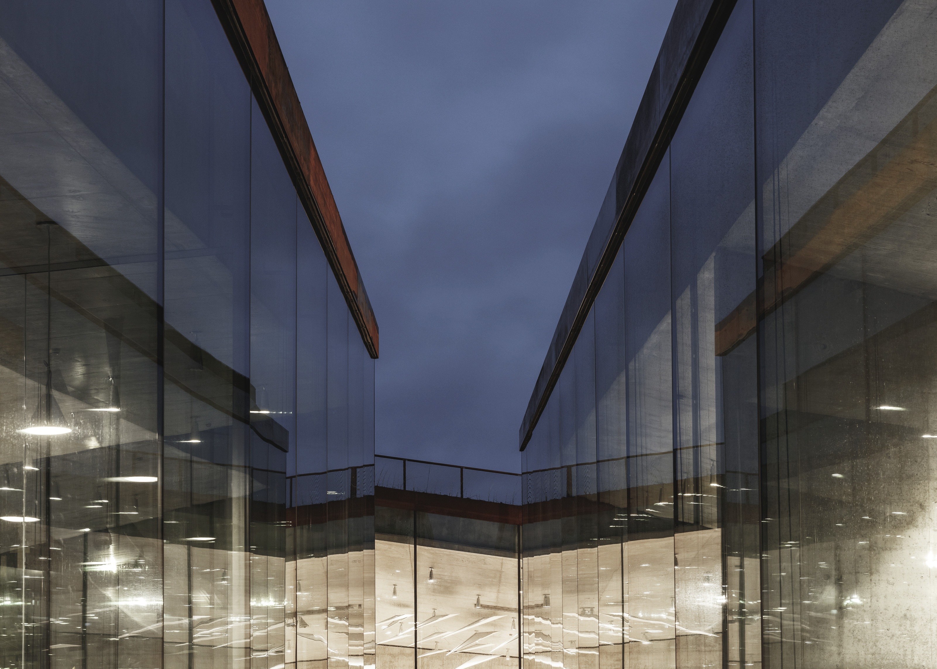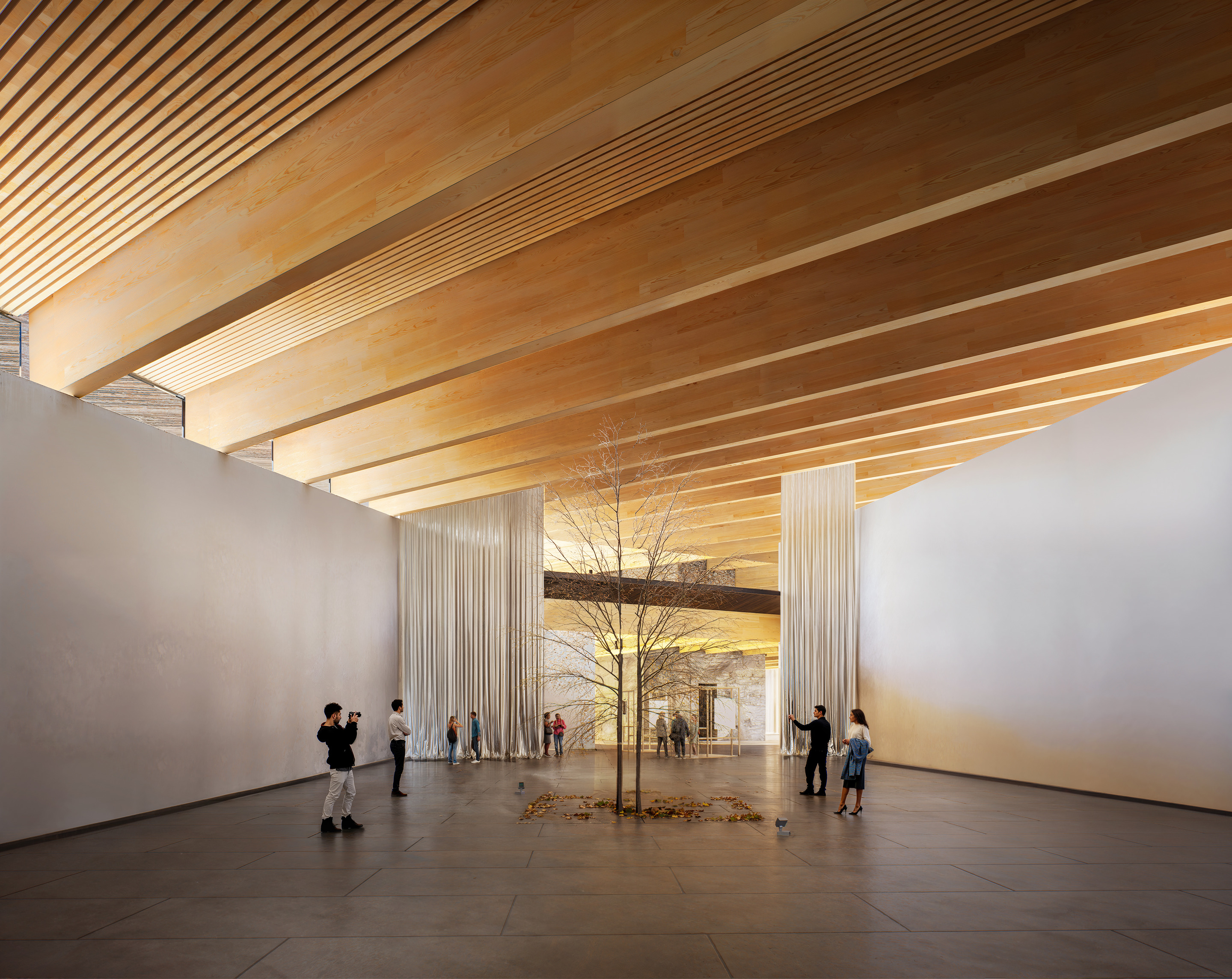 Inside, natural light enters through clerestories and skylights, animating the galleries with a play of shadow and reflection.