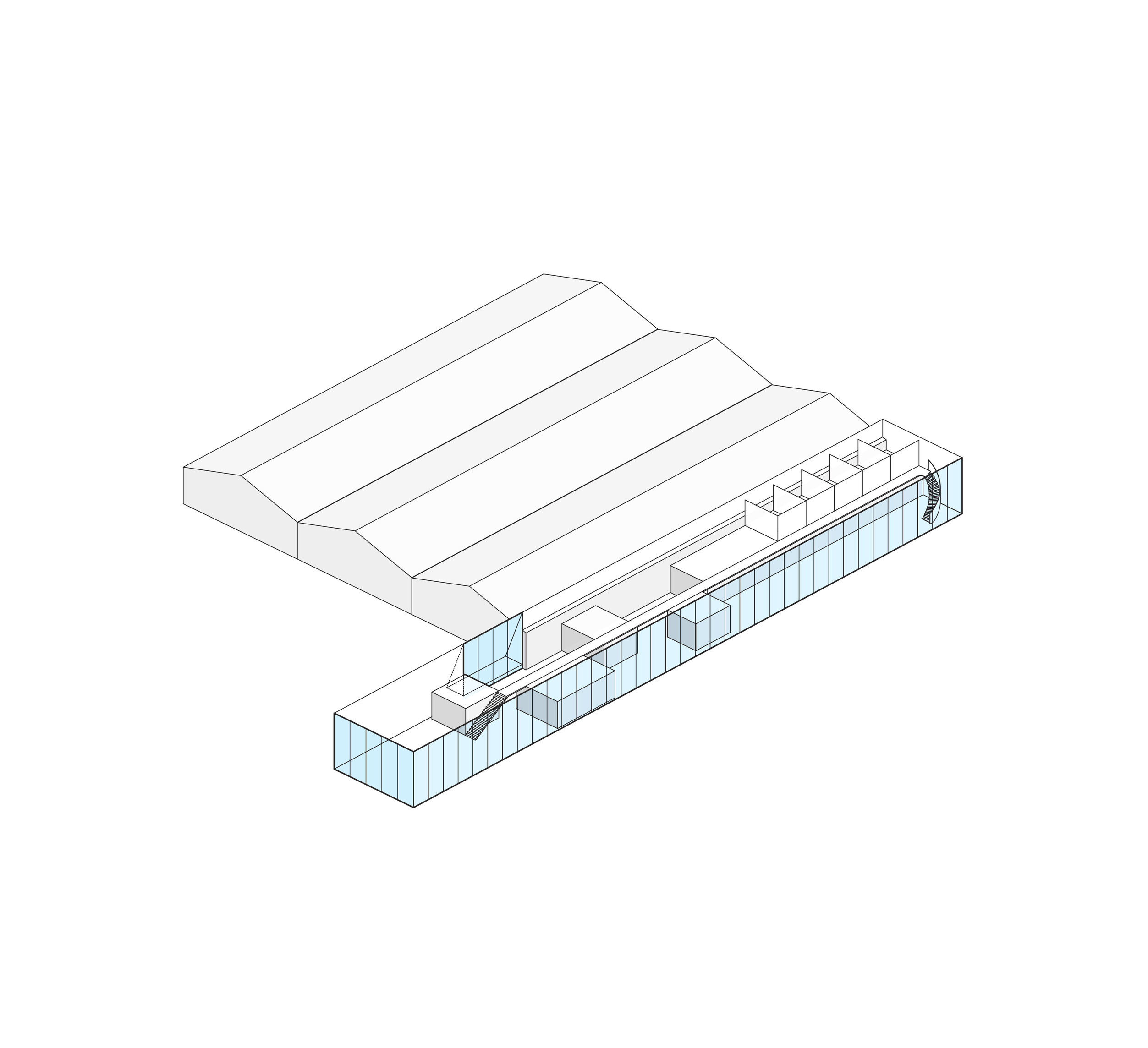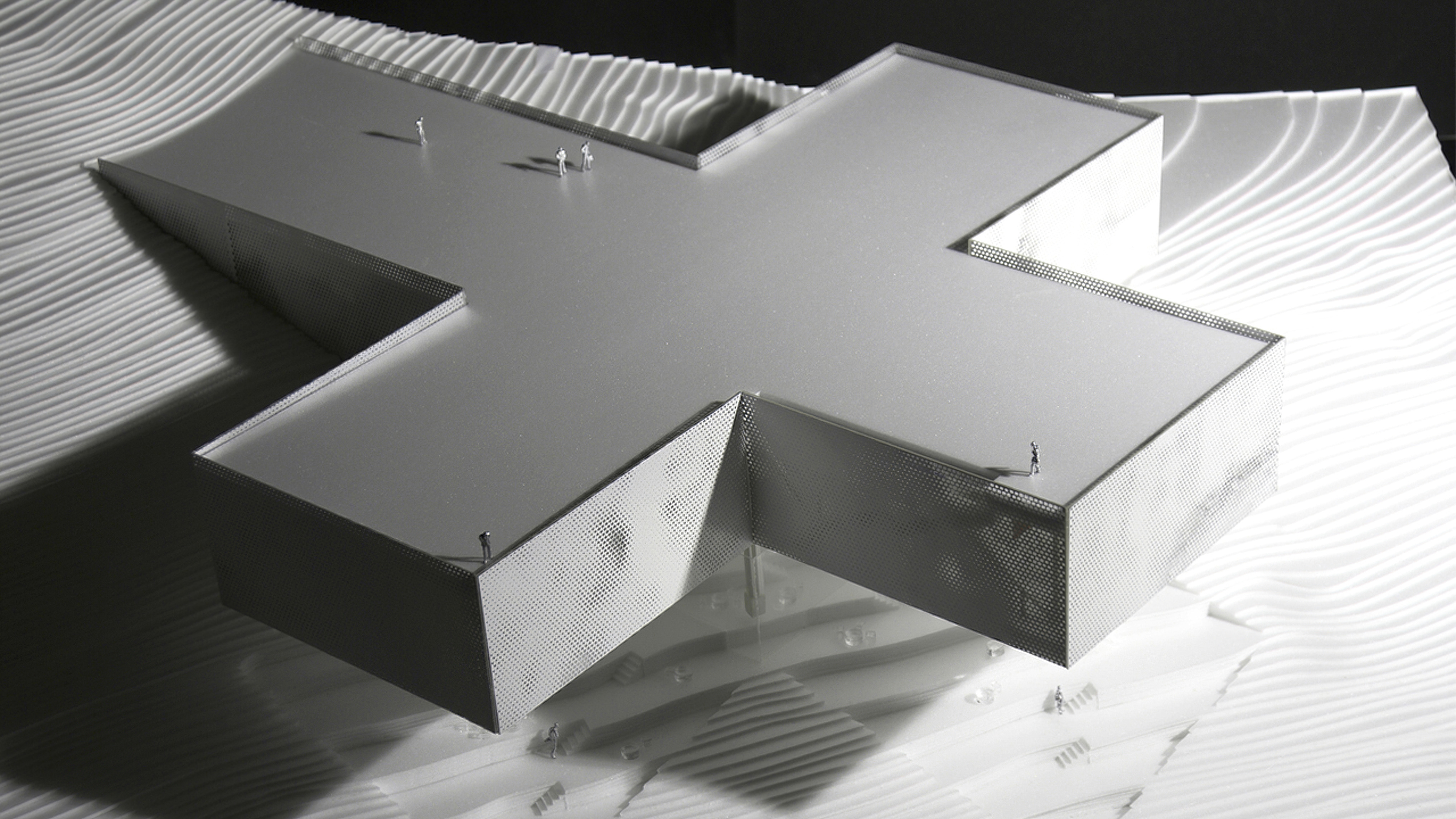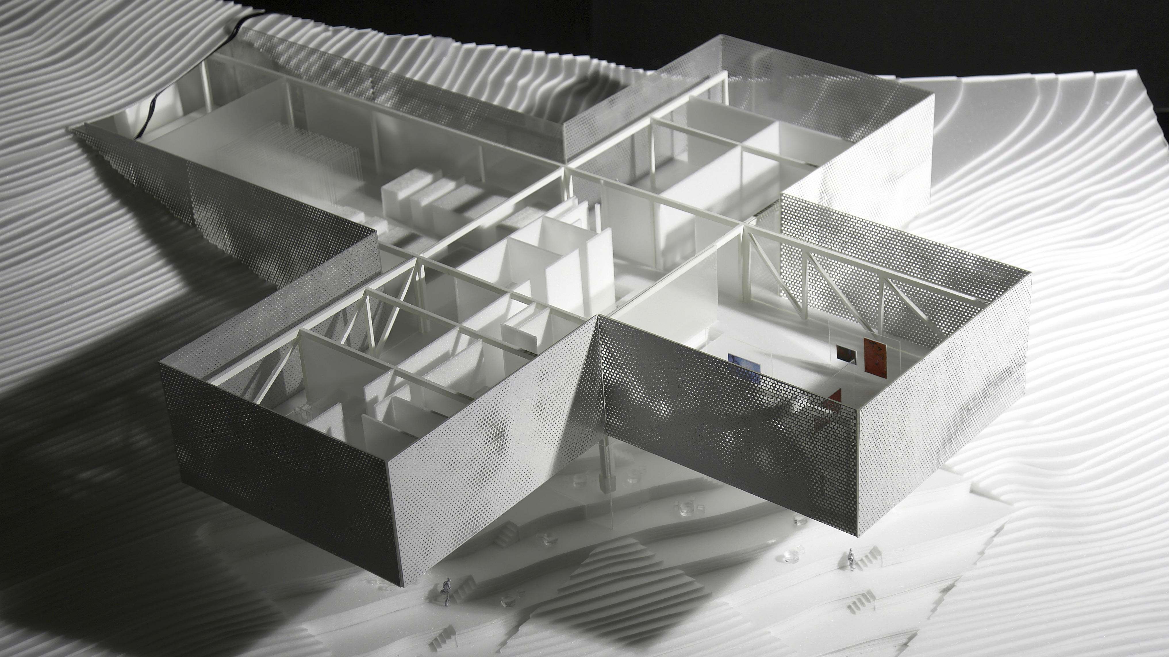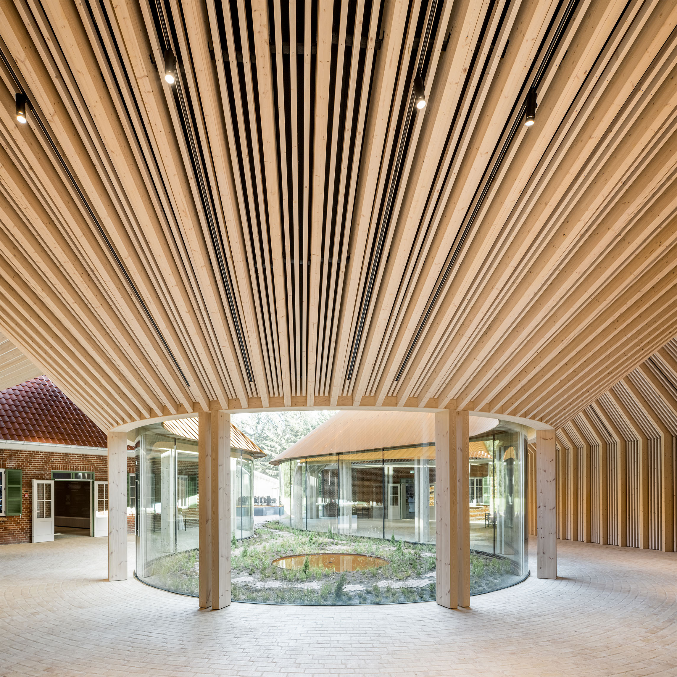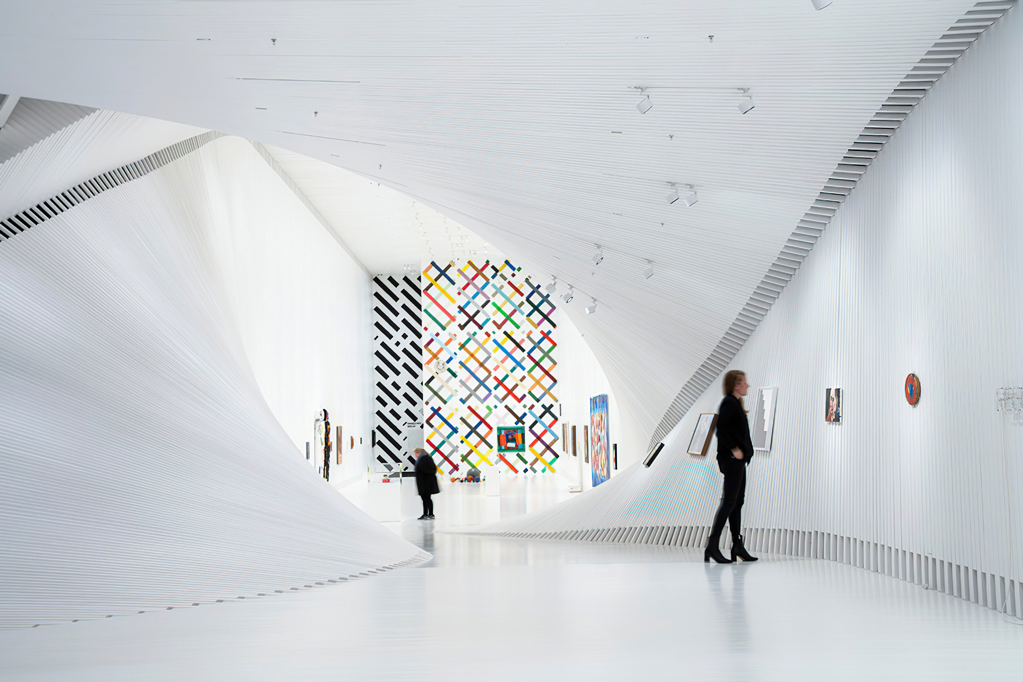 Inside, natural light enters through clerestories and skylights, animating the galleries with a play of shadow and reflection.