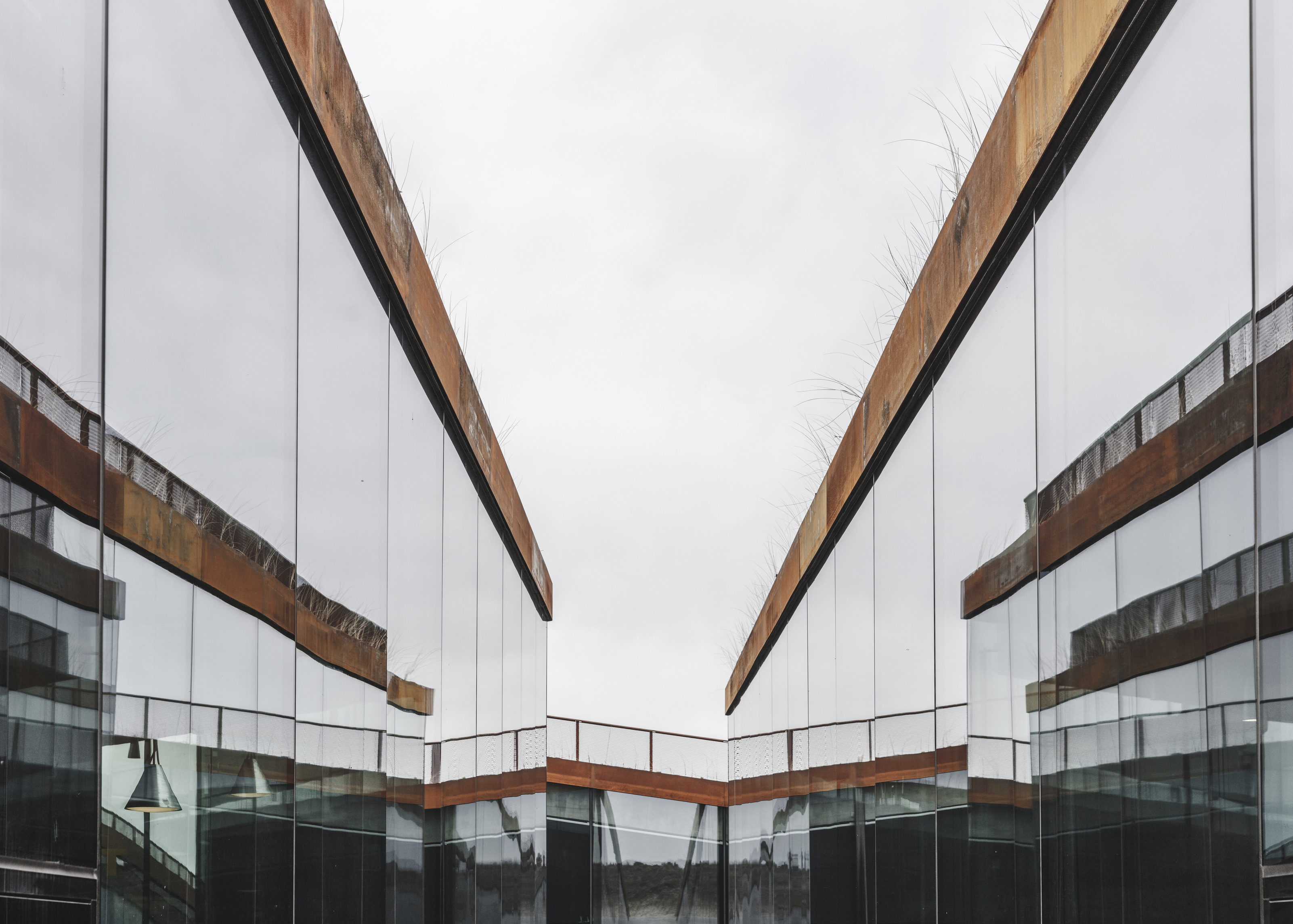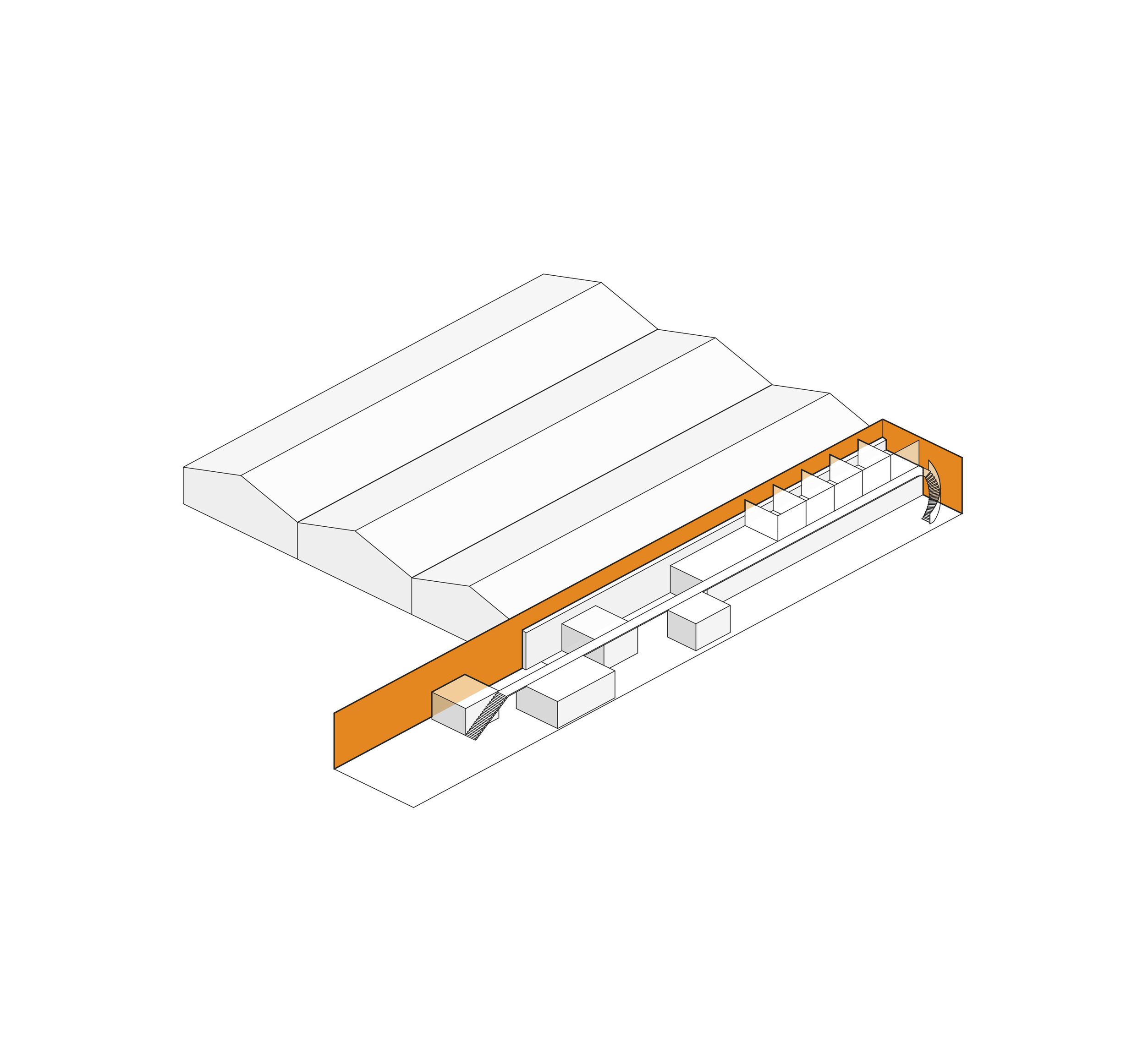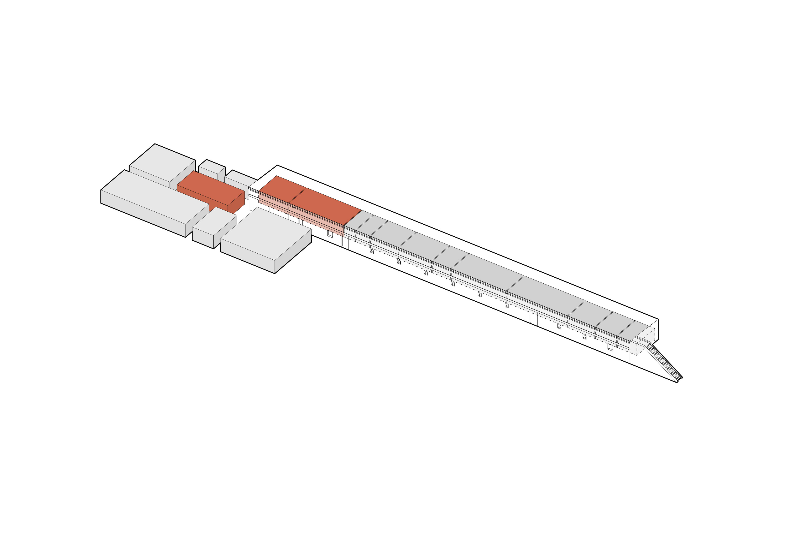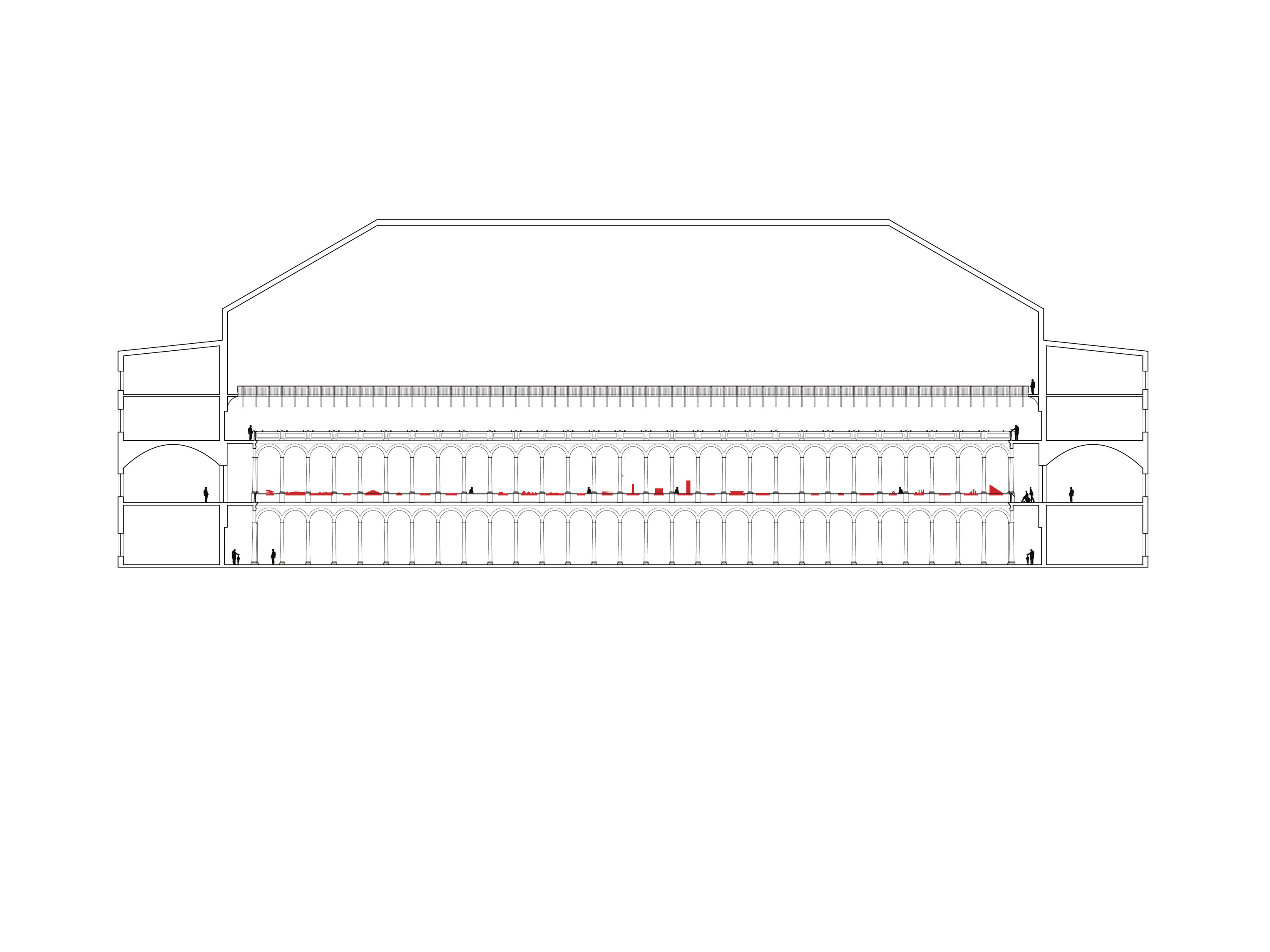 Inside, natural light enters through clerestories and skylights, animating the galleries with a play of shadow and reflection.
