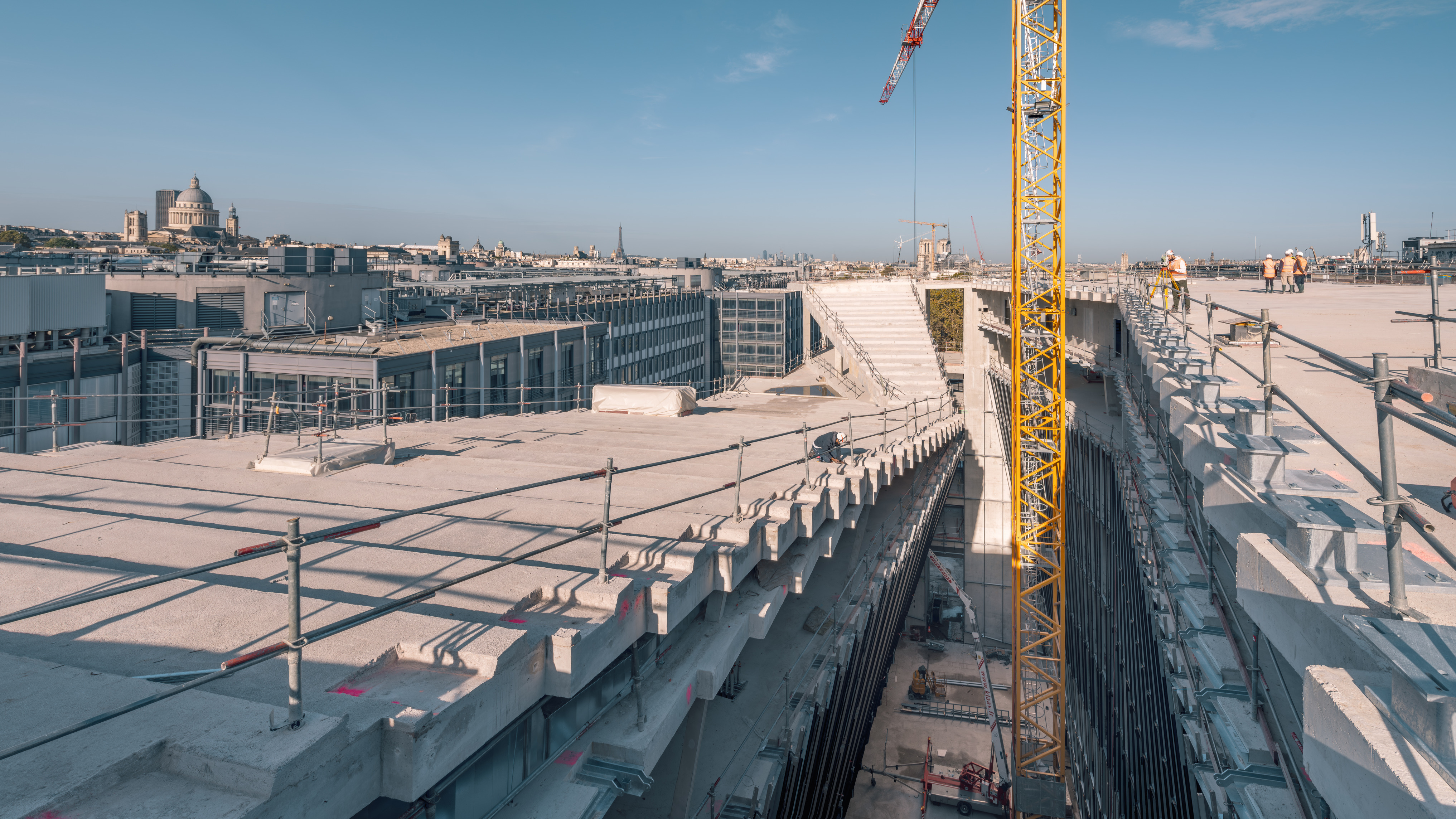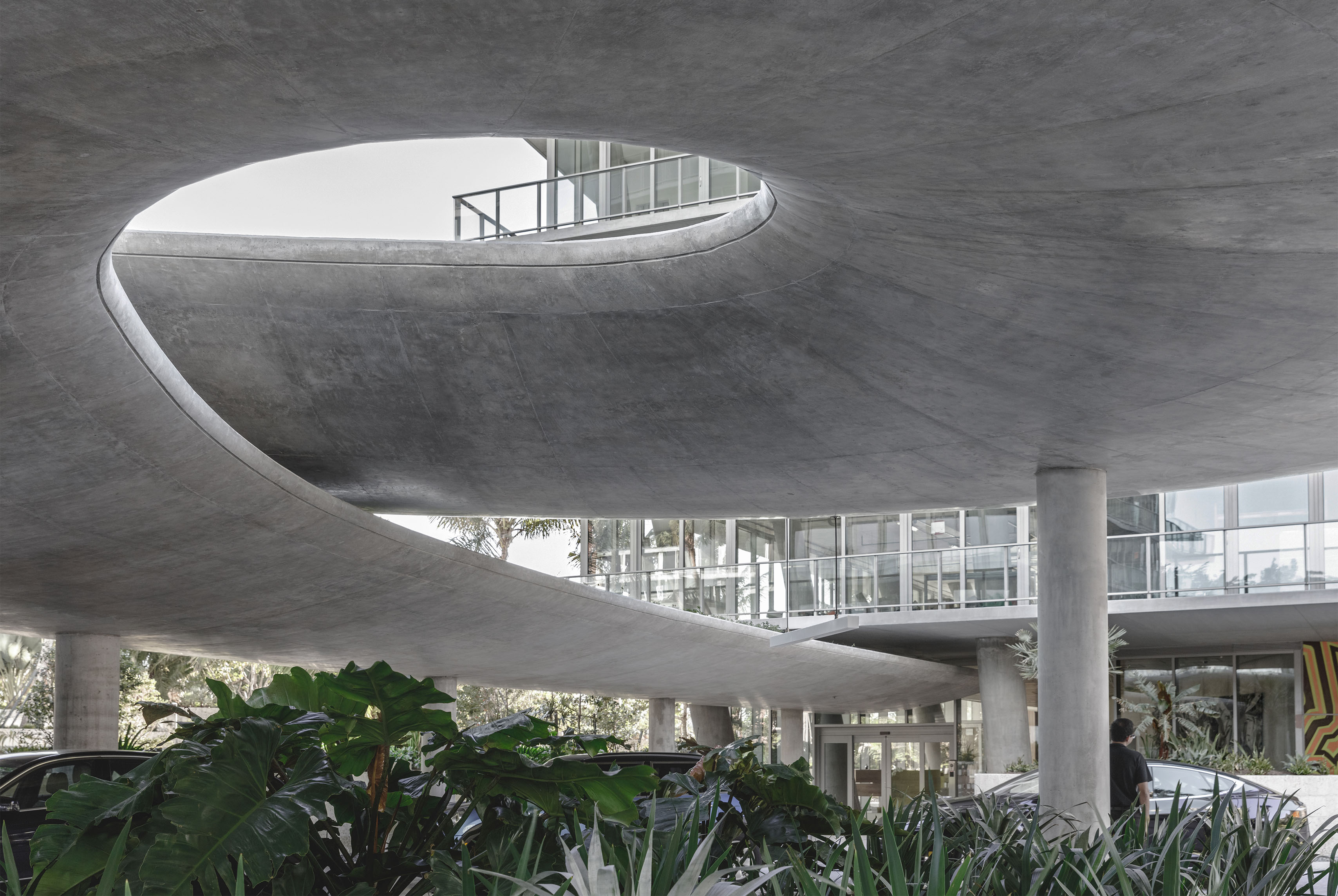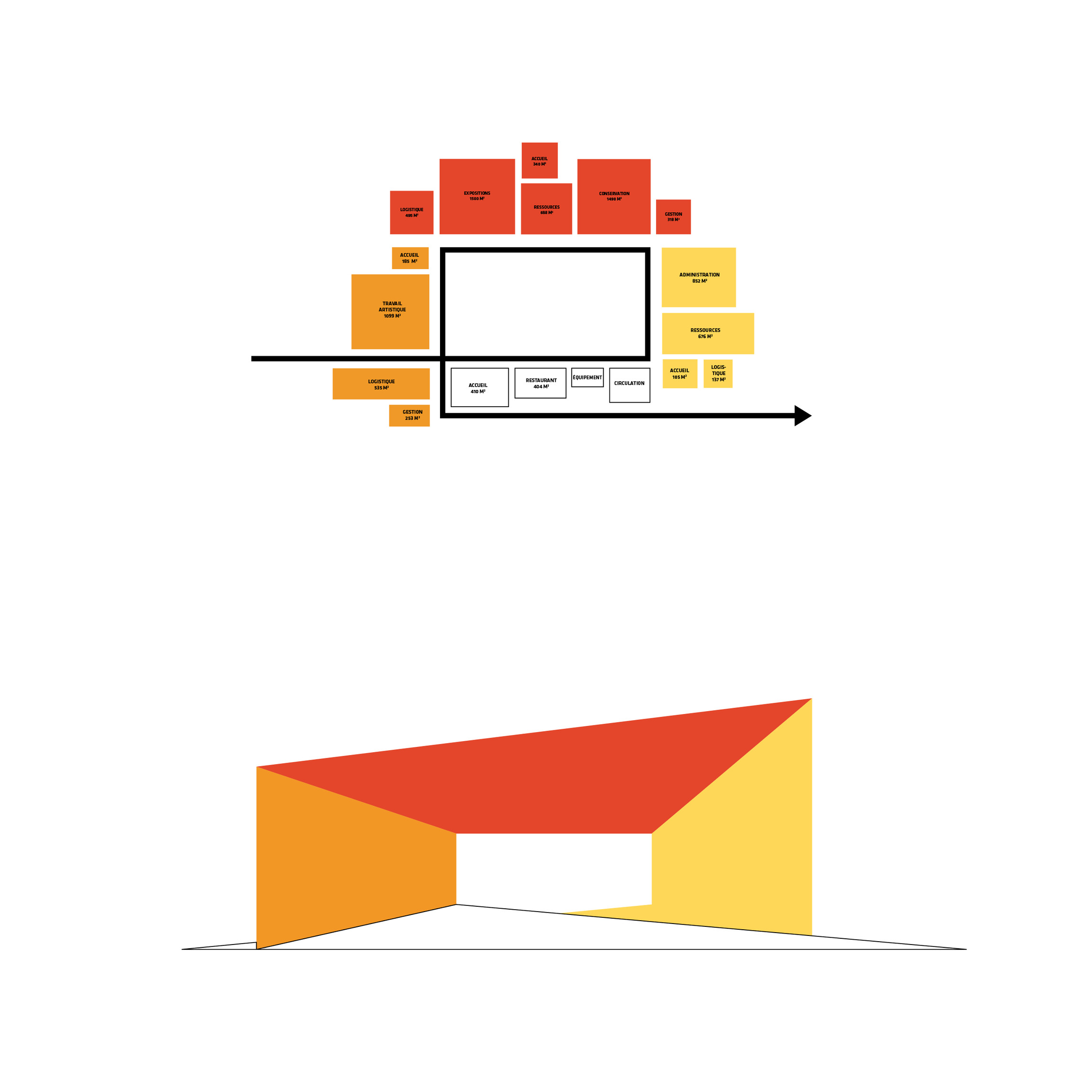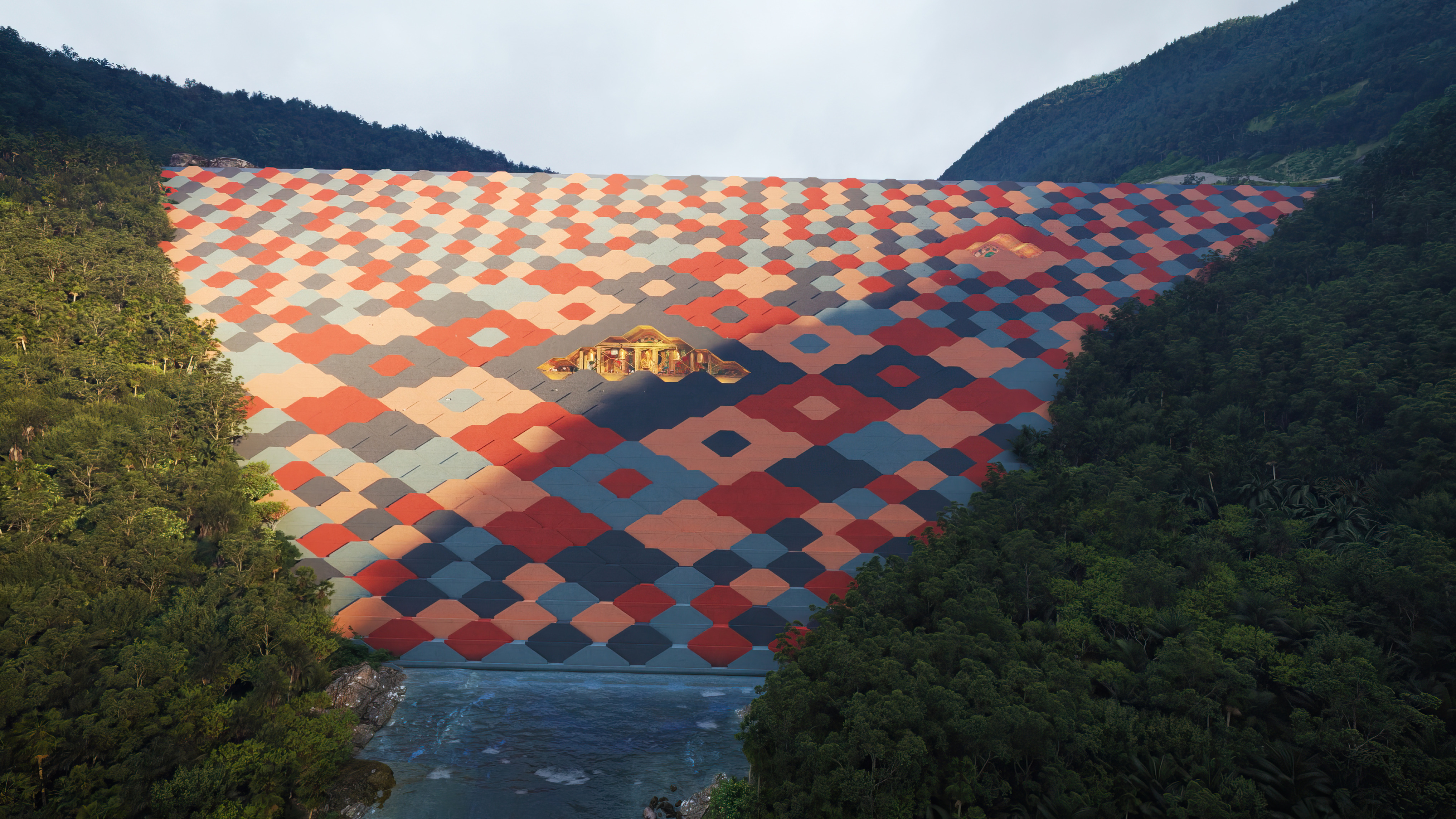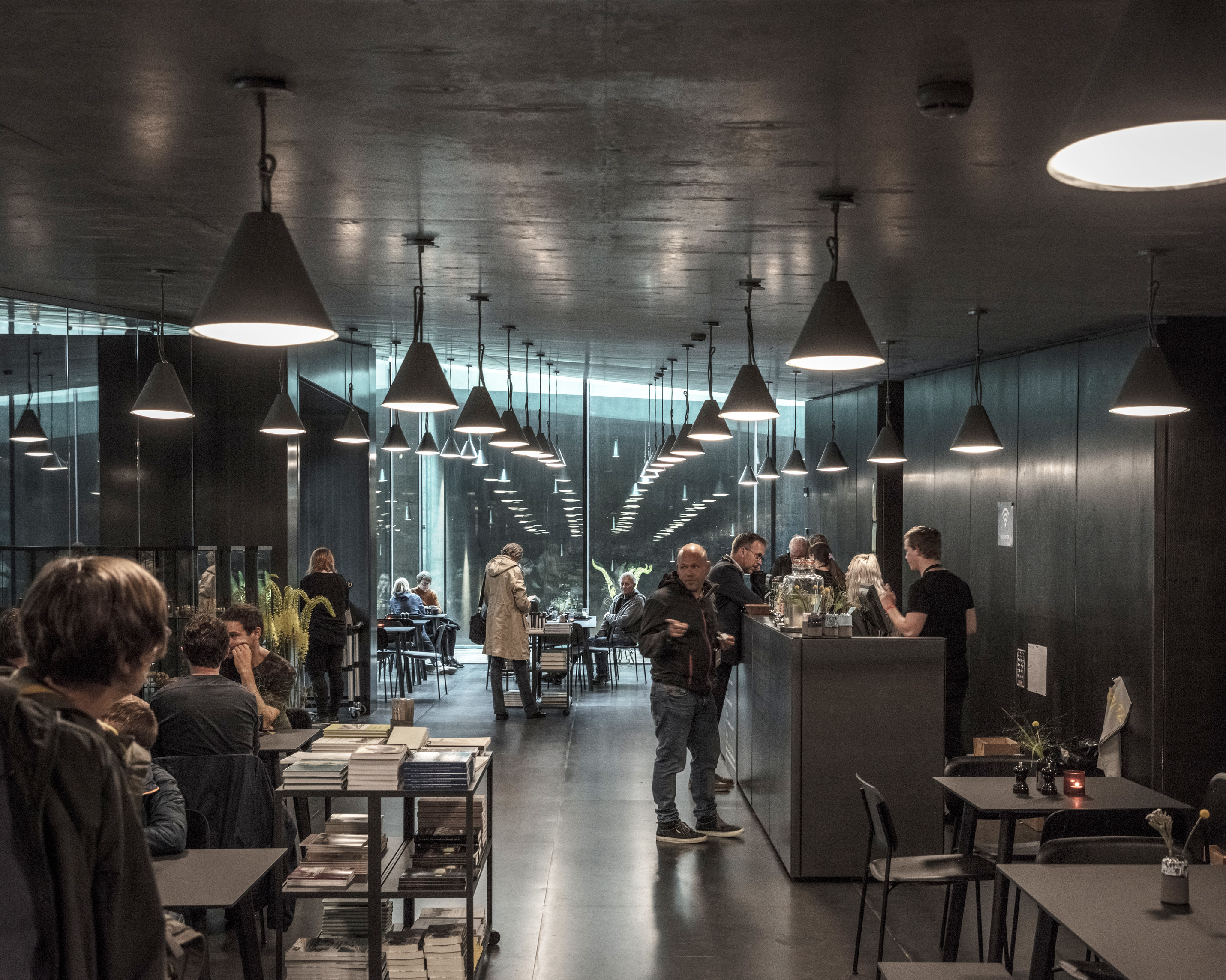 Inside, natural light enters through clerestories and skylights, animating the galleries with a play of shadow and reflection.