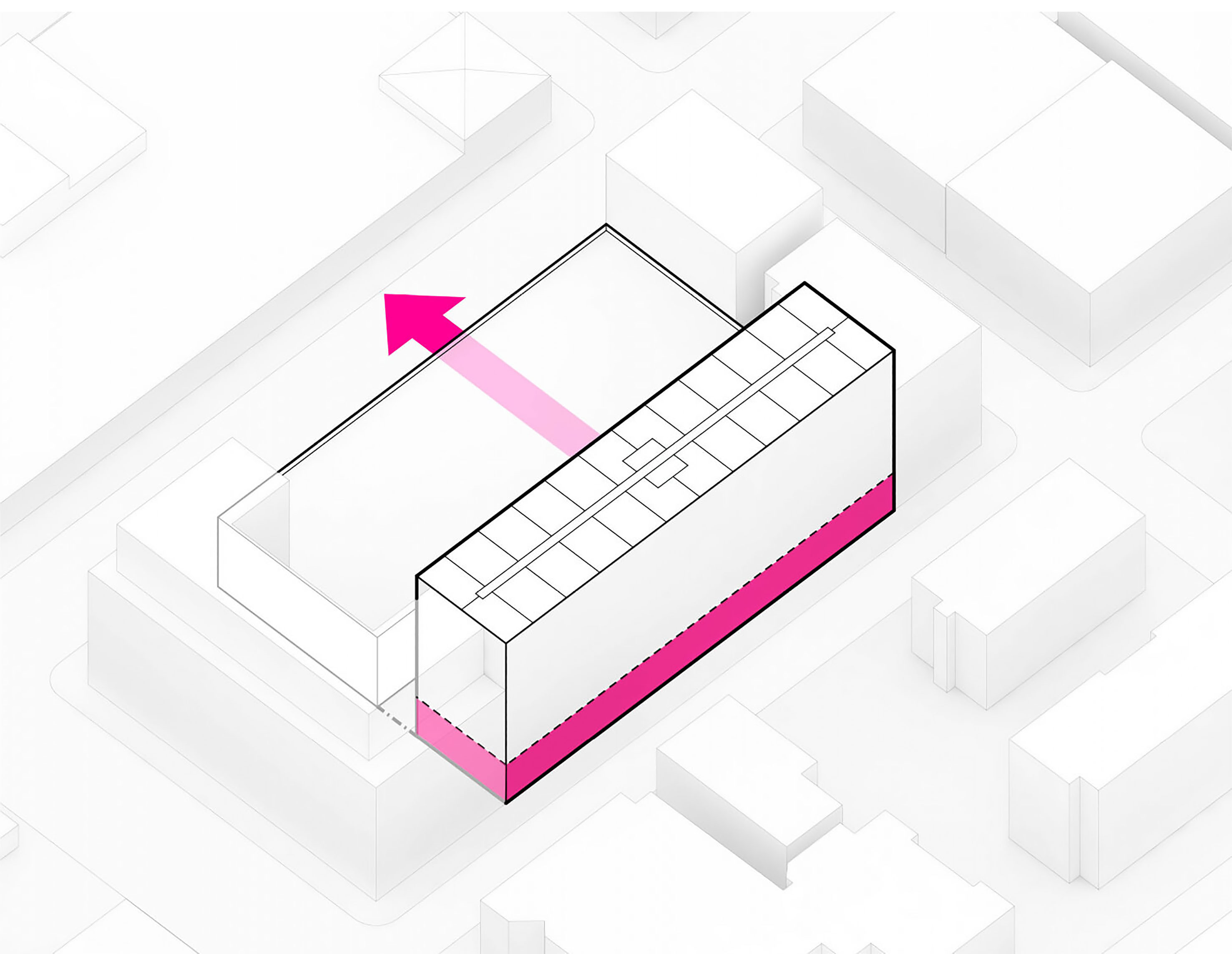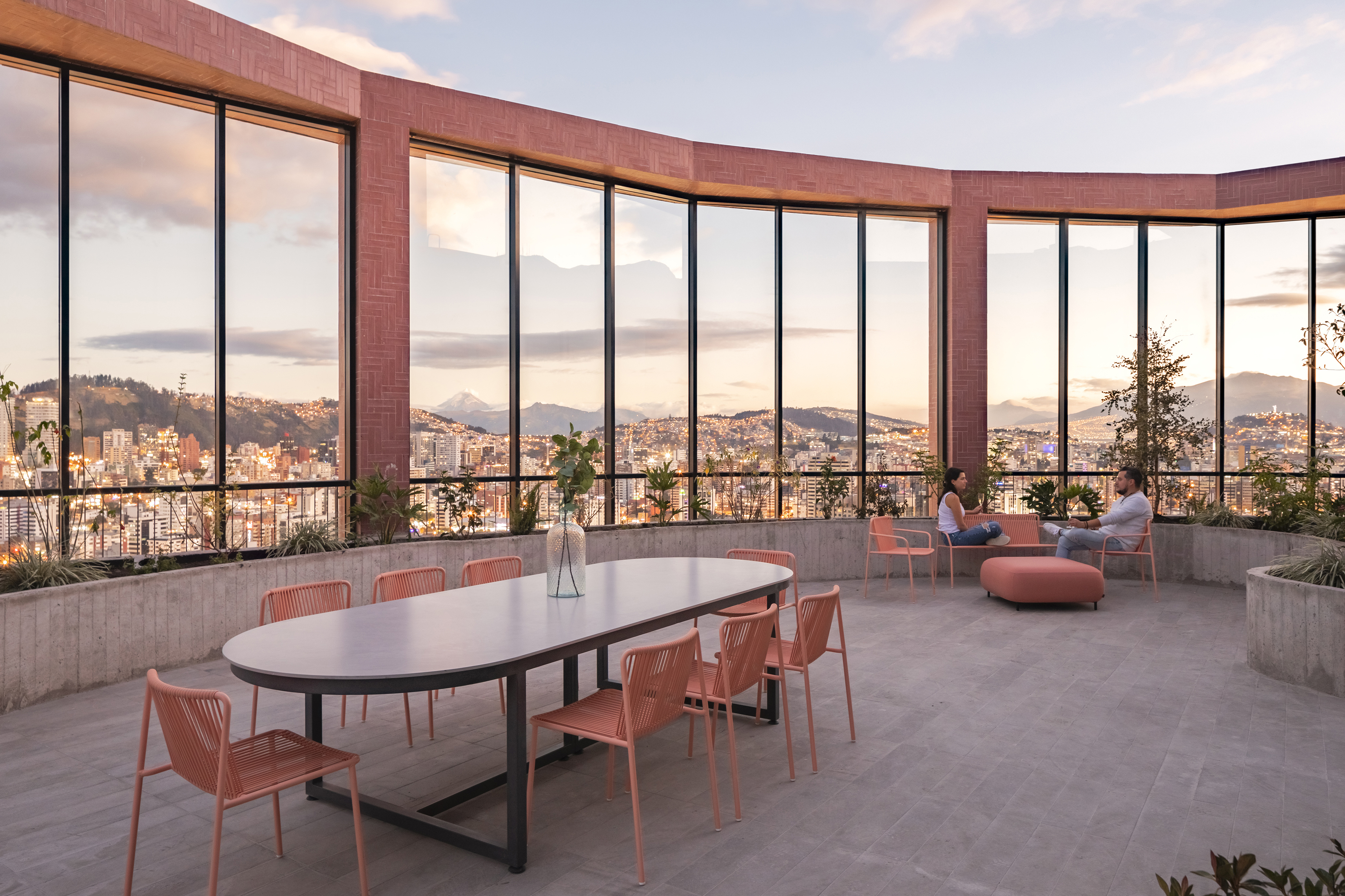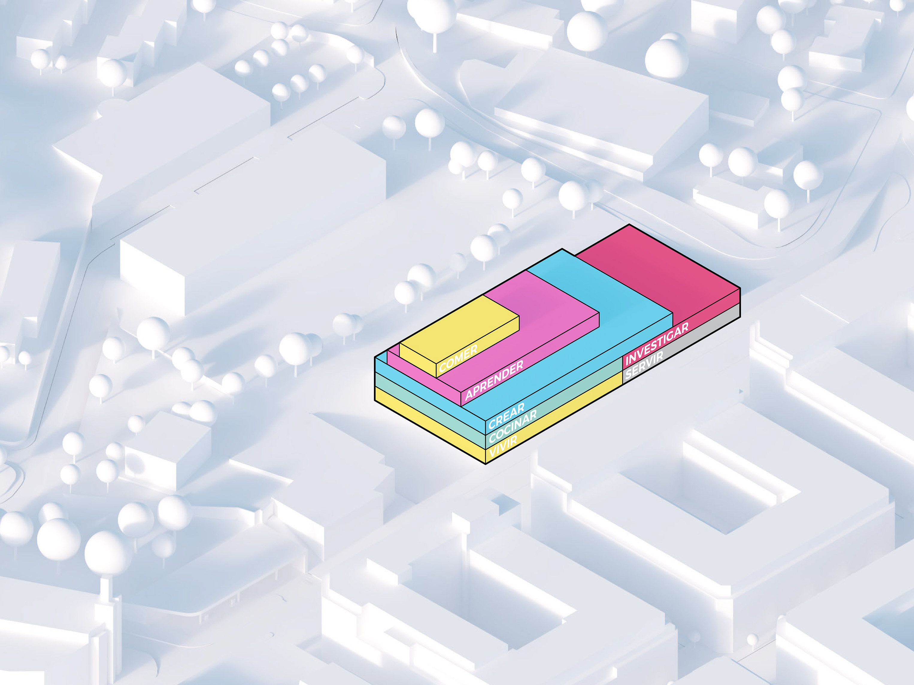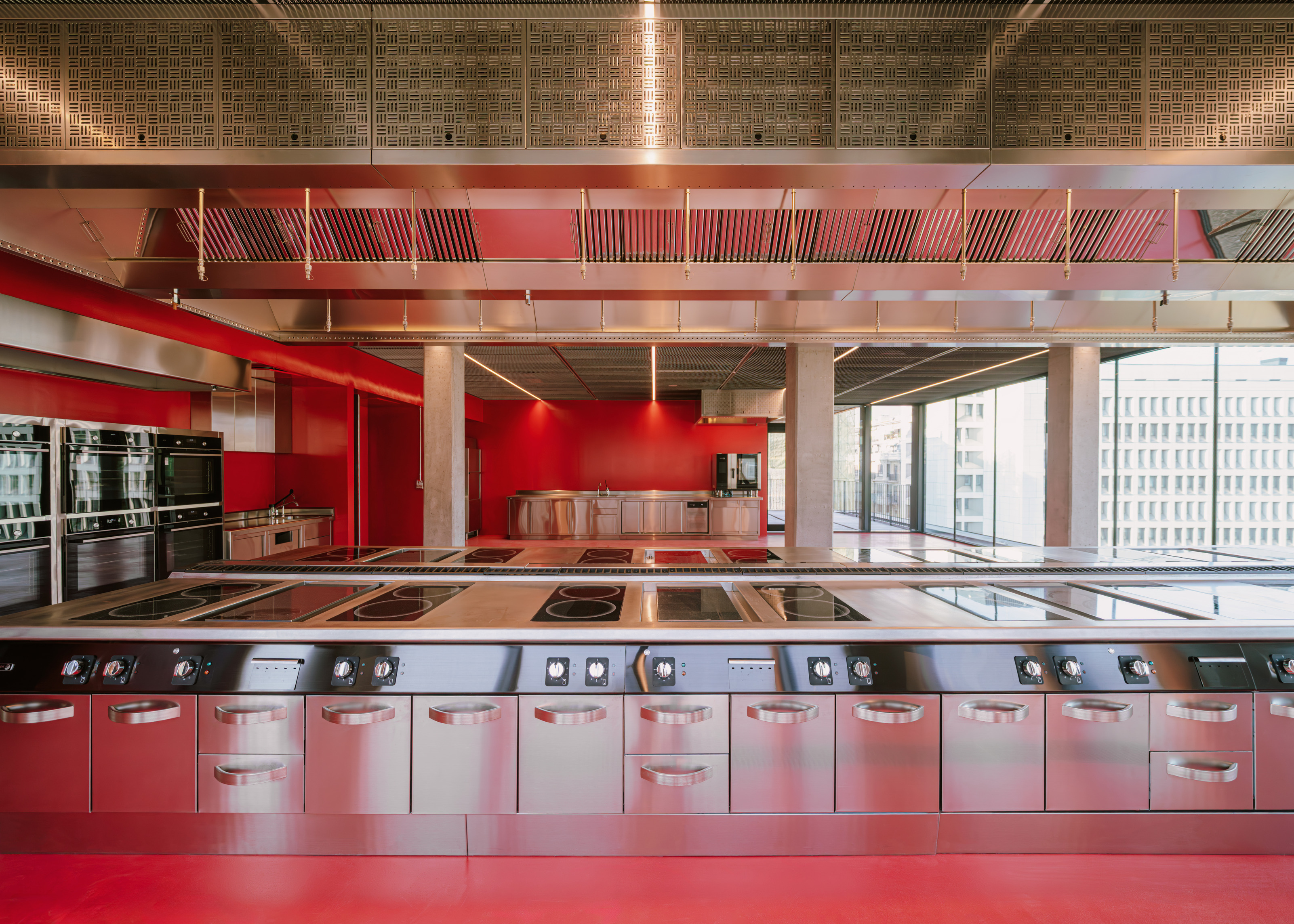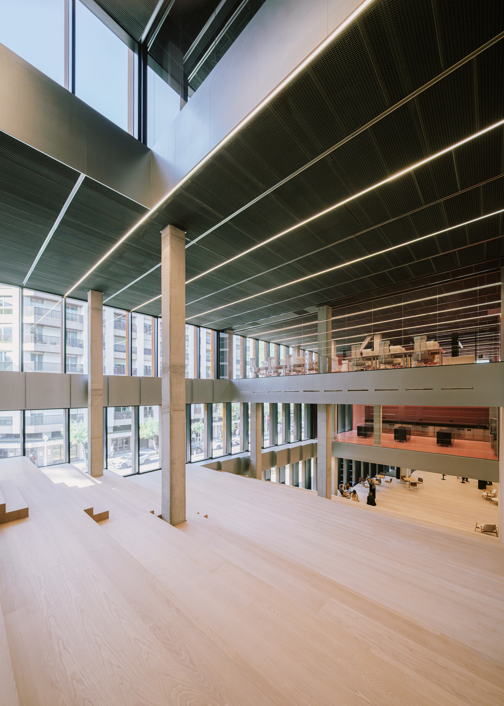 At the street level, the new building sets back to create a covered public plaza directly connected to the Camino, establishing the building as a meeting point between culture, gastronomy, and the city. The building rises to create a series of terraces and recessed windows displaying the activity in the kitchens, labs and classes to the public.