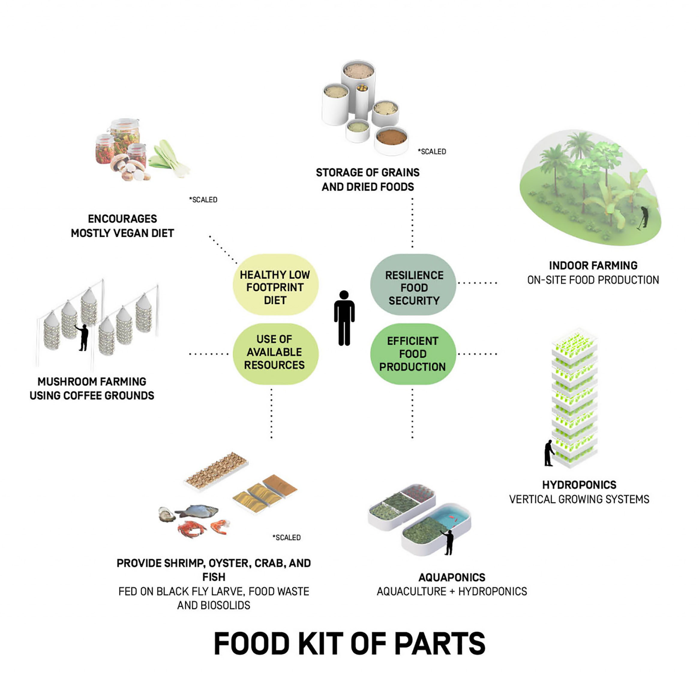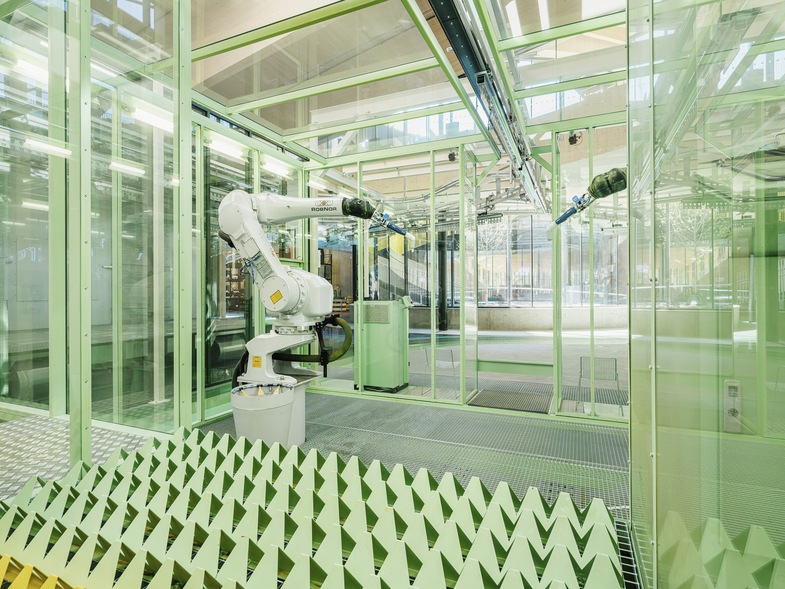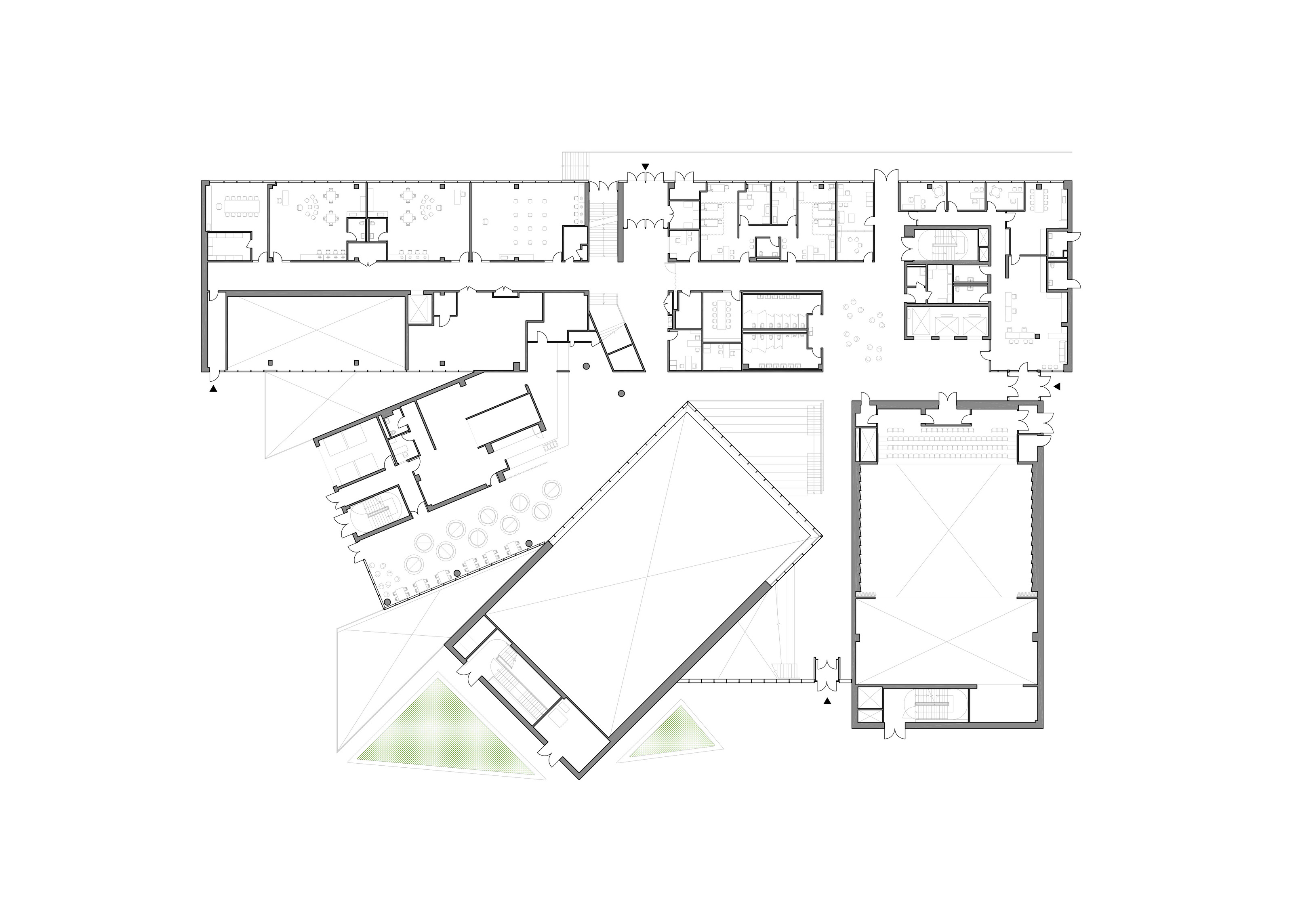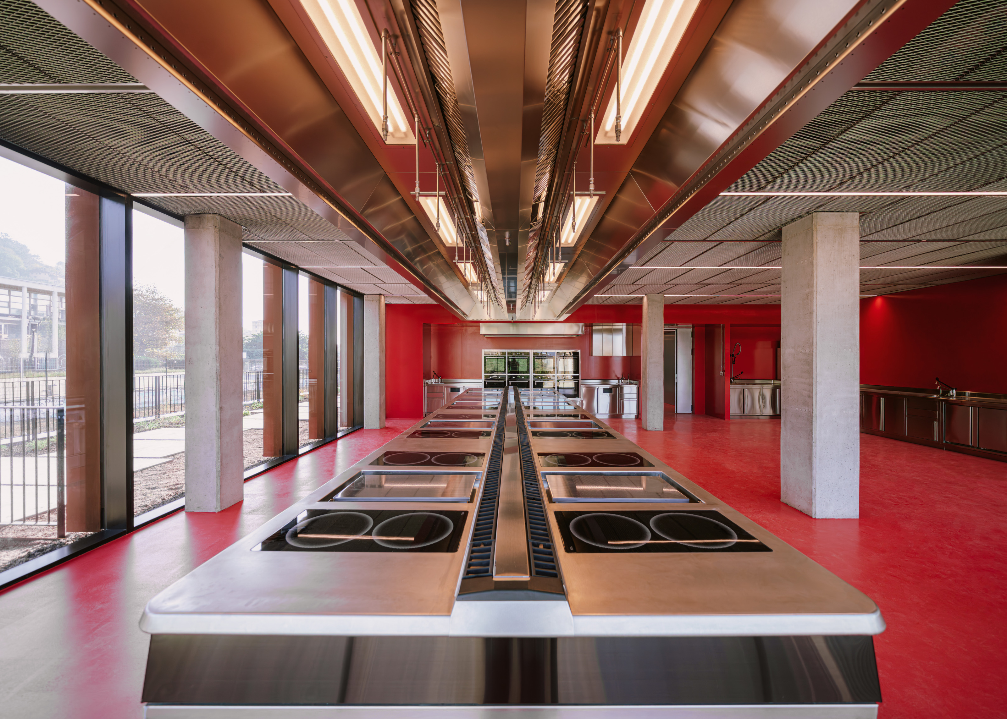 The food labs and offices are designed to offer maximum flexibility, with open classrooms, laboratories, and kitchens that can be rearranged for different purposes due to the generous height and width of the spaces. All kitchens and laboratories feature industrial materials for hygiene and maintenance, while public programs use natural materials such as wood and stone to create a welcoming atmosphere.