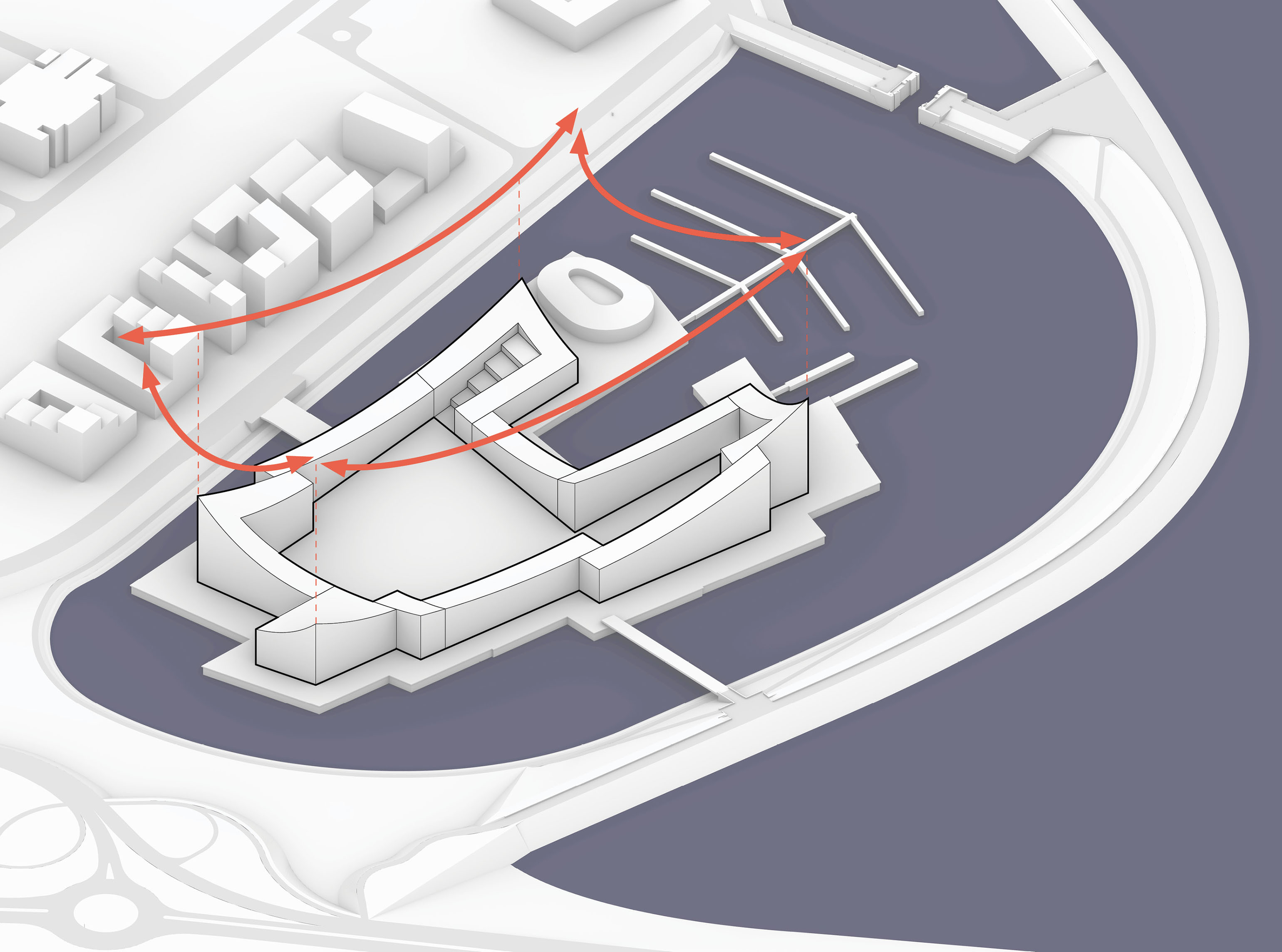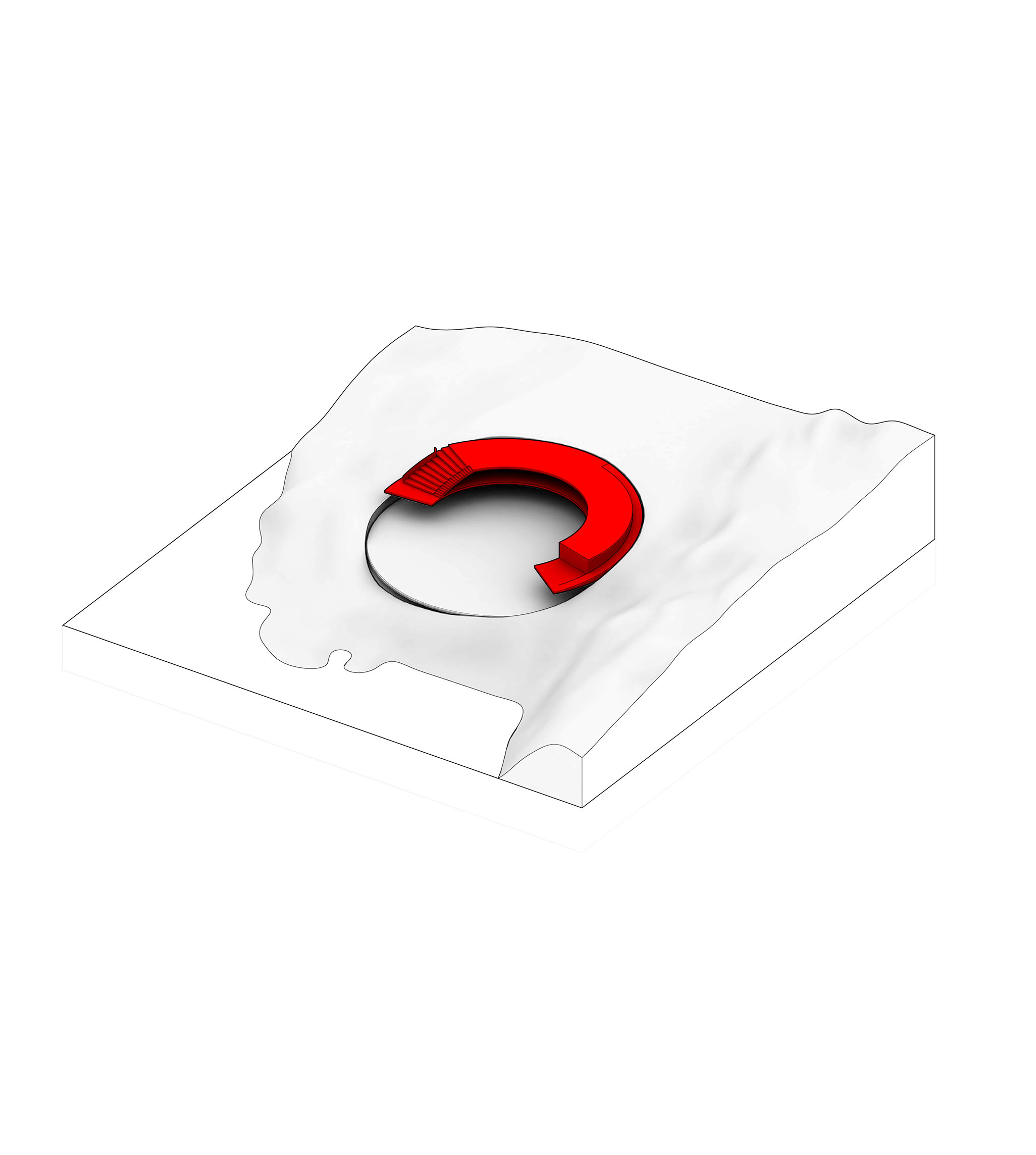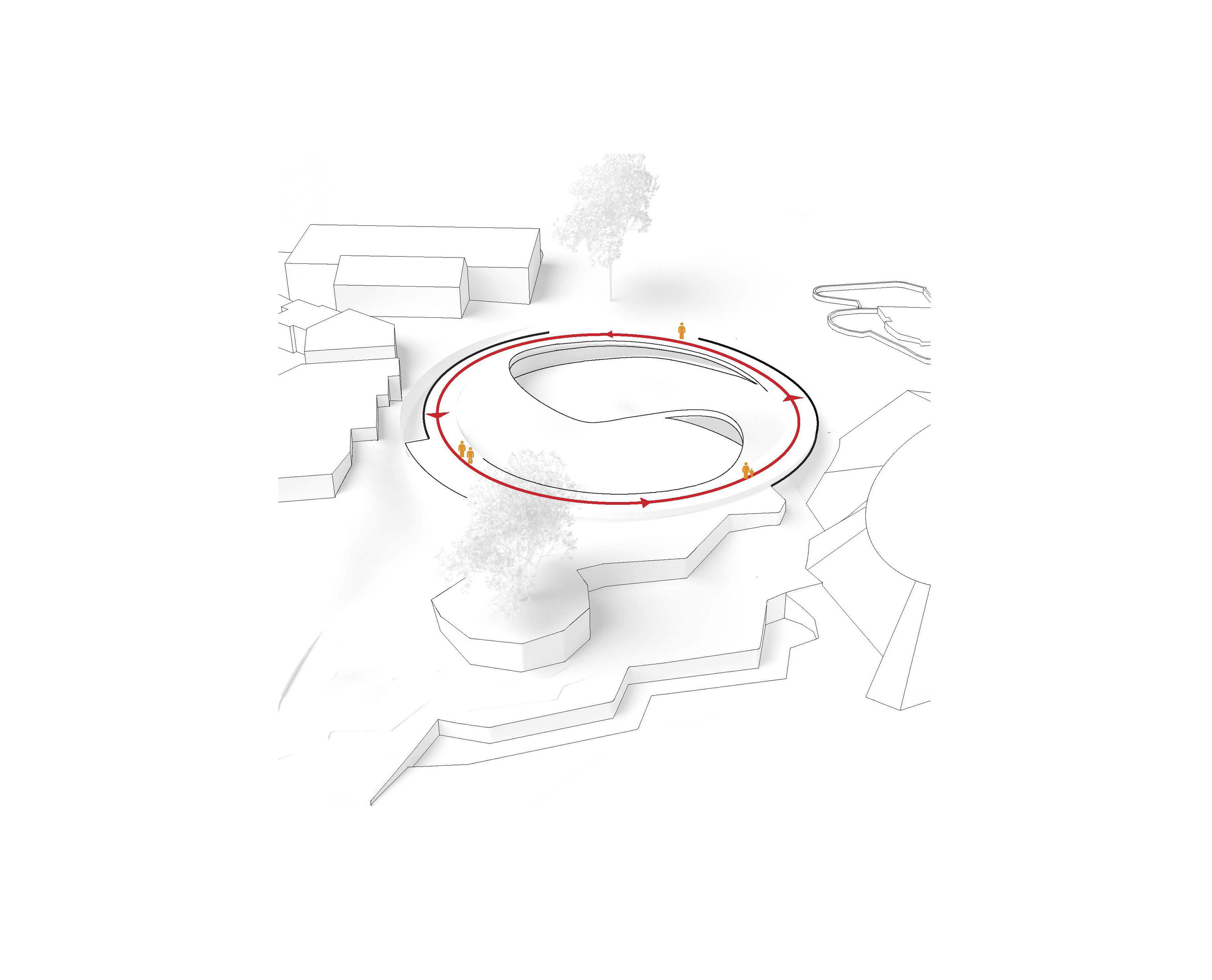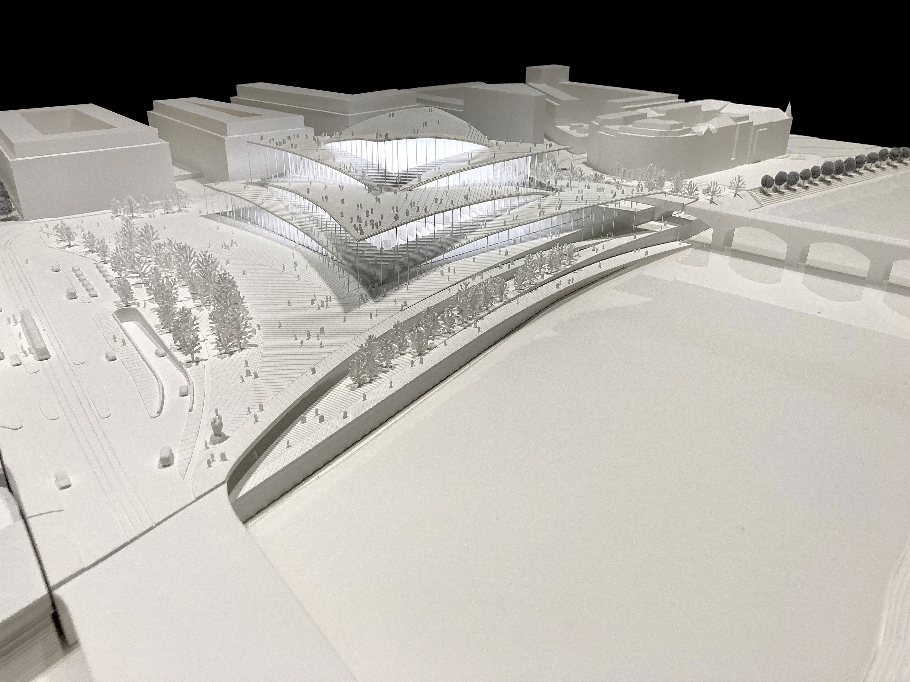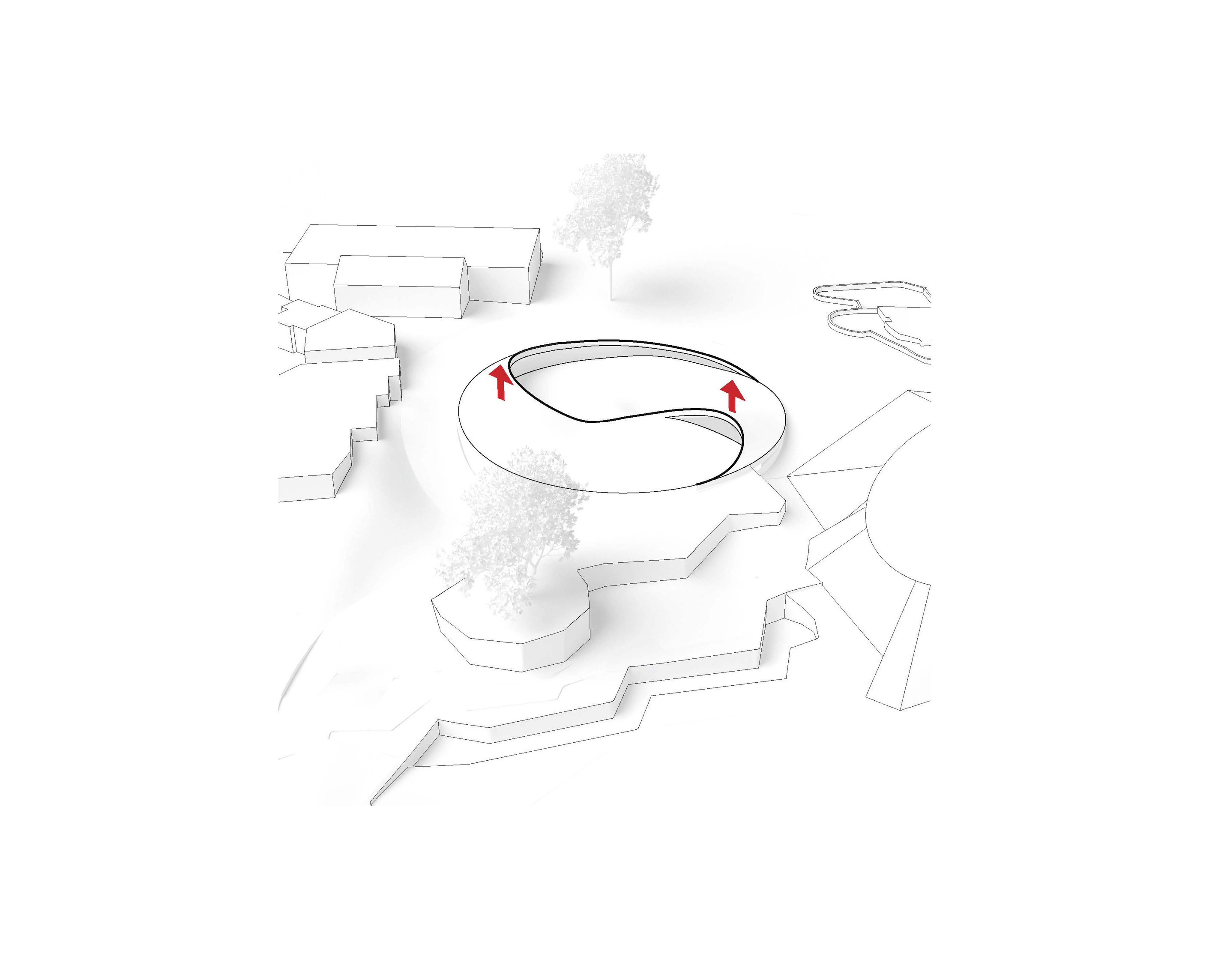 Conceived as a public building within a park, the opera house unfolds as a series of terraced landscapes rising from the water’s edge. Seen from above, the roof traces a continuous circular form that opens toward the harbor. This sculpted topography offers pathways across the building, moving from the quay to elevated gardens, creating outdoor gathering spaces and a new public link between the city and the river.