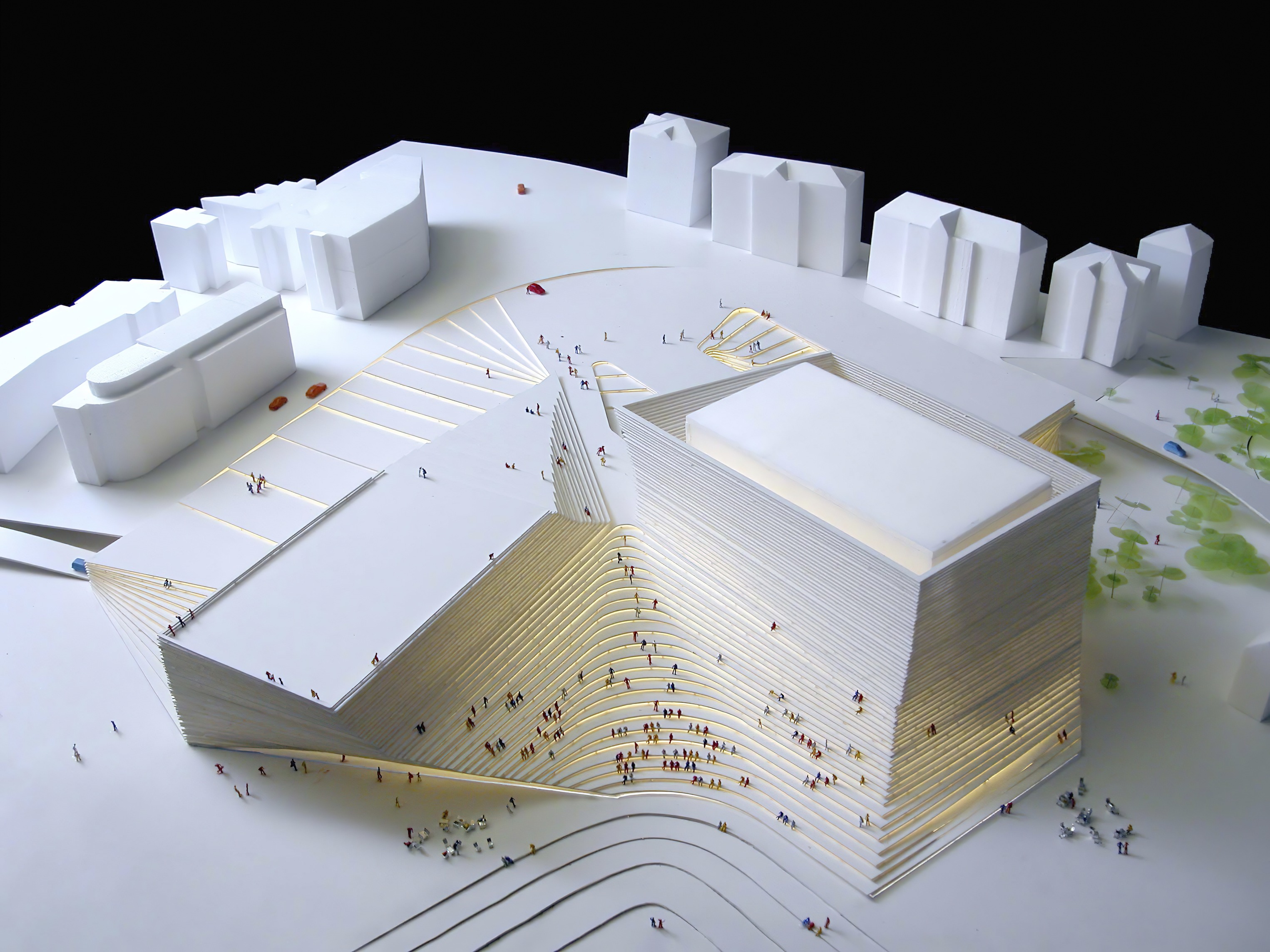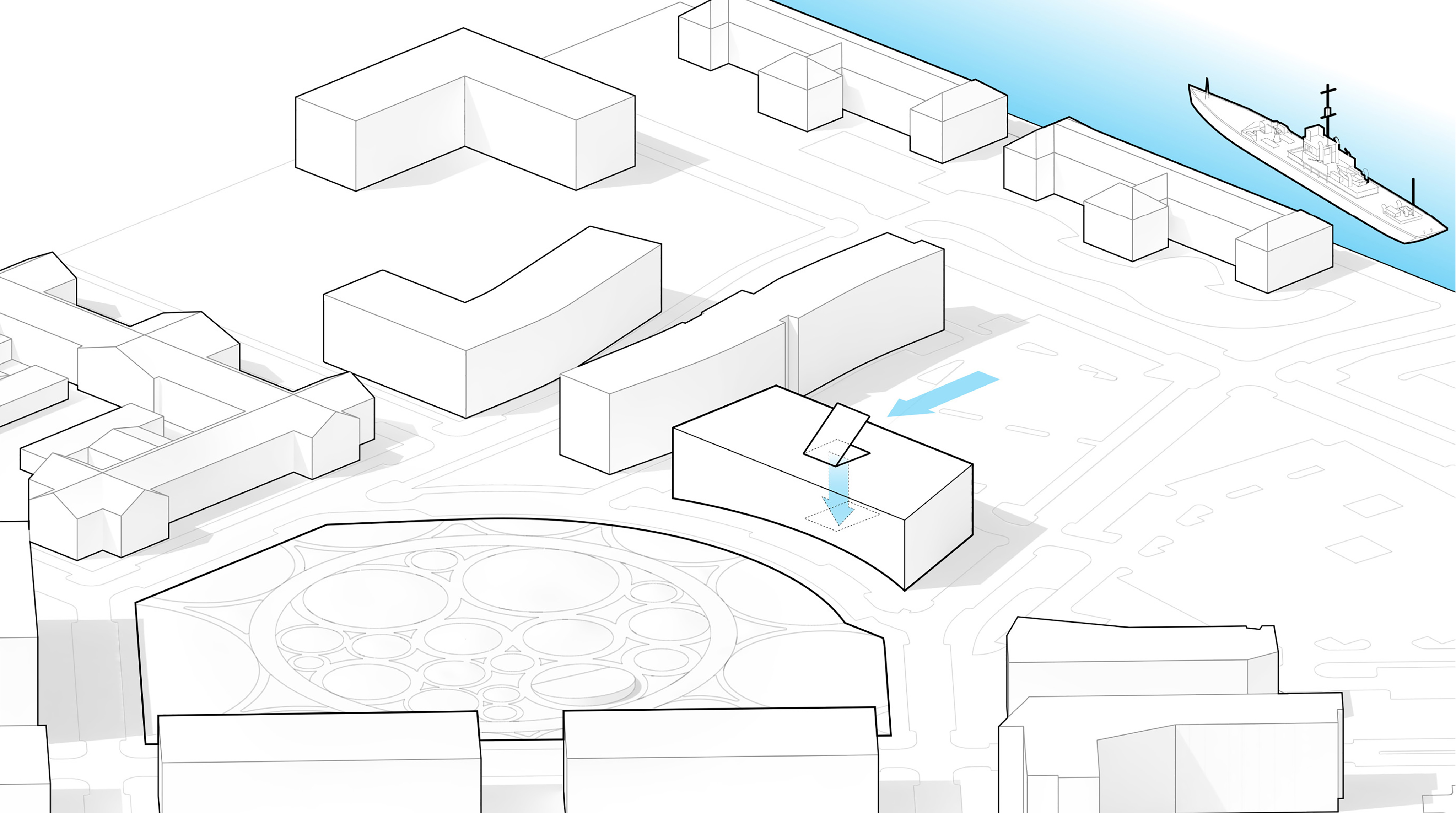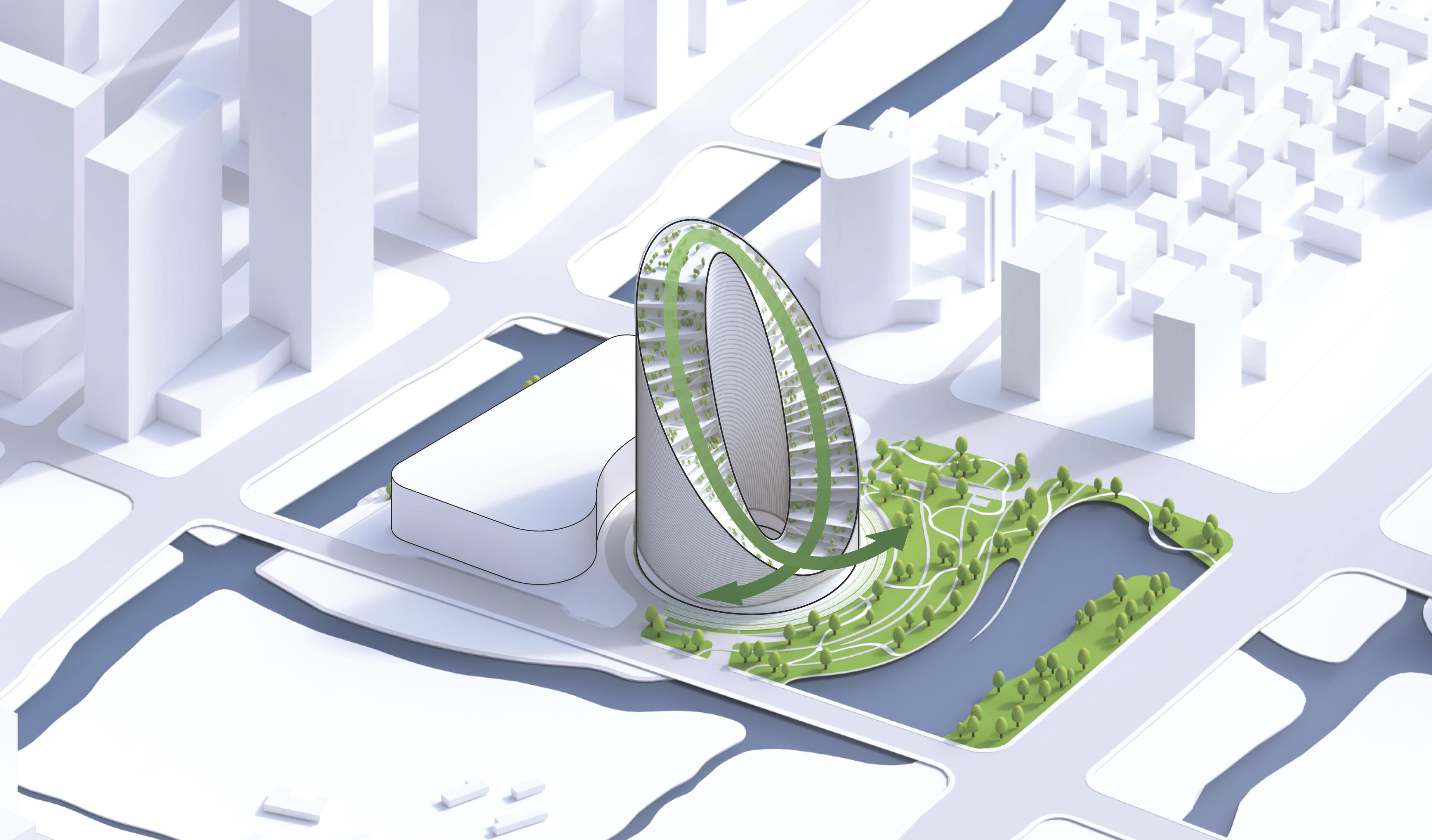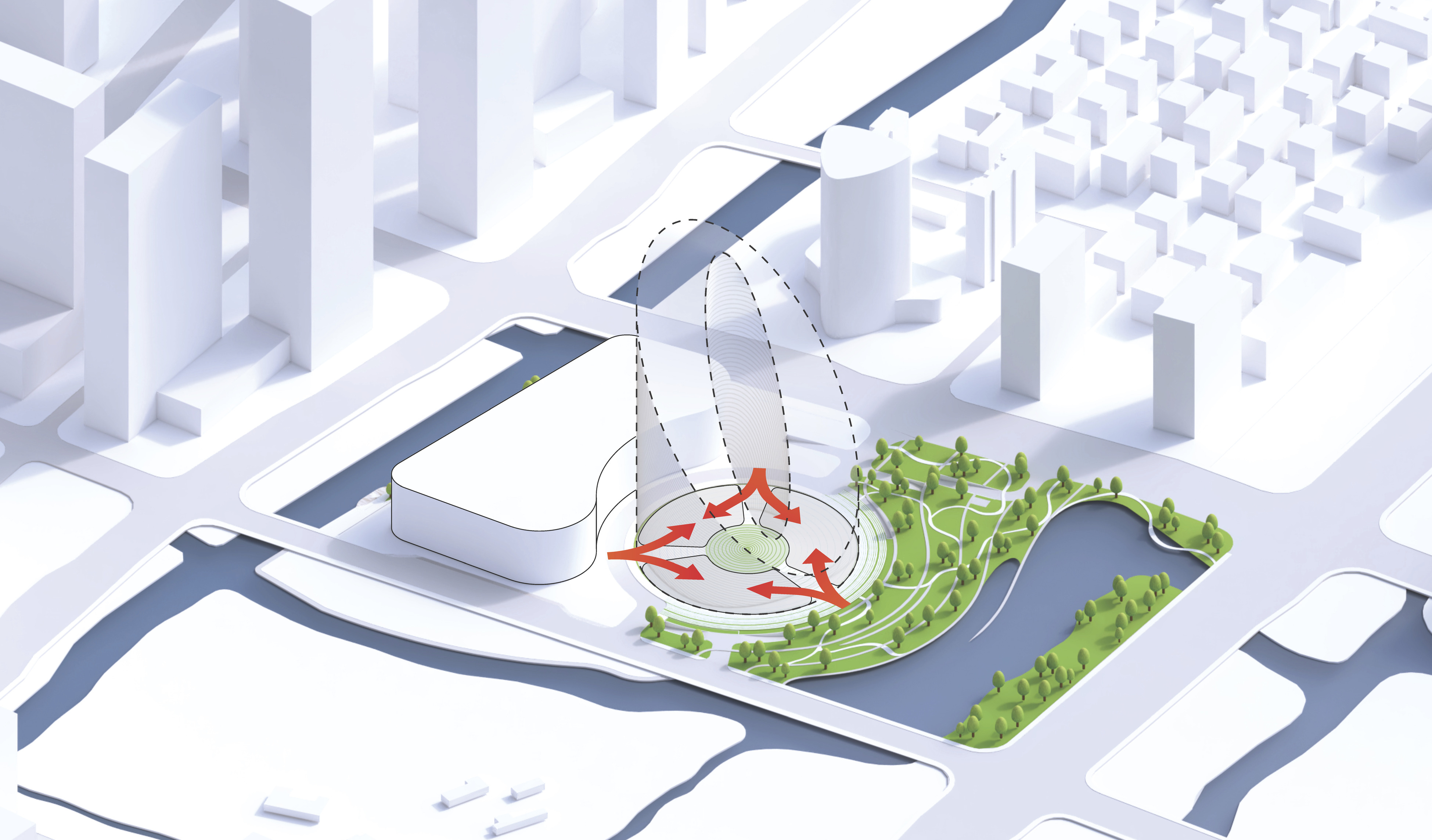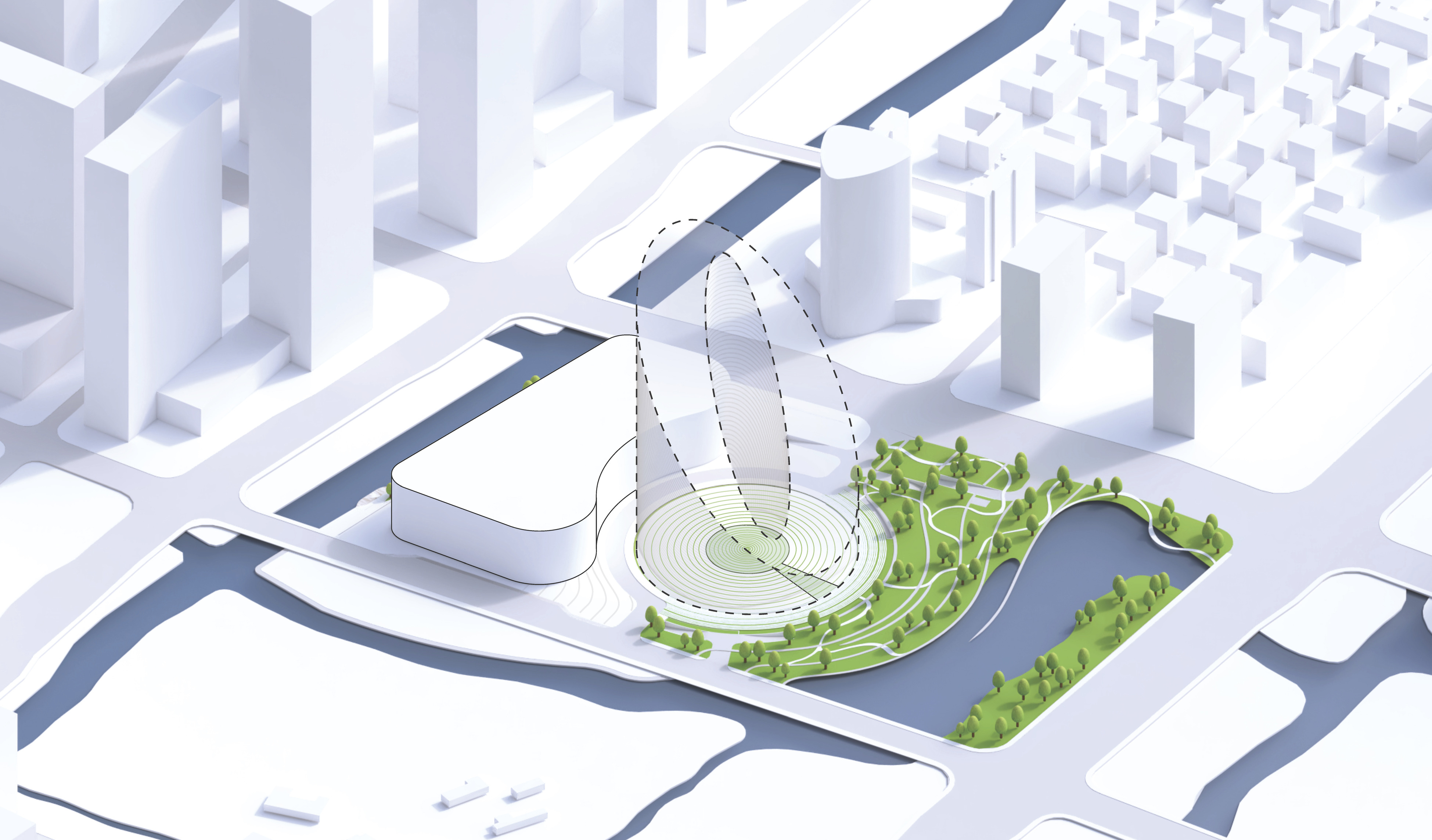Conceived as a public building within a park, the opera house unfolds as a series of terraced landscapes rising from the water’s edge. Seen from above, the roof traces a continuous circular form that opens toward the harbor. This sculpted topography offers pathways across the building, moving from the quay to elevated gardens, creating outdoor gathering spaces and a new public link between the city and the river.