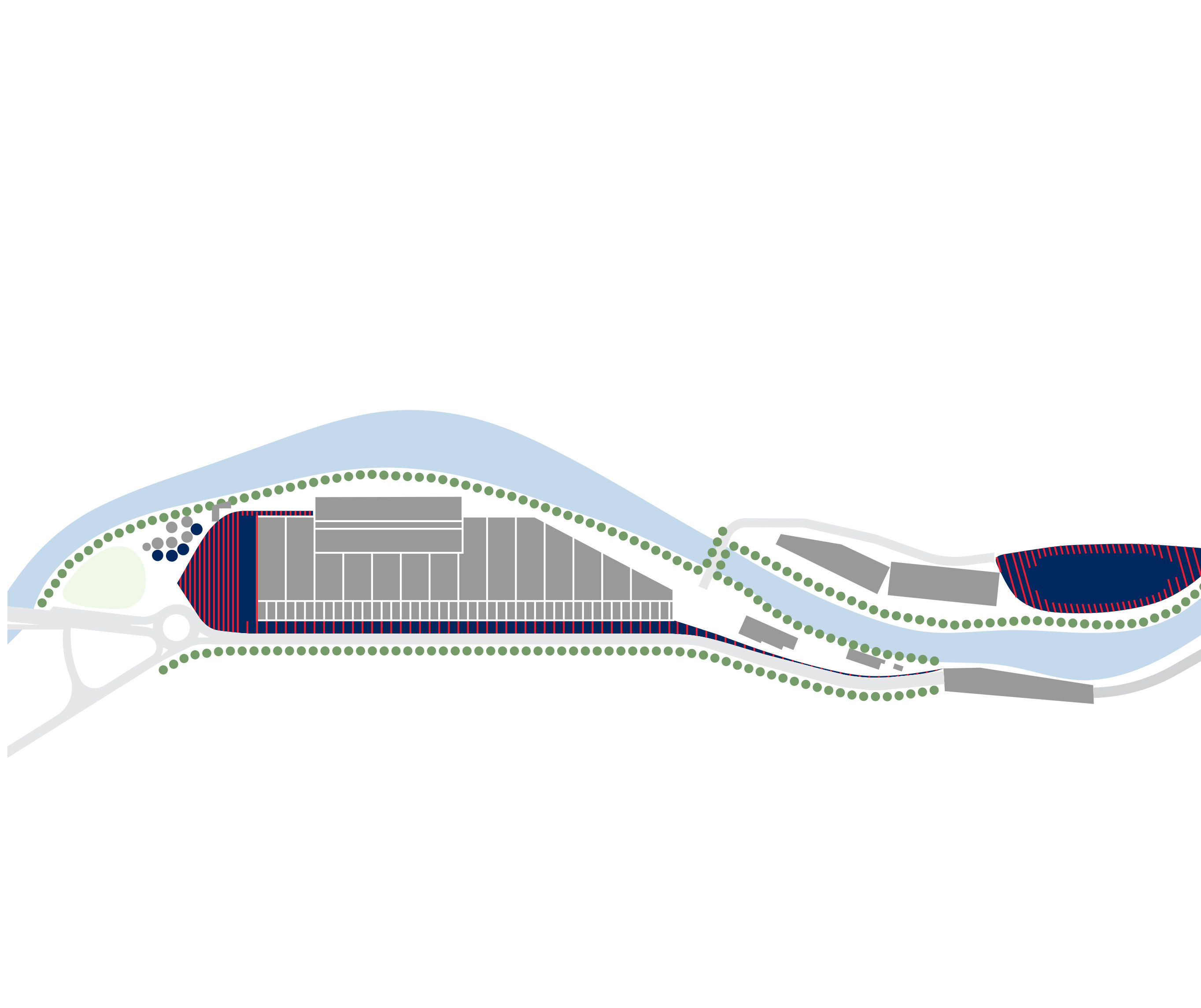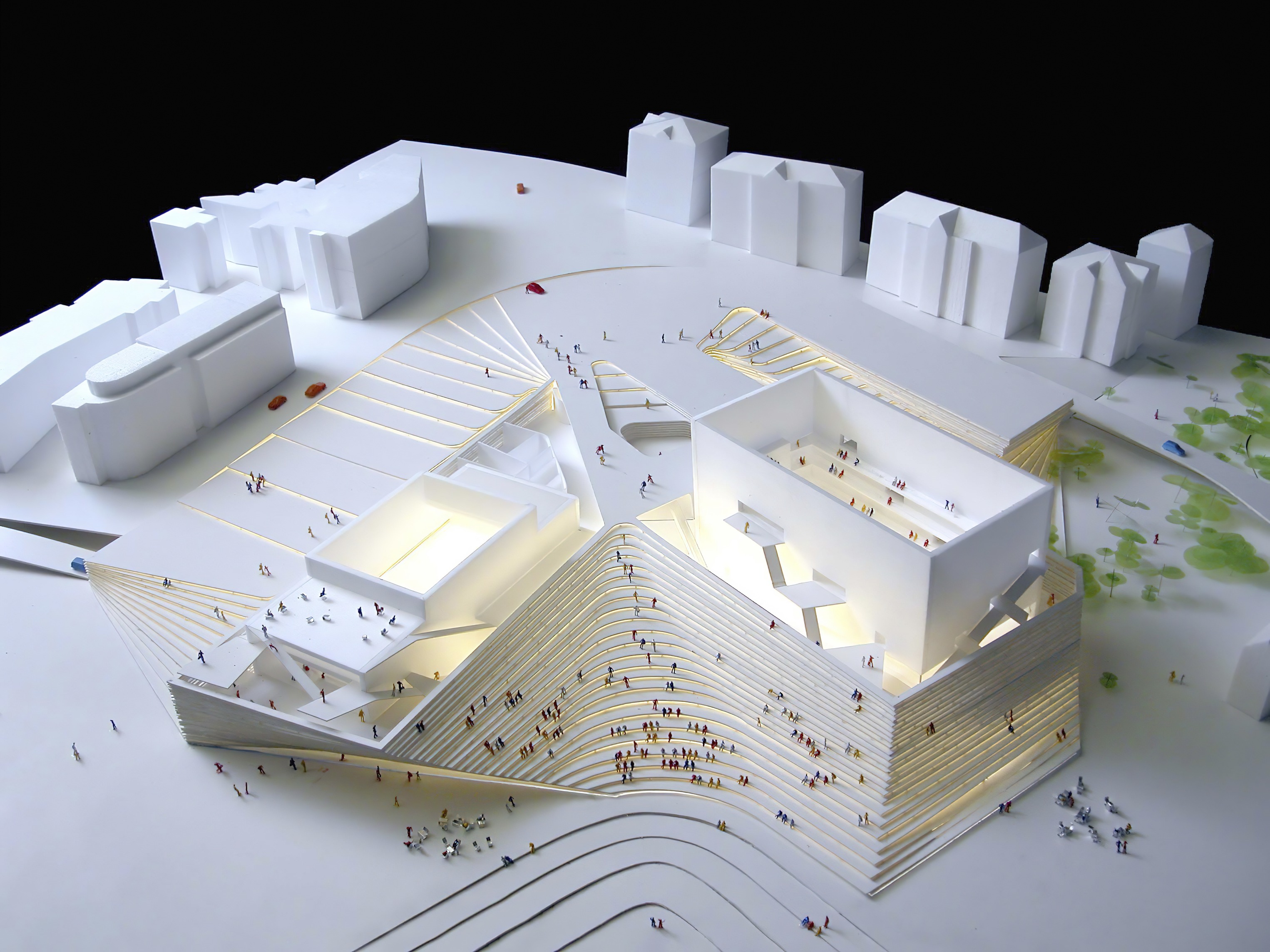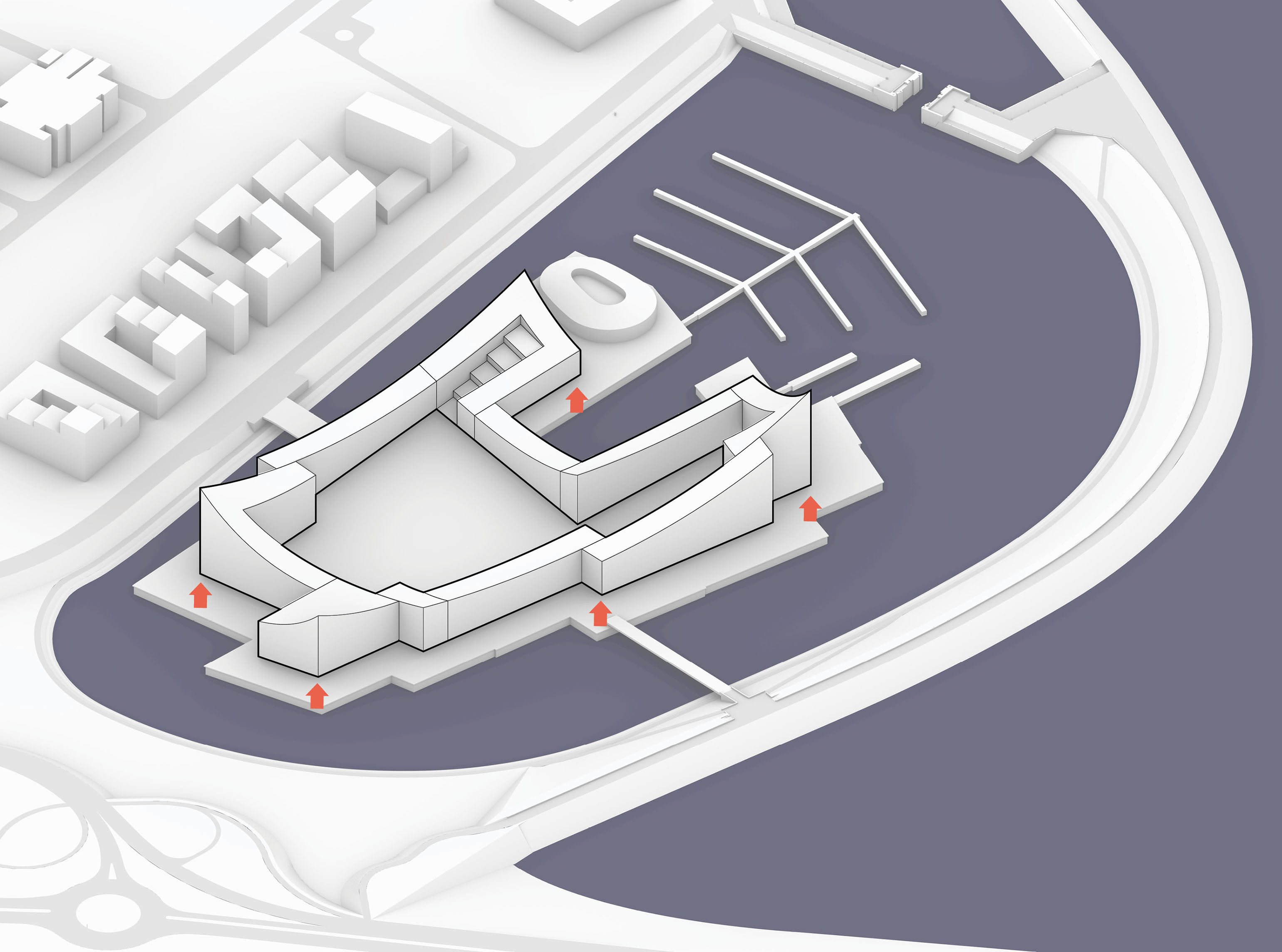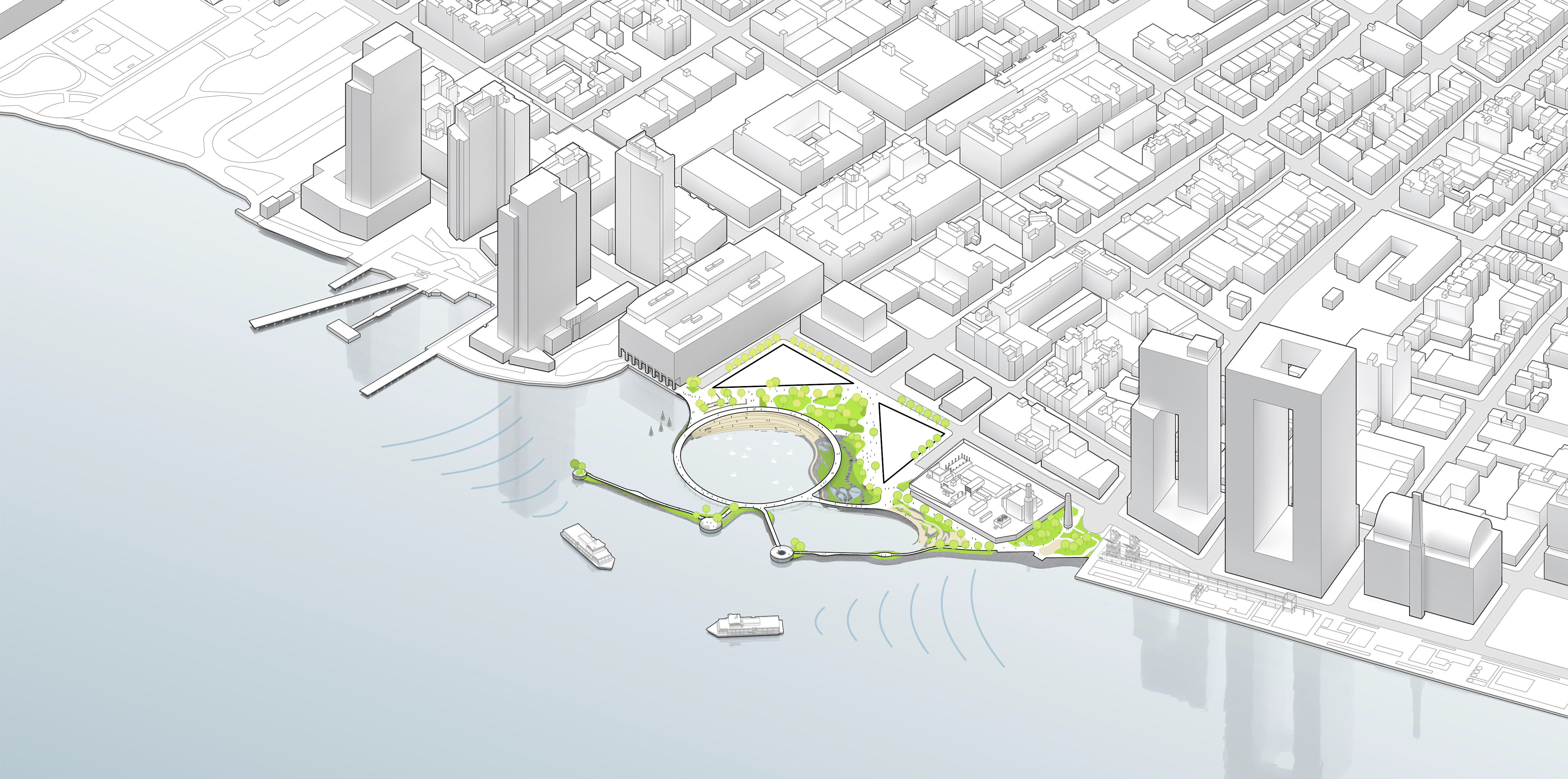 Conceived as a public building within a park, the opera house unfolds as a series of terraced landscapes rising from the water’s edge. Seen from above, the roof traces a continuous circular form that opens toward the harbor. This sculpted topography offers pathways across the building, moving from the quay to elevated gardens, creating outdoor gathering spaces and a new public link between the city and the river.