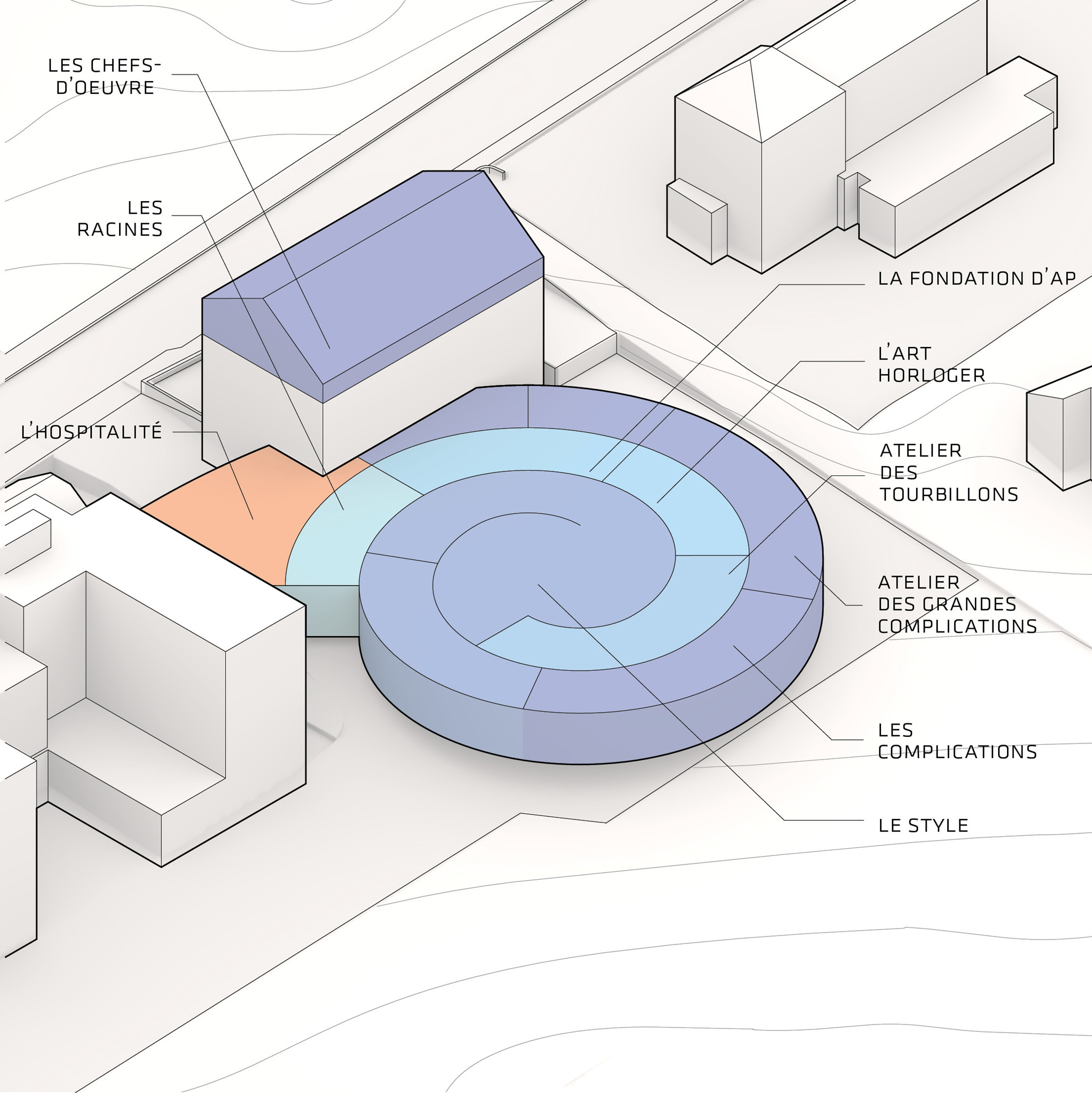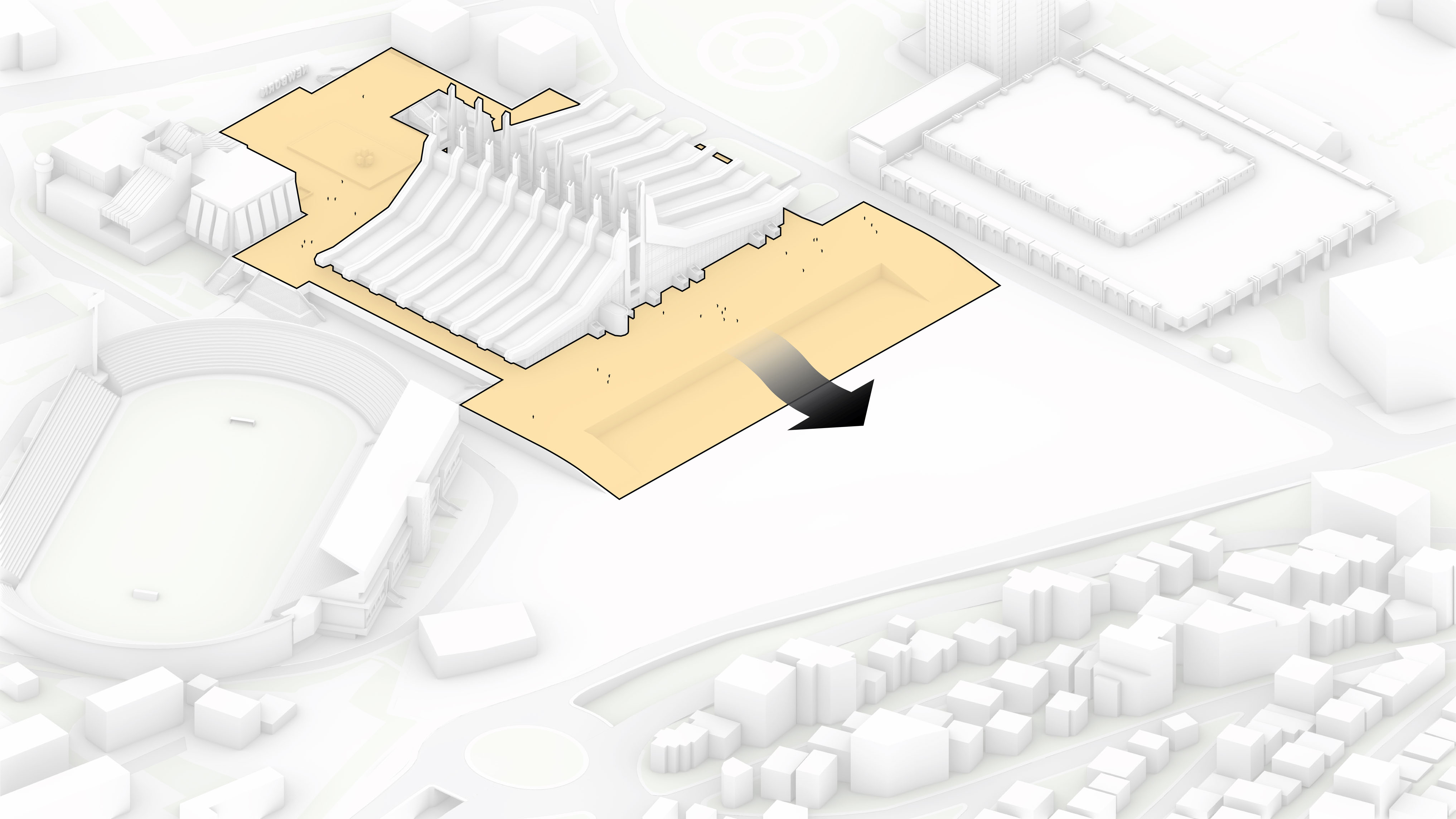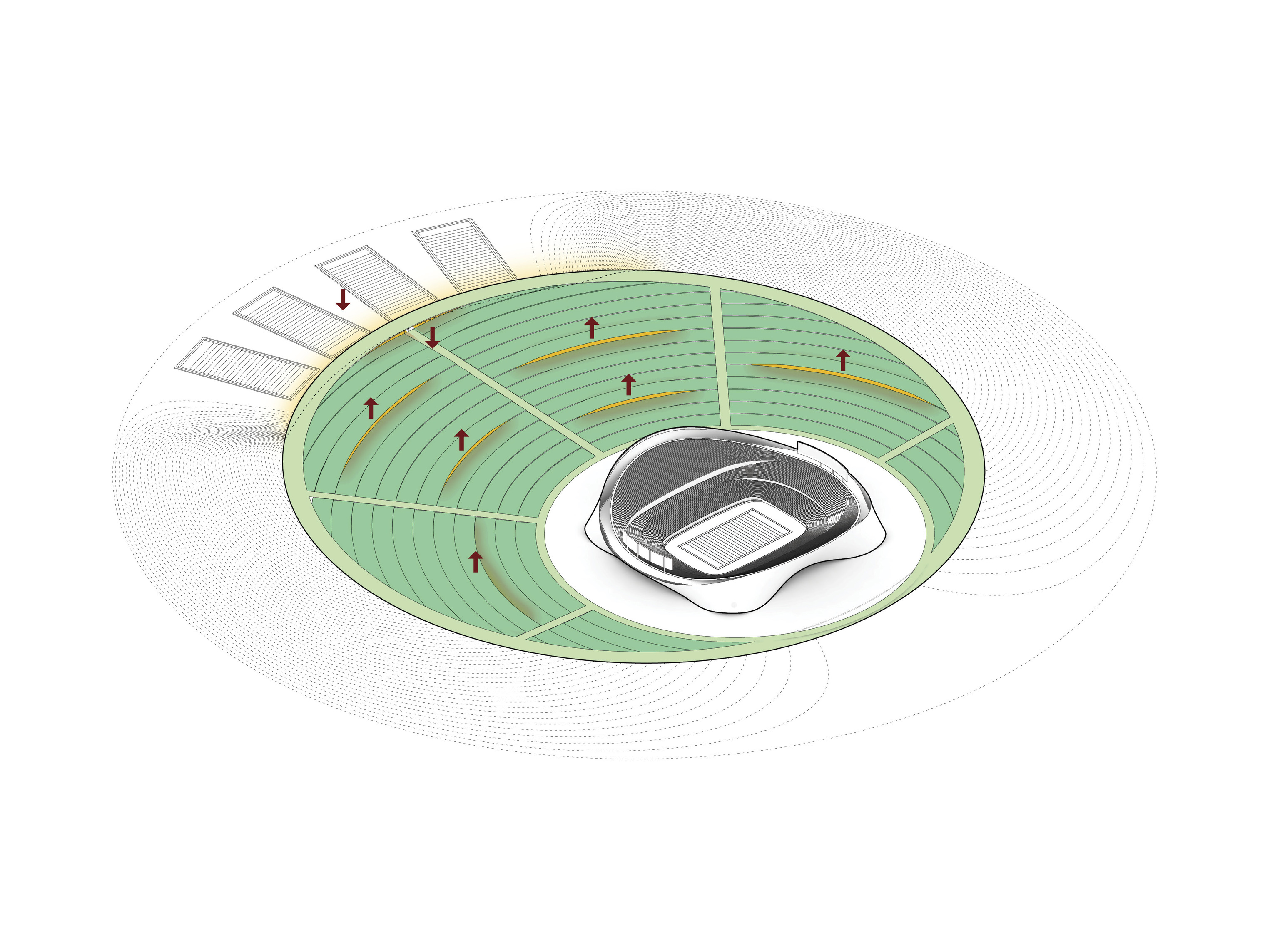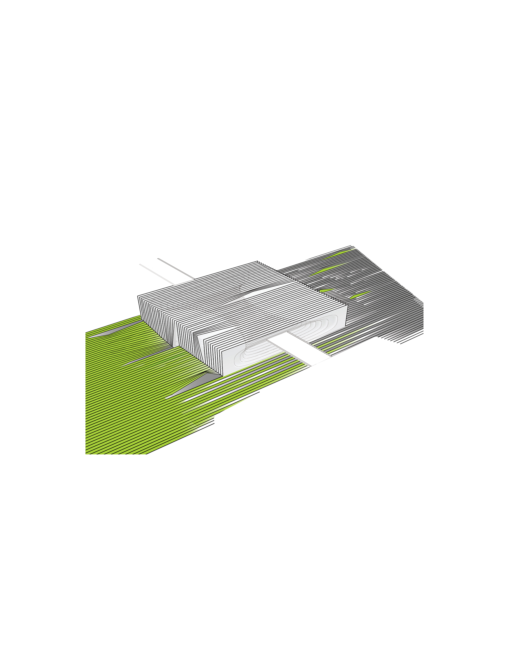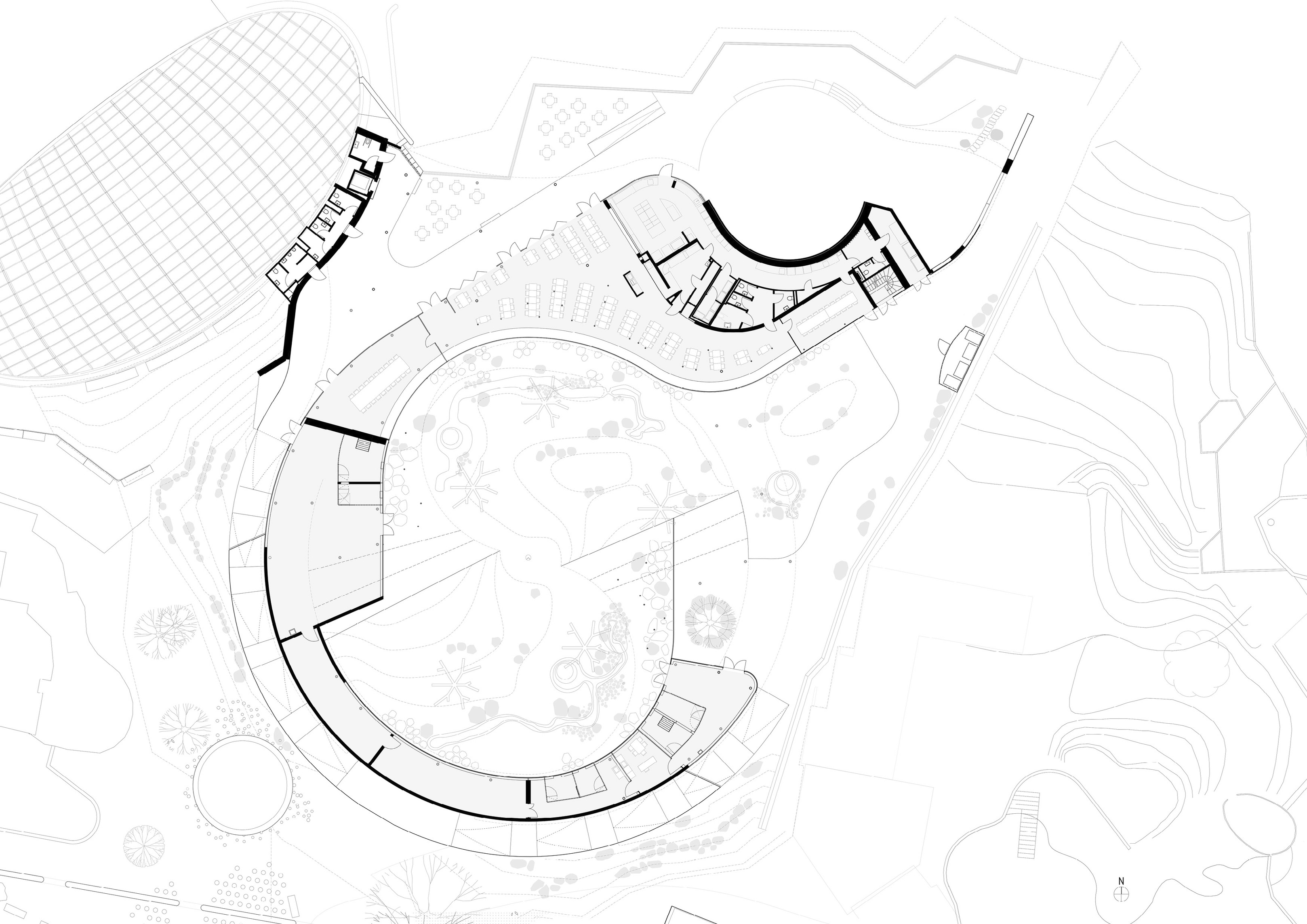 Conceived as a public building within a park, the opera house unfolds as a series of terraced landscapes rising from the water’s edge. Seen from above, the roof traces a continuous circular form that opens toward the harbor. This sculpted topography offers pathways across the building, moving from the quay to elevated gardens, creating outdoor gathering spaces and a new public link between the city and the river.