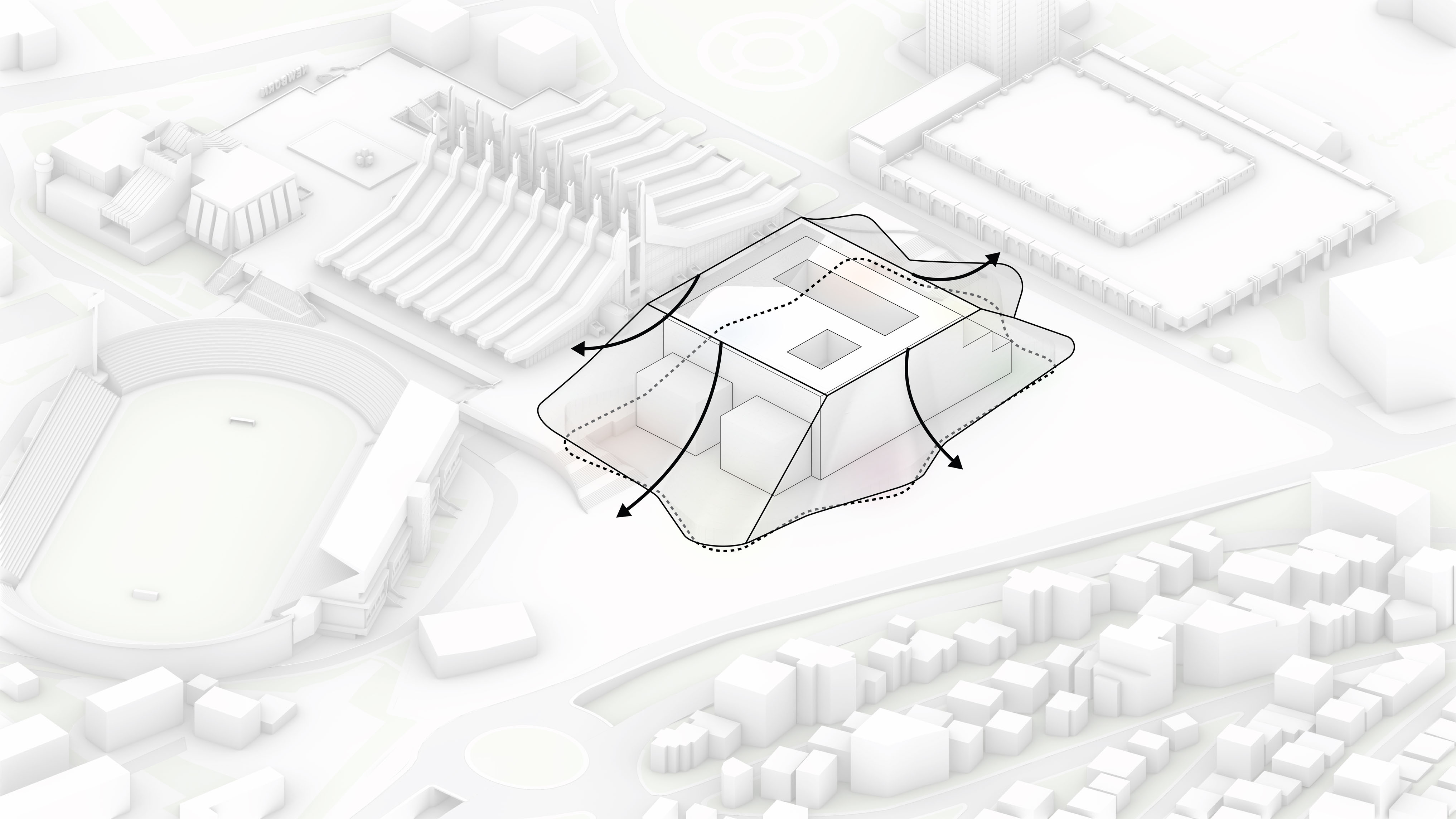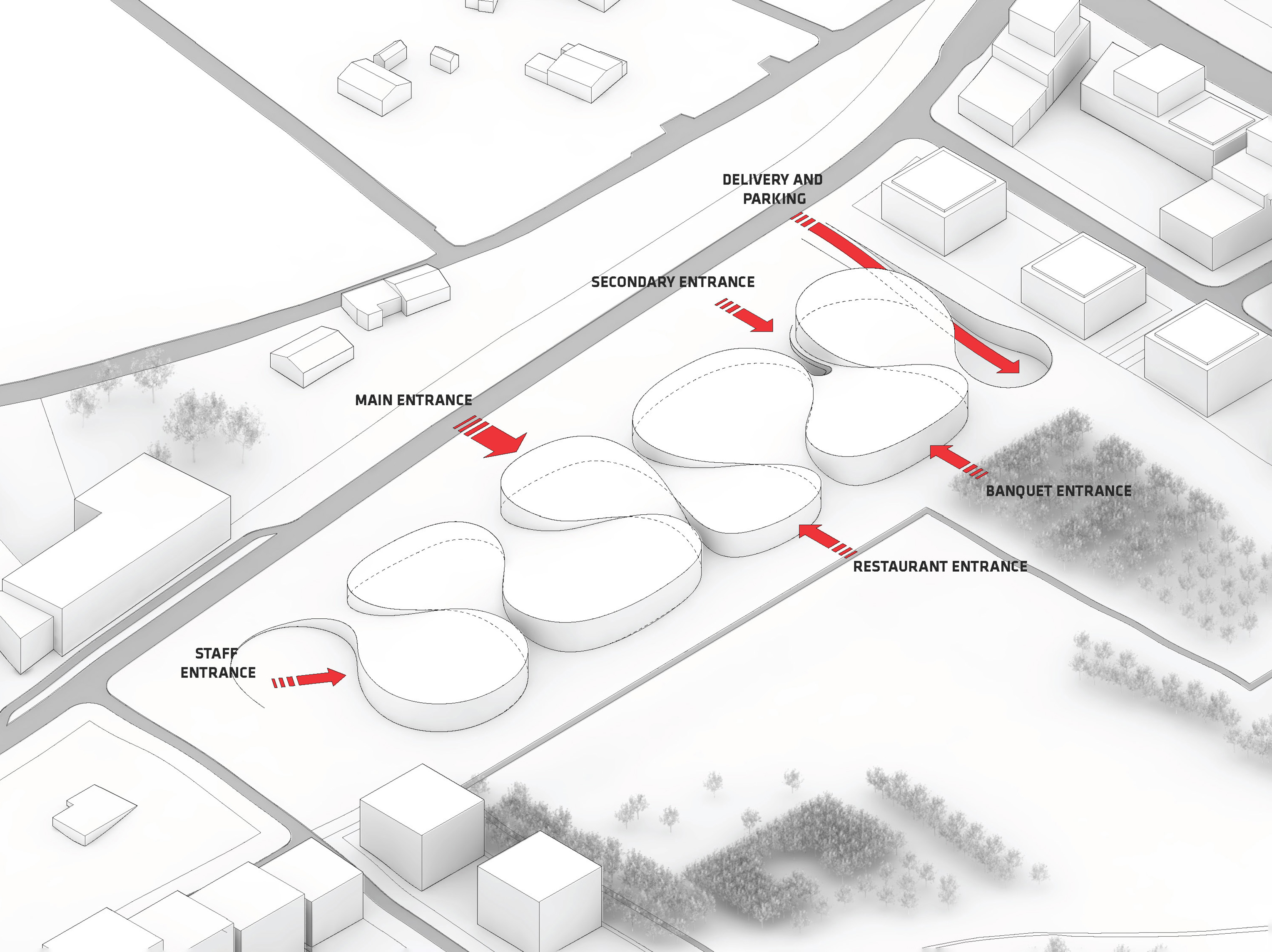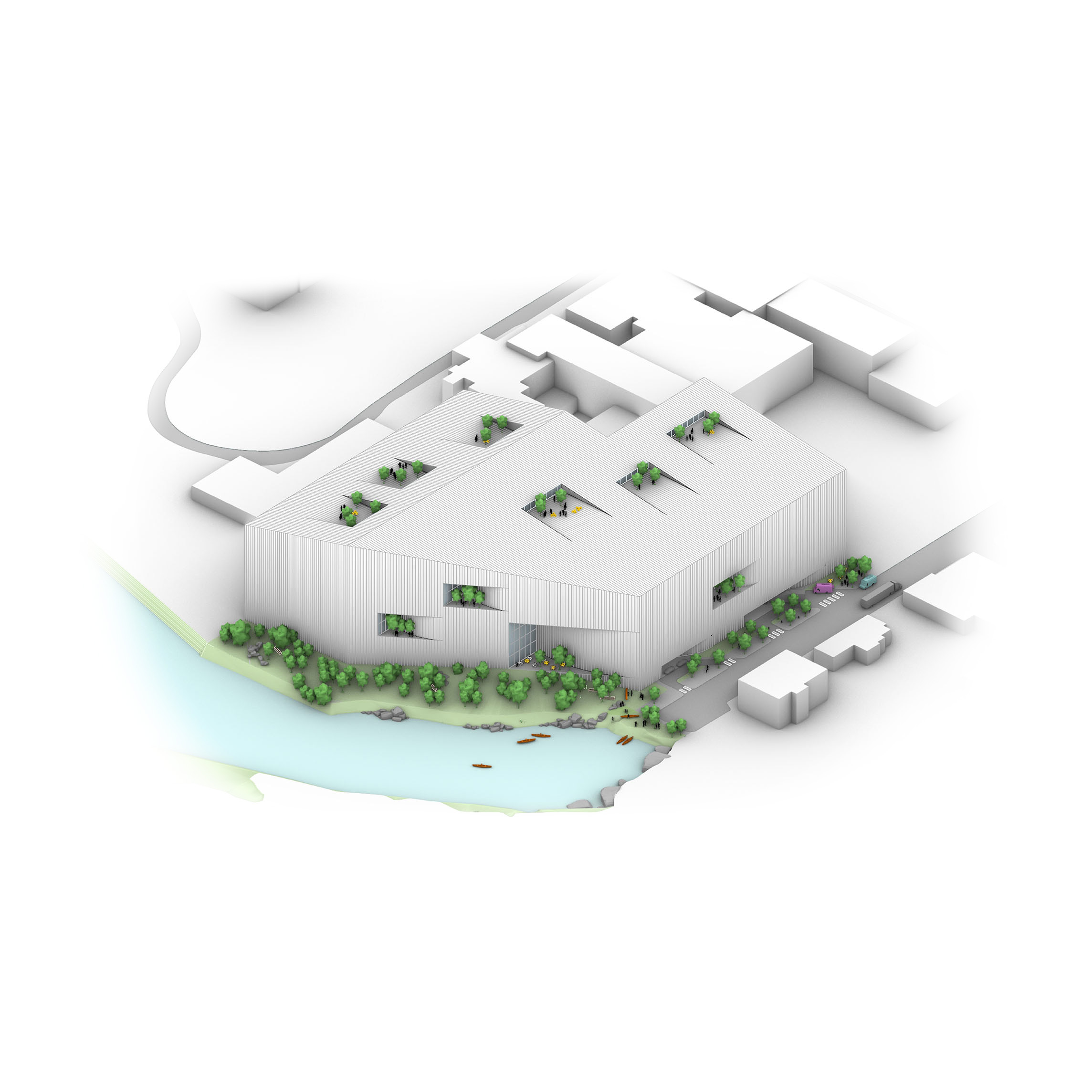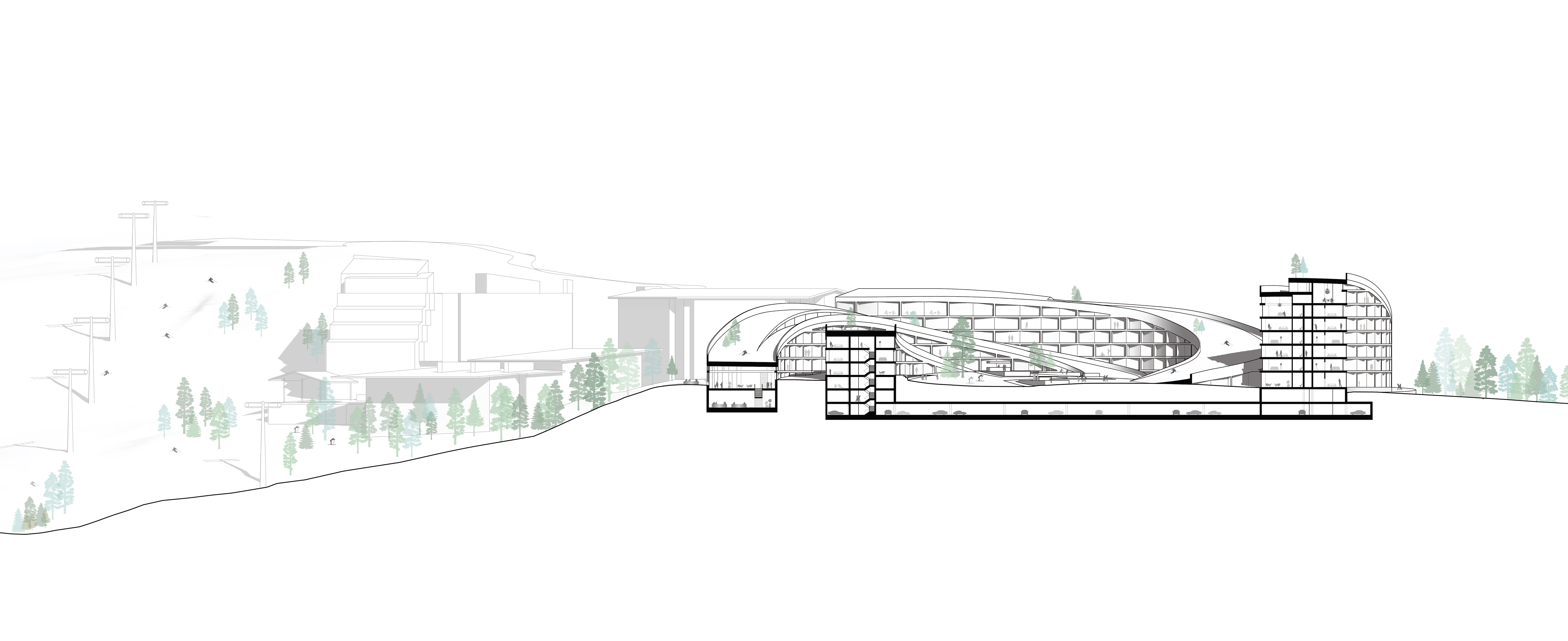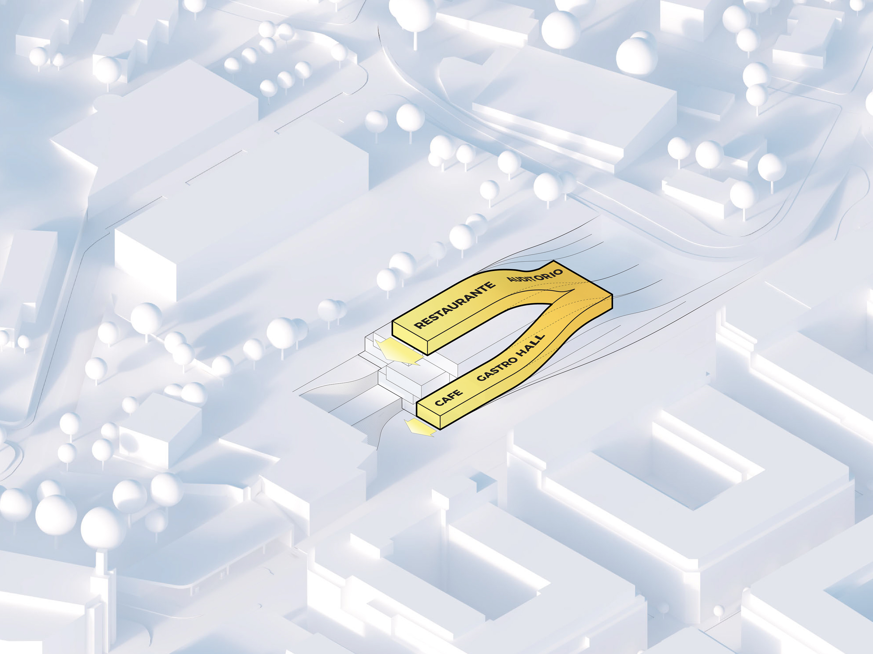 "Starting from the modularity of an optimal kitchen, we configured the new GOe and its public and private programmes as a grid - the façade is carried to the roof extending the landscape and the buildings many public spaces and exterior programs in a continuous motion. Gently waving up from the ground, GOe will be a good neighbor and citizen in San Sebastian, offering a window into global gastronomic discovery while creating new public spaces, plazas, parks, and views."