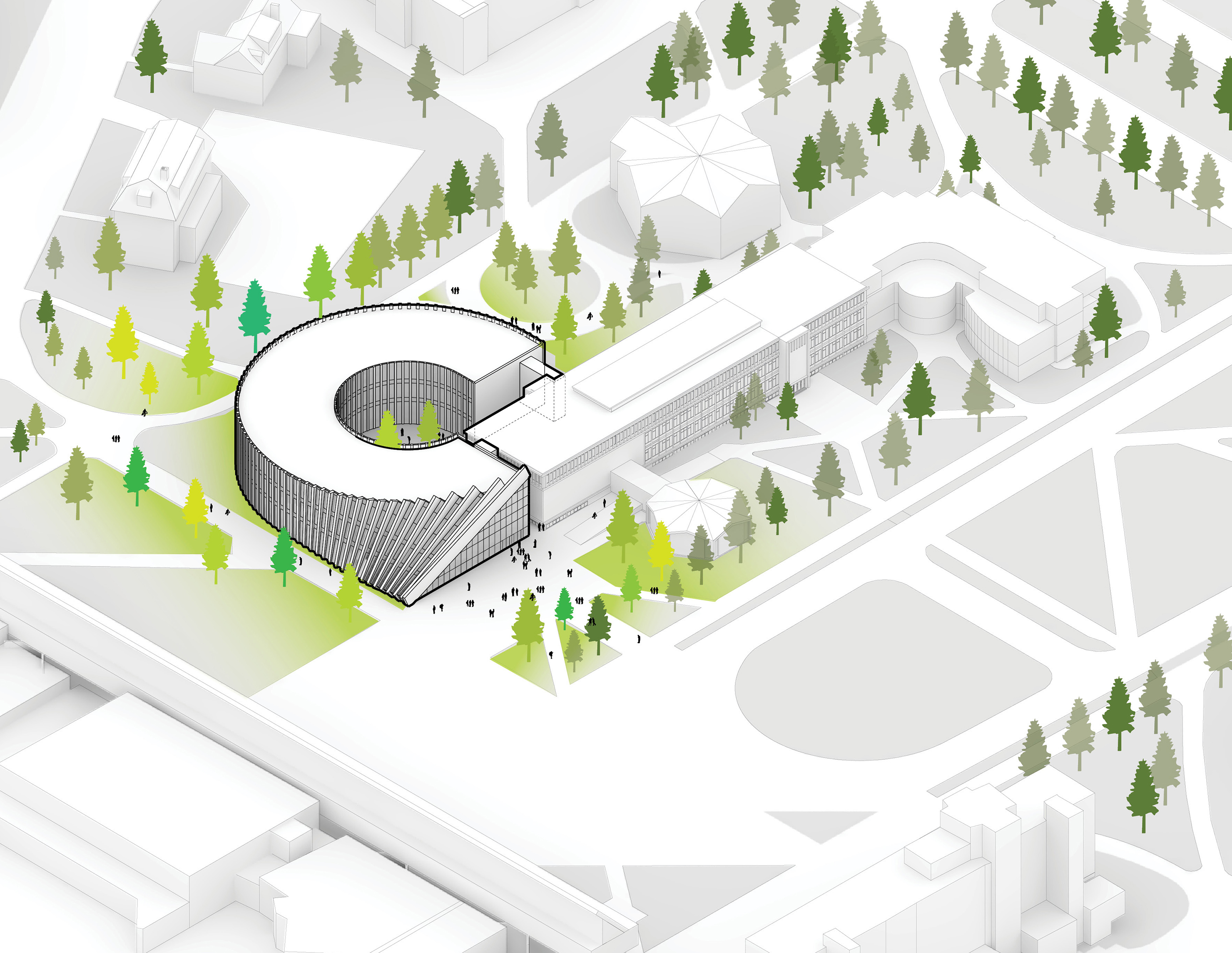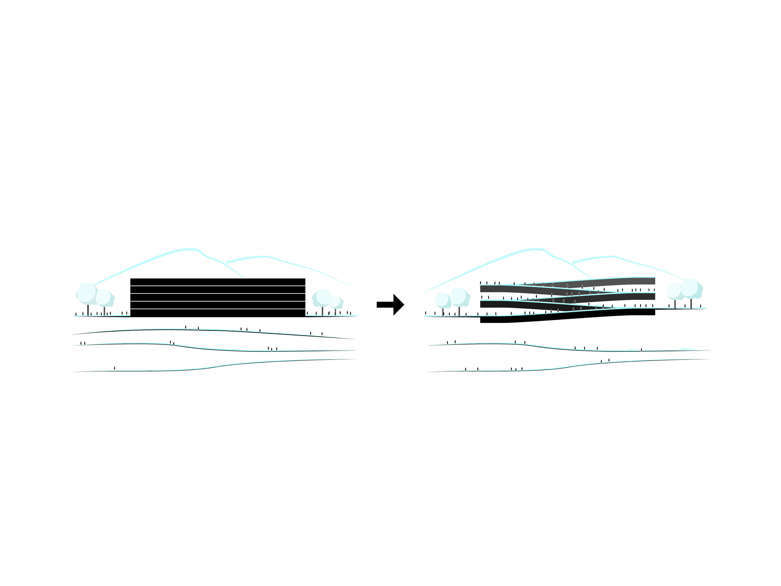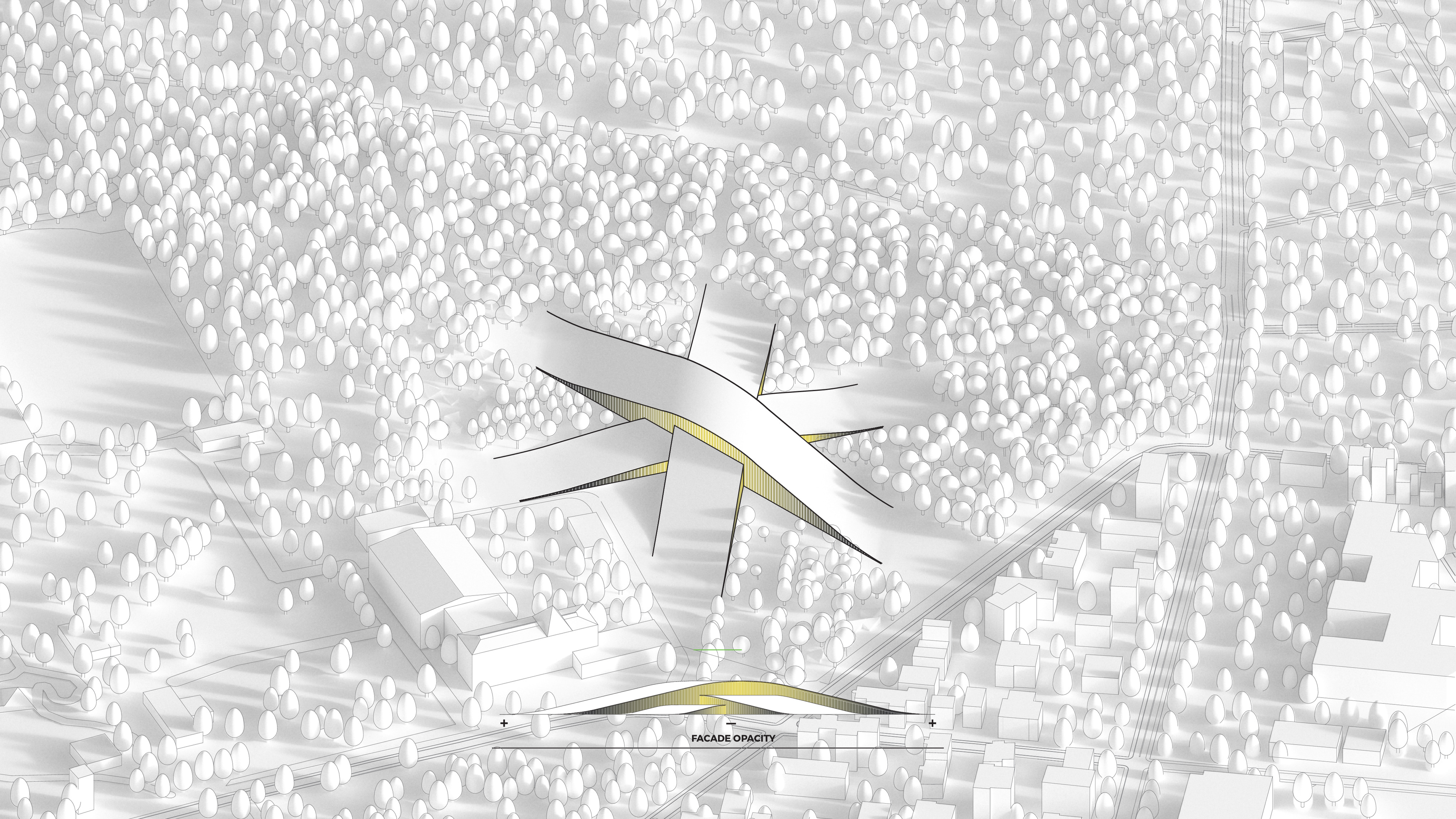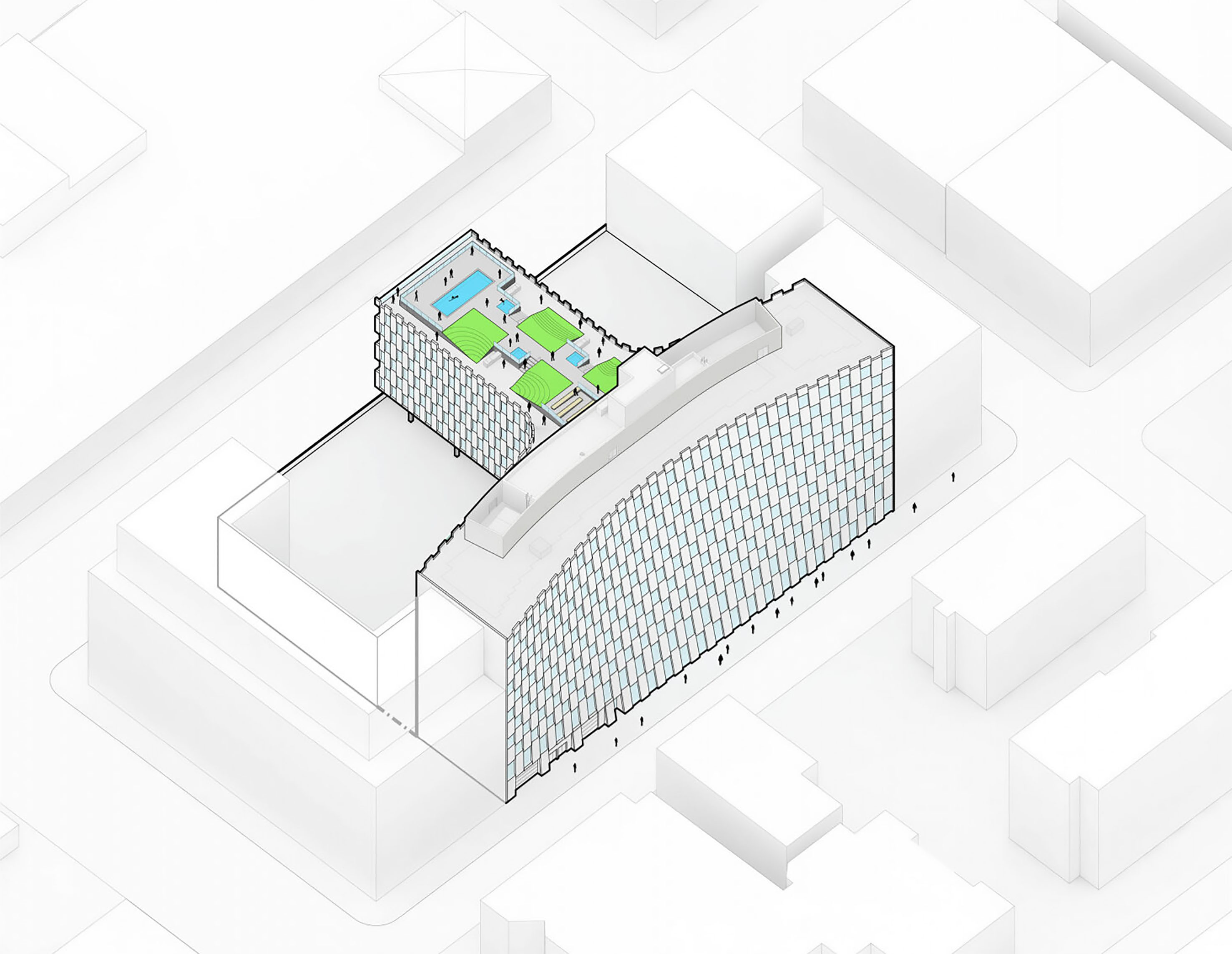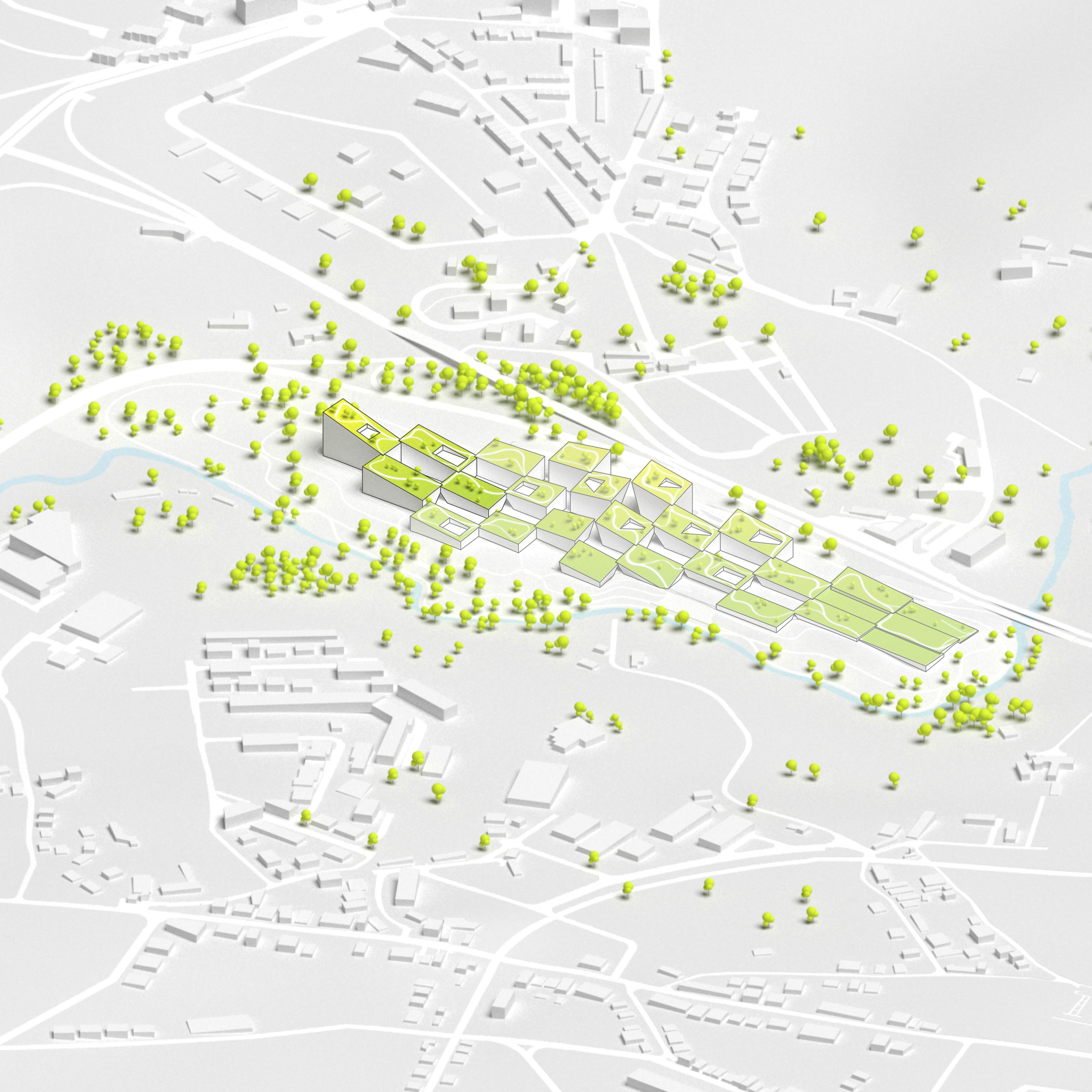 "Starting from the modularity of an optimal kitchen, we configured the new GOe and its public and private programmes as a grid - the façade is carried to the roof extending the landscape and the buildings many public spaces and exterior programs in a continuous motion. Gently waving up from the ground, GOe will be a good neighbor and citizen in San Sebastian, offering a window into global gastronomic discovery while creating new public spaces, plazas, parks, and views."
