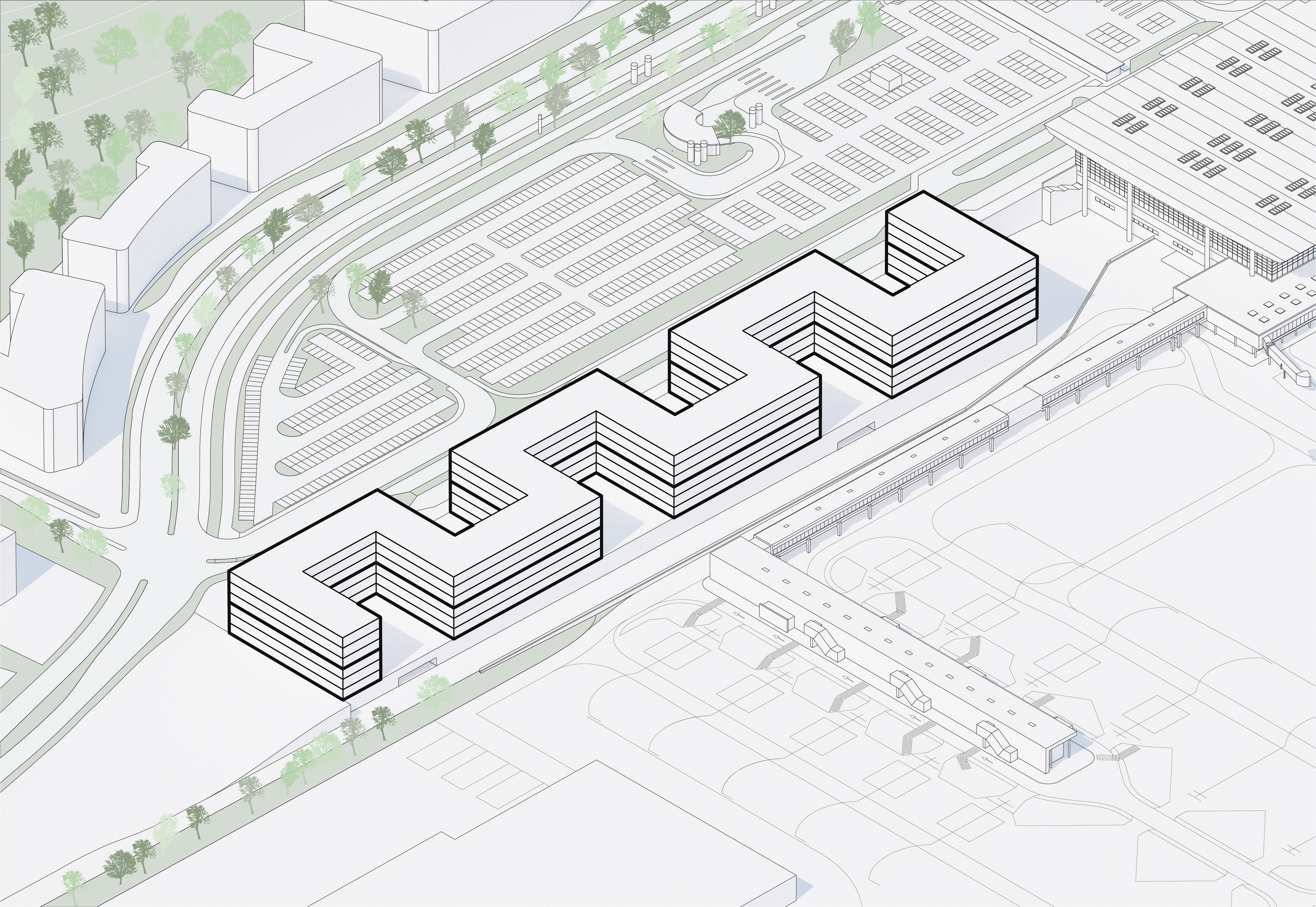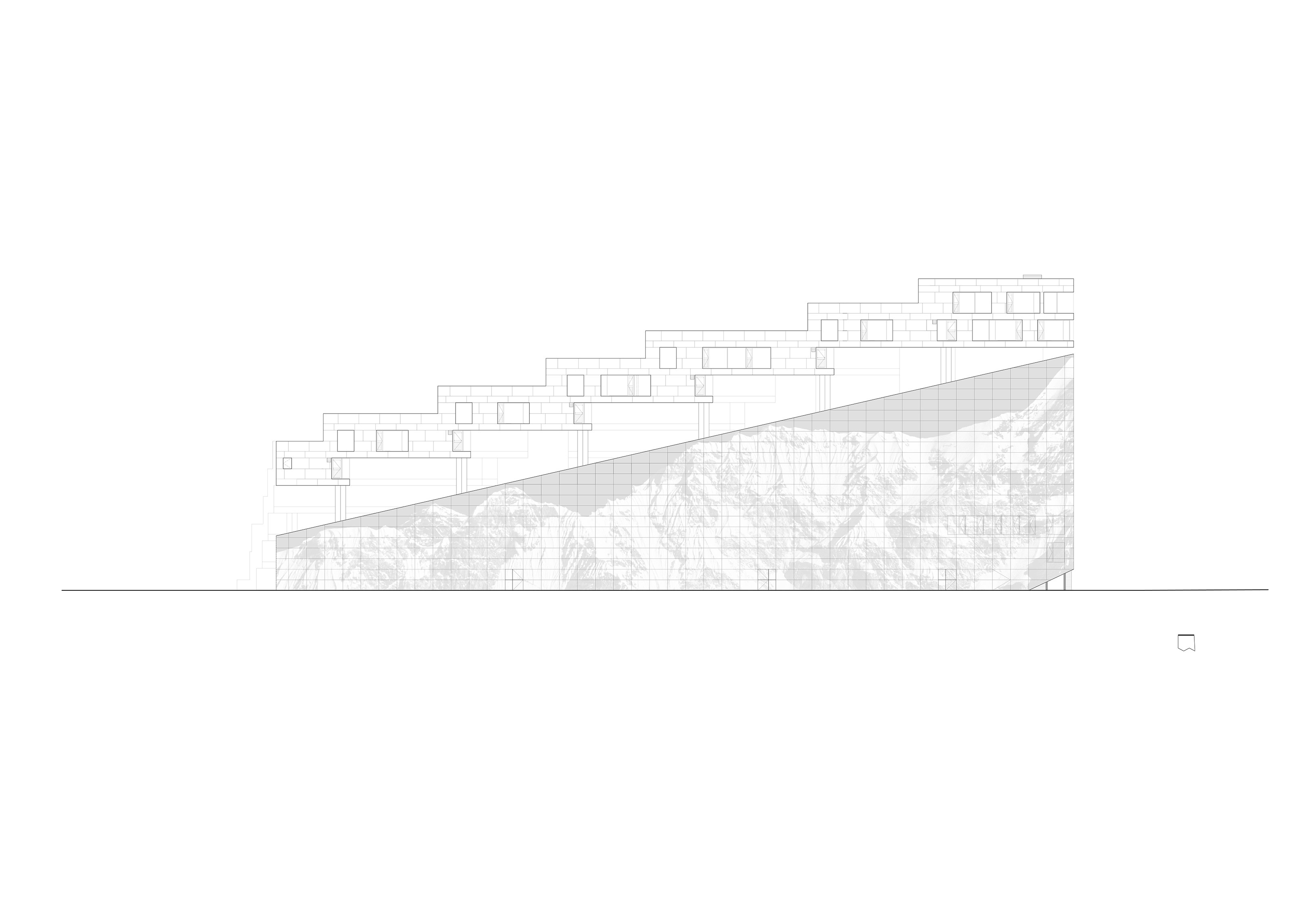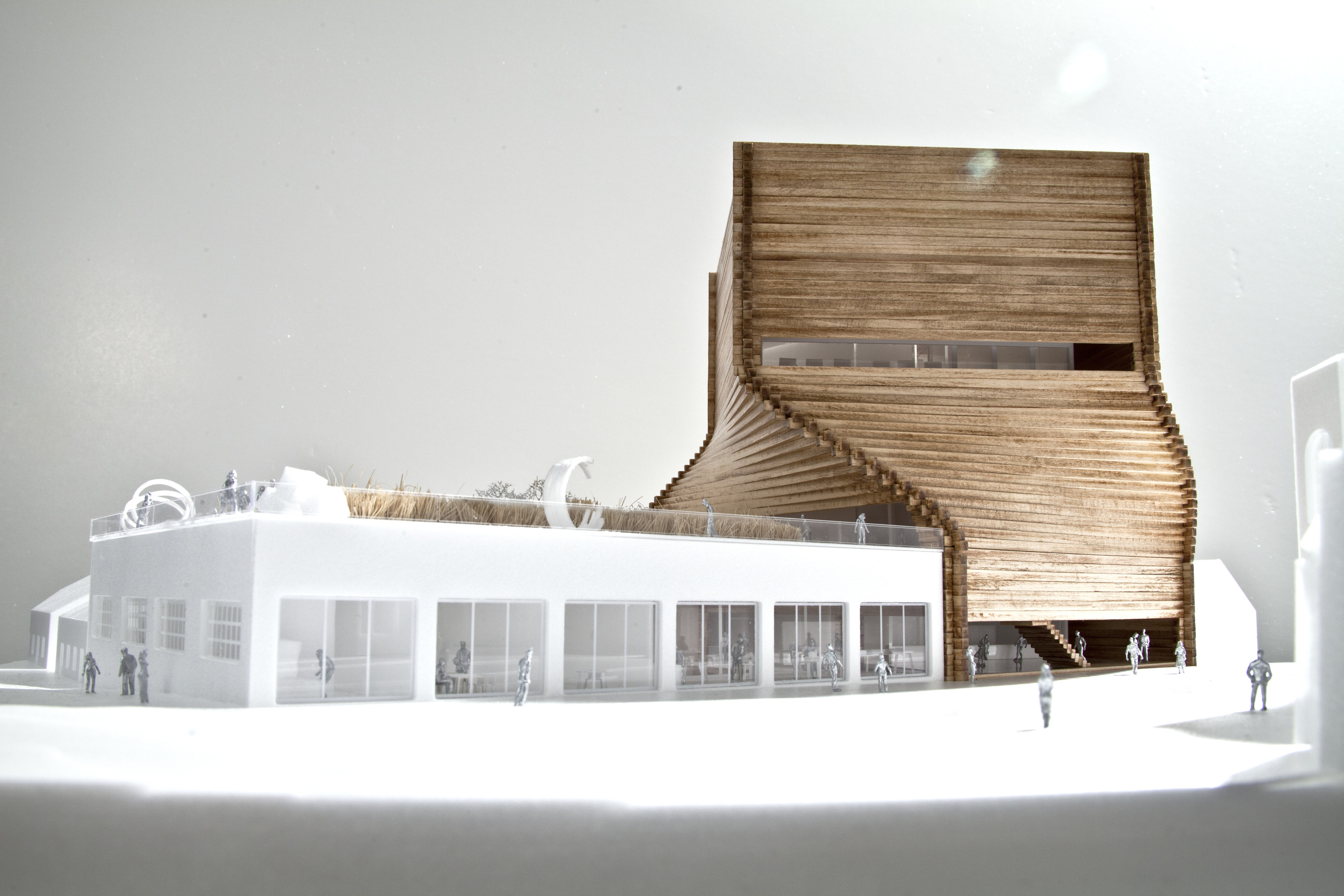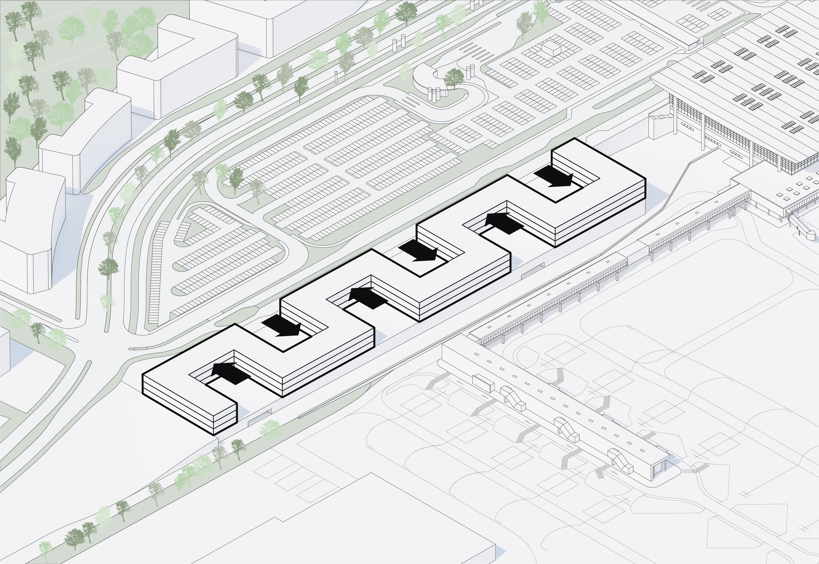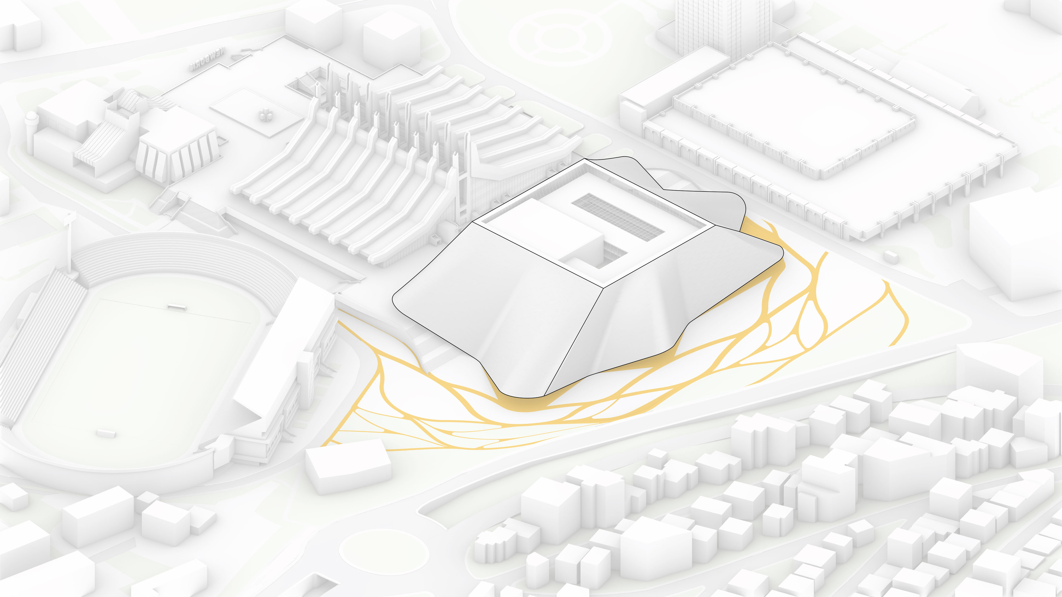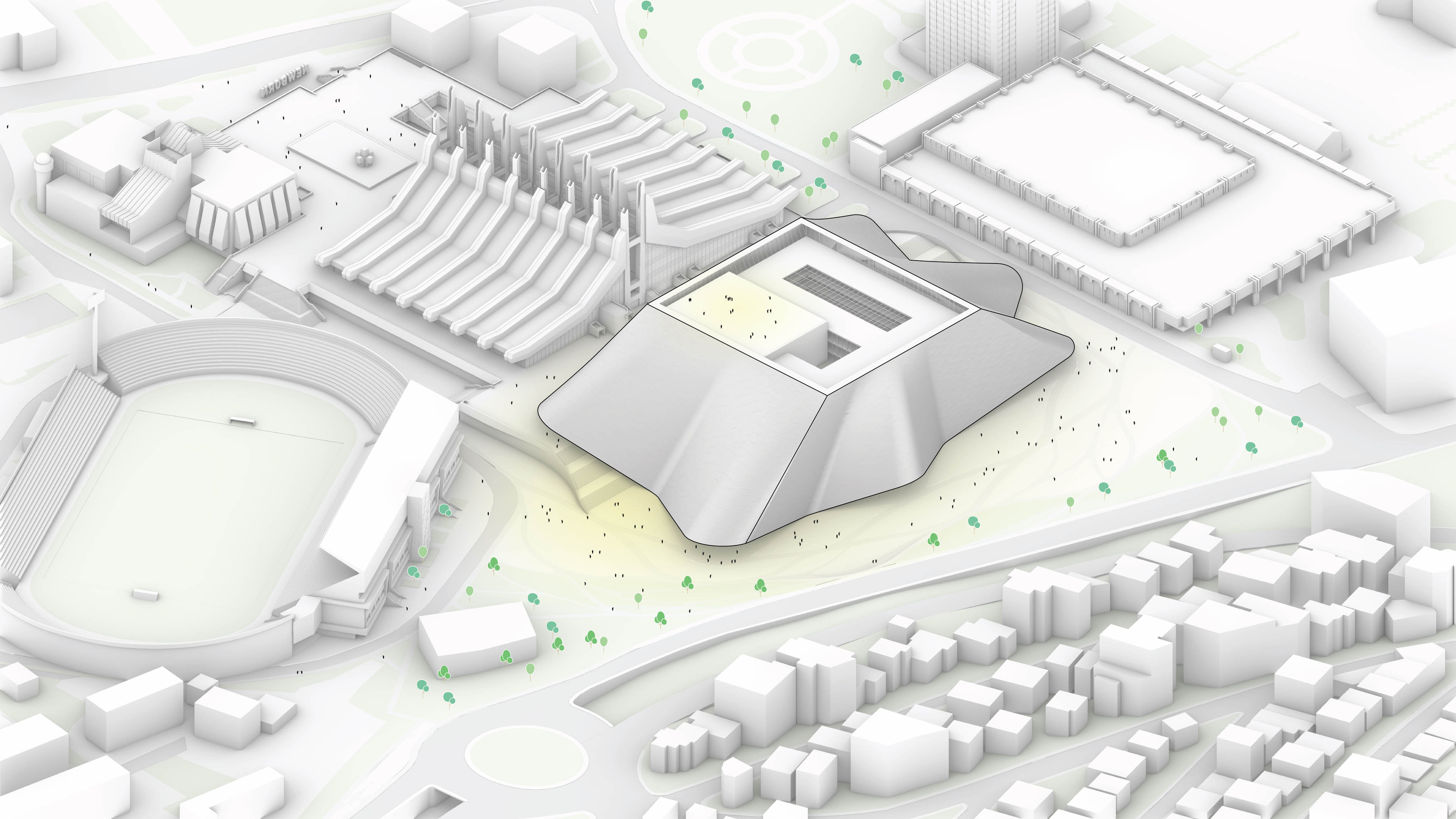 "Starting from the modularity of an optimal kitchen, we configured the new GOe and its public and private programmes as a grid - the façade is carried to the roof extending the landscape and the buildings many public spaces and exterior programs in a continuous motion. Gently waving up from the ground, GOe will be a good neighbor and citizen in San Sebastian, offering a window into global gastronomic discovery while creating new public spaces, plazas, parks, and views."