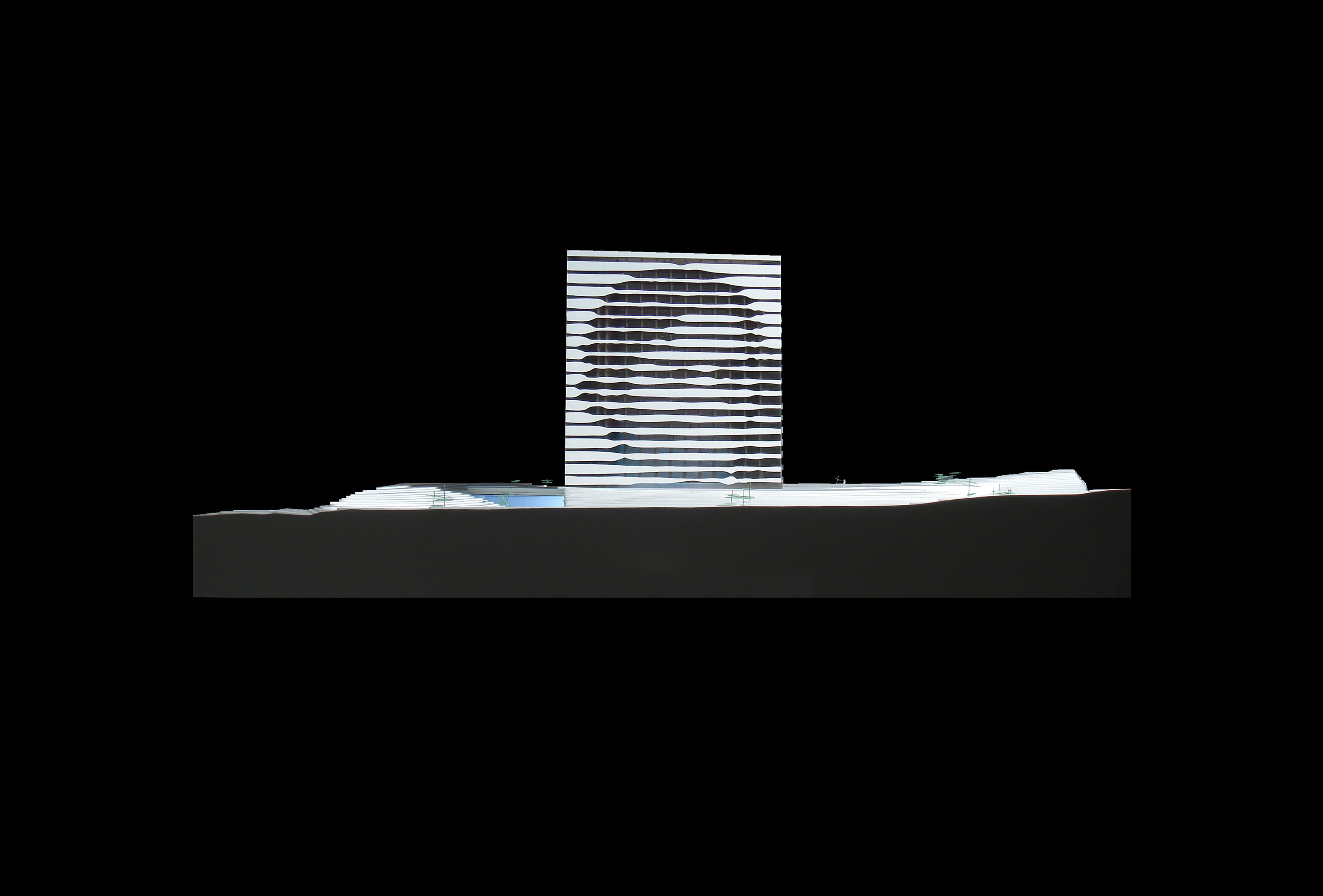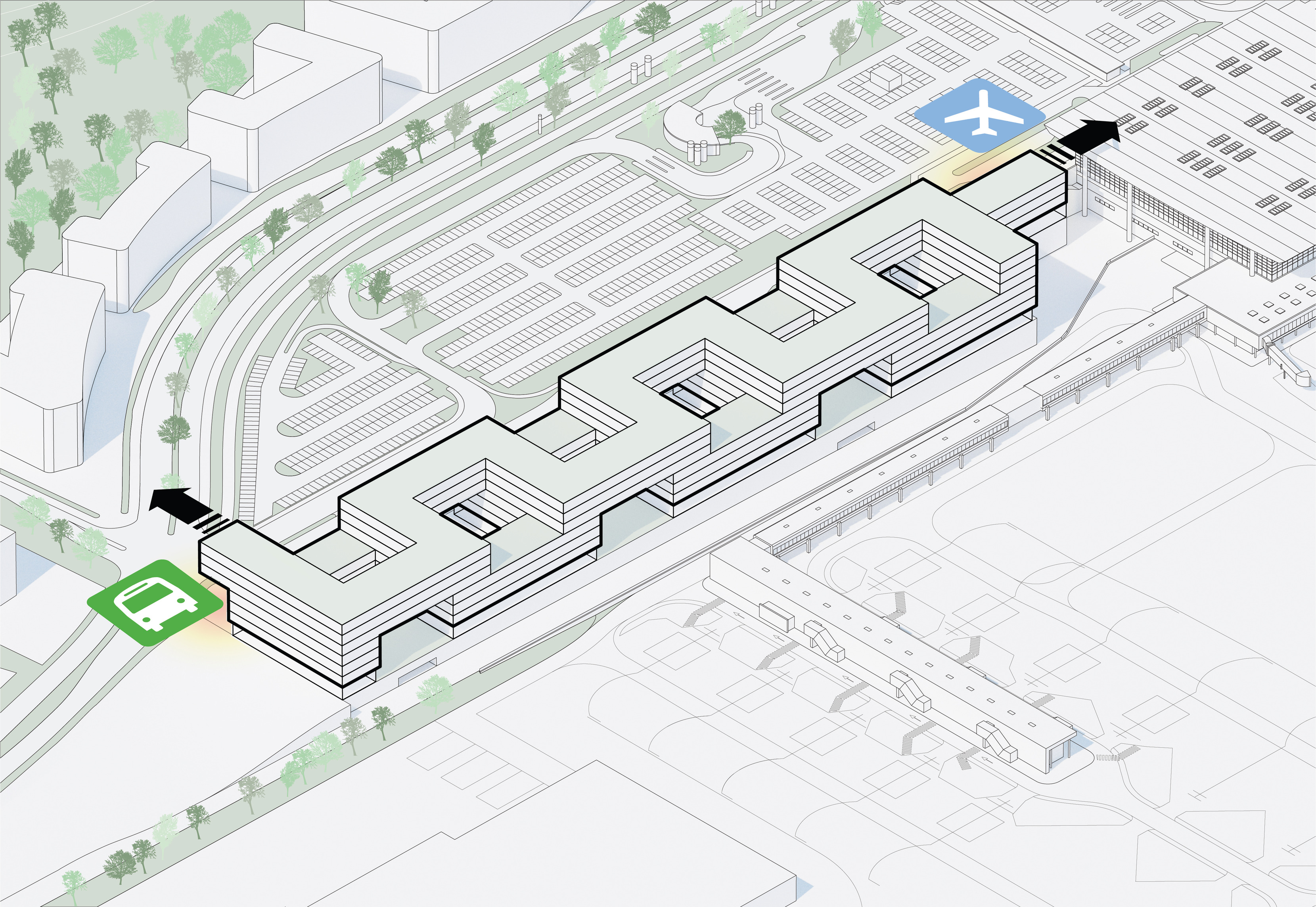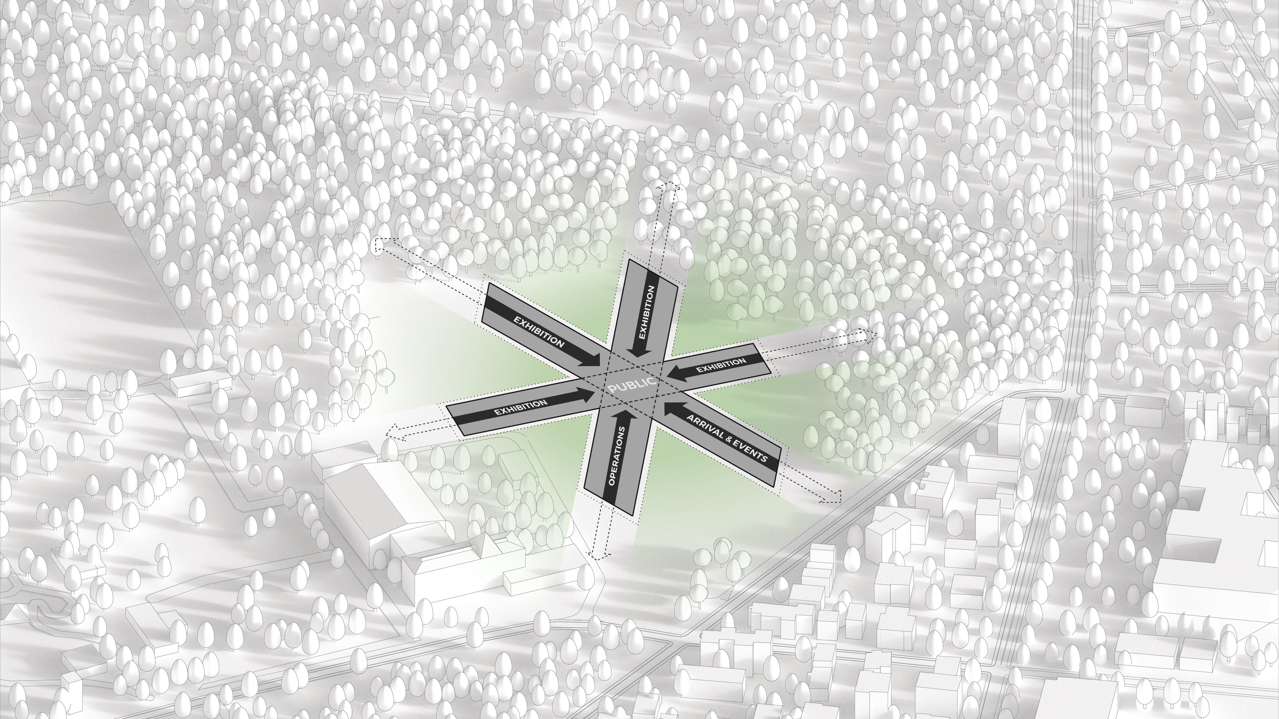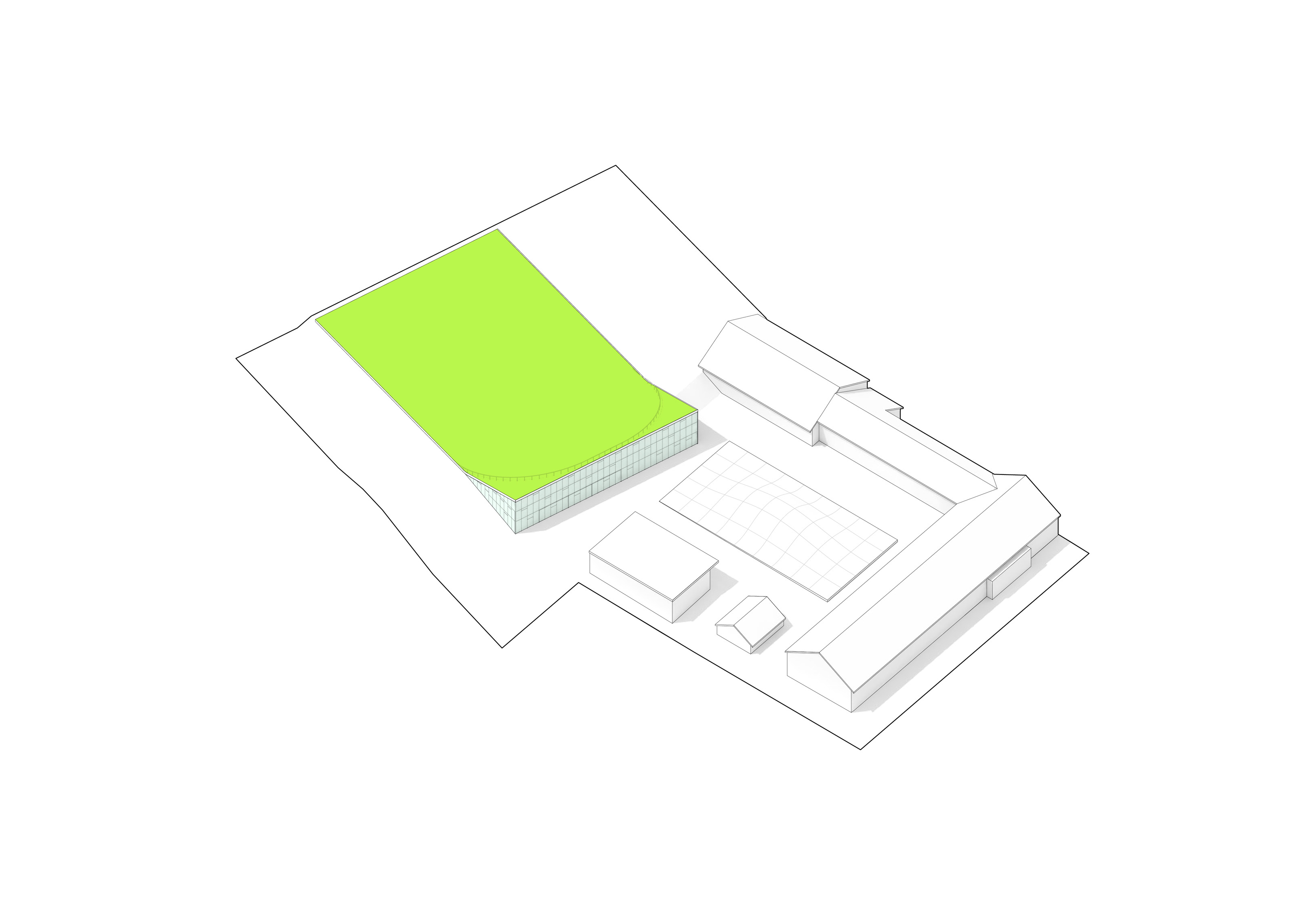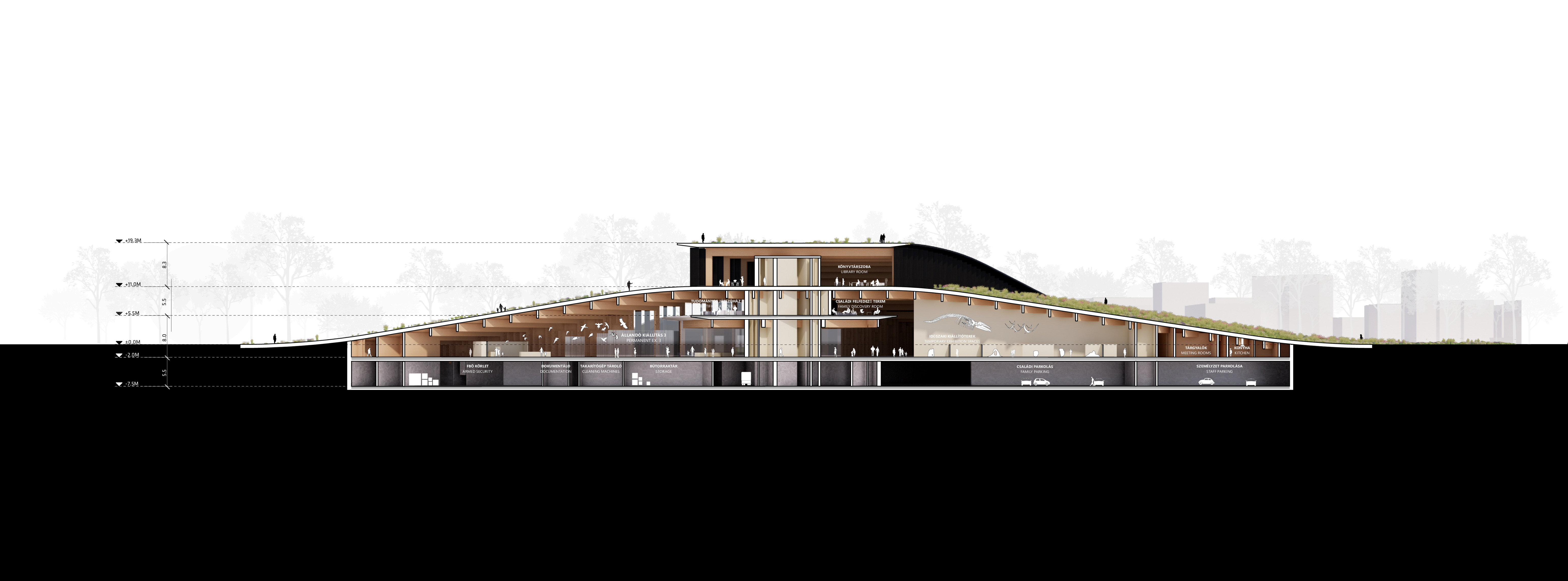 "Starting from the modularity of an optimal kitchen, we configured the new GOe and its public and private programmes as a grid - the façade is carried to the roof extending the landscape and the buildings many public spaces and exterior programs in a continuous motion. Gently waving up from the ground, GOe will be a good neighbor and citizen in San Sebastian, offering a window into global gastronomic discovery while creating new public spaces, plazas, parks, and views."