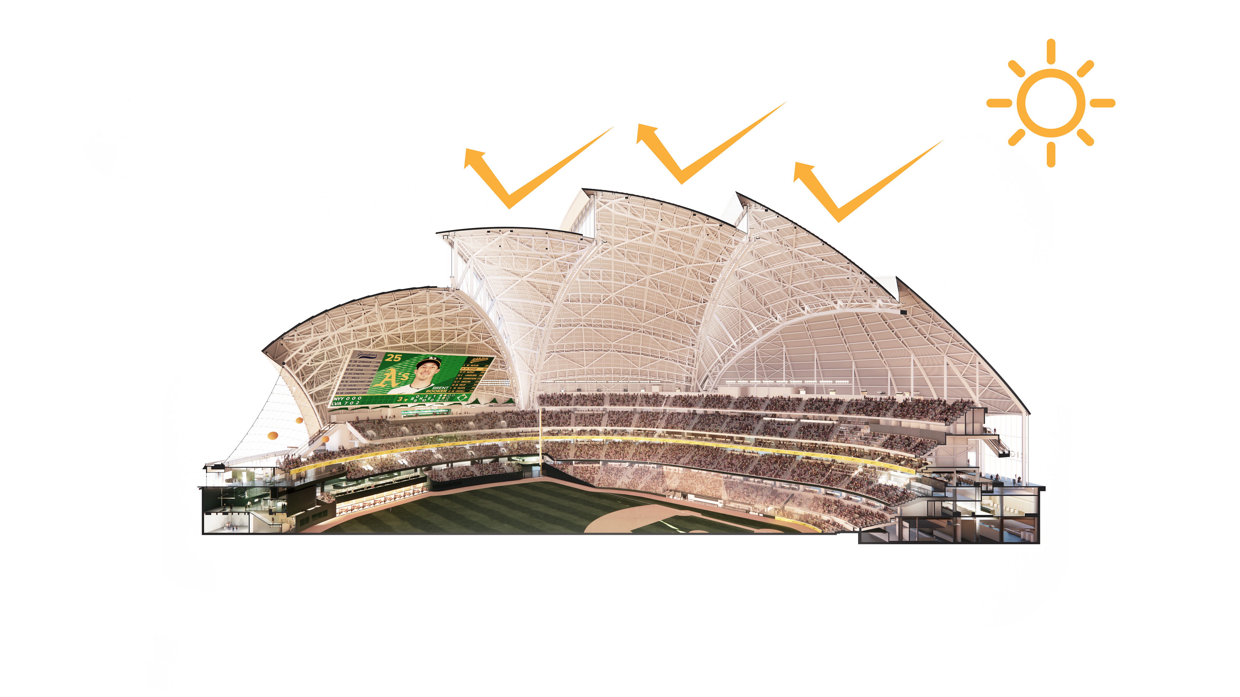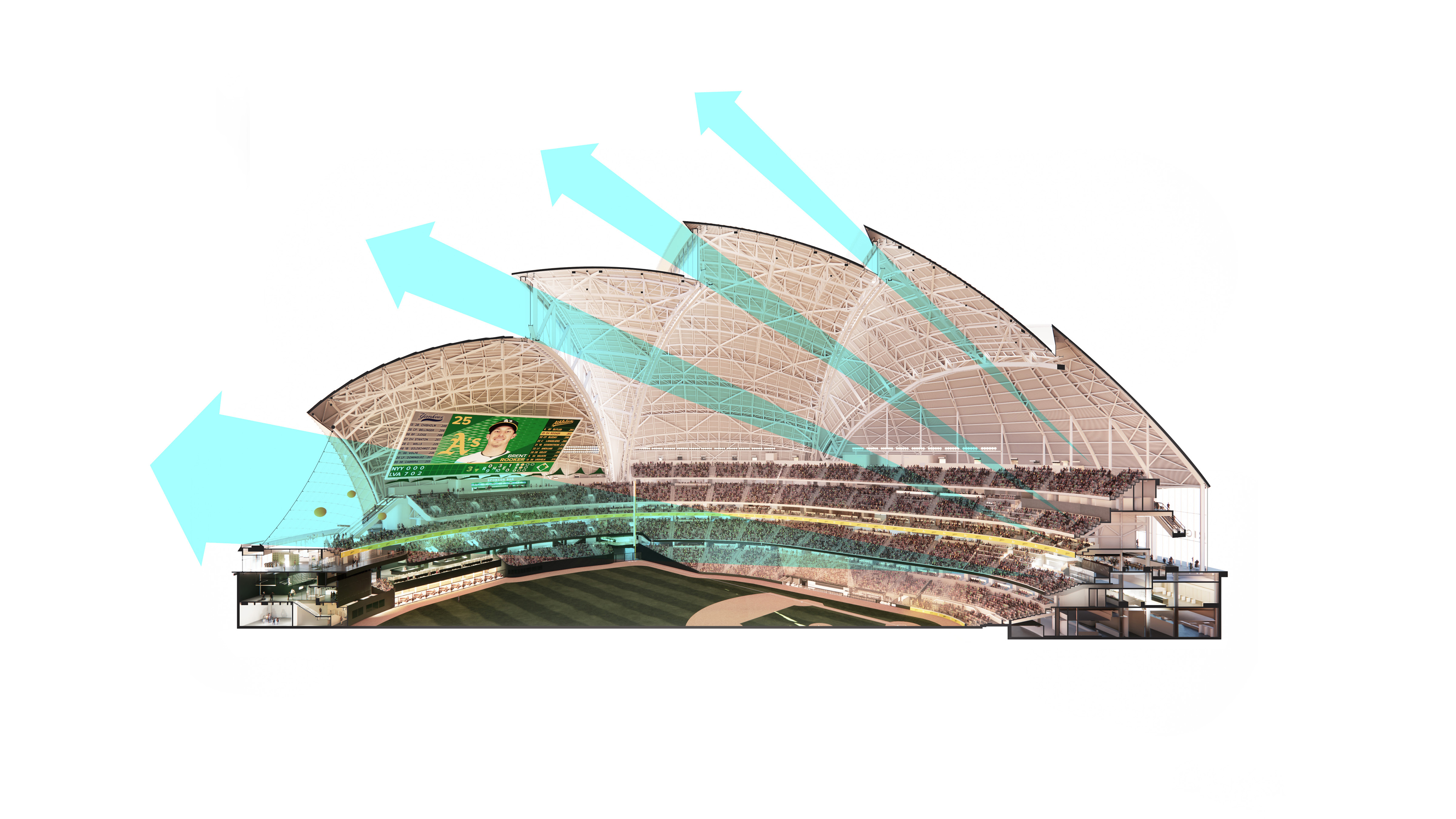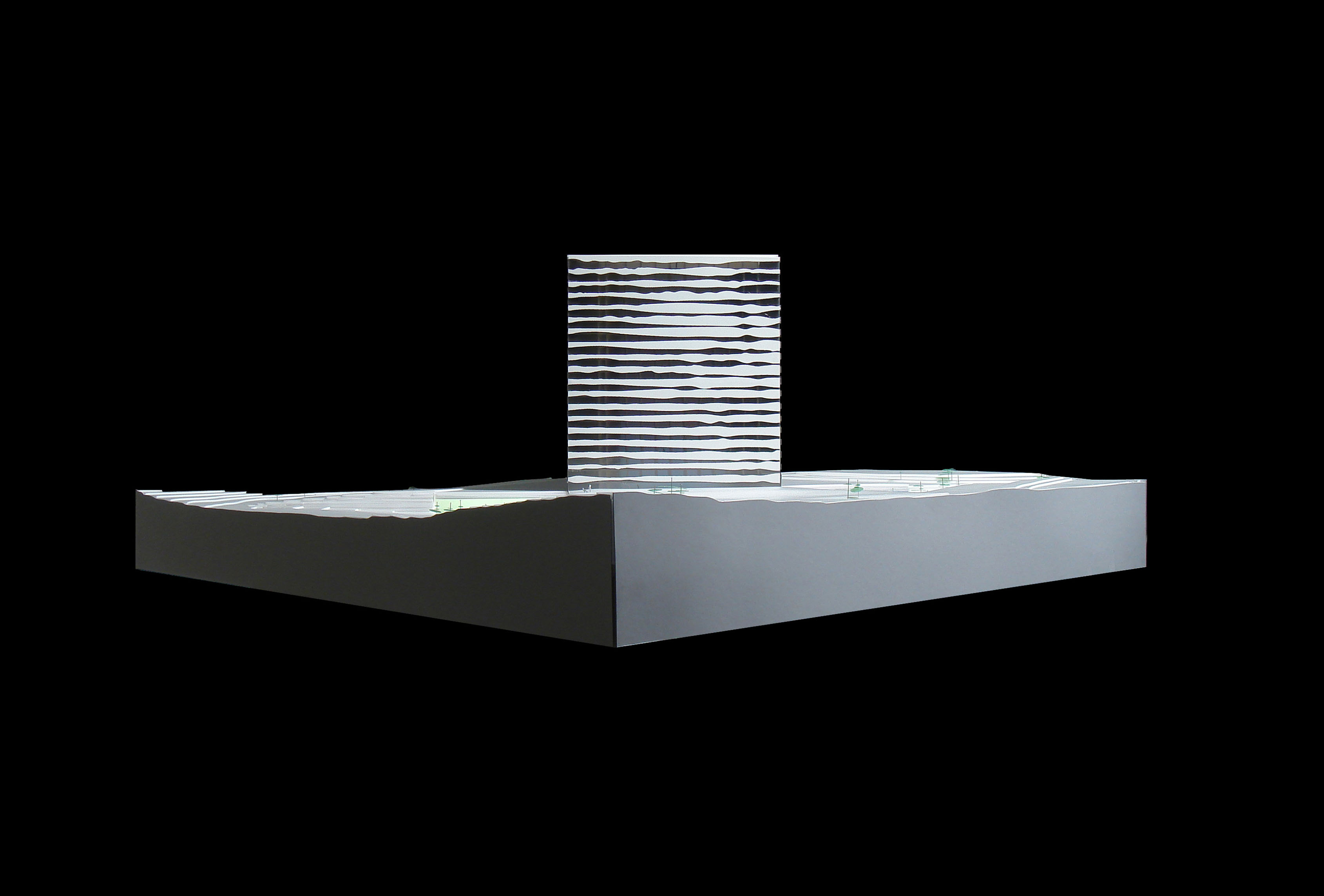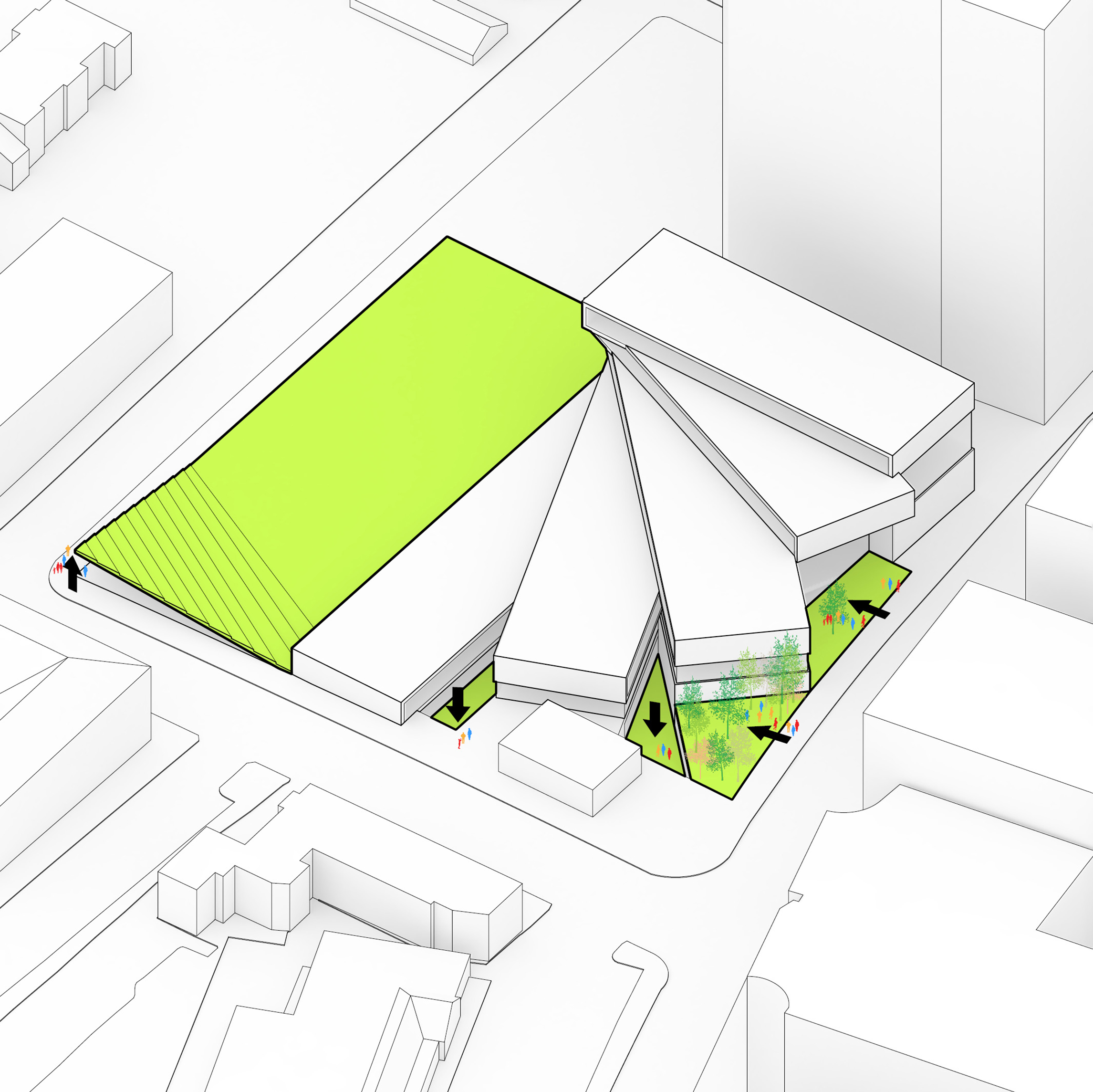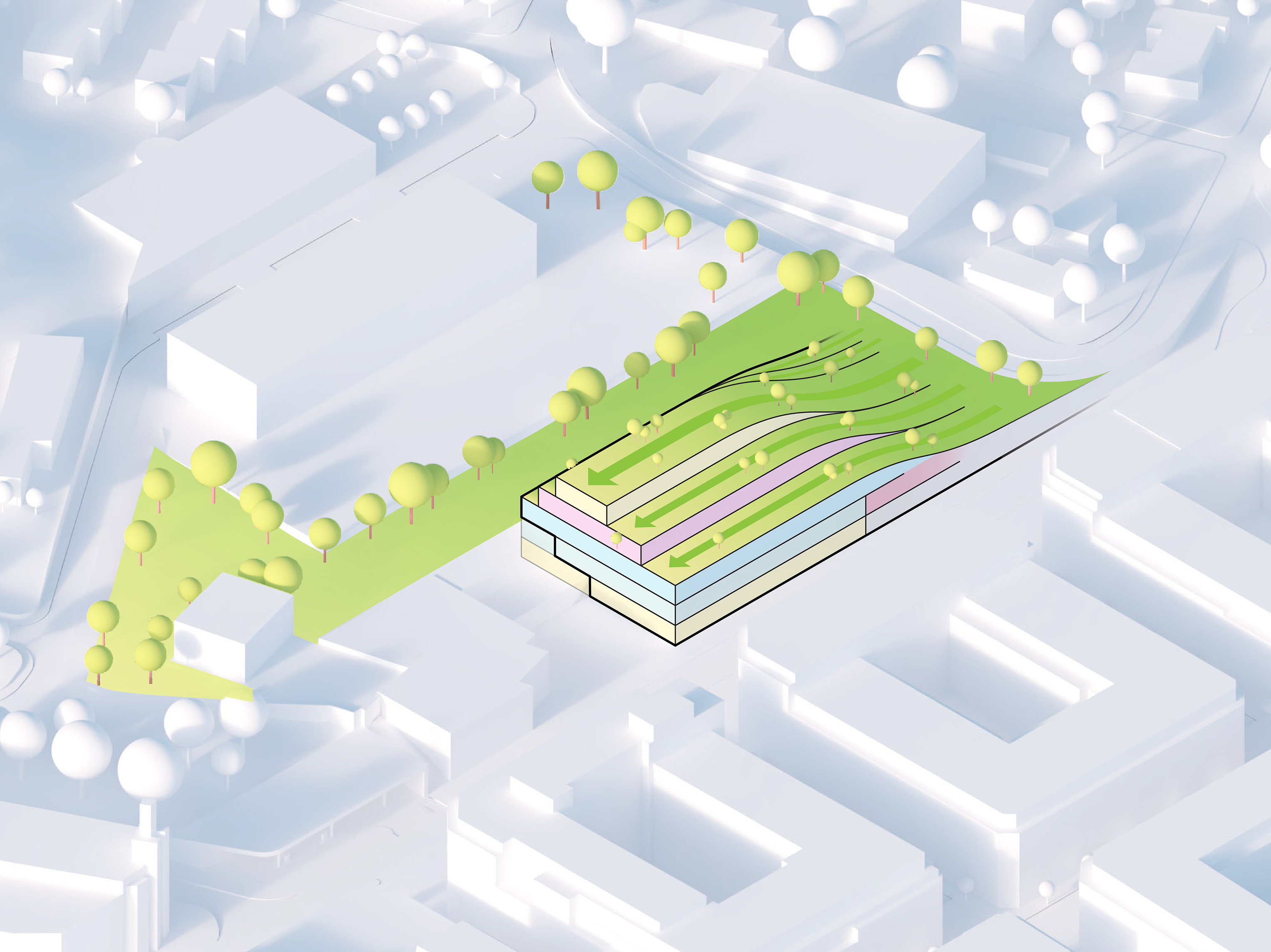 "Starting from the modularity of an optimal kitchen, we configured the new GOe and its public and private programmes as a grid - the façade is carried to the roof extending the landscape and the buildings many public spaces and exterior programs in a continuous motion. Gently waving up from the ground, GOe will be a good neighbor and citizen in San Sebastian, offering a window into global gastronomic discovery while creating new public spaces, plazas, parks, and views."
