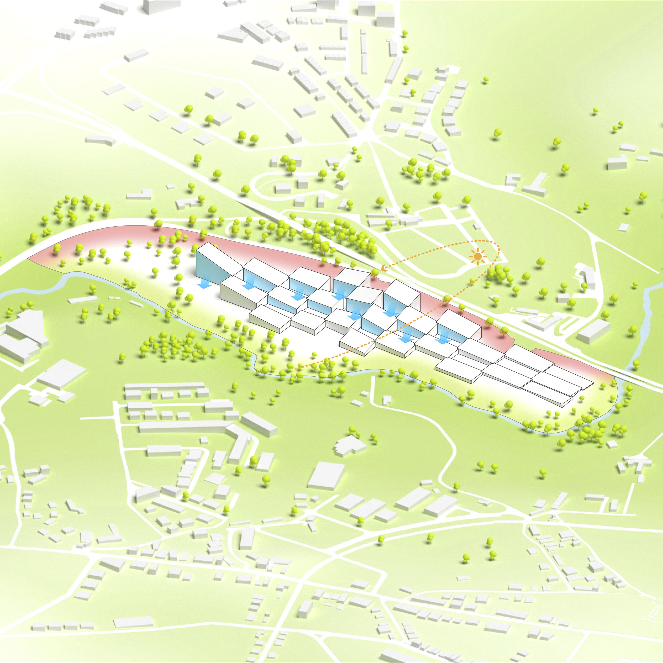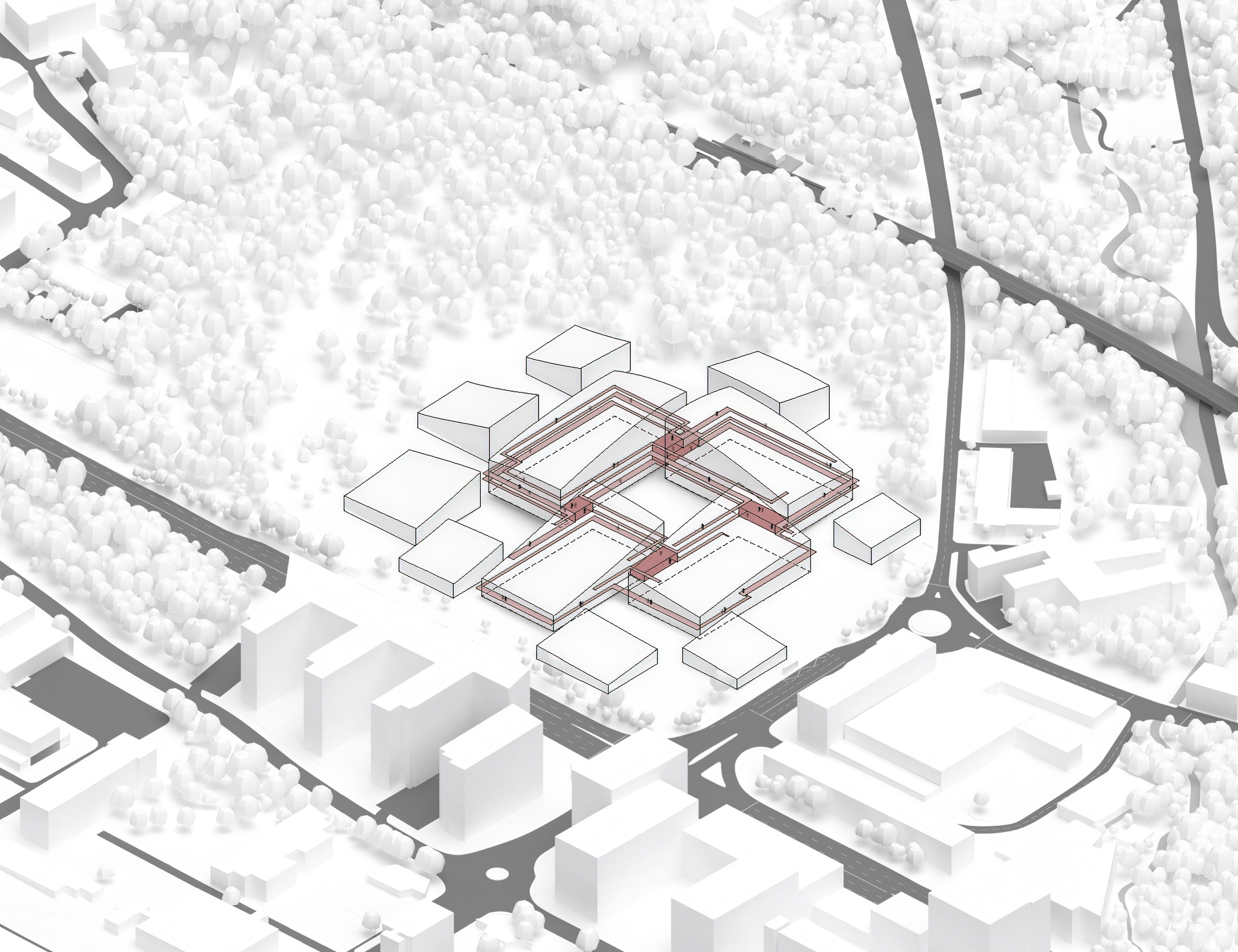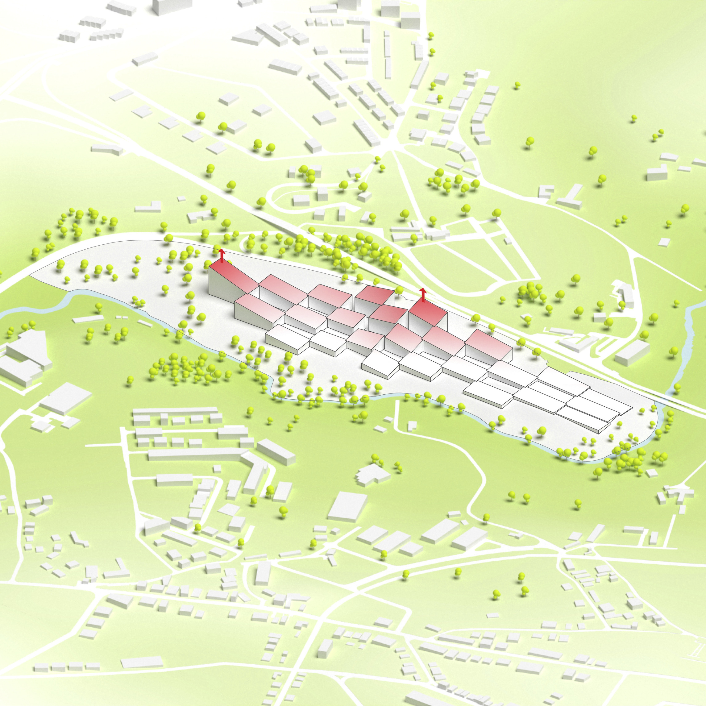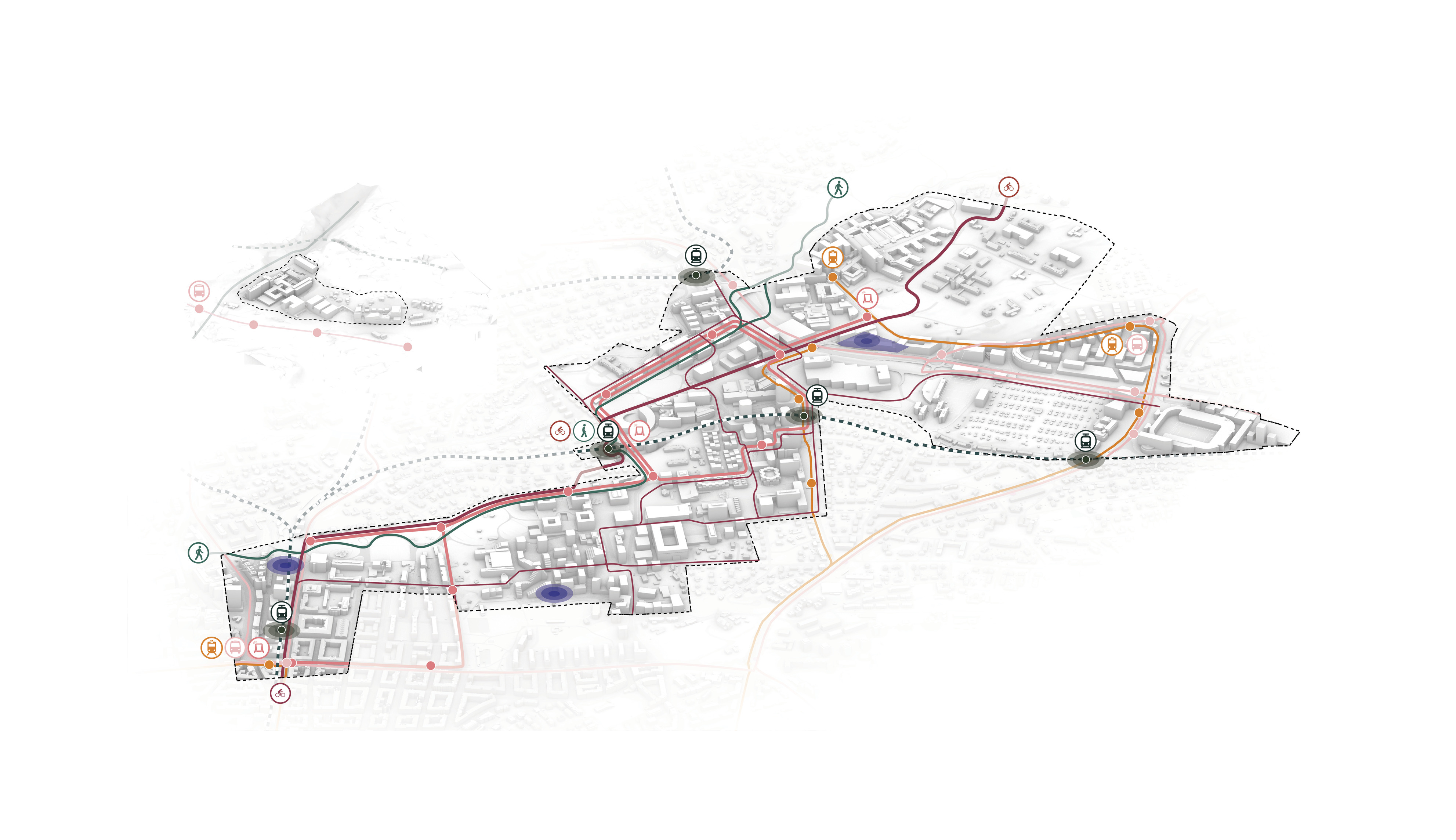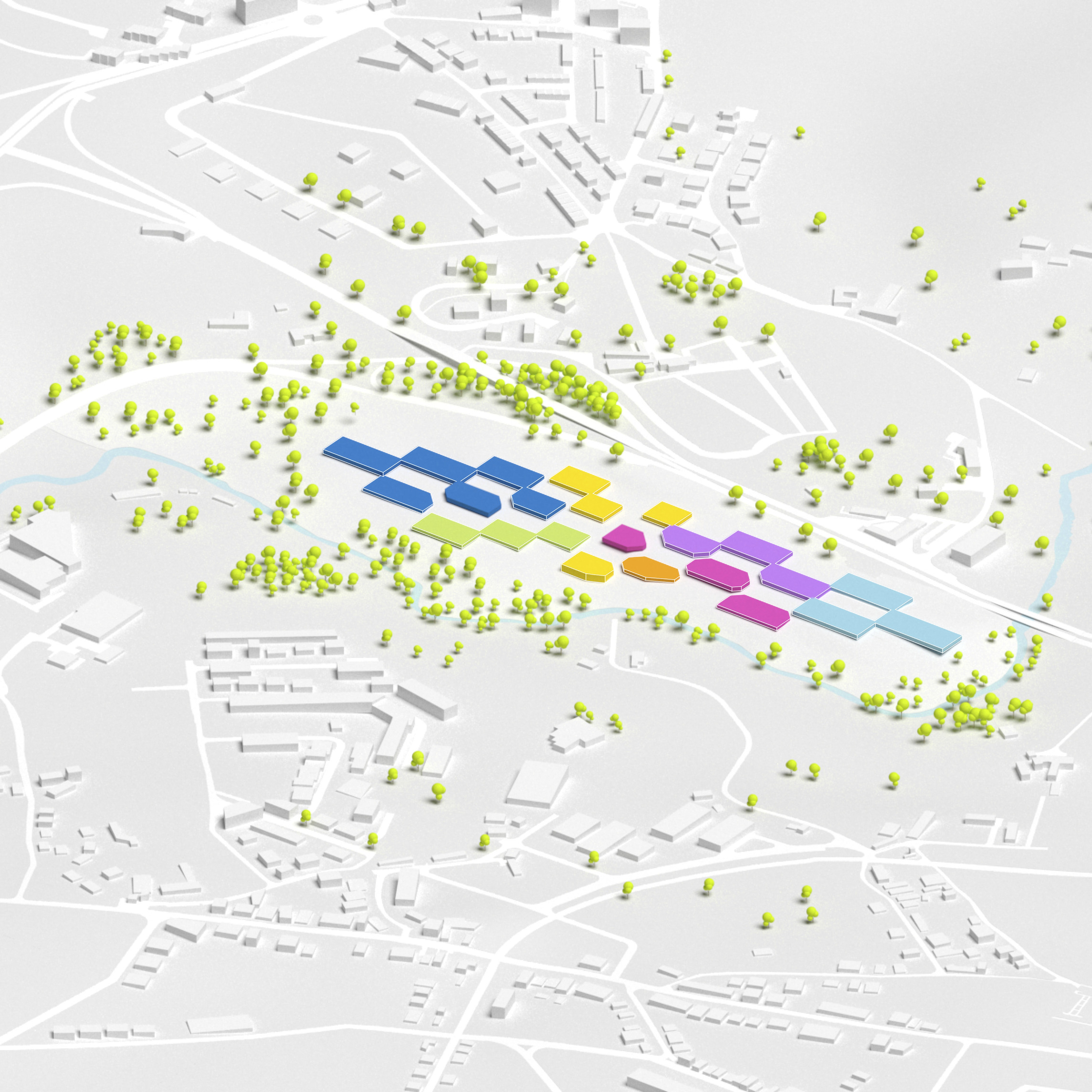 The masterplan complements the Wollongong district with facilities for research, education, and manufacturing. New buildings and infrastructure carefully adapt to the site’s conditions, preserving most of the existing structures, roads and trees while proposing new volumes in different sizes and orientations with open ground-floors and plazas.