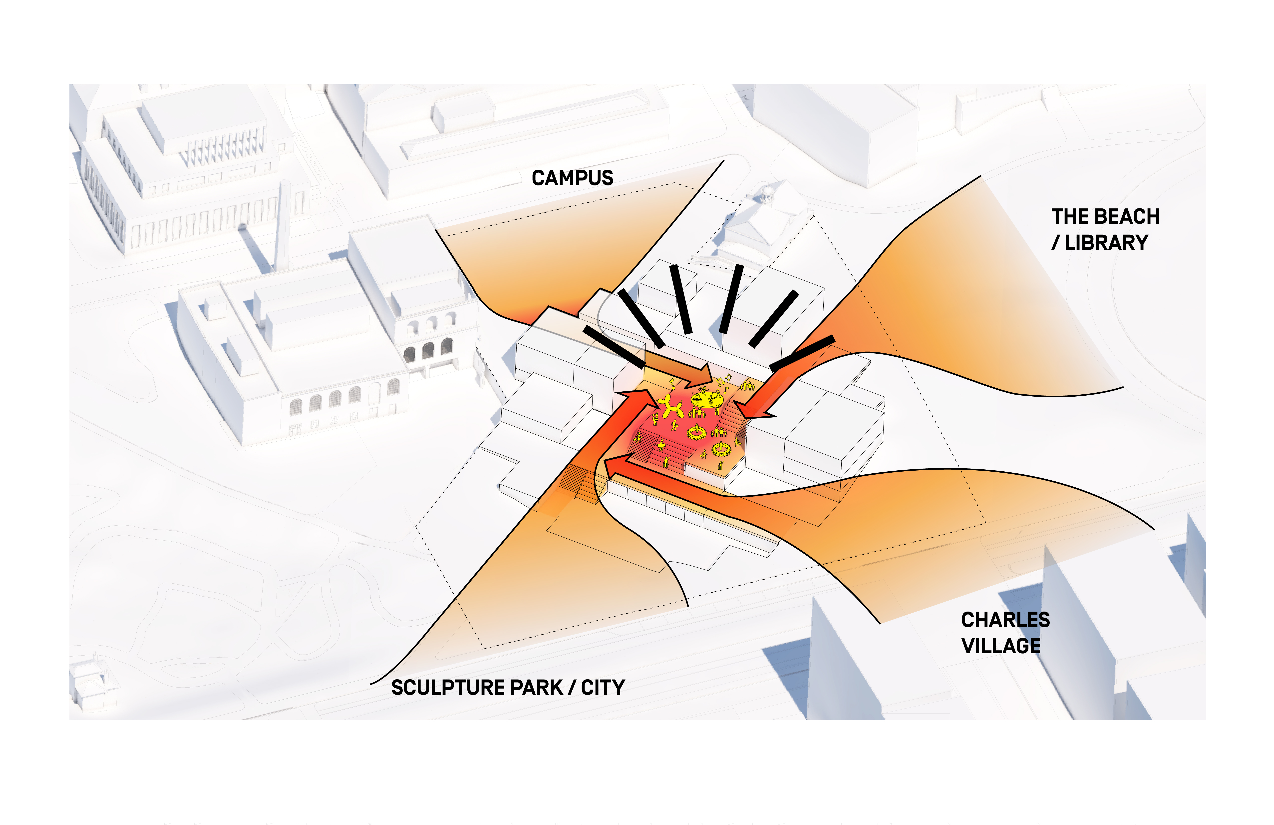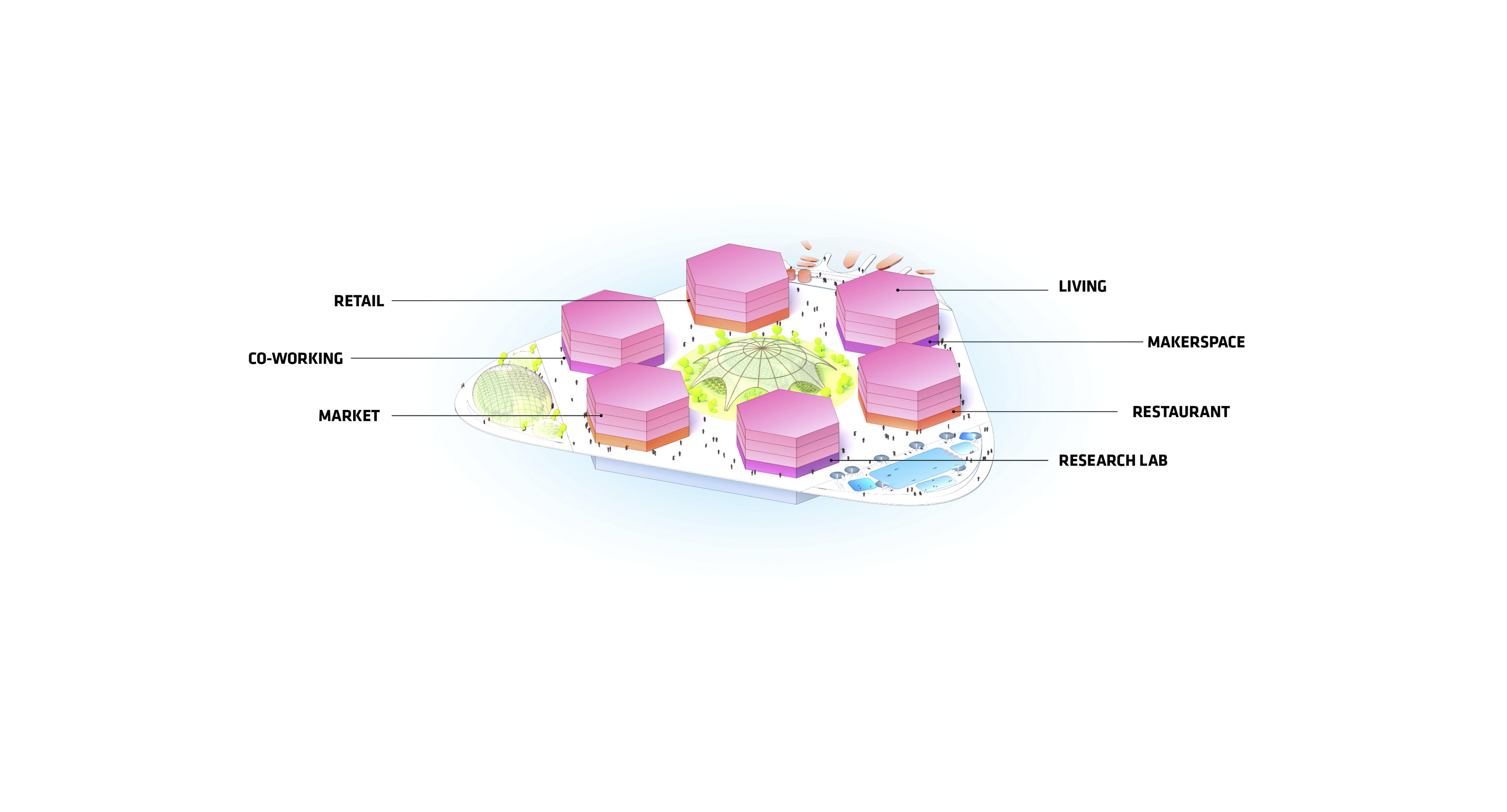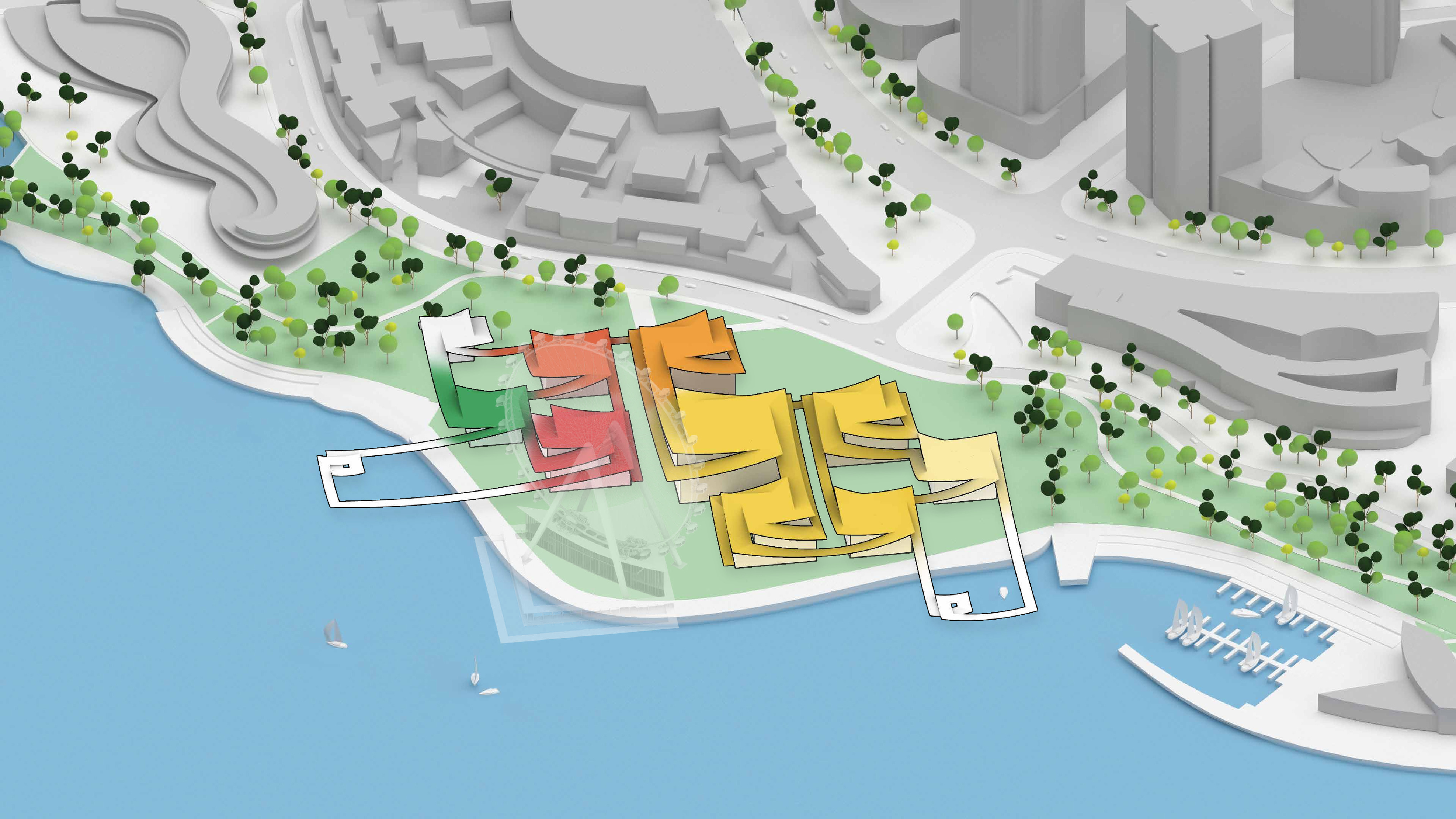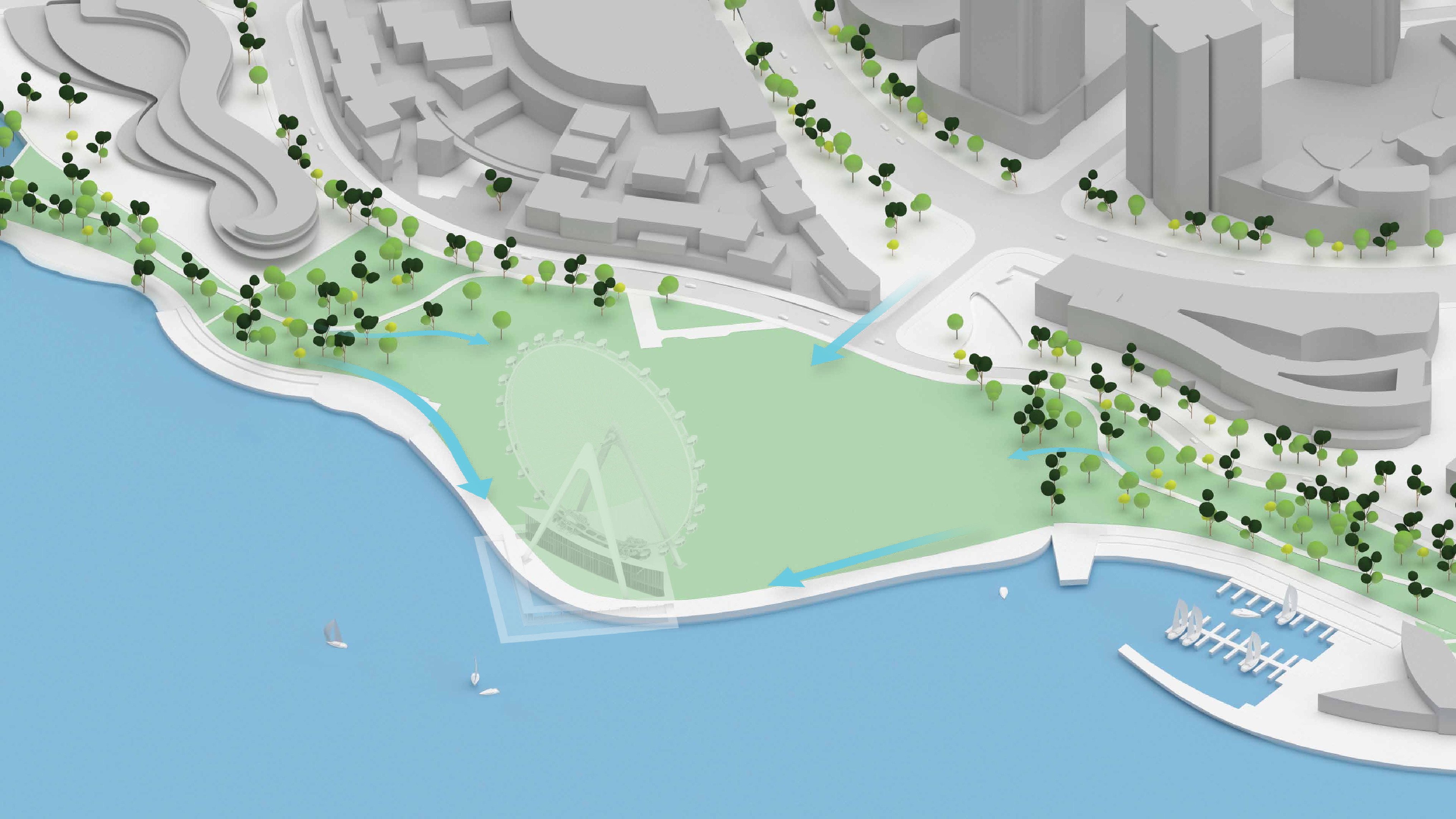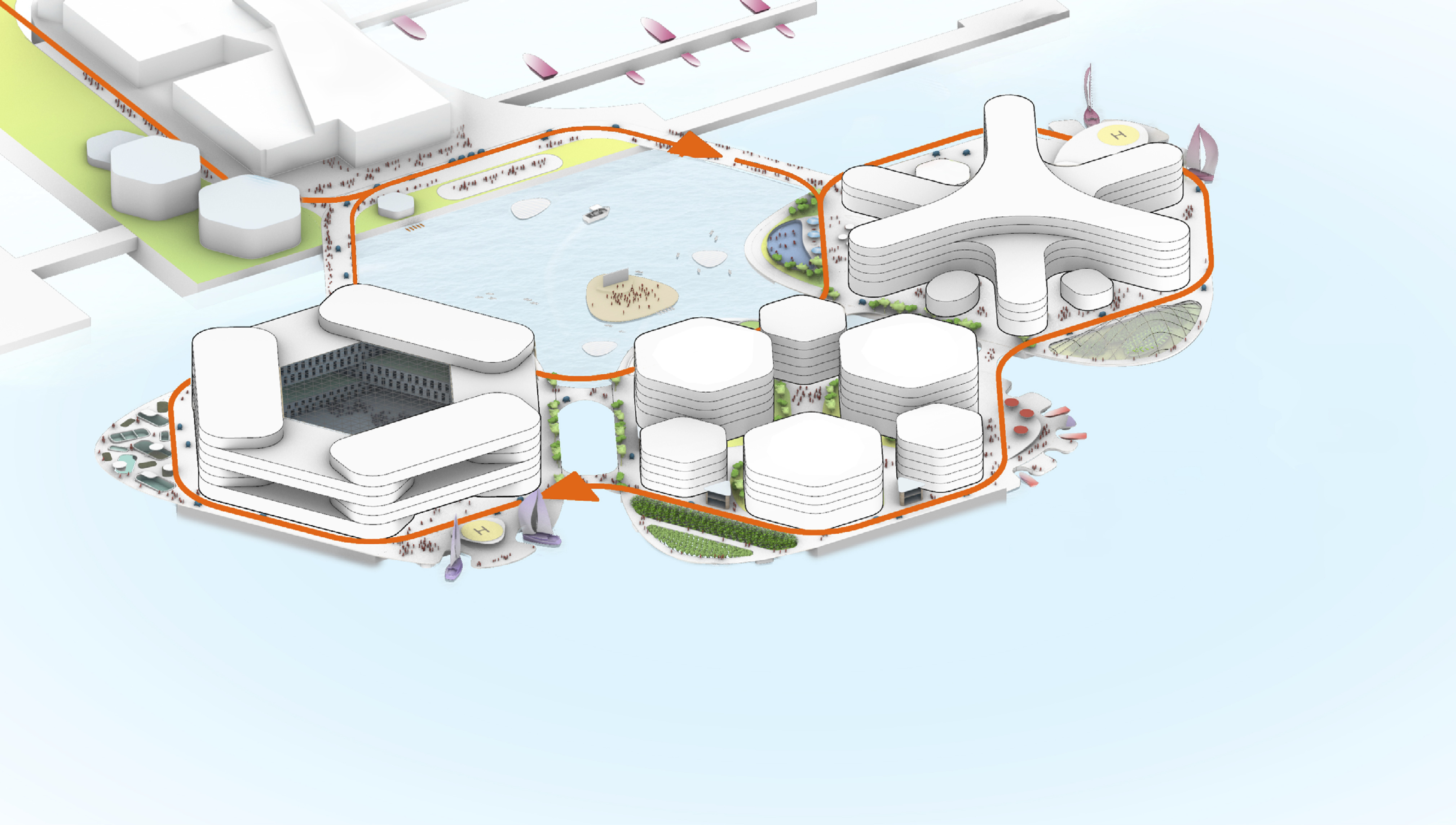 The urban realm is conceived as a flexible network of streets dedicated to various speeds of mobility for safer, pedestrian-friendly connections. The main entrance to the area will be on Five Island Road from where visitors will be able to freely meander and explore a variety of scales, programs and outdoor areas.