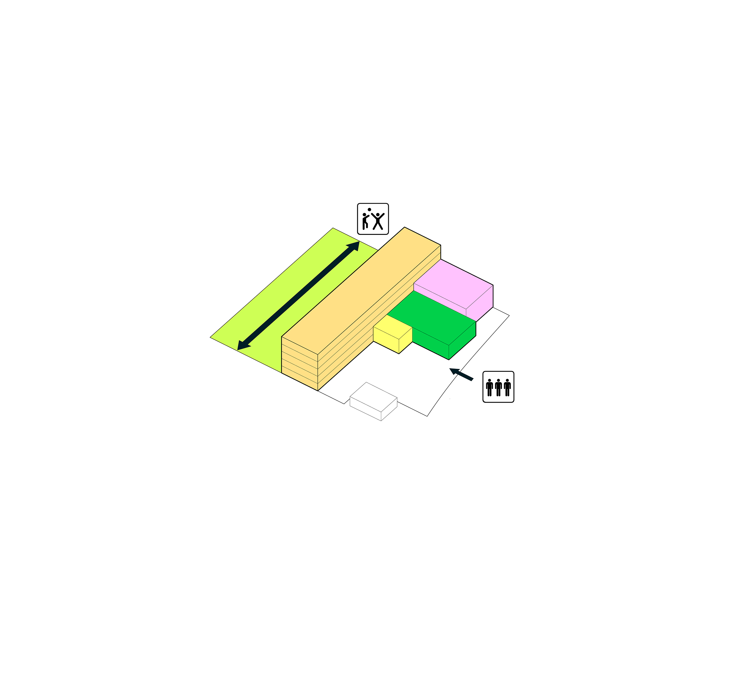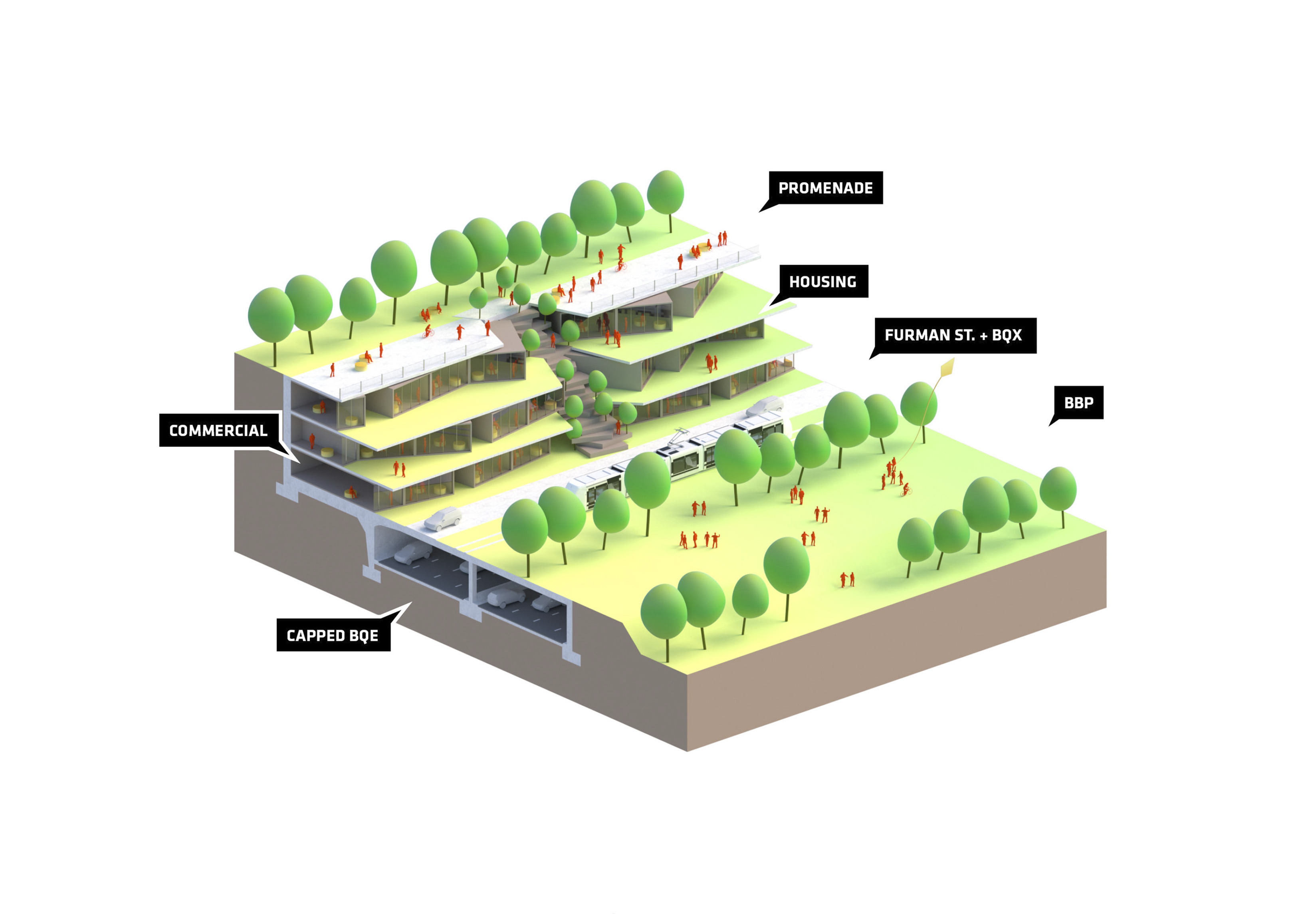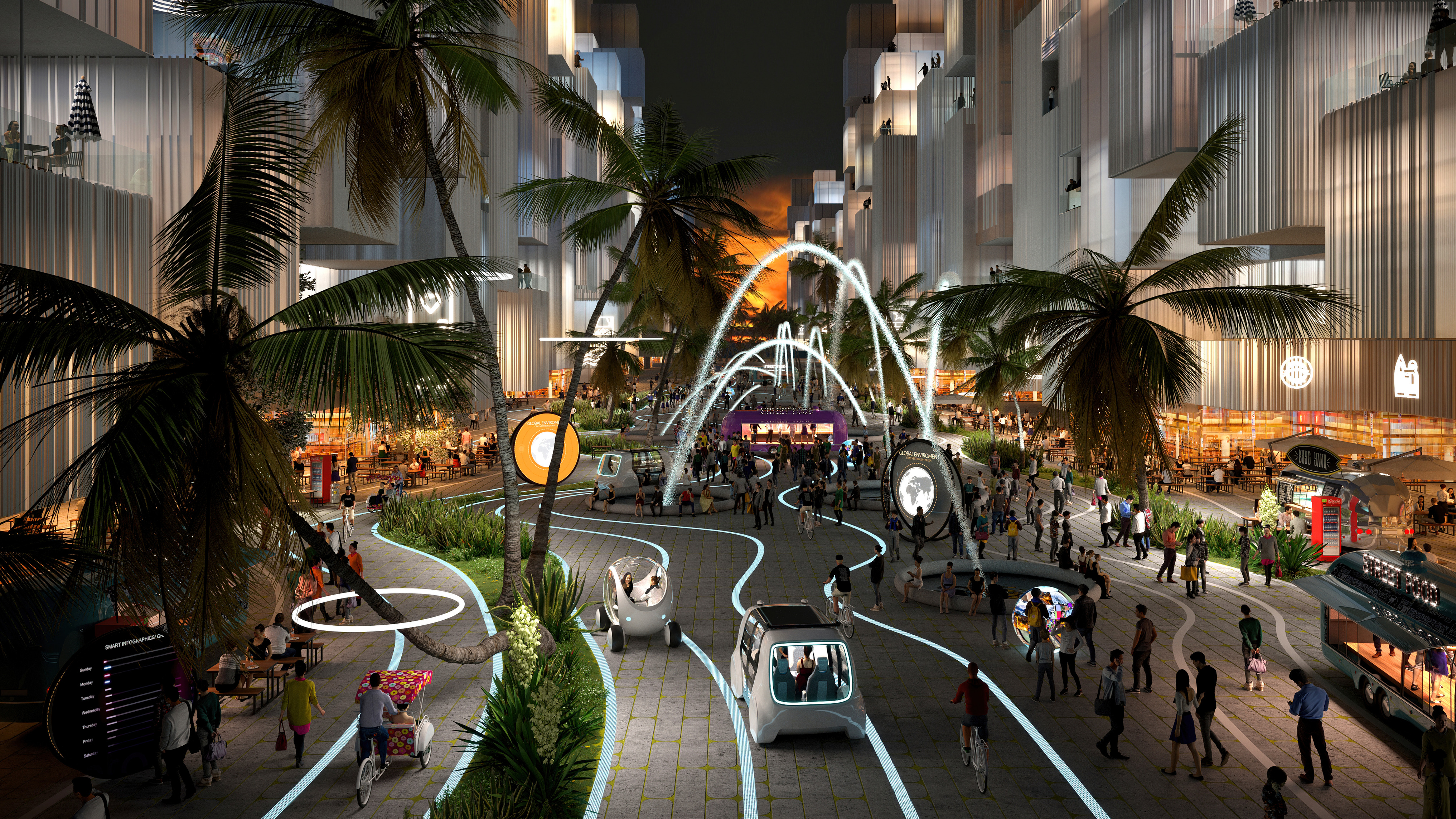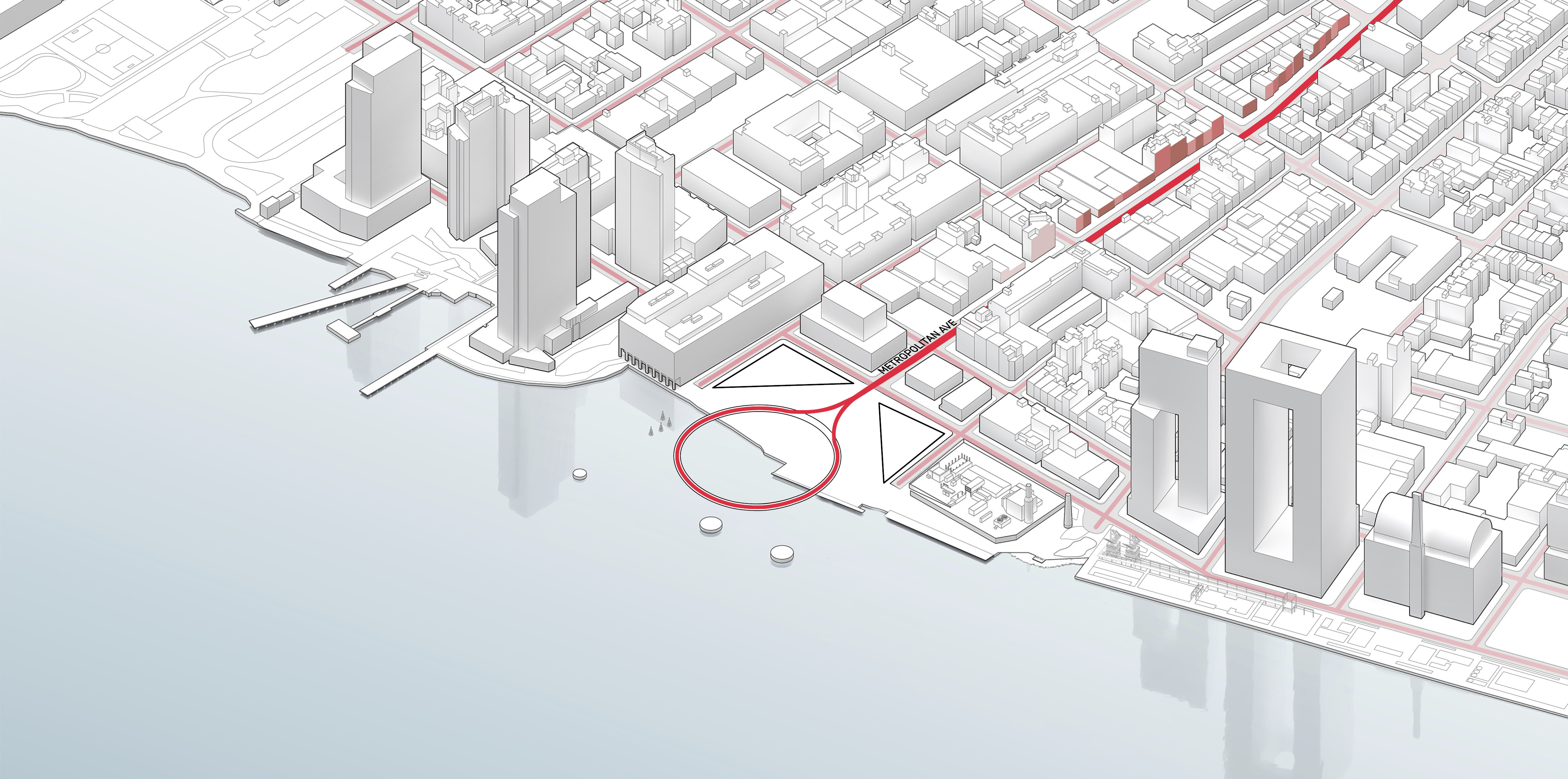 The urban realm is conceived as a flexible network of streets dedicated to various speeds of mobility for safer, pedestrian-friendly connections. The main entrance to the area will be on Five Island Road from where visitors will be able to freely meander and explore a variety of scales, programs and outdoor areas.