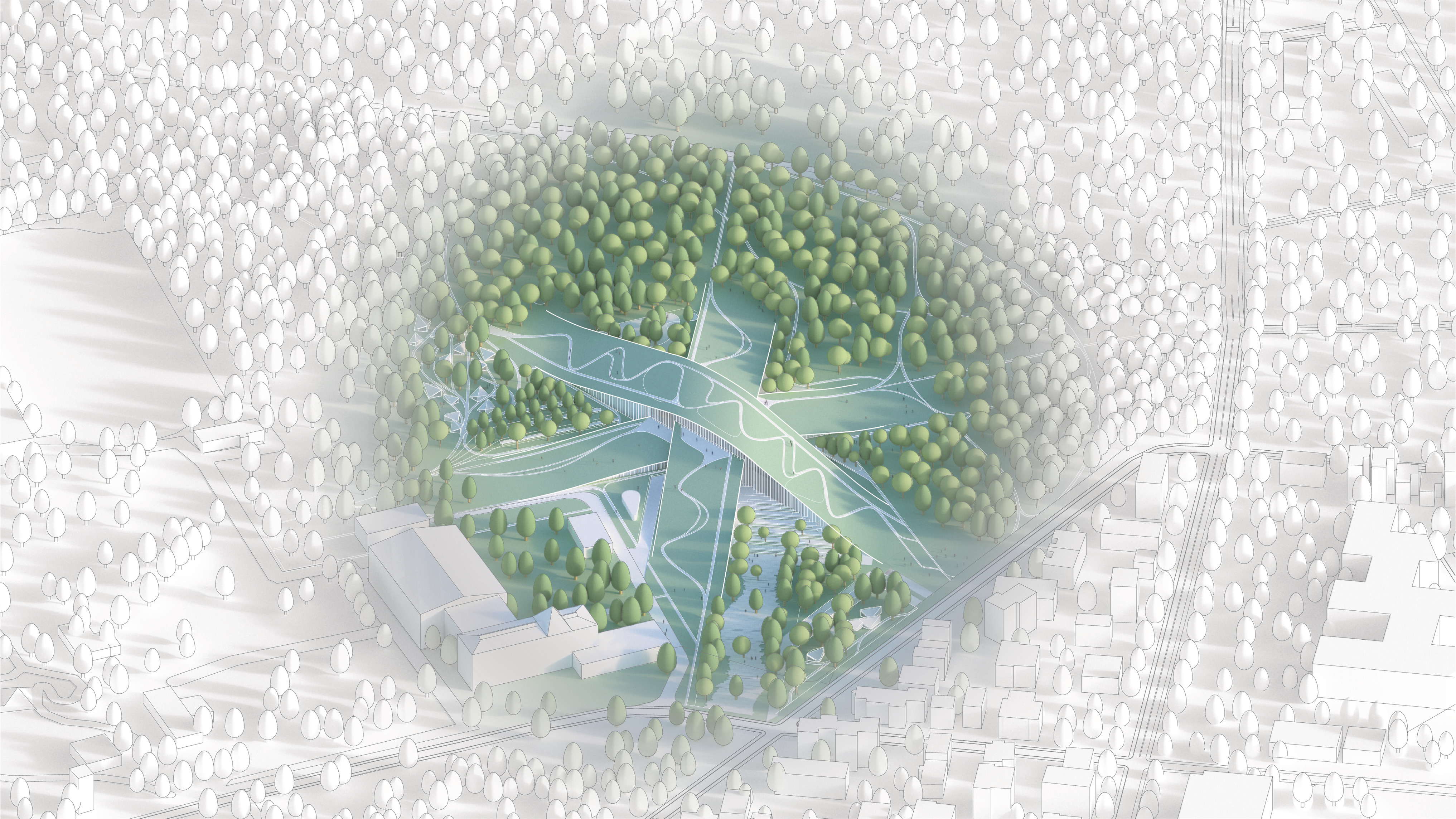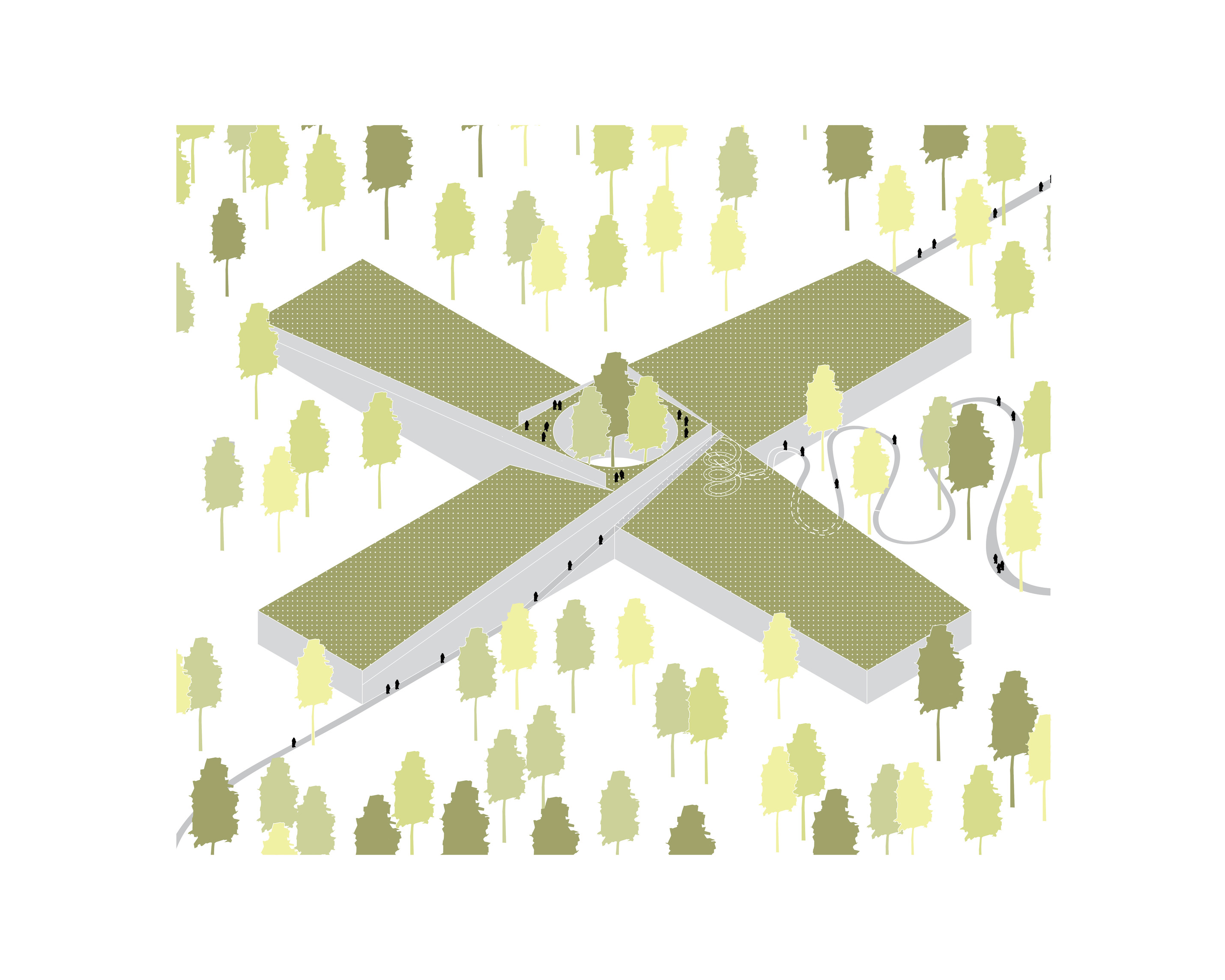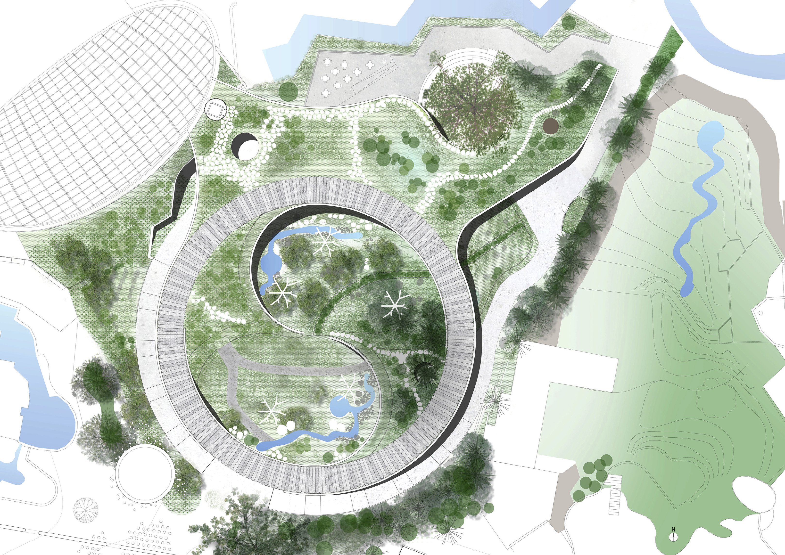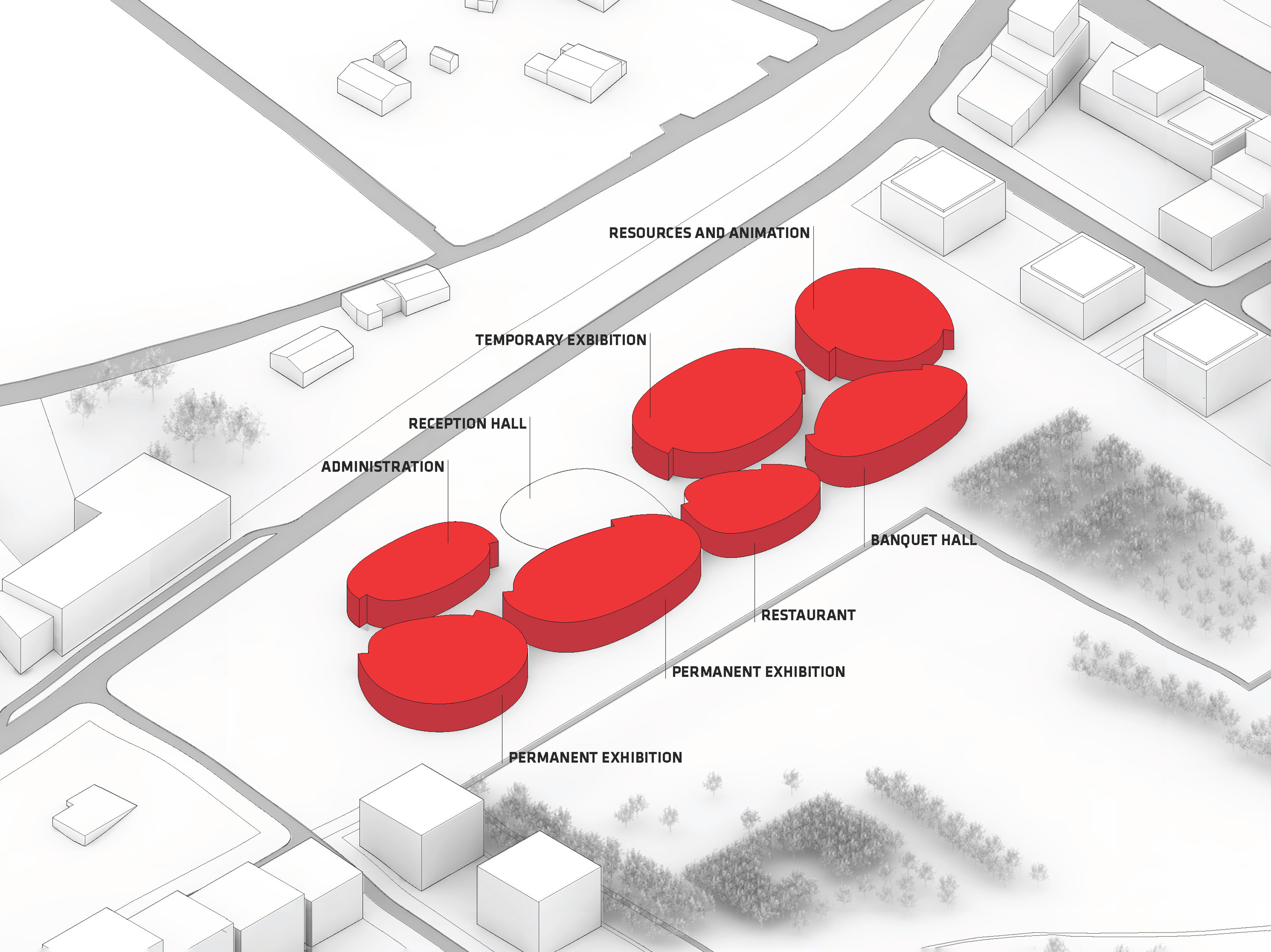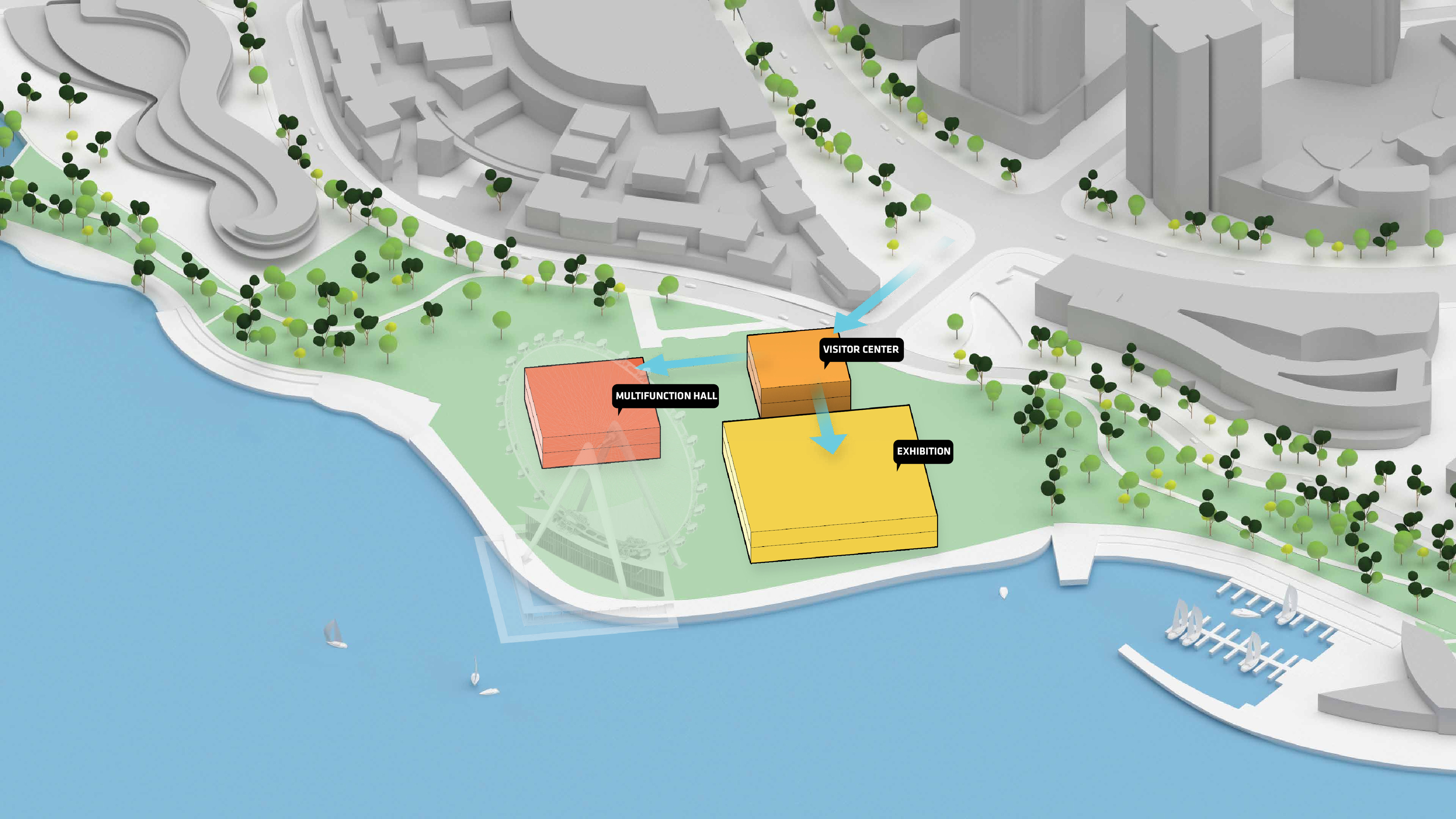 "Suzhou is the cradle of the Chinese garden. Our design for the Suzhou Museum of Contemporary Art is conceived as a garden of pavilions and courtyards. Individual pavilions are woven together by glazed galleries and porticoes, creating a Chinese knot of interconnected sculpture courtyards and exhibition spaces. Weaving between the legs of the Ferris wheel, the museum branches out like a rhizome, connecting the city to the lake. The result is a manmade maze of plants and artworks to get lost within. Its nodular logic only becomes distinctly discernible when seen from the gondolas above. Against the open space of the lake, the gentle conical curvature of the roofs forms a graceful silhouette on the waterfront. From above, the stainless roof tiles form a true fifth facade."
