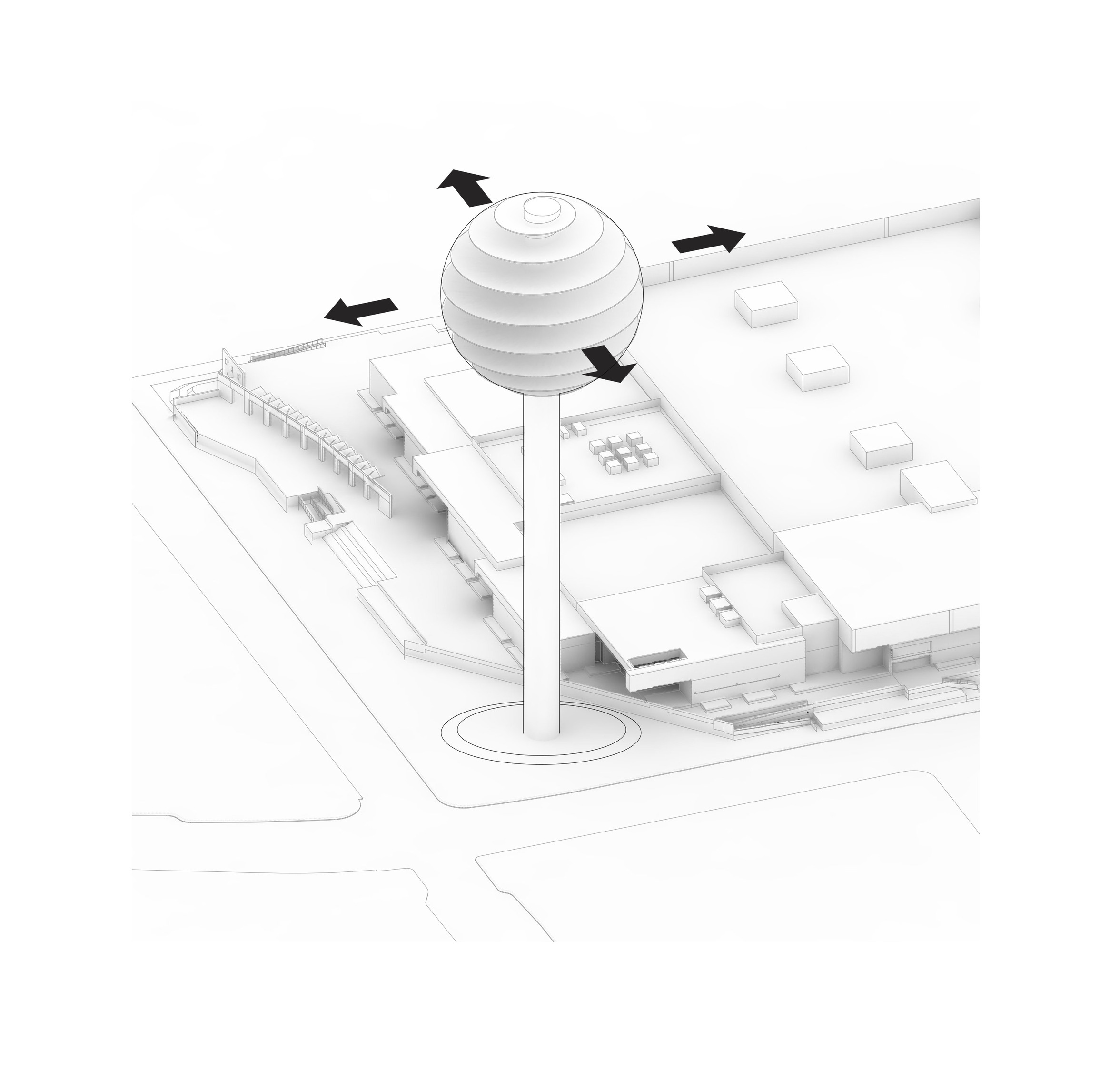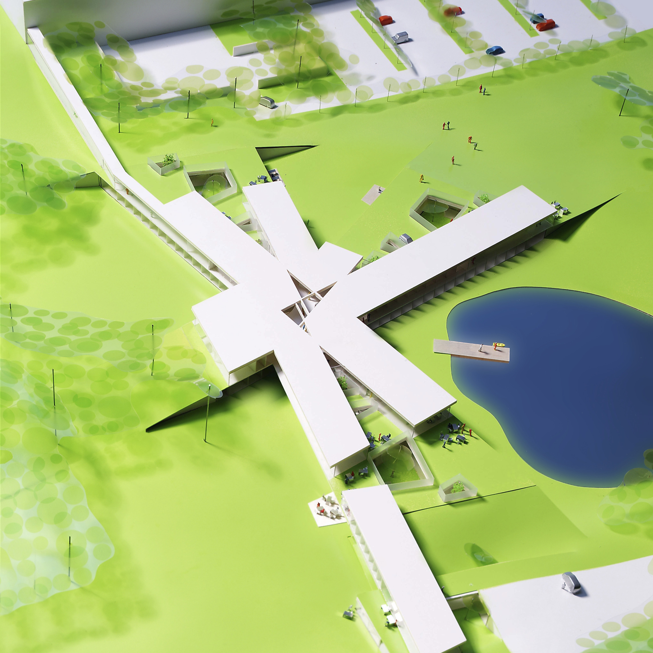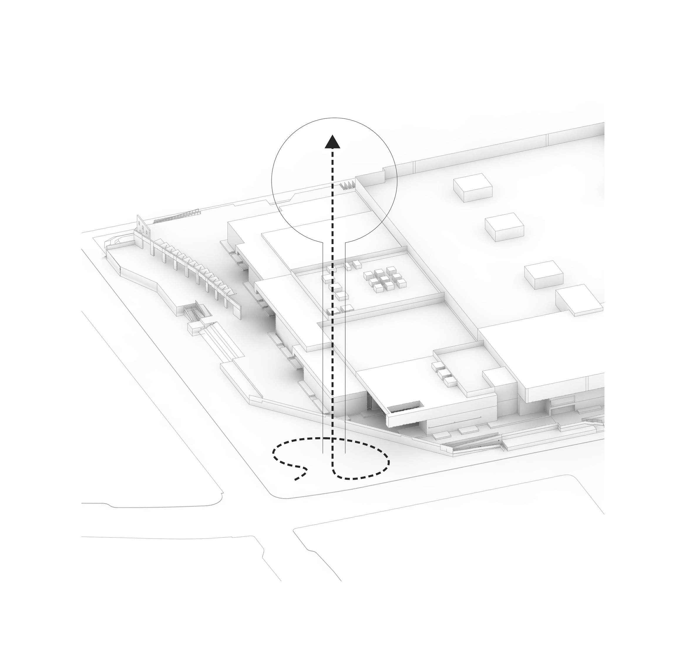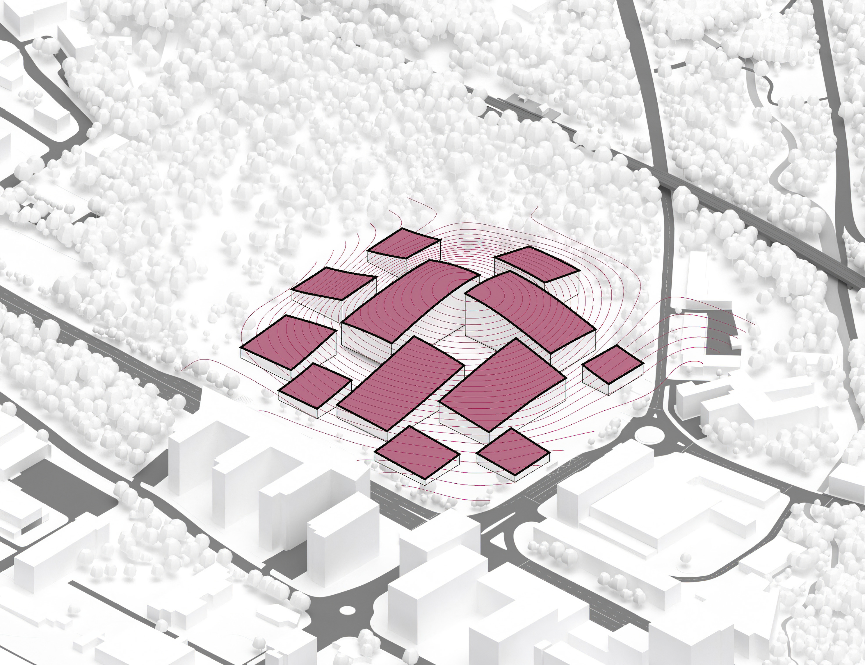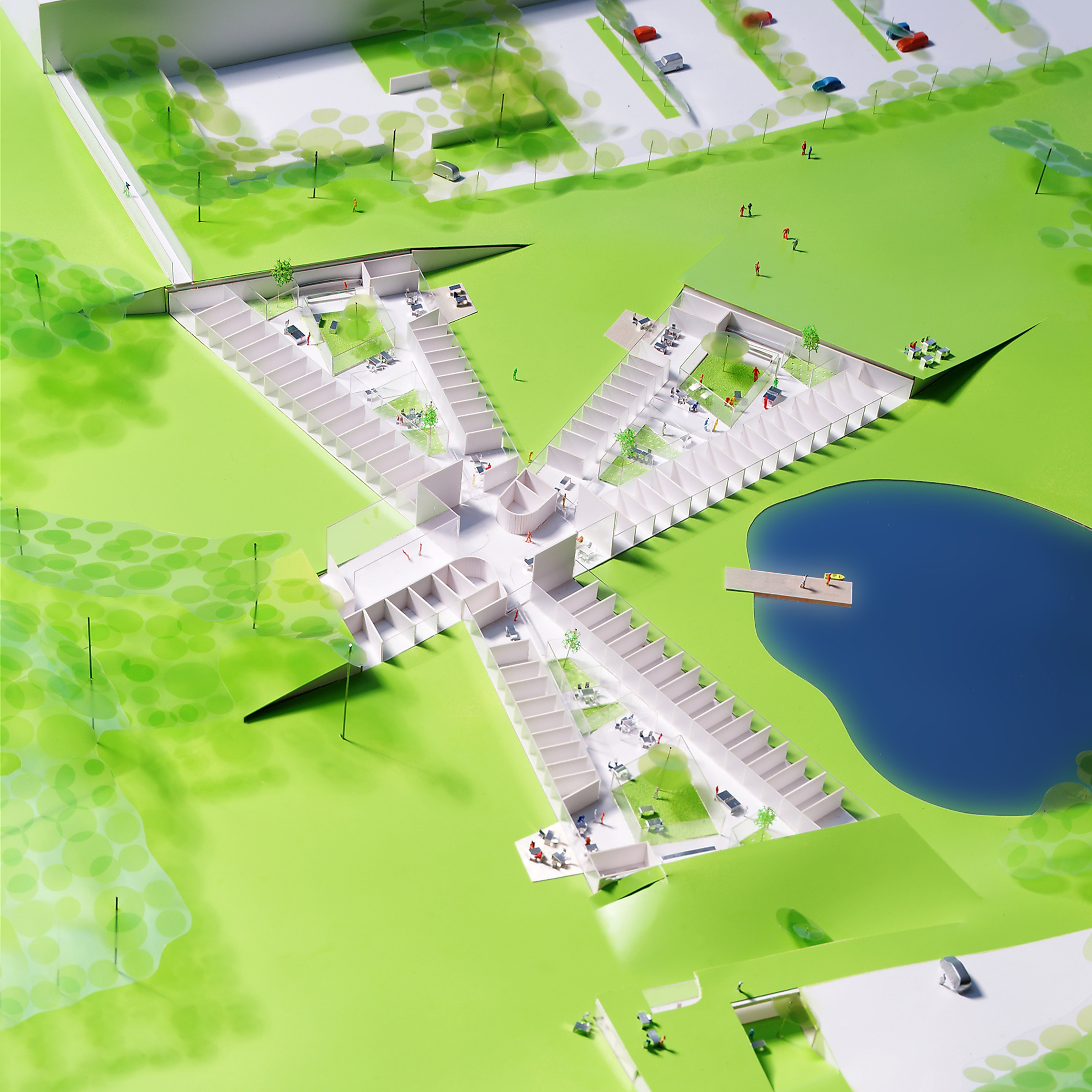 "Suzhou is the cradle of the Chinese garden. Our design for the Suzhou Museum of Contemporary Art is conceived as a garden of pavilions and courtyards. Individual pavilions are woven together by glazed galleries and porticoes, creating a Chinese knot of interconnected sculpture courtyards and exhibition spaces. Weaving between the legs of the Ferris wheel, the museum branches out like a rhizome, connecting the city to the lake. The result is a manmade maze of plants and artworks to get lost within. Its nodular logic only becomes distinctly discernible when seen from the gondolas above. Against the open space of the lake, the gentle conical curvature of the roofs forms a graceful silhouette on the waterfront. From above, the stainless roof tiles form a true fifth facade."