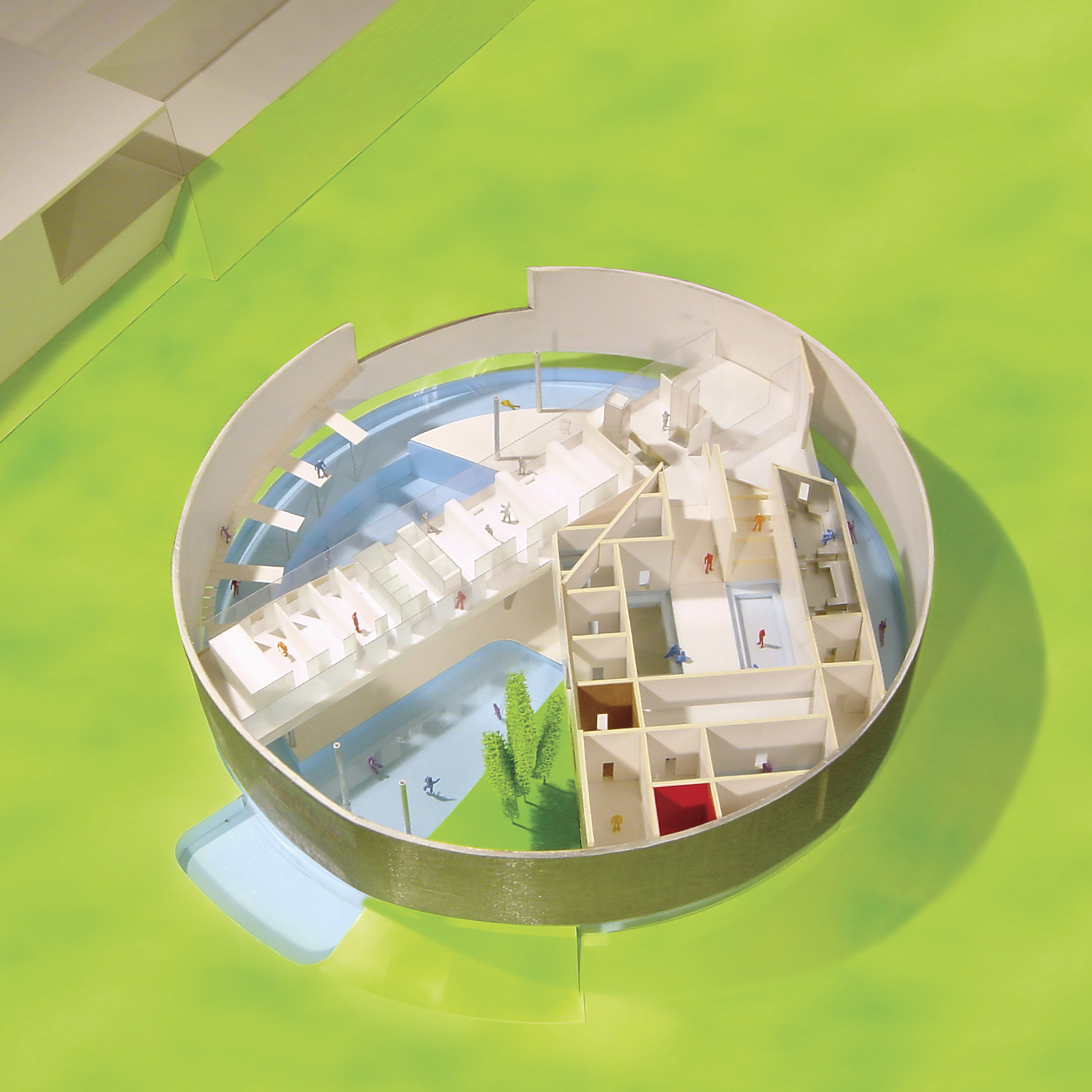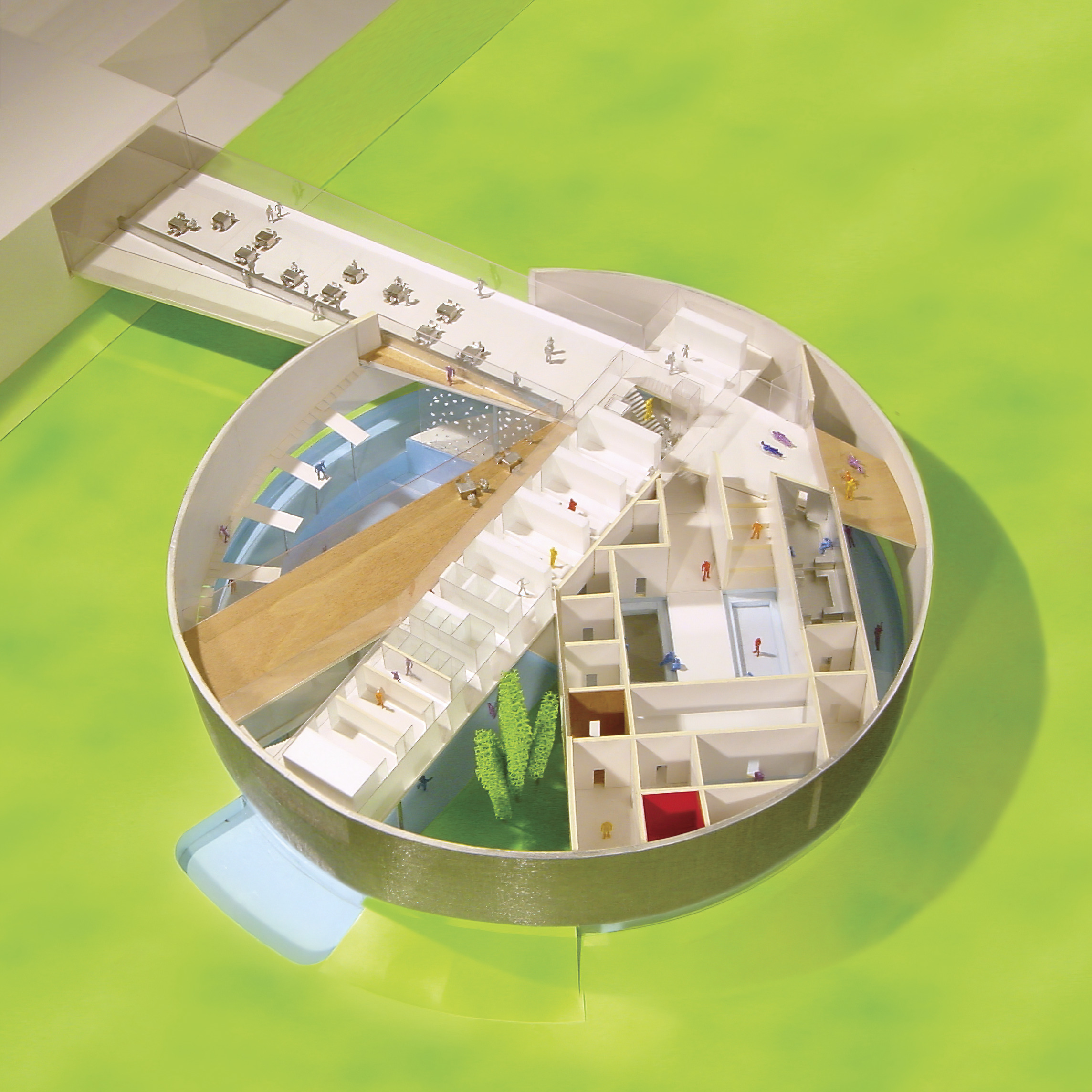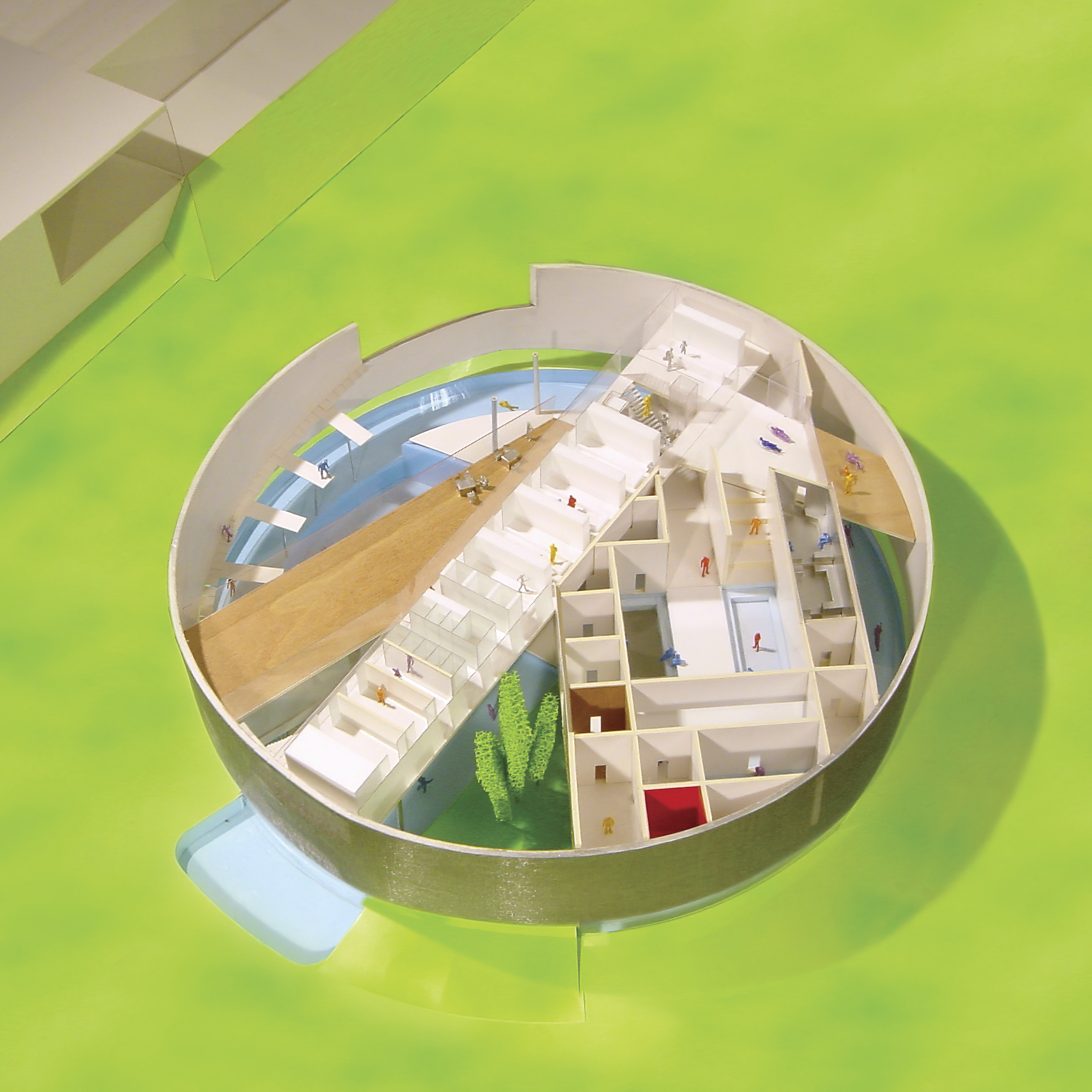The exhibition space, visible from both the office and the shared building atrium, showcases architectural models and “pizza” shelves displaying process models and materials.