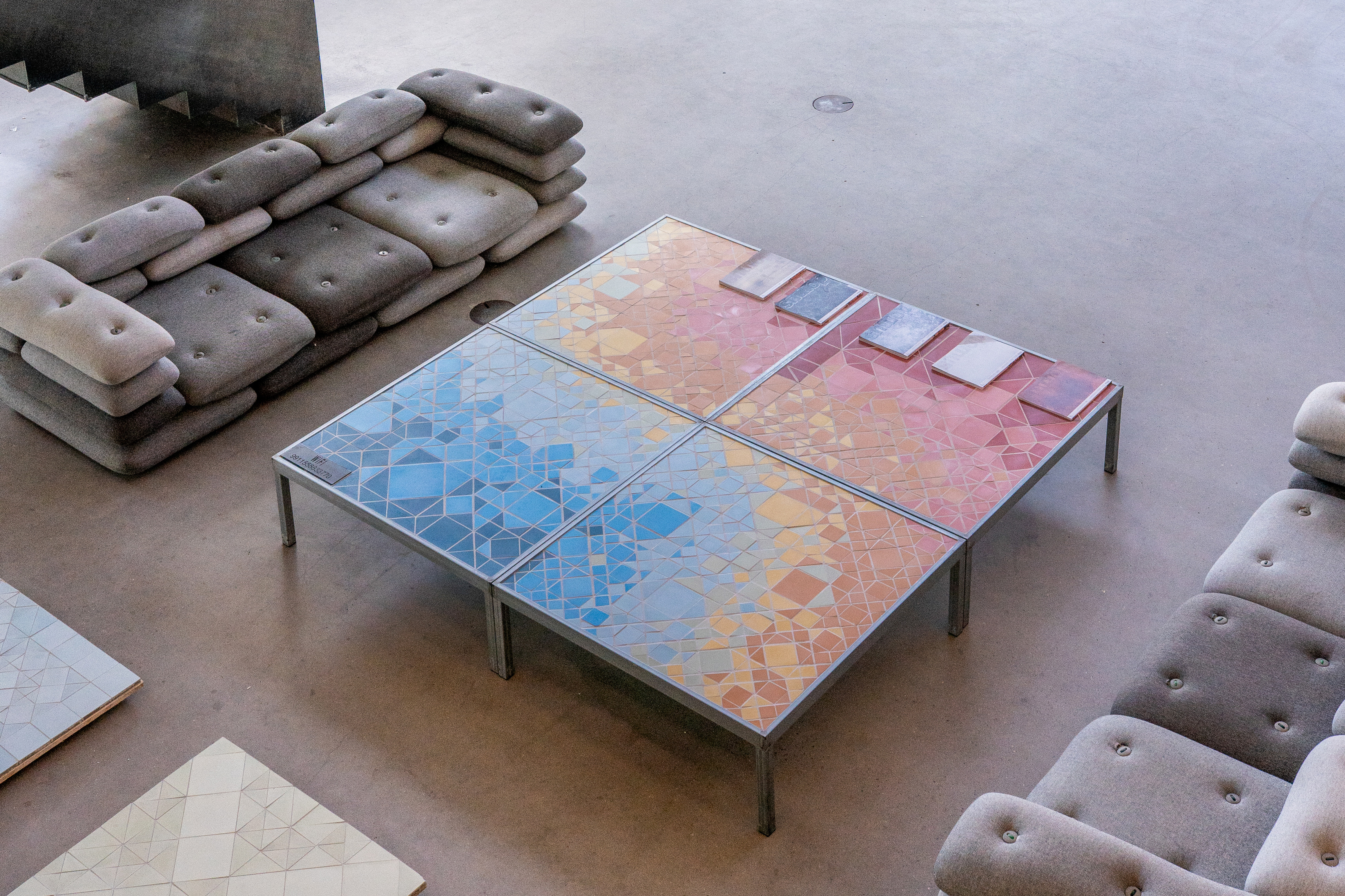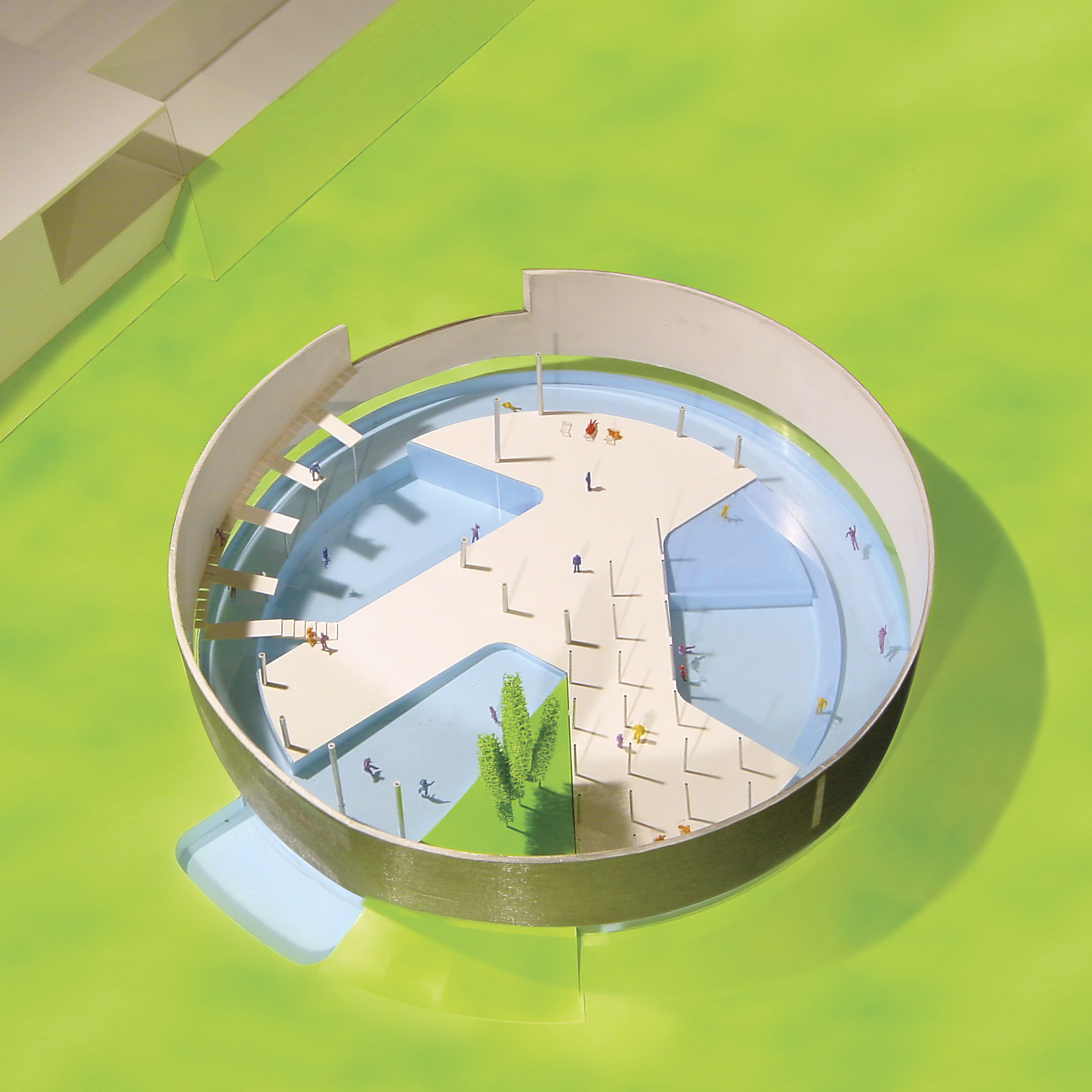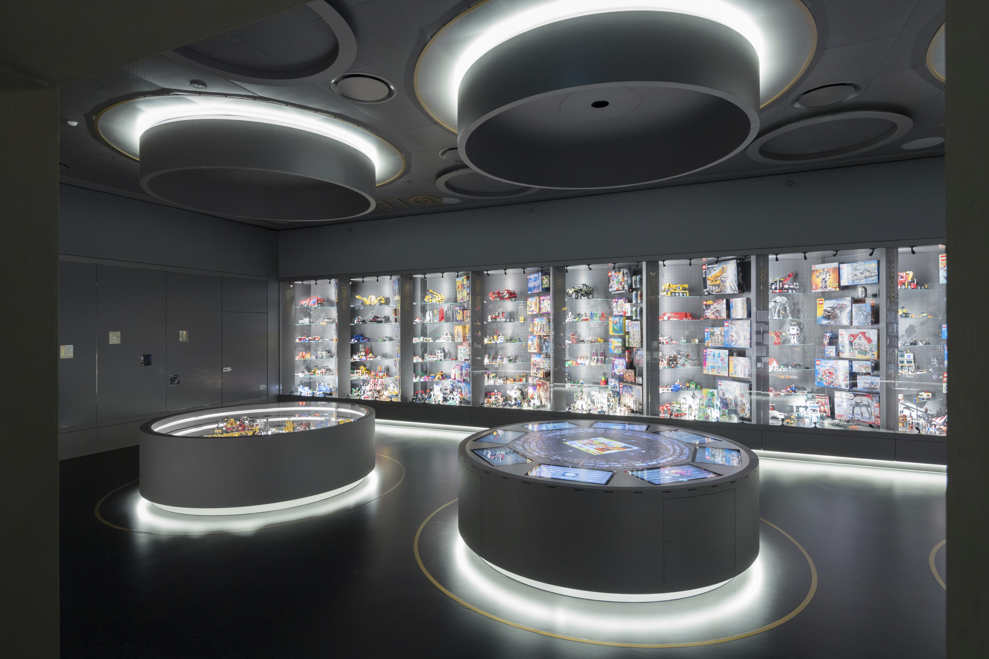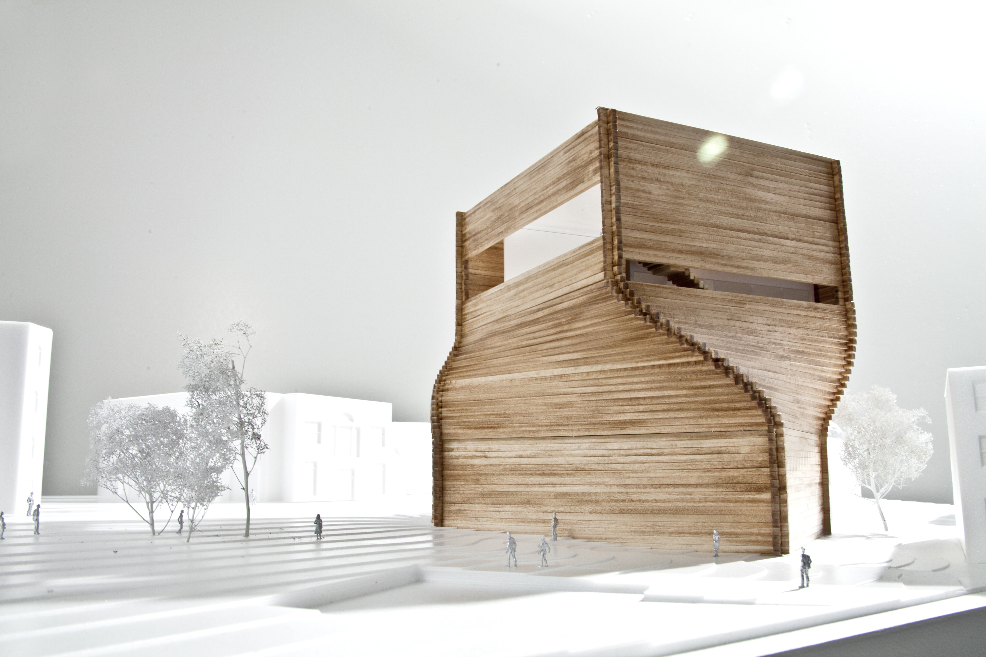 The exhibition space, visible from both the office and the shared building atrium, showcases architectural models and “pizza” shelves displaying process models and materials.