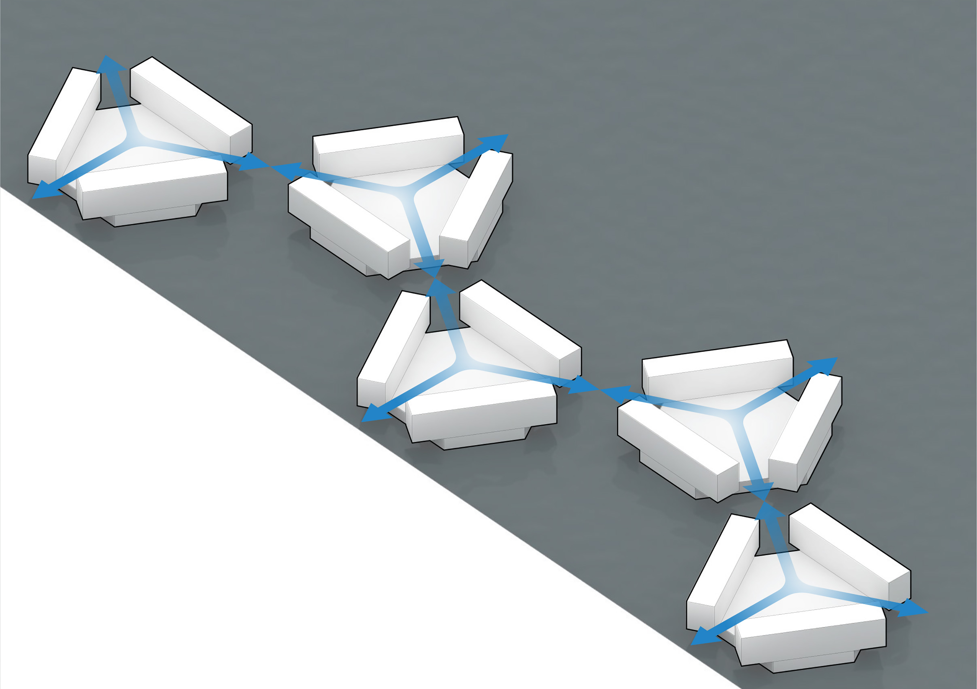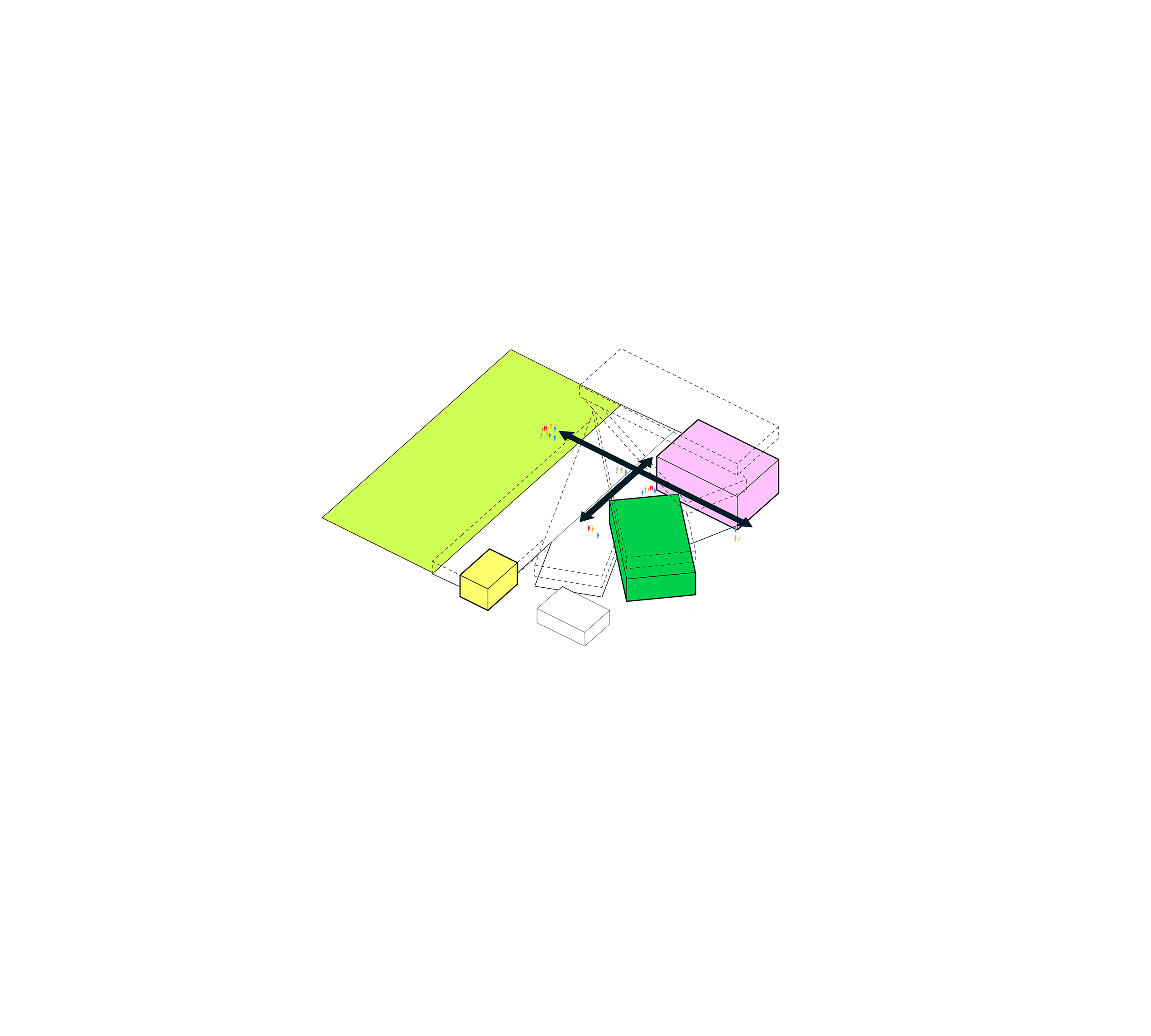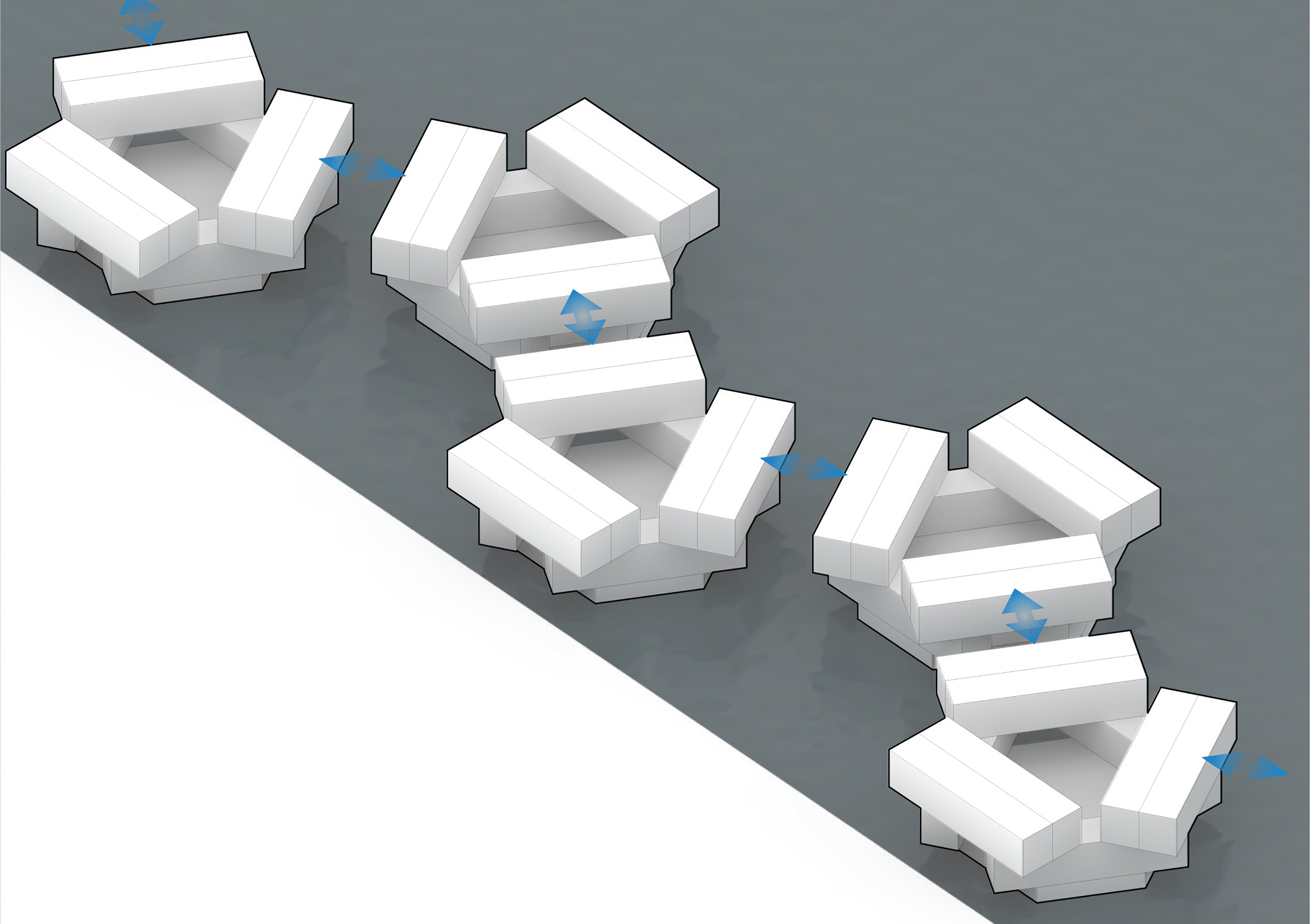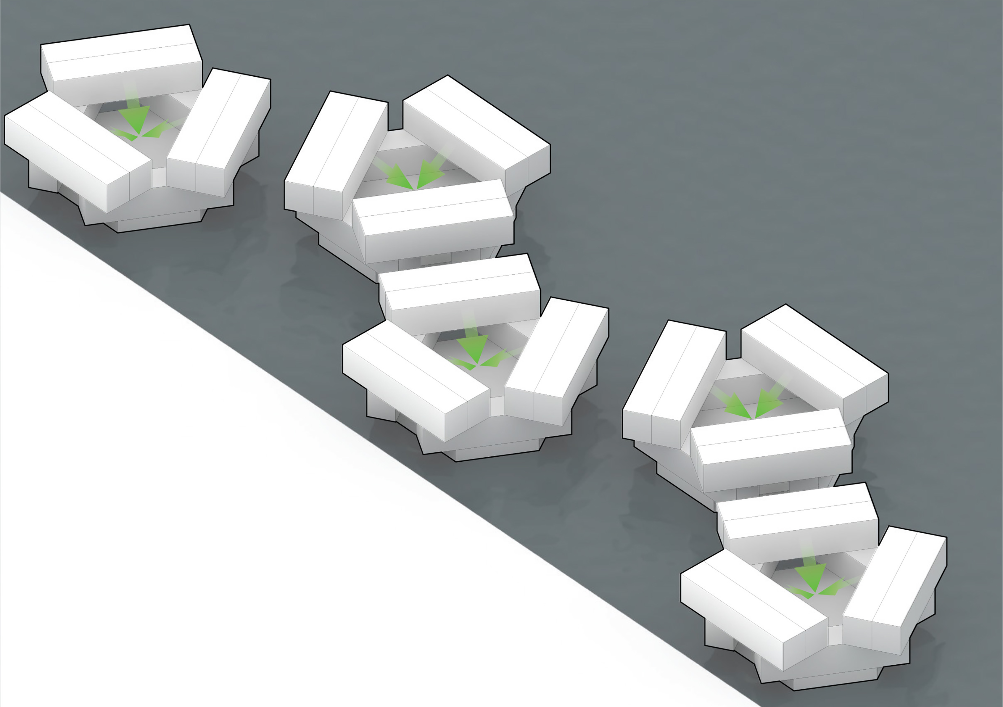The Puzzle House is a multi-functional object consisting of a series of individual elements, that when together form a house. Separately, each piece can act as a seating element. A big variety of seating scenarios for group discussions, or auditorium style seating for events or public speaking can be be configurated. When flipped on their sides, they can also act as wind barriers or partitions to delineate spaces for various group activities.