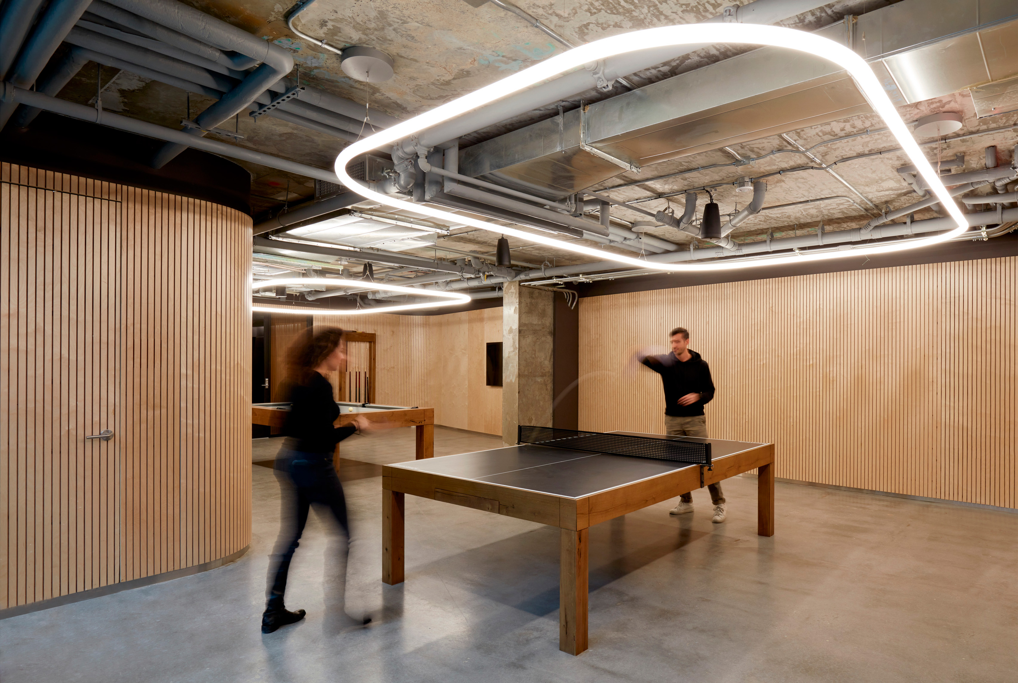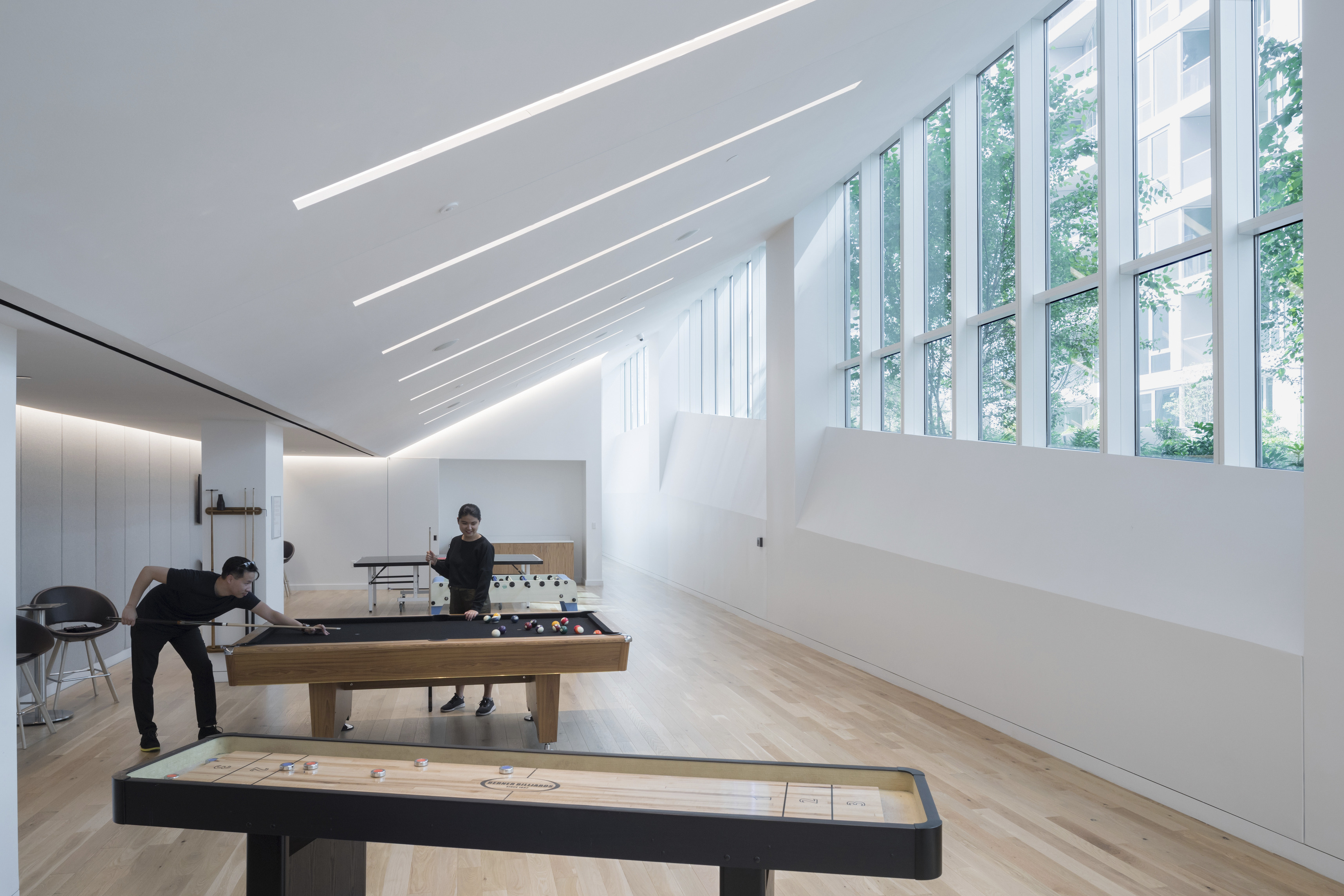 The canteen and recreational areas double as internal spaces for team gatherings and a reception area for talks and events.