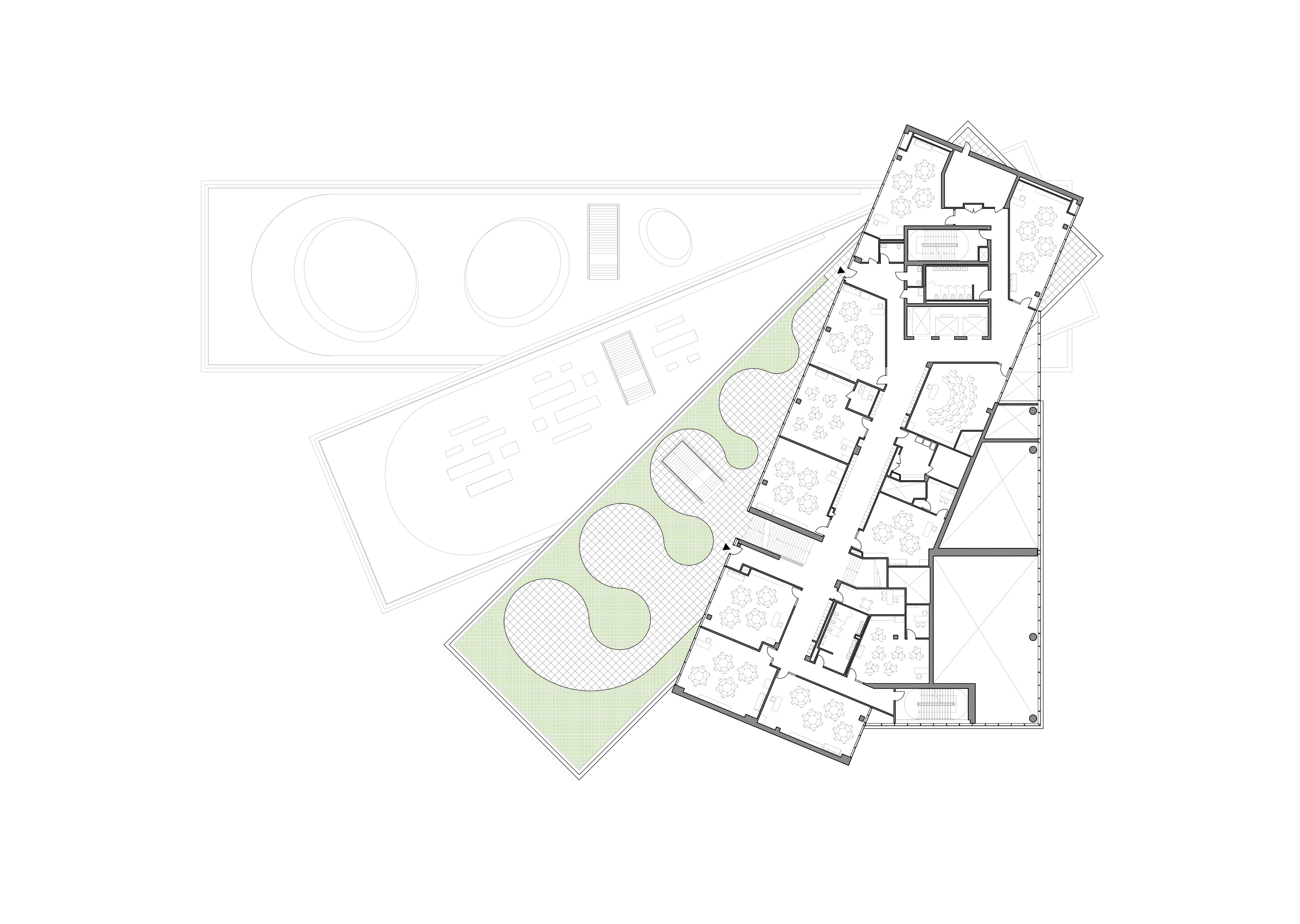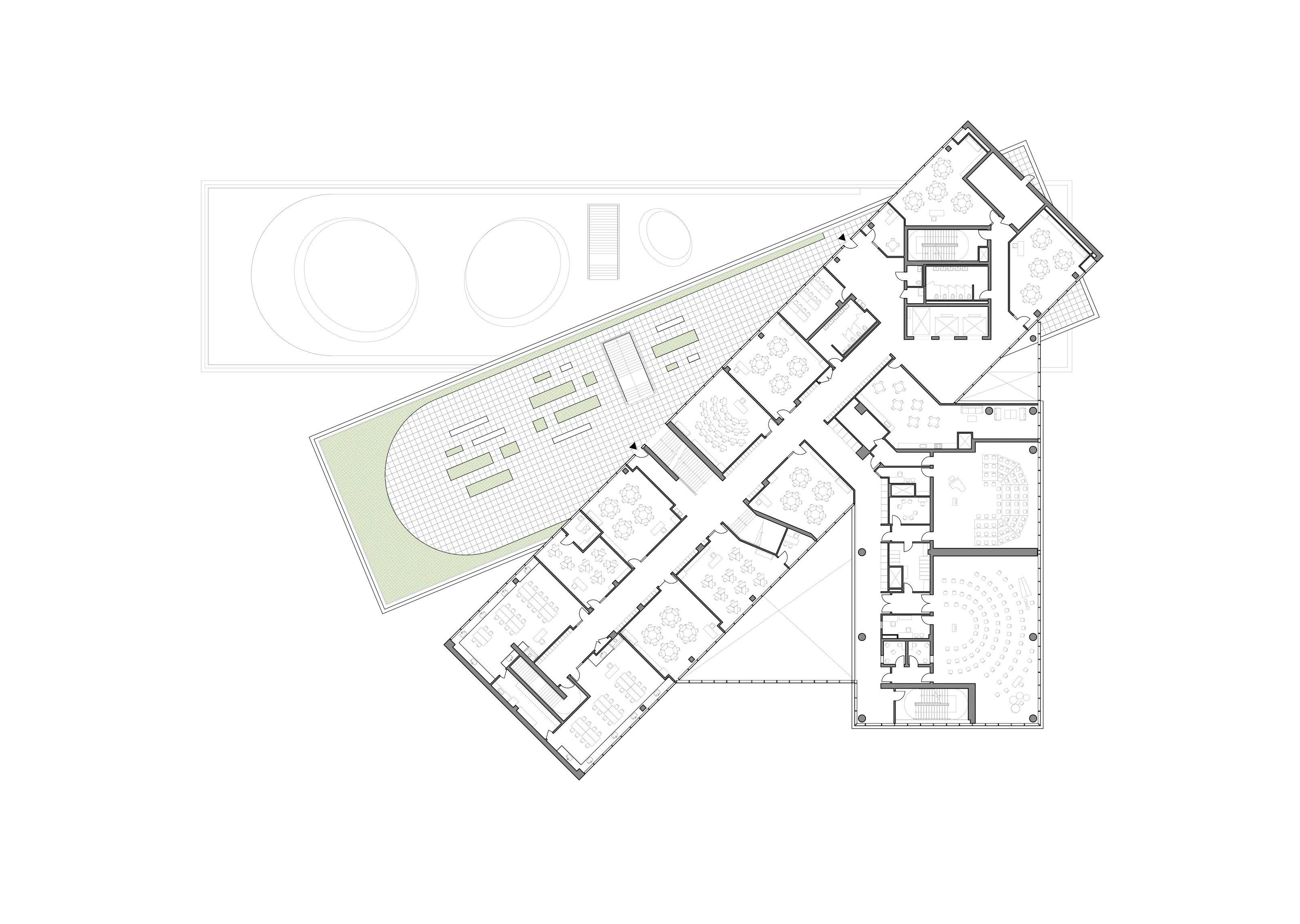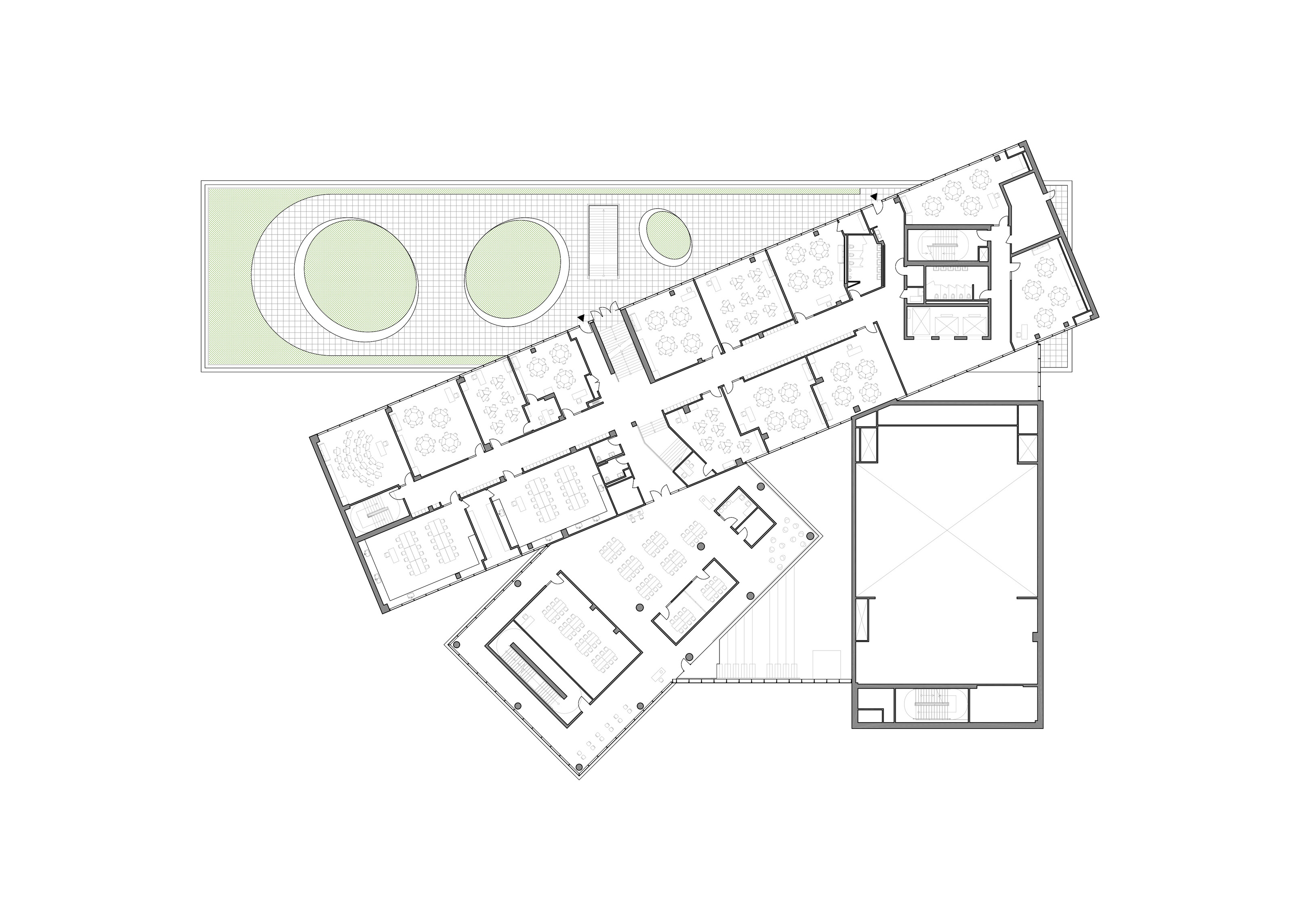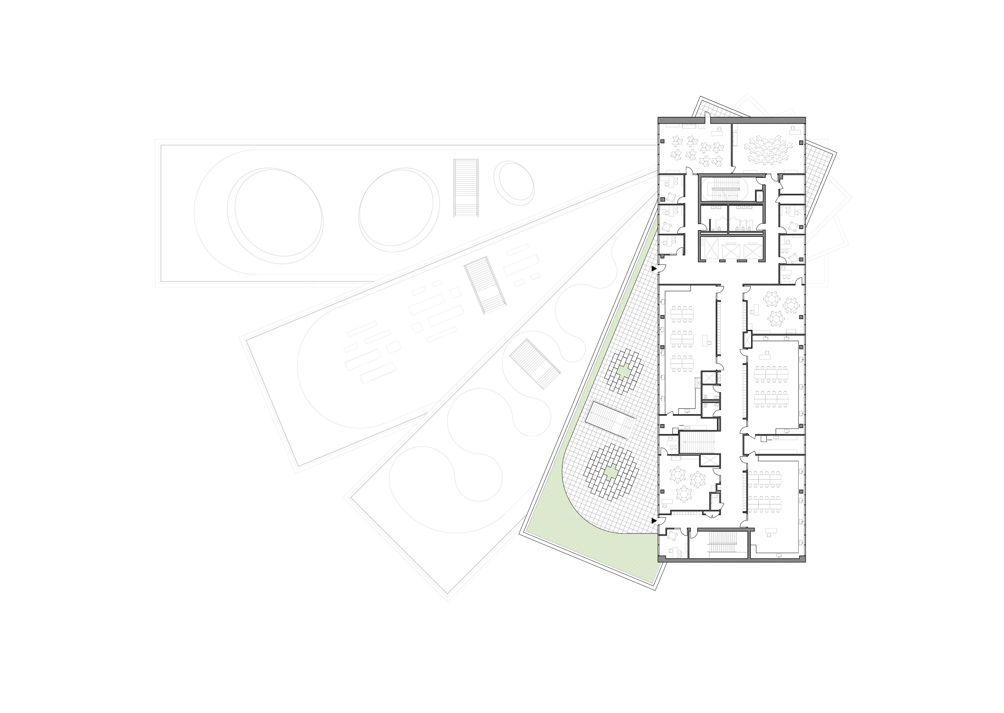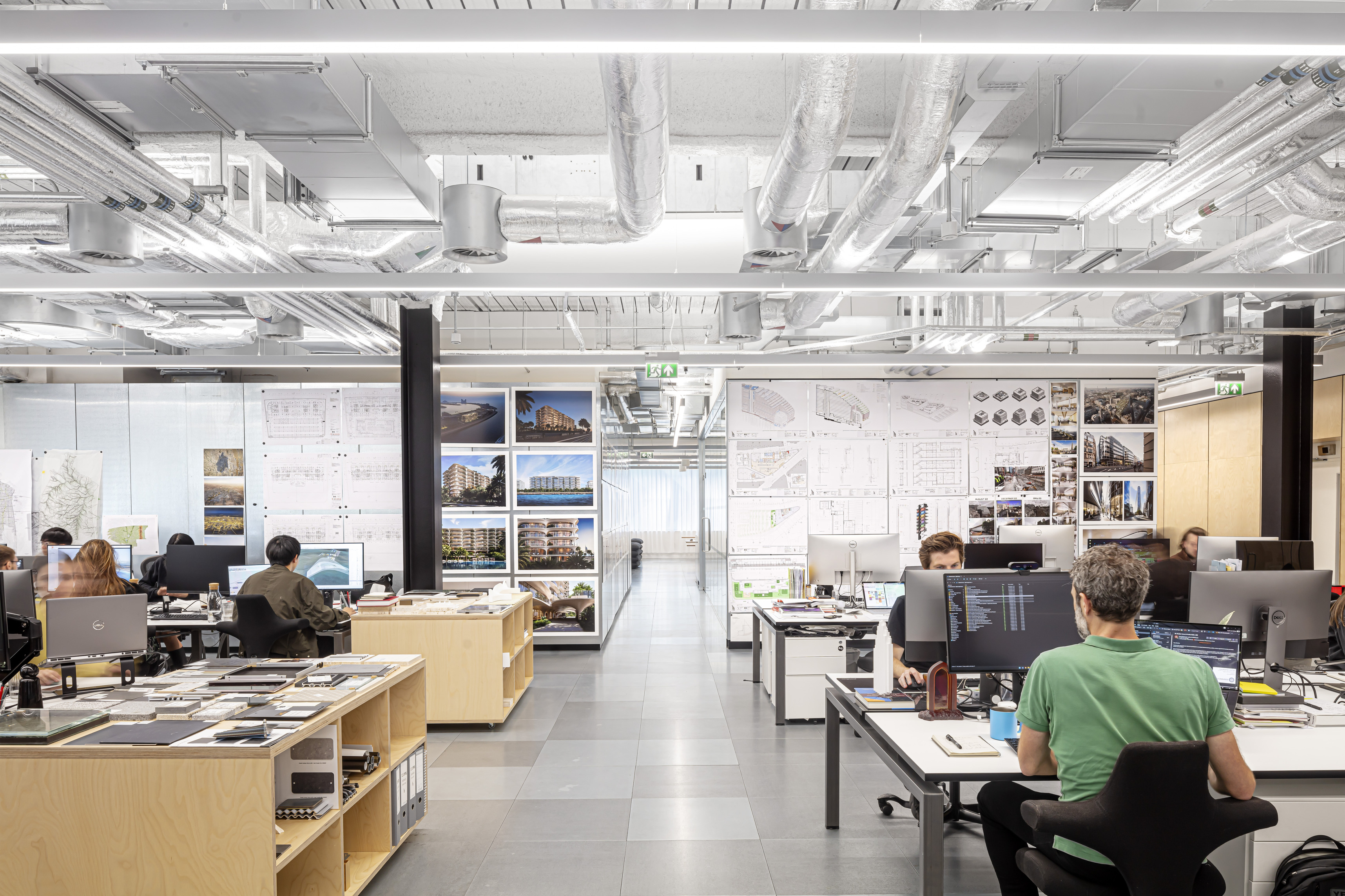 The ground floor office space spans over 1400 m2 across two units. The open-plan design accommodates a generous architectural model workshop, exhibition space, meeting rooms and a VR room.