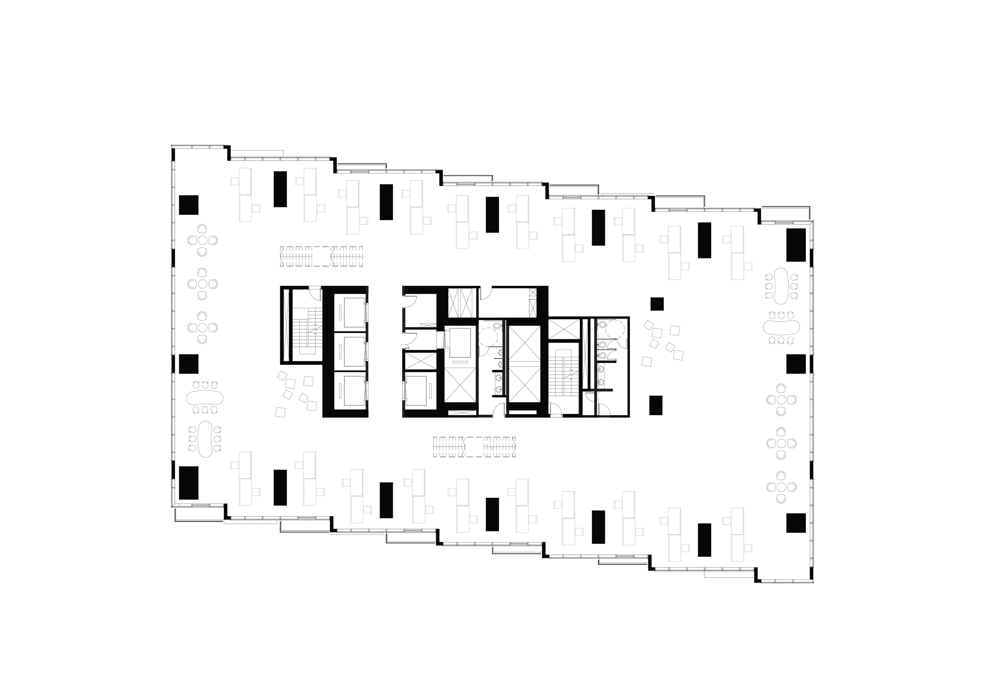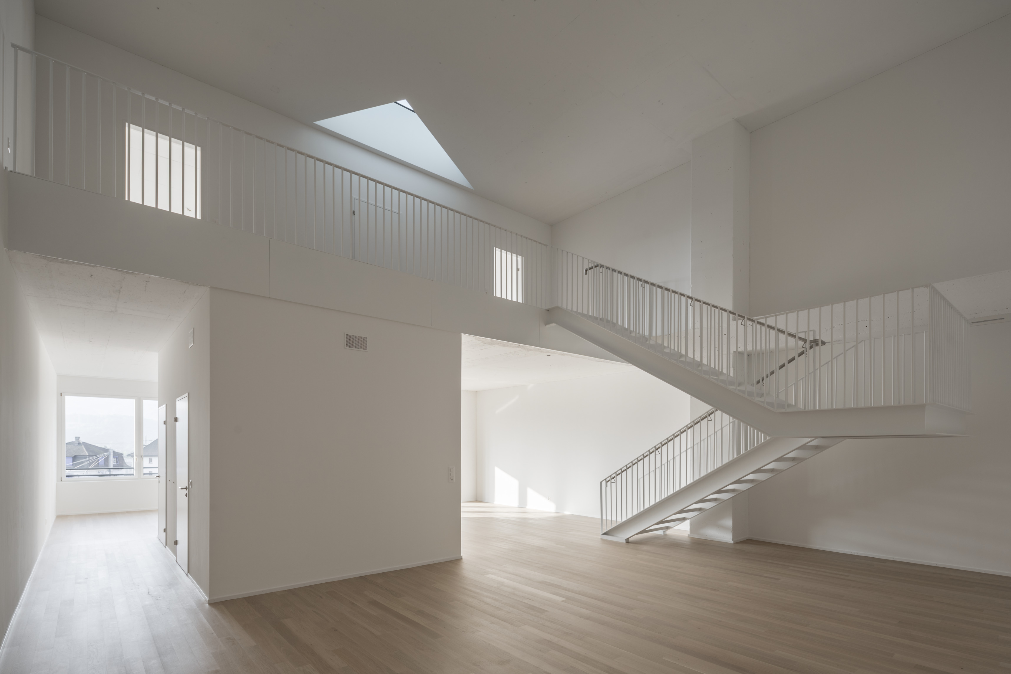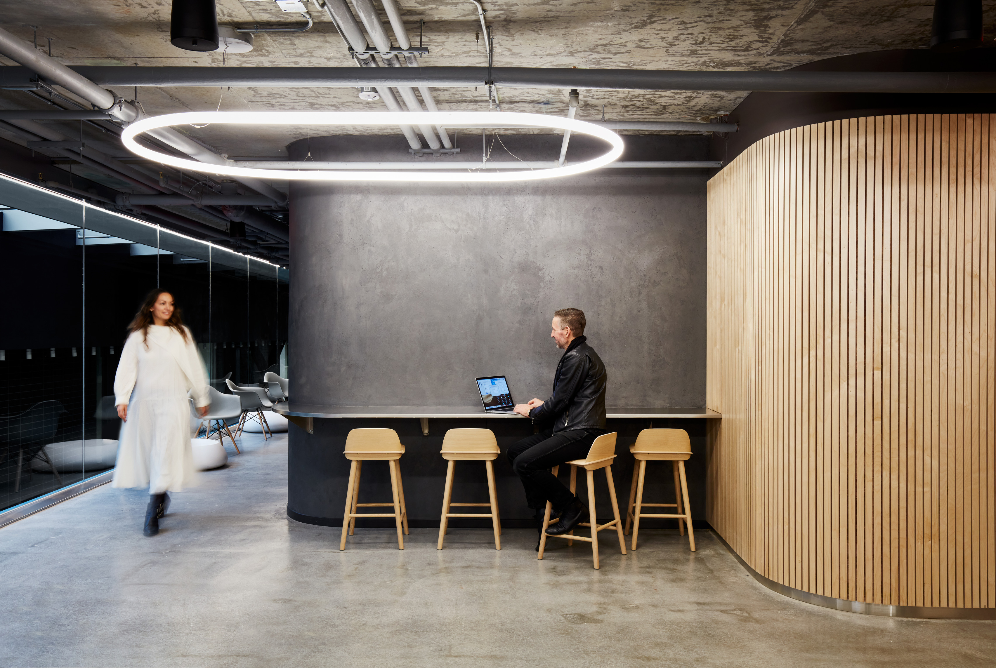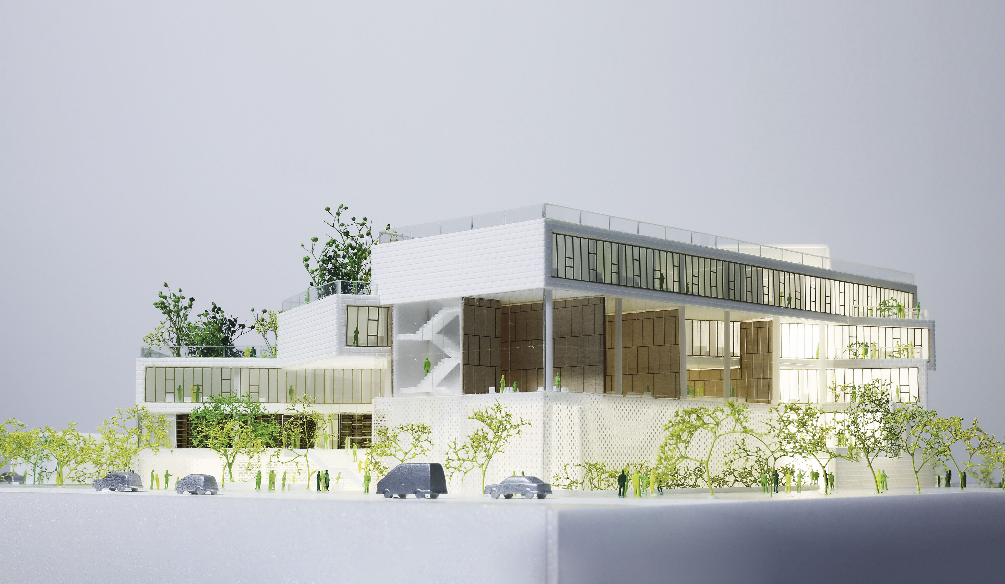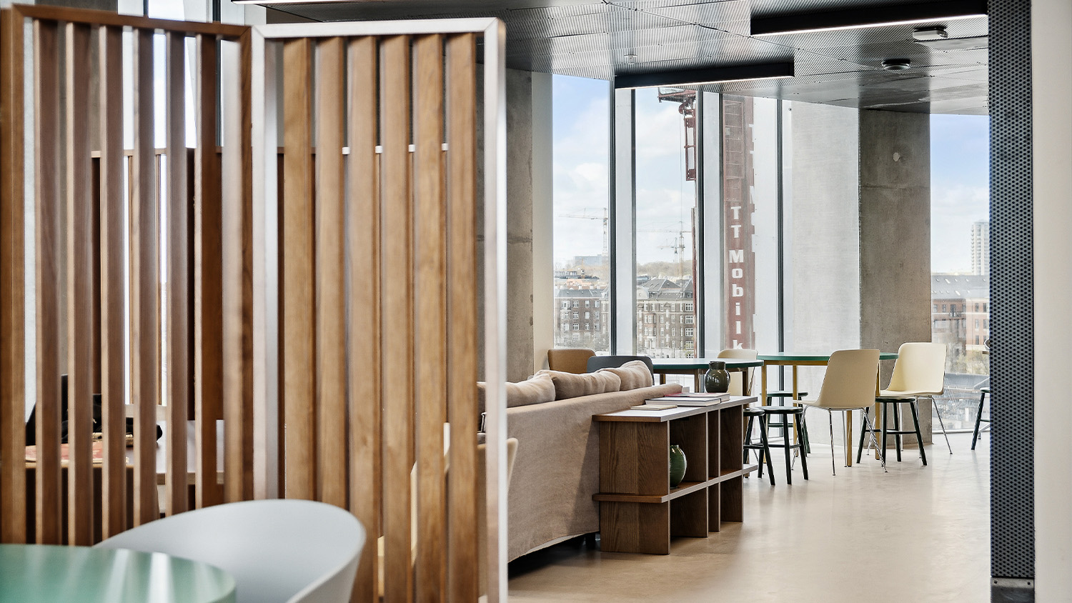 The ground floor office space spans over 1400 m2 across two units. The open-plan design accommodates a generous architectural model workshop, exhibition space, meeting rooms and a VR room.