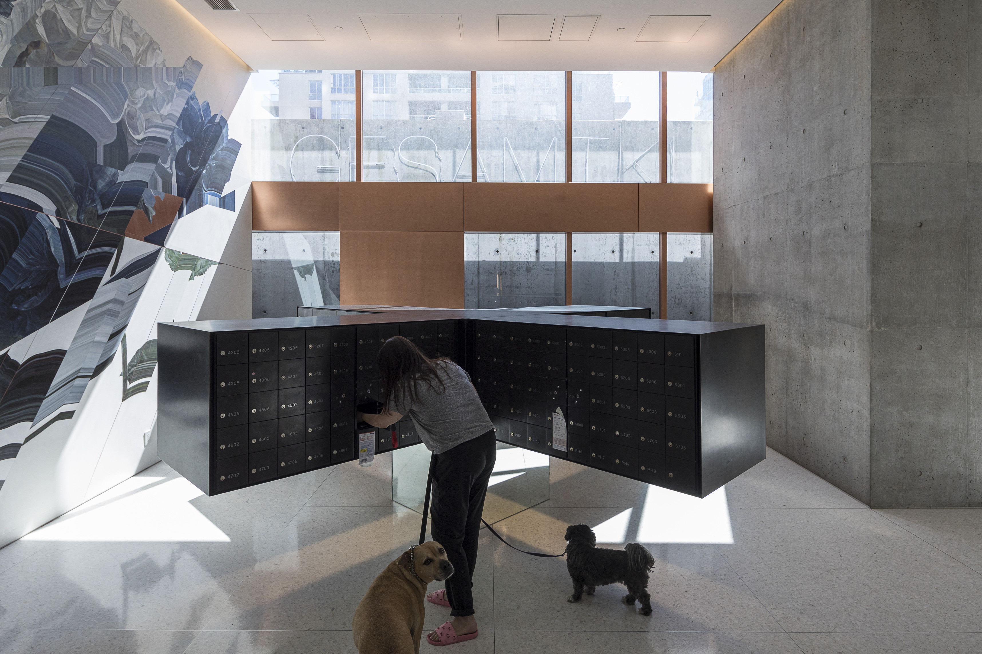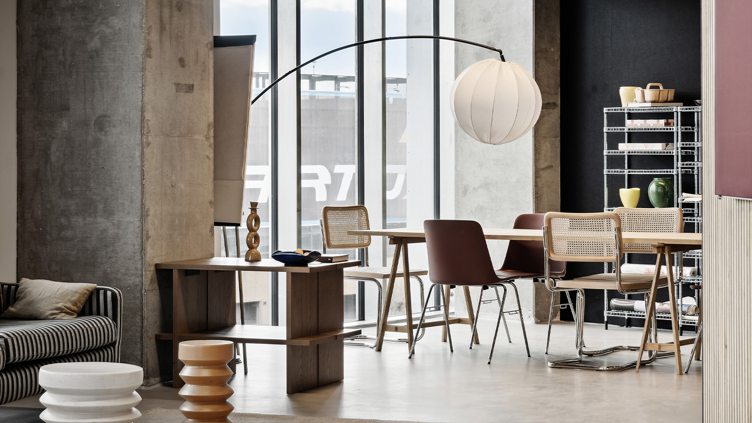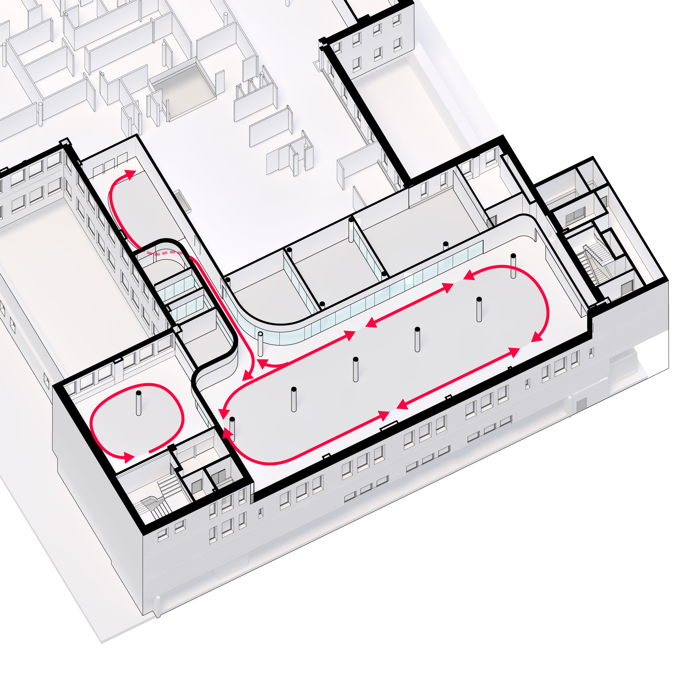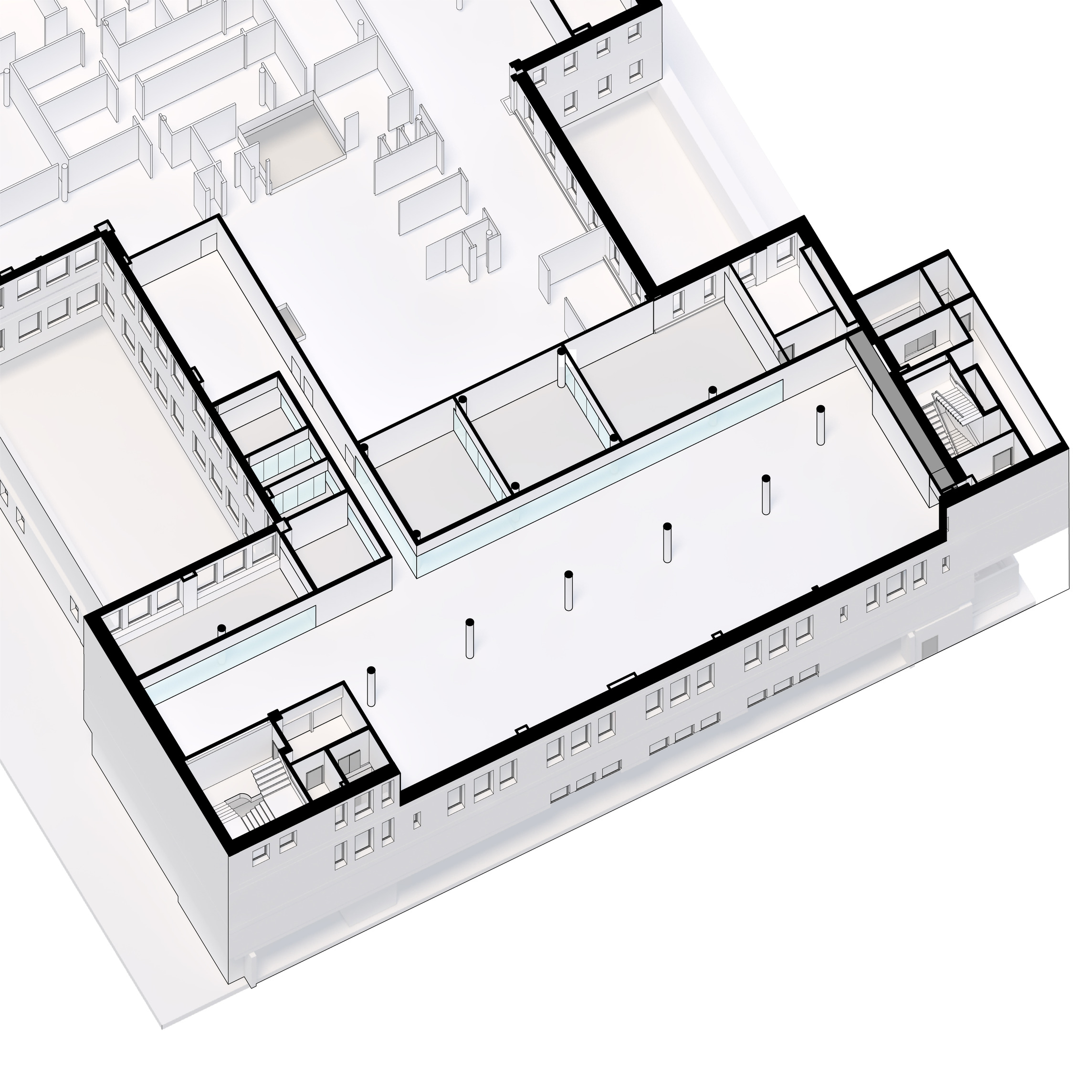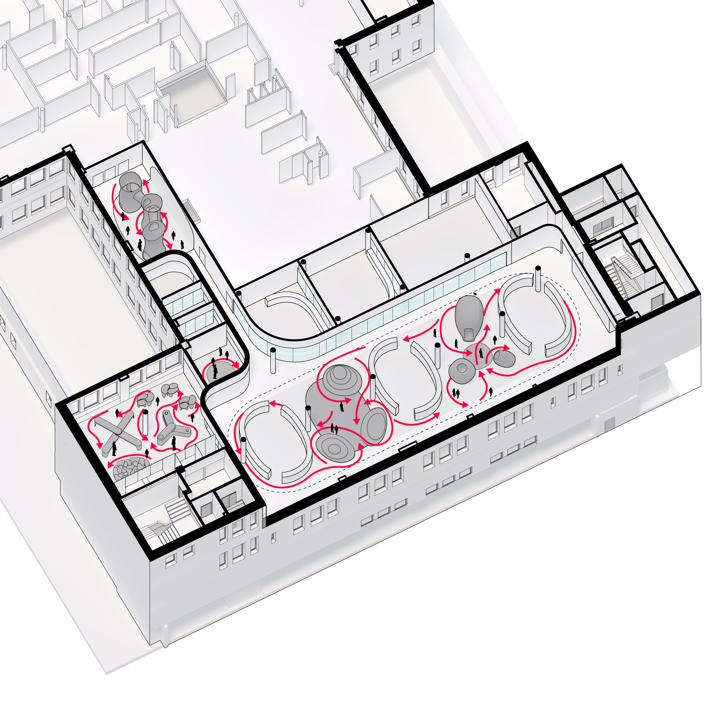 The ground floor office space spans over 1400 m2 across two units. The open-plan design accommodates a generous architectural model workshop, exhibition space, meeting rooms and a VR room.