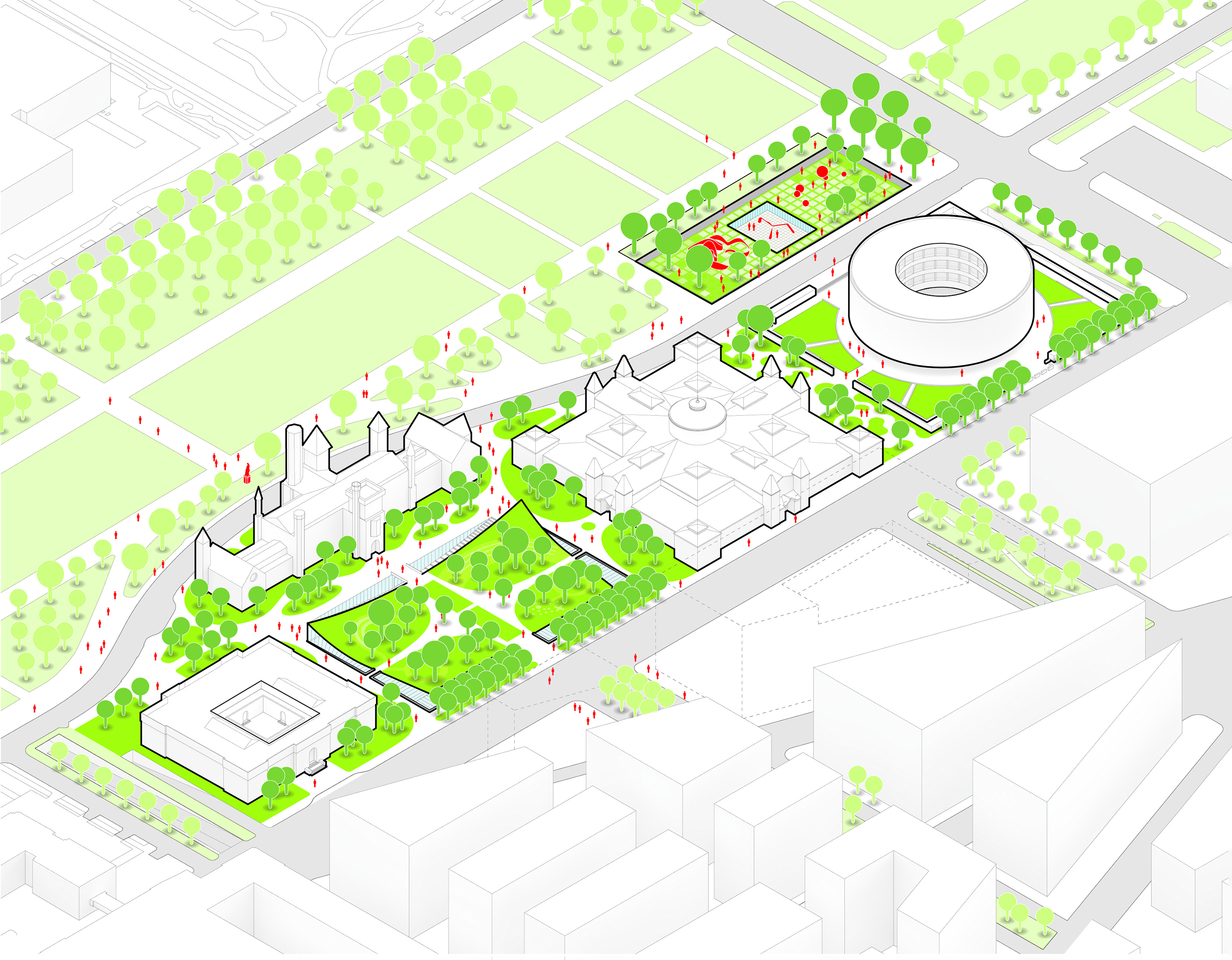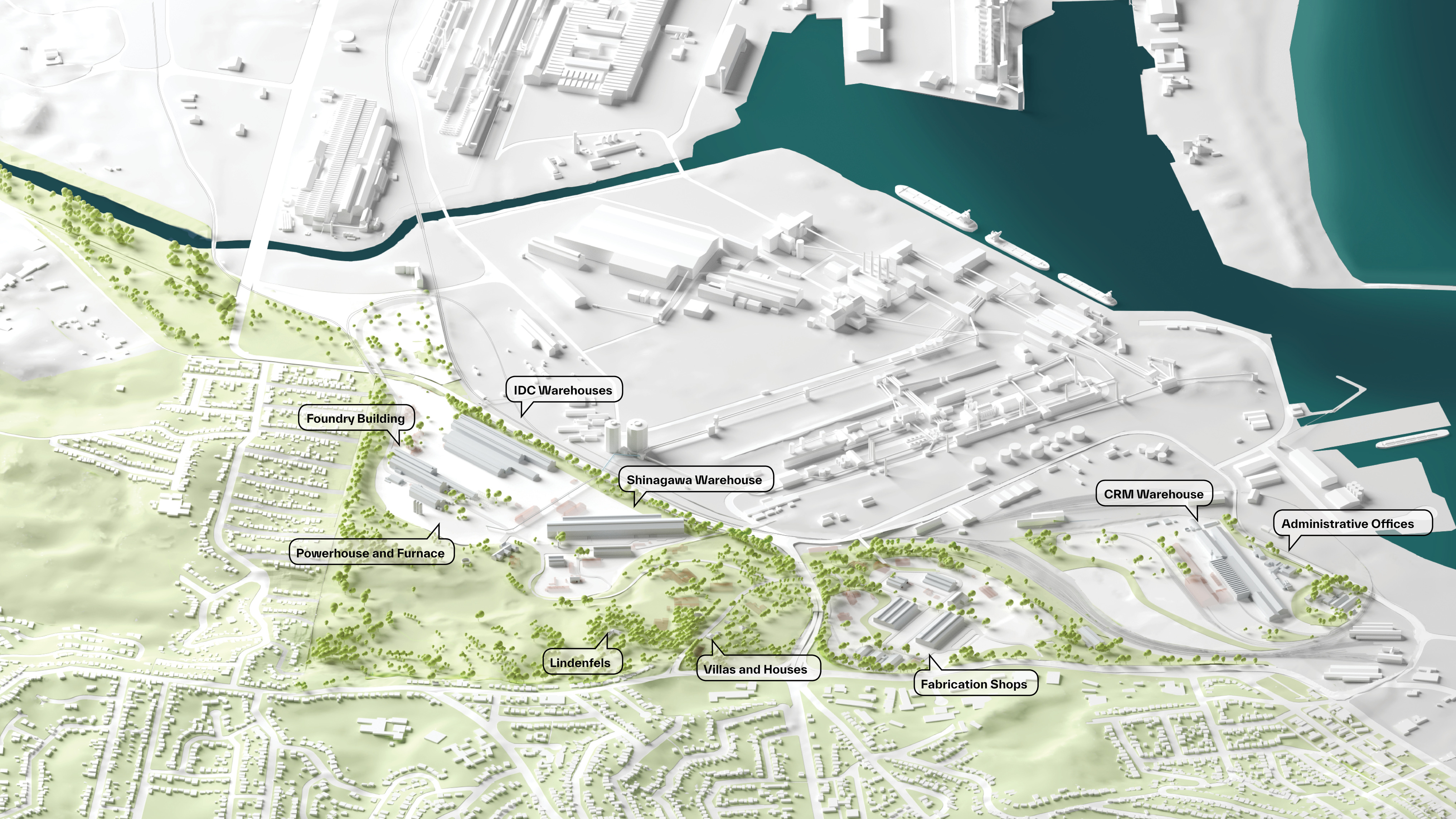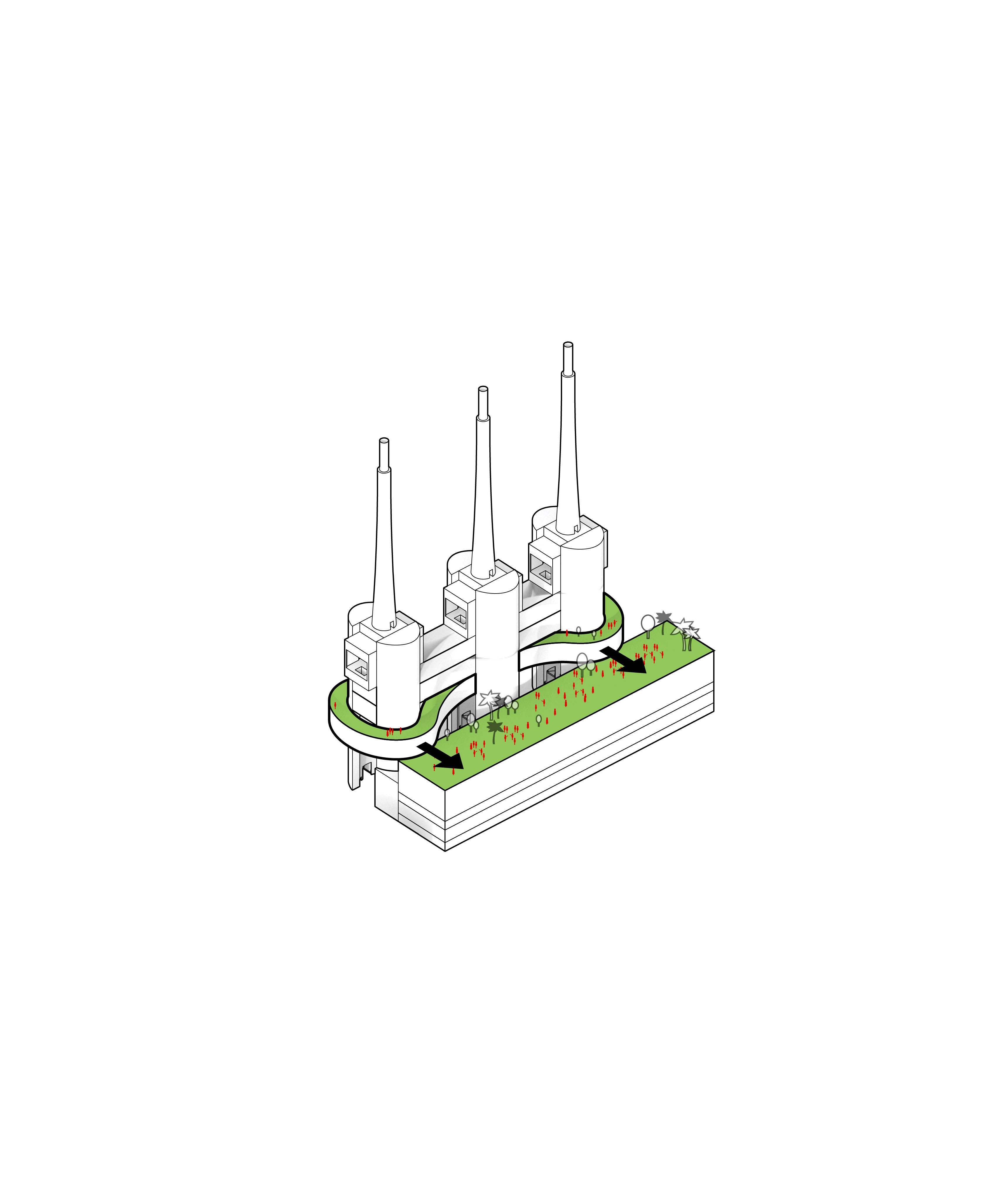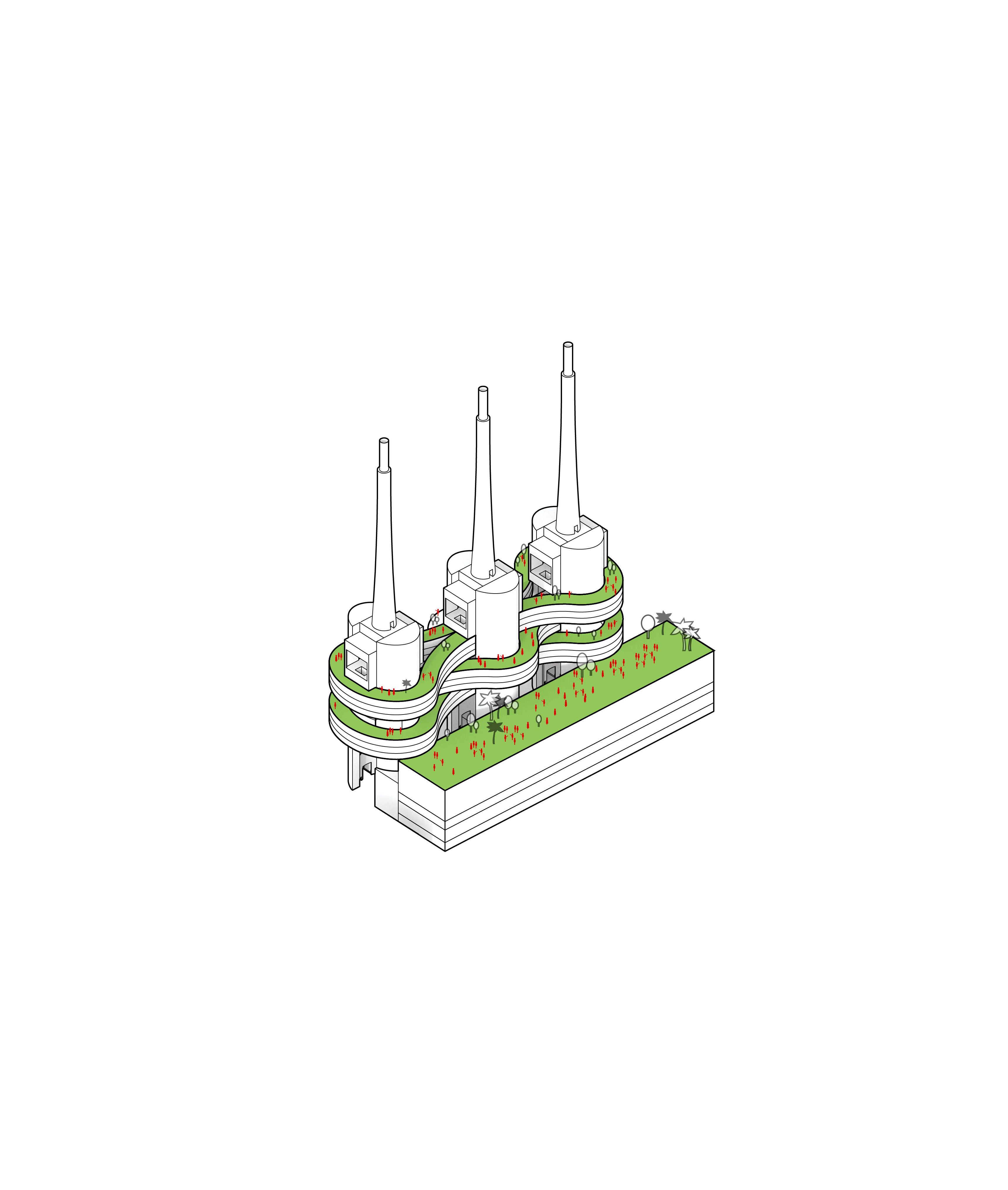 The vision preserves 75% of the site’s existing building mass, historic structures and industrial artefacts, while the remaining 25% will either be transformed or dismantled and reused in new developments – including a restaurant on top of the furnace, an industrial lift turned into an elevated garden, and steel repurposed in new building structures.