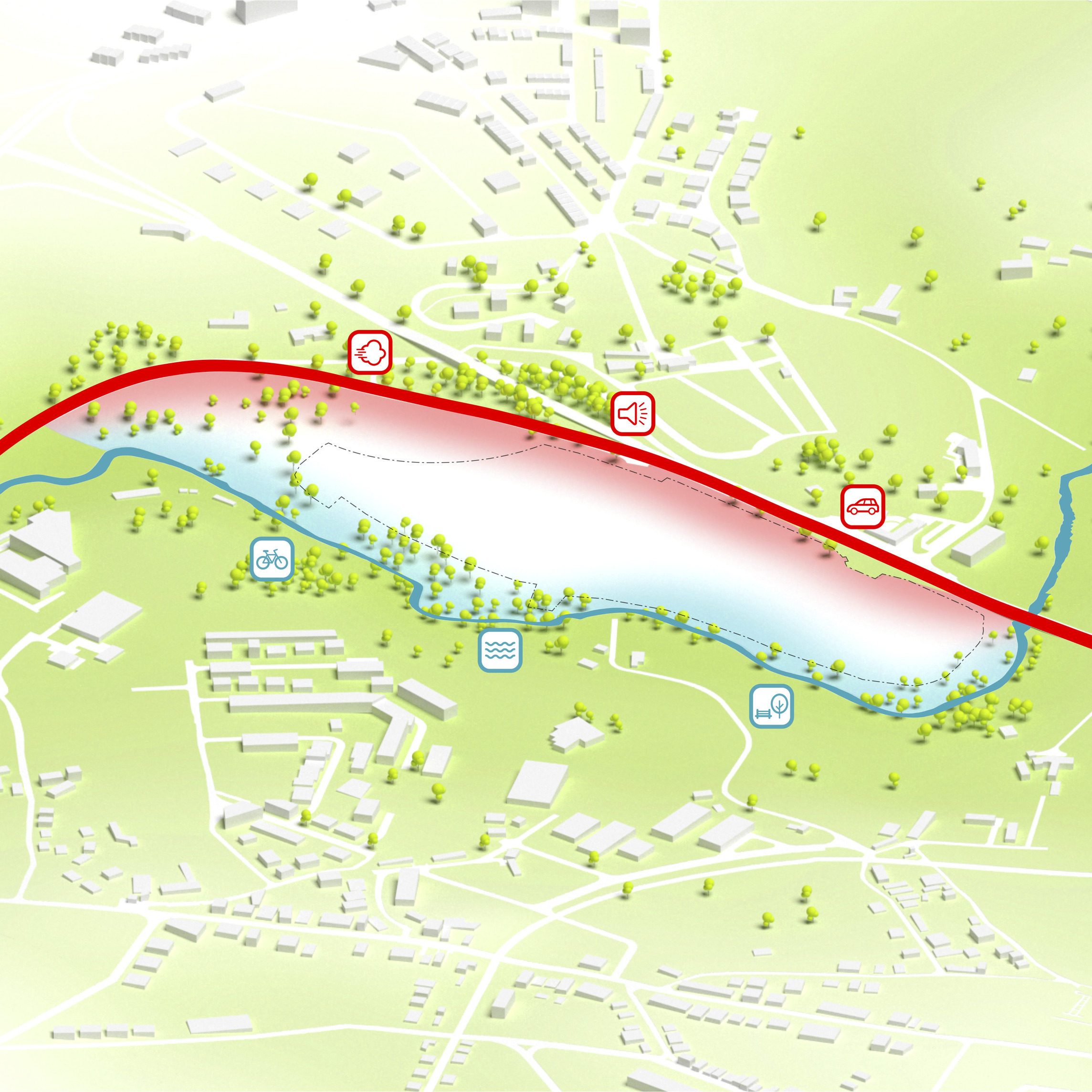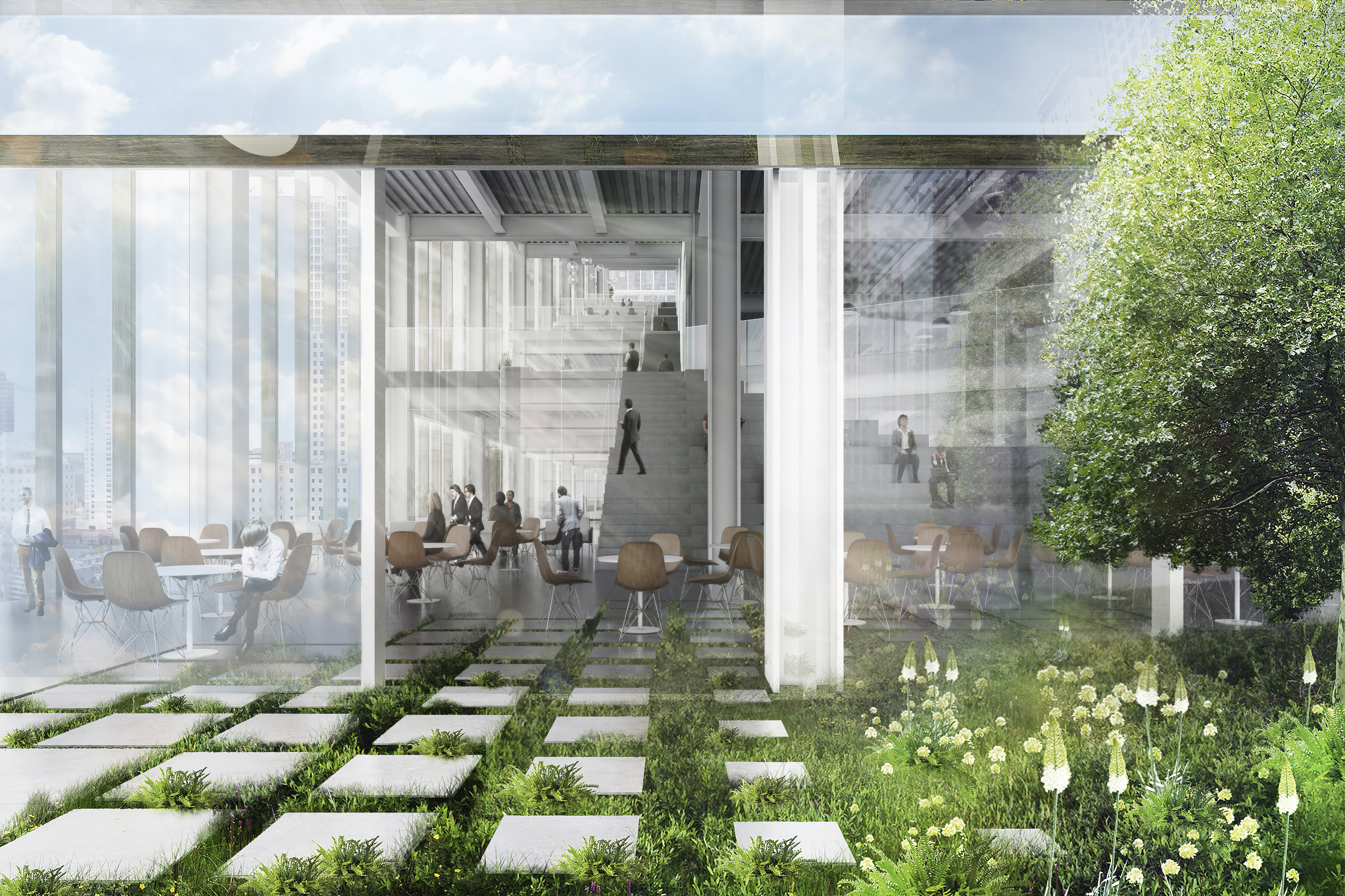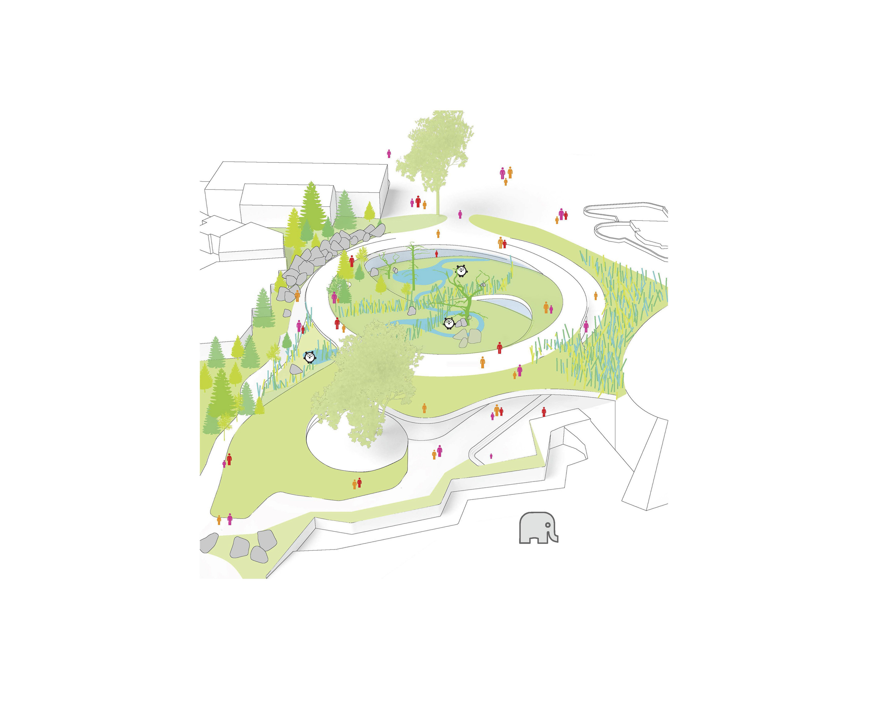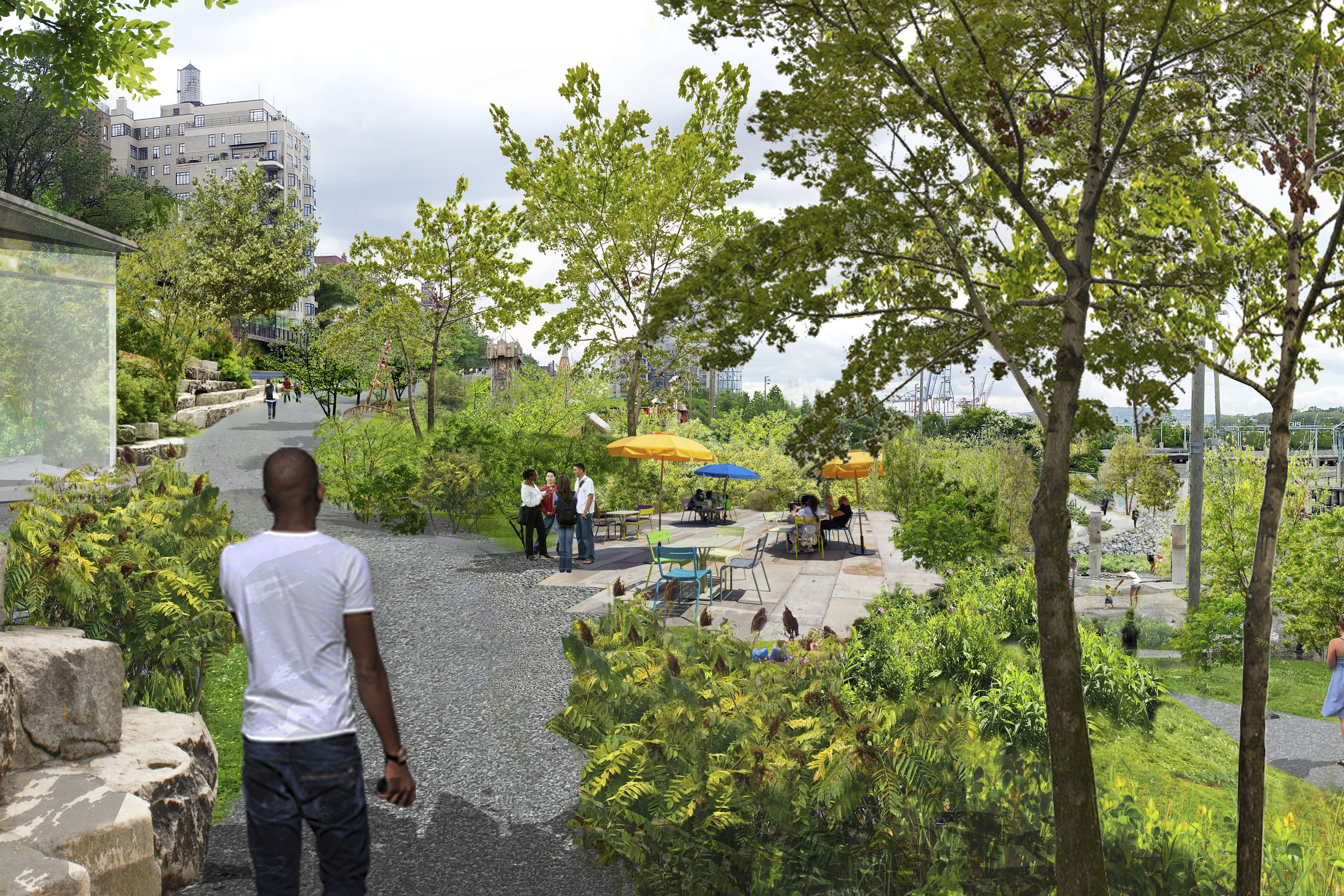 The vision preserves 75% of the site’s existing building mass, historic structures and industrial artefacts, while the remaining 25% will either be transformed or dismantled and reused in new developments – including a restaurant on top of the furnace, an industrial lift turned into an elevated garden, and steel repurposed in new building structures.