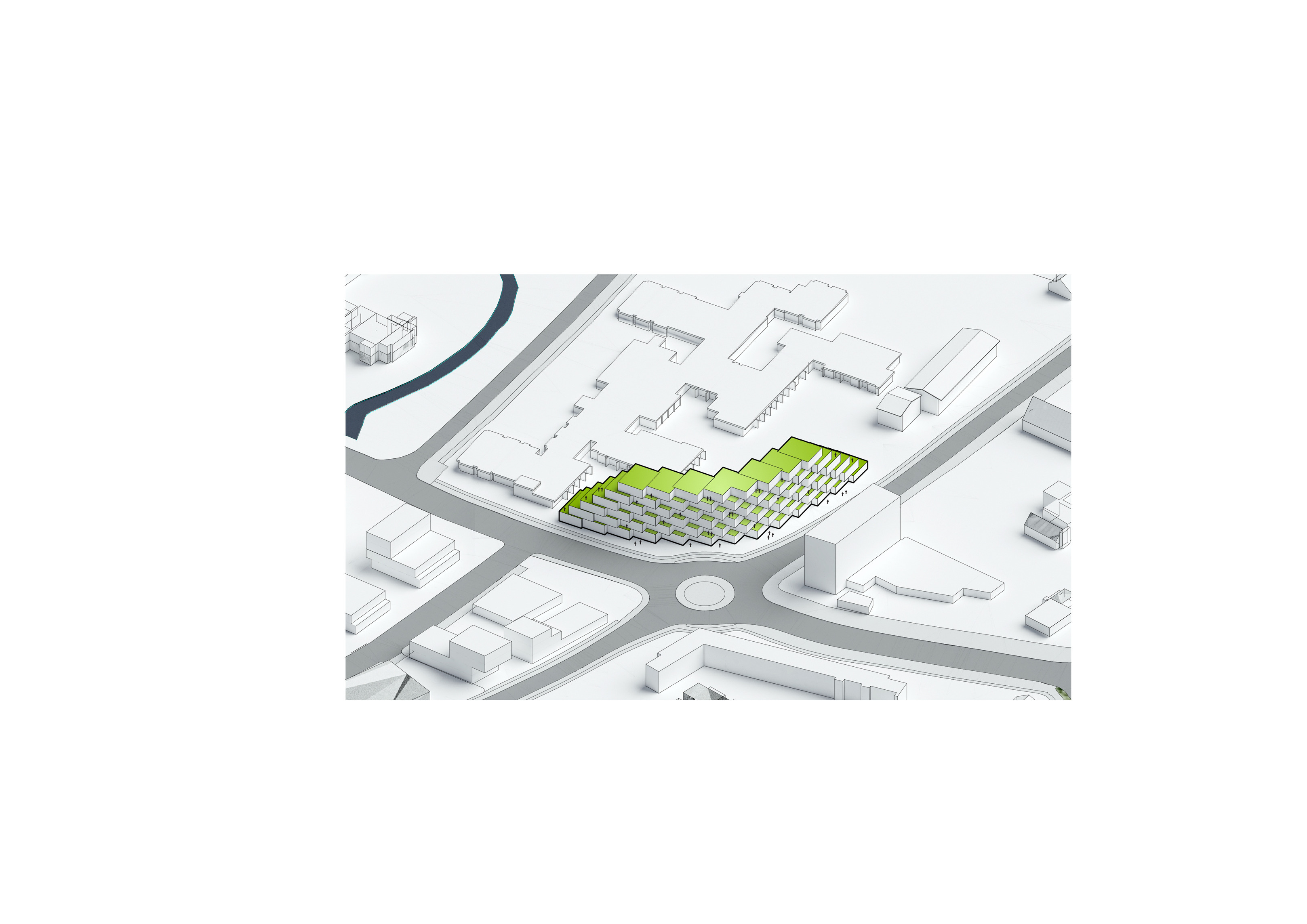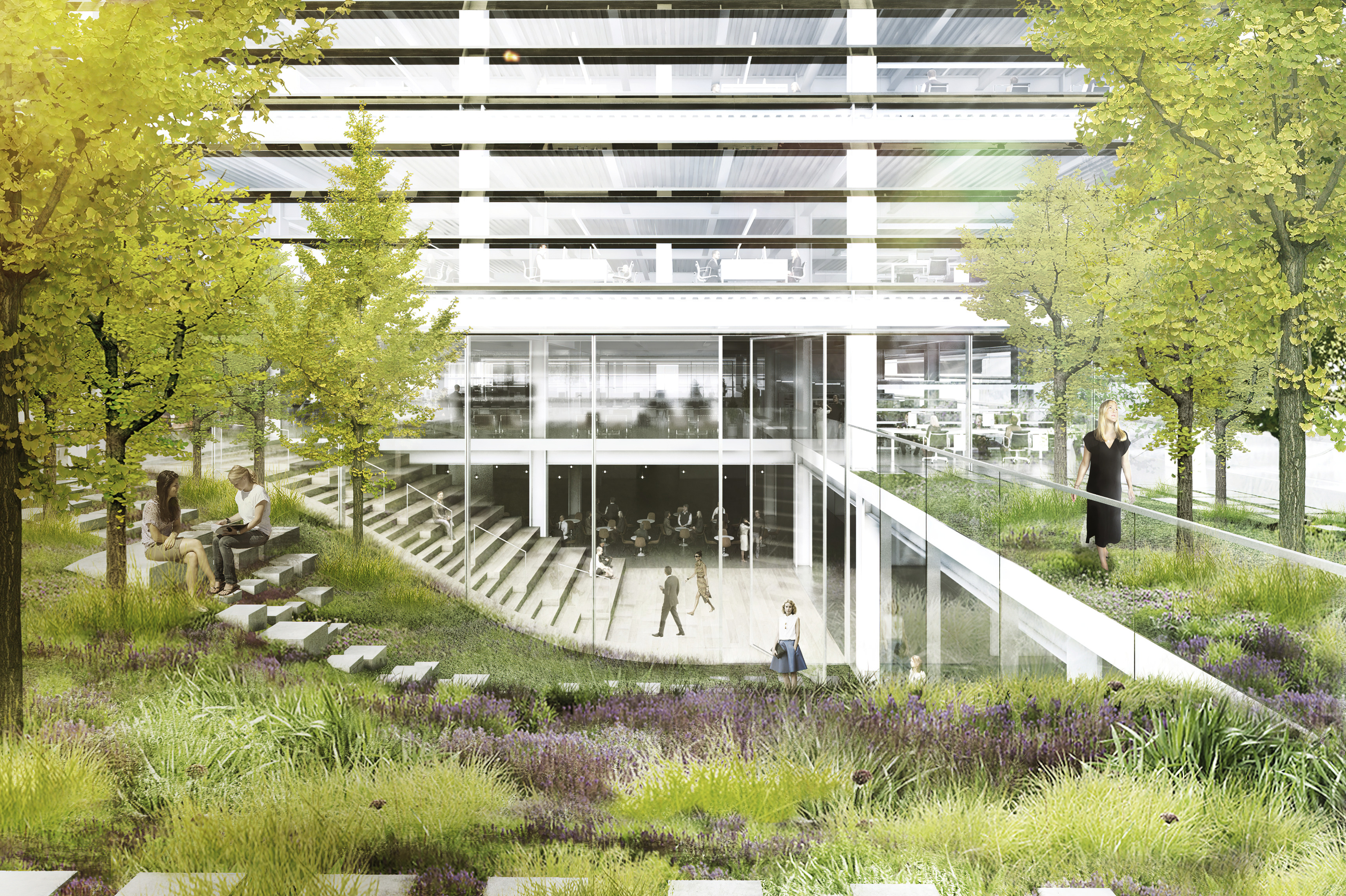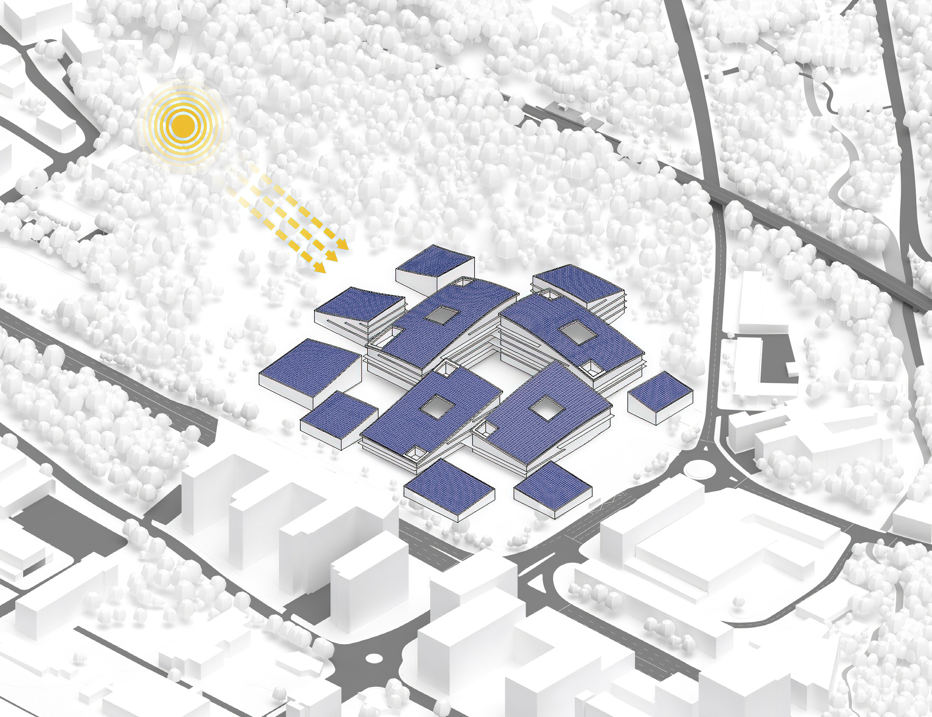 Photovoltaic panels will be installed on the roof of the buildings to supply 95% of the site’s energy needs, while green roofs will provide resilient water management and enhance biodiversity.