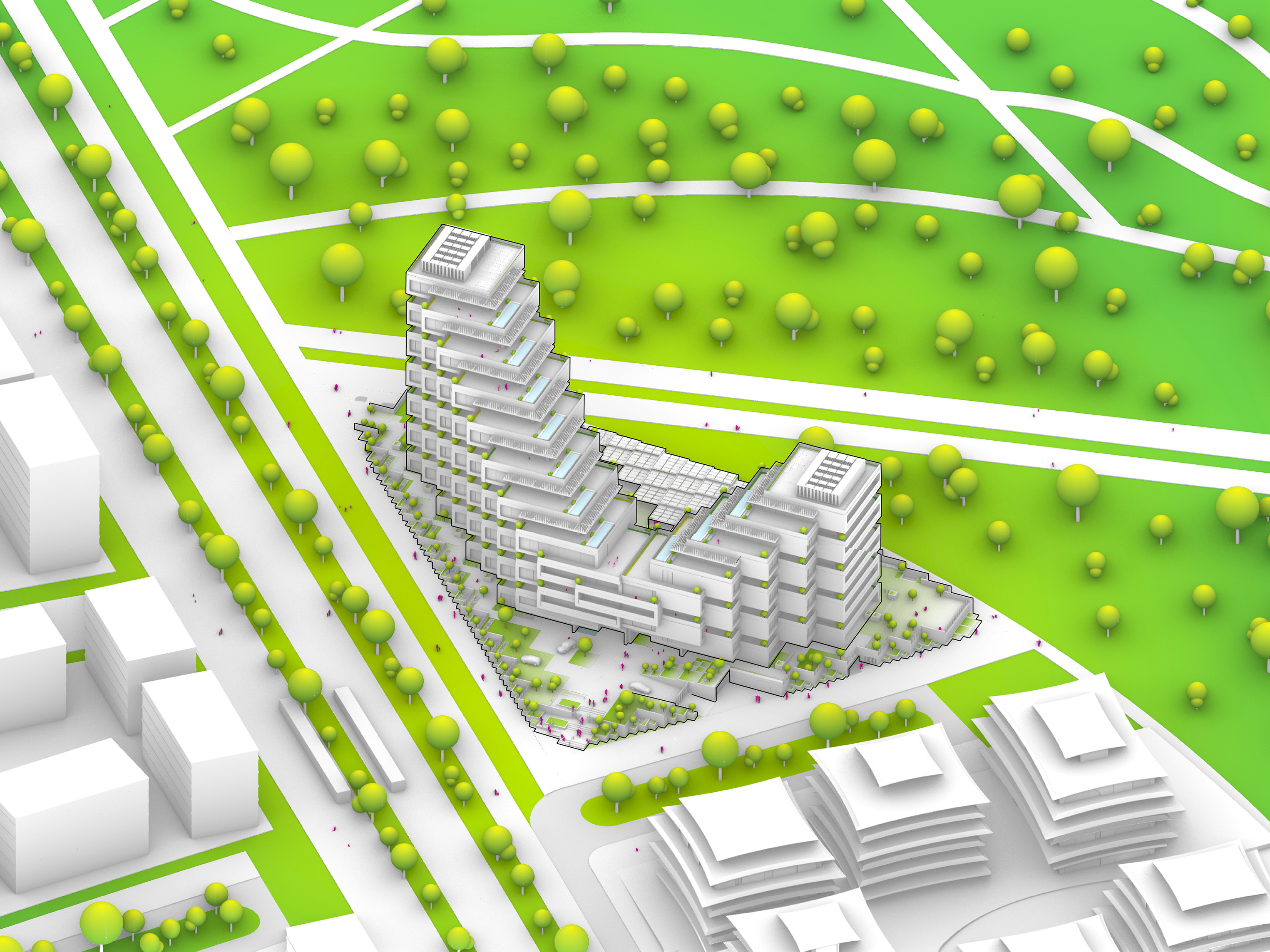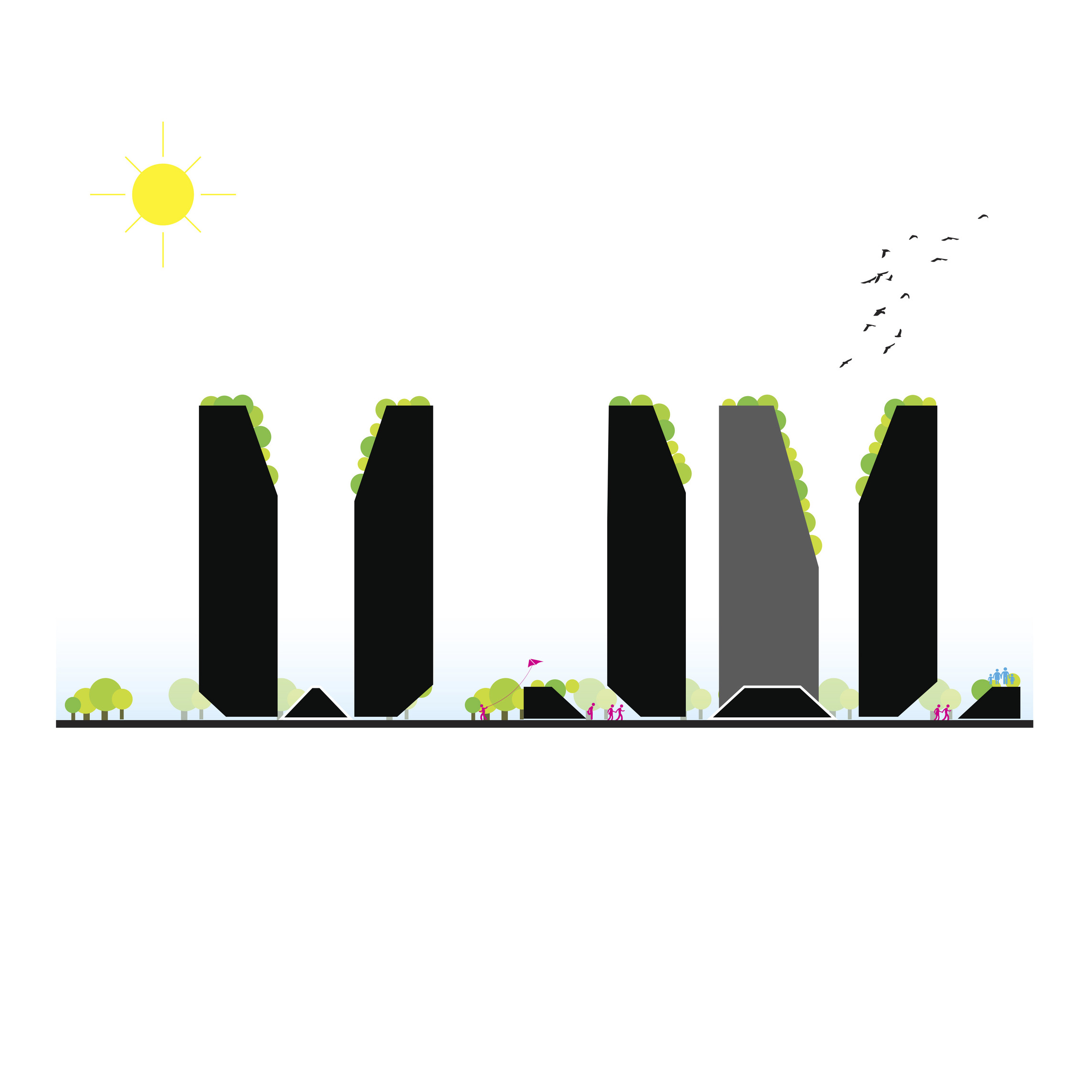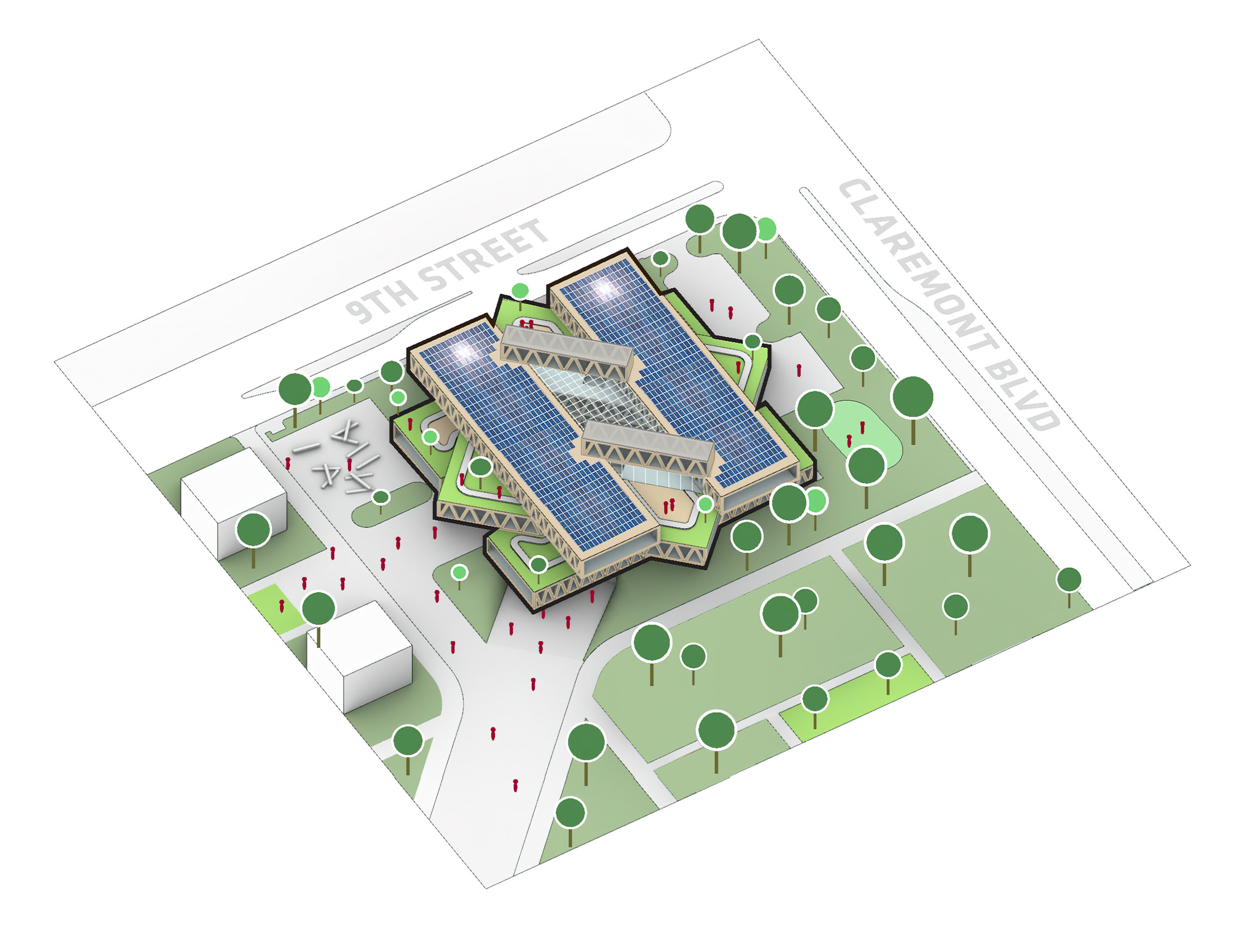 Photovoltaic panels will be installed on the roof of the buildings to supply 95% of the site’s energy needs, while green roofs will provide resilient water management and enhance biodiversity.