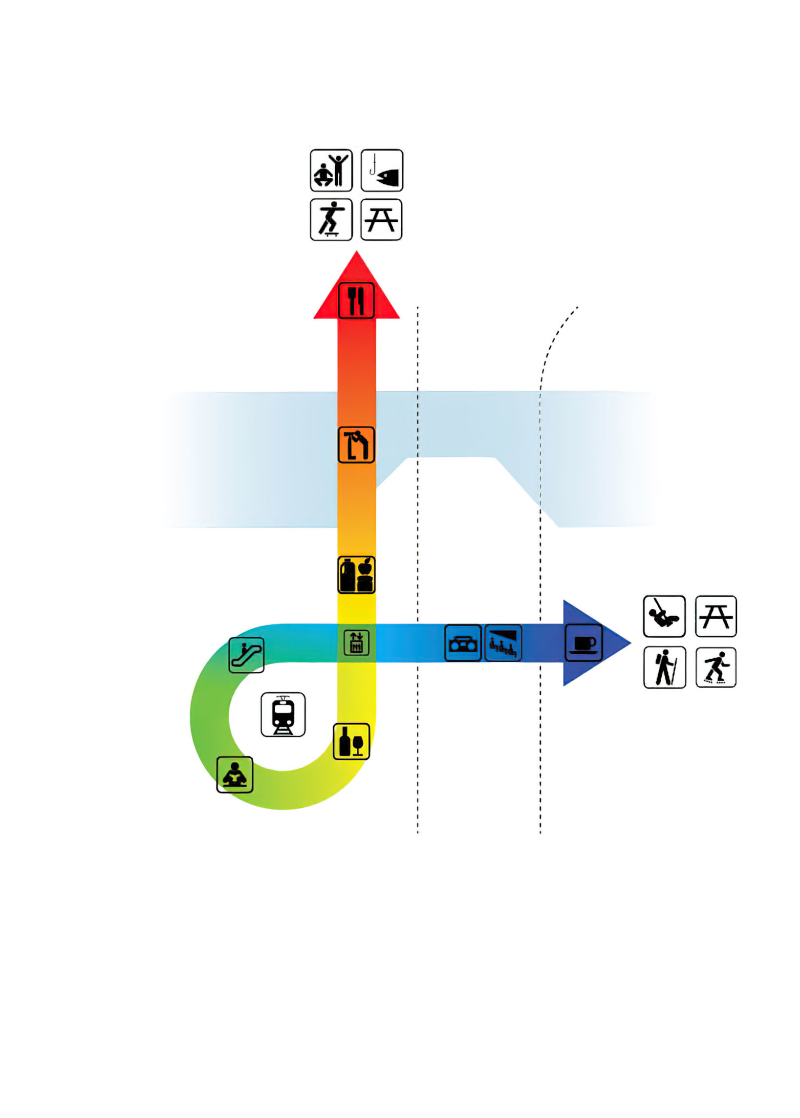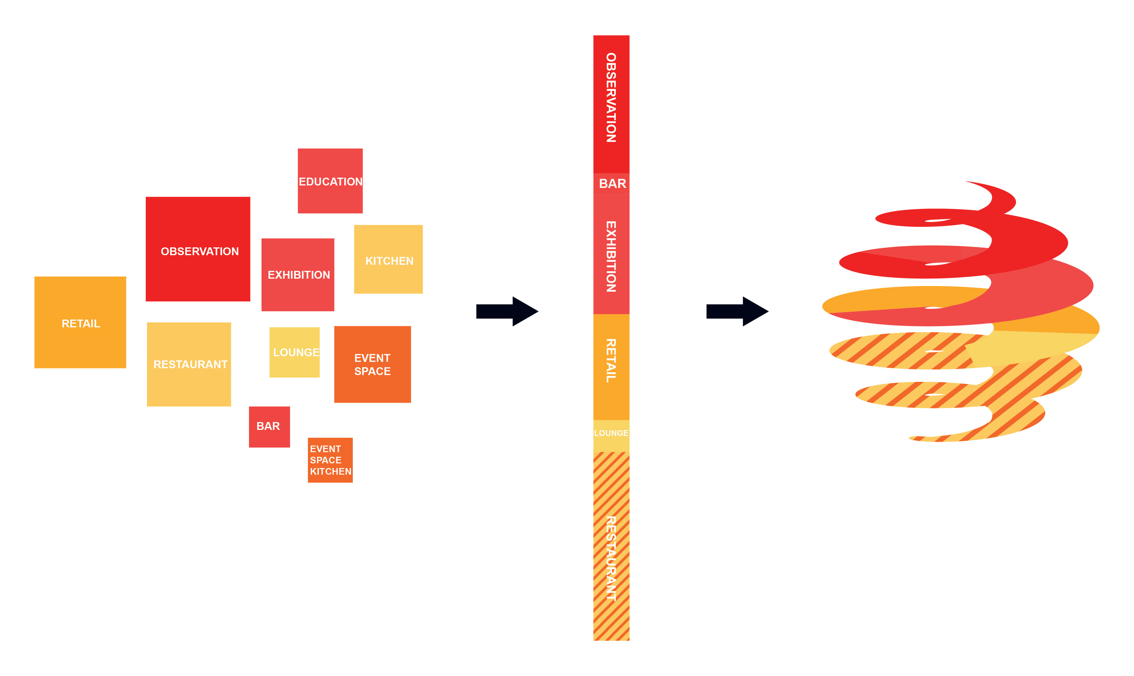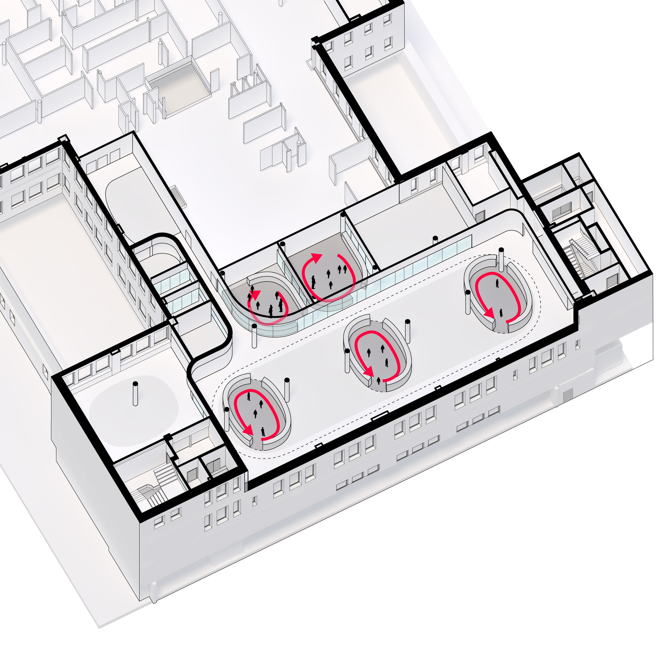 Daily users and visitors enter directly into the Gastro Hall, the backbone of GOe. This central space runs from the ground floor all the way to the roof. Like a promenade, the grand staircase connects all programs and levels within the building and doubles as an amphitheater for events and lectures, allowing visitors to observe the showcase kitchens and ongoing research during their visit. Moving up, visitors can continue into the auditorium, public terraces, or experience world-class cuisine at the top floor restaurant.