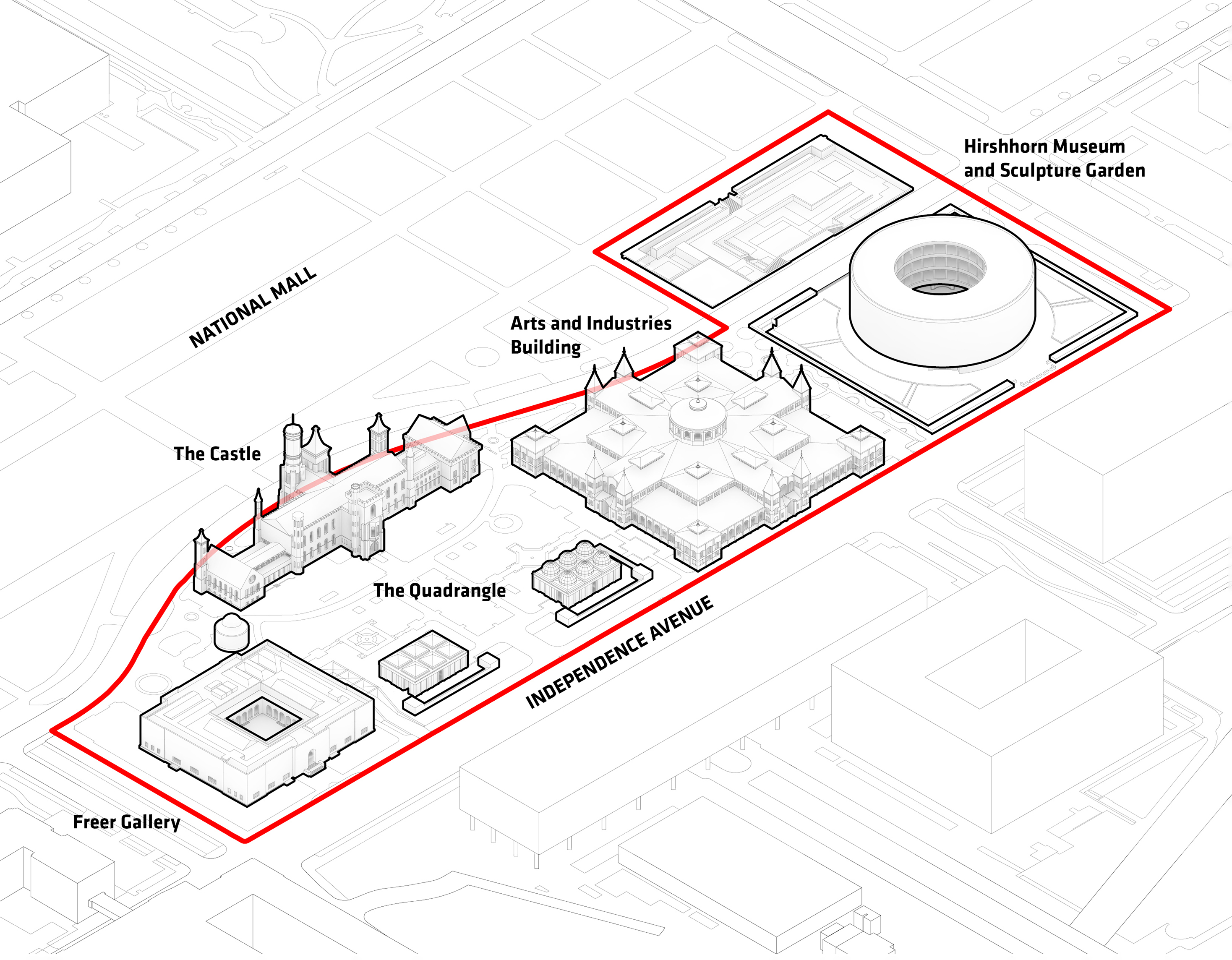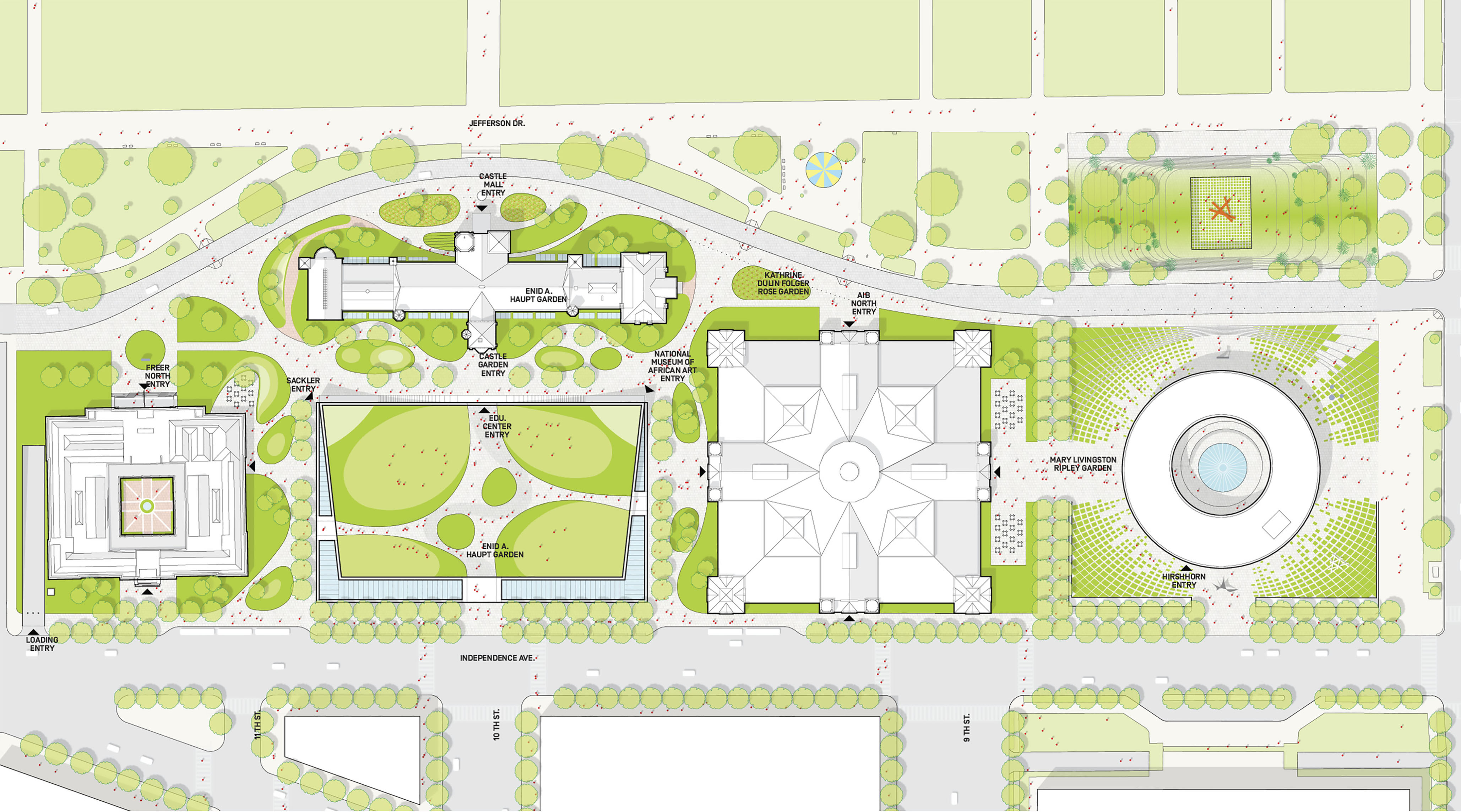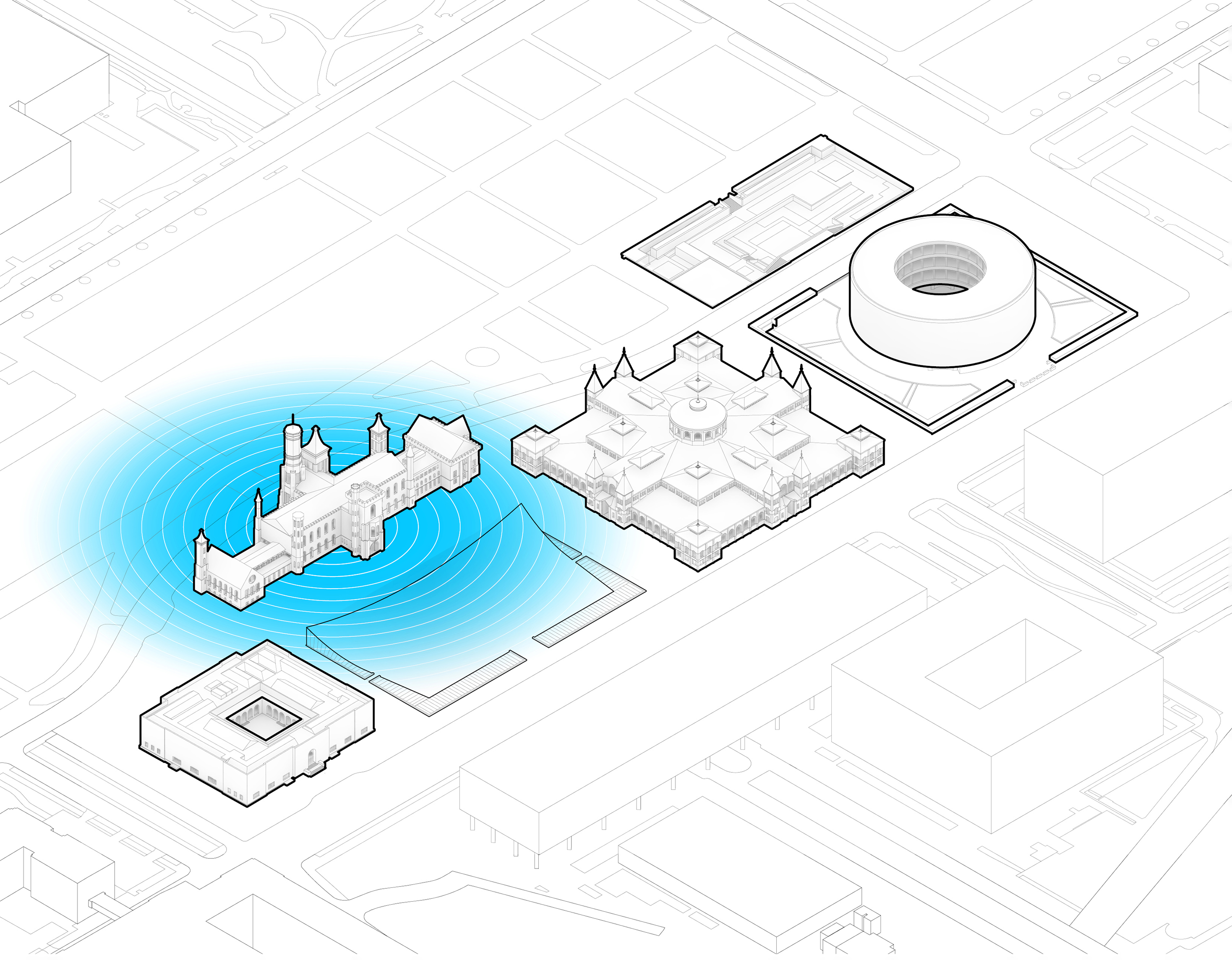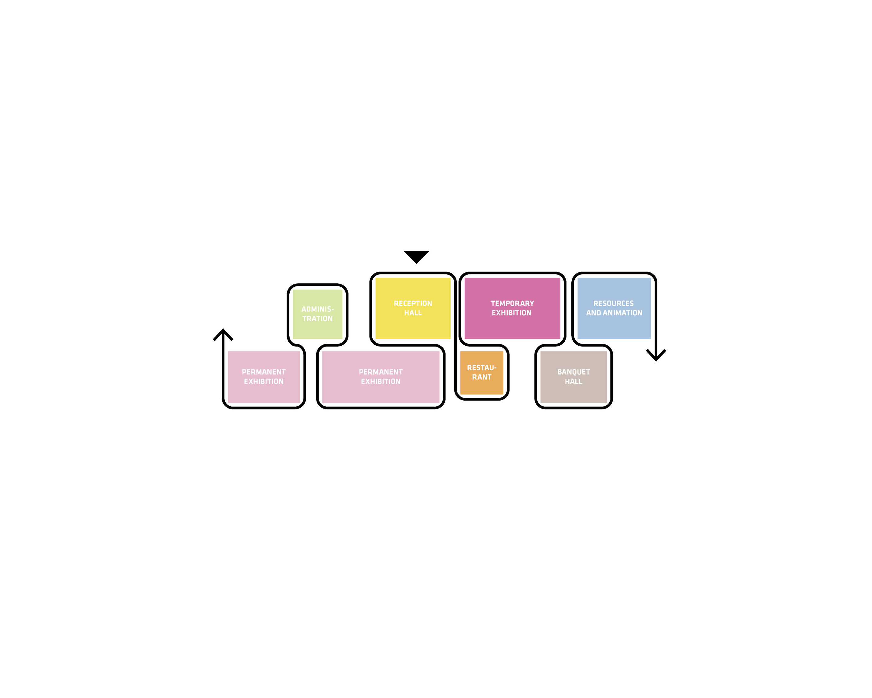 Four of the museum’s pavilions comprise the main gallery experience, while the remaining pavilions include a grand entrance space, multifunction hall, theater, and restaurant. A continuous path guides visitors through the museum, branching off into smaller routes between the galleries.