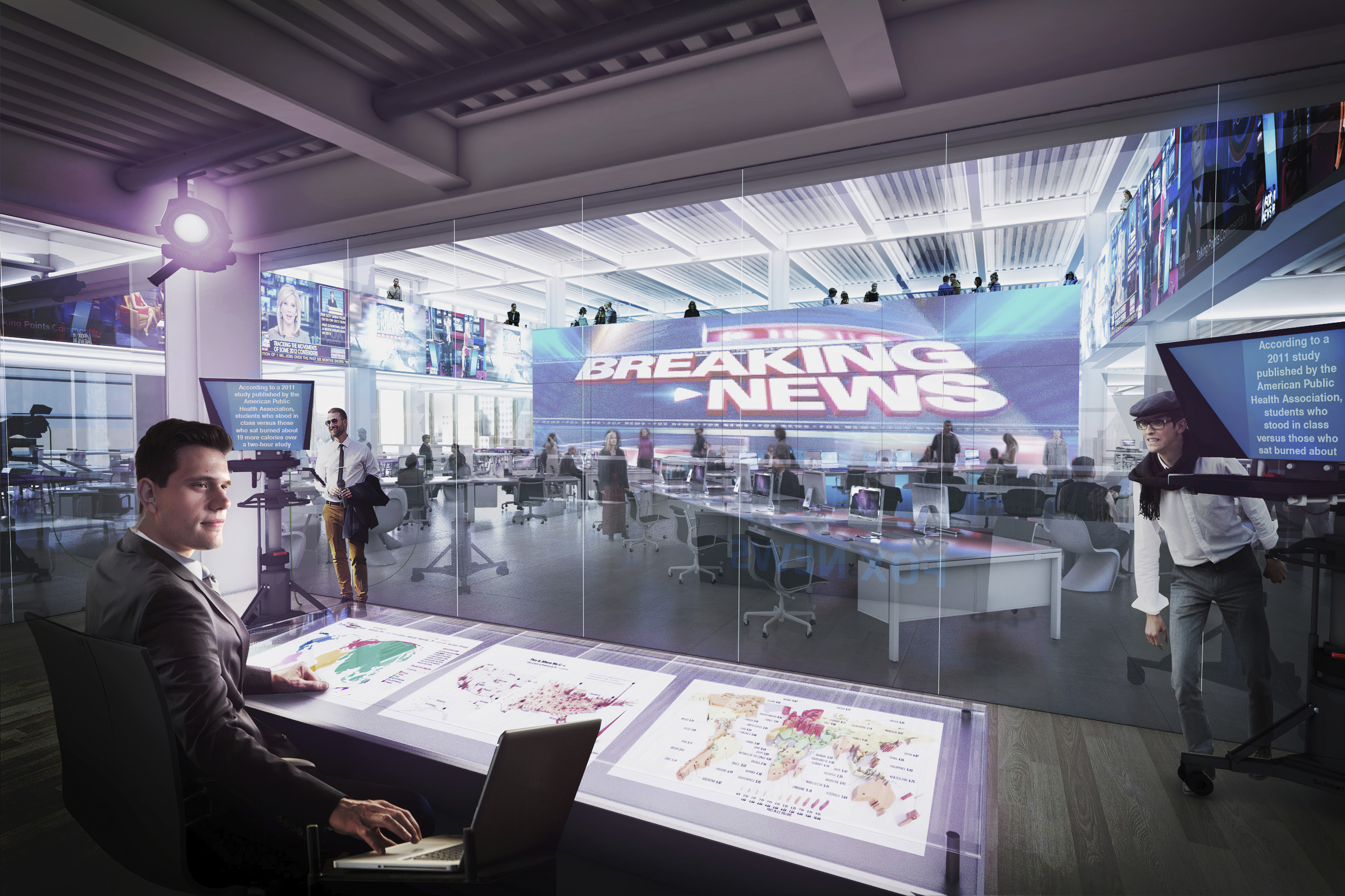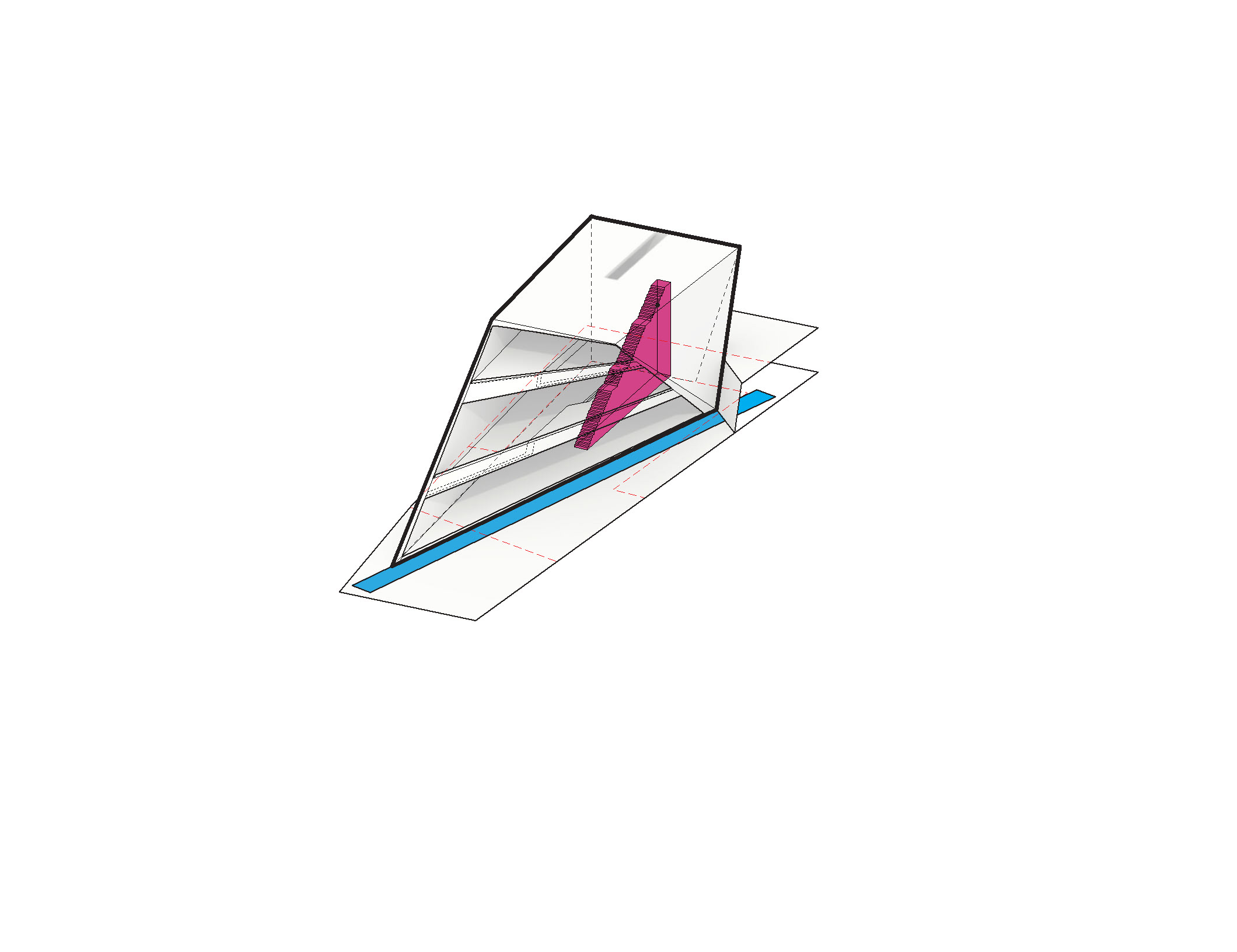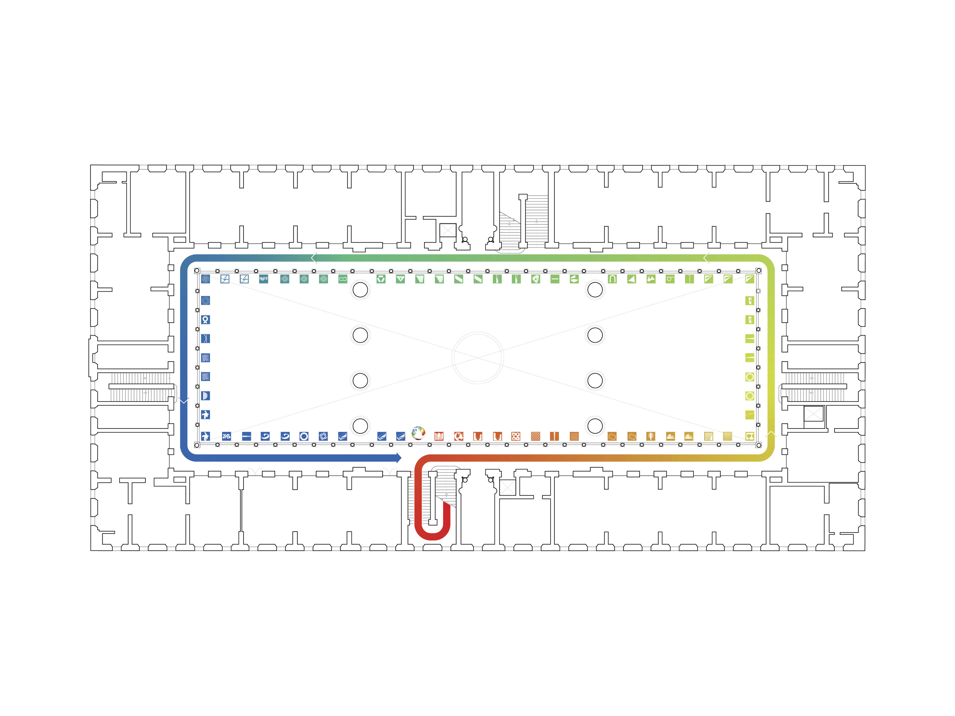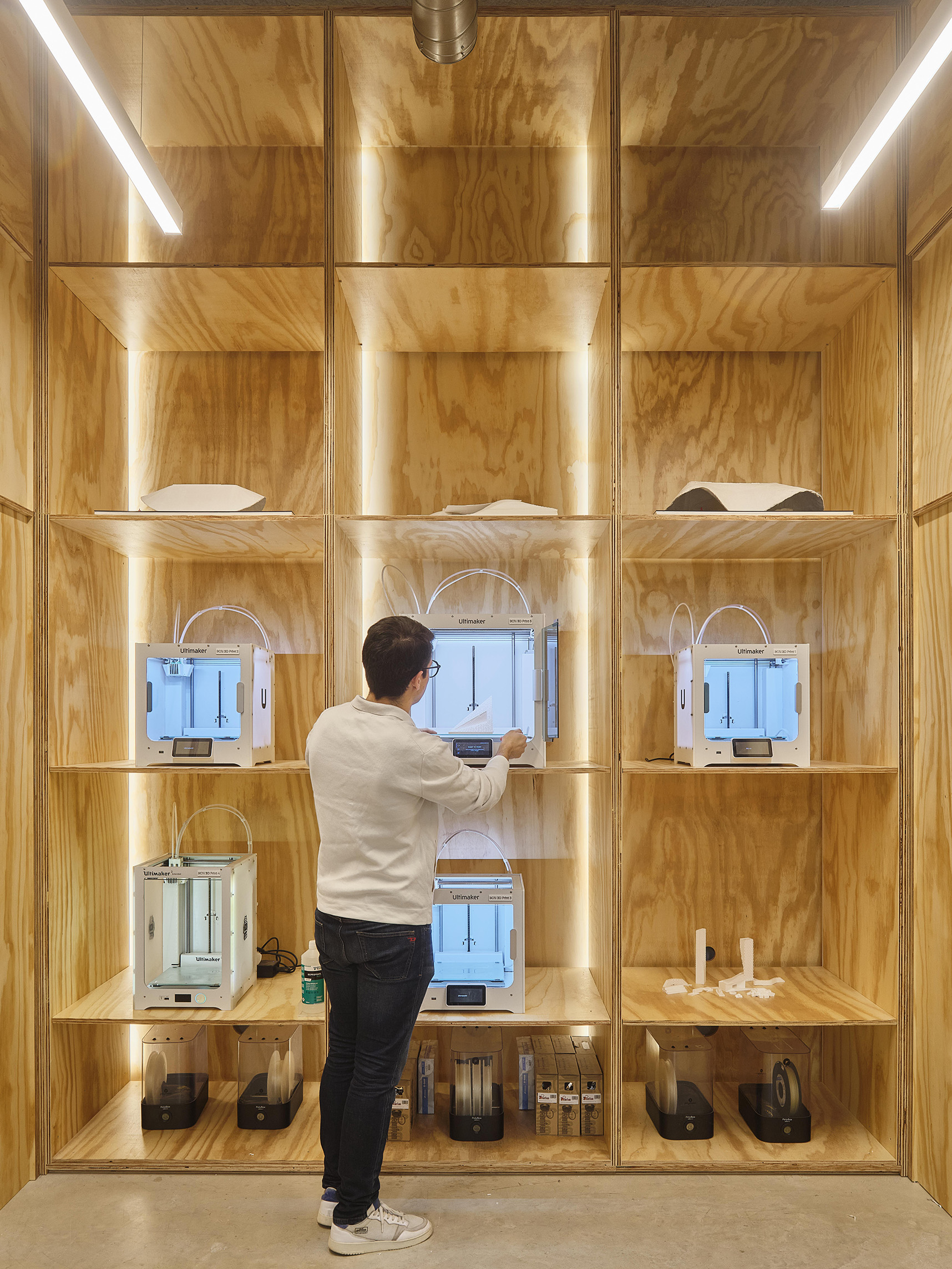 A gallery on the south side of the space connects east to west and is flanked by a library for Architectural building materials/samples on one side and backlit “pizza” shelves for archiving and displaying hundreds of process models.