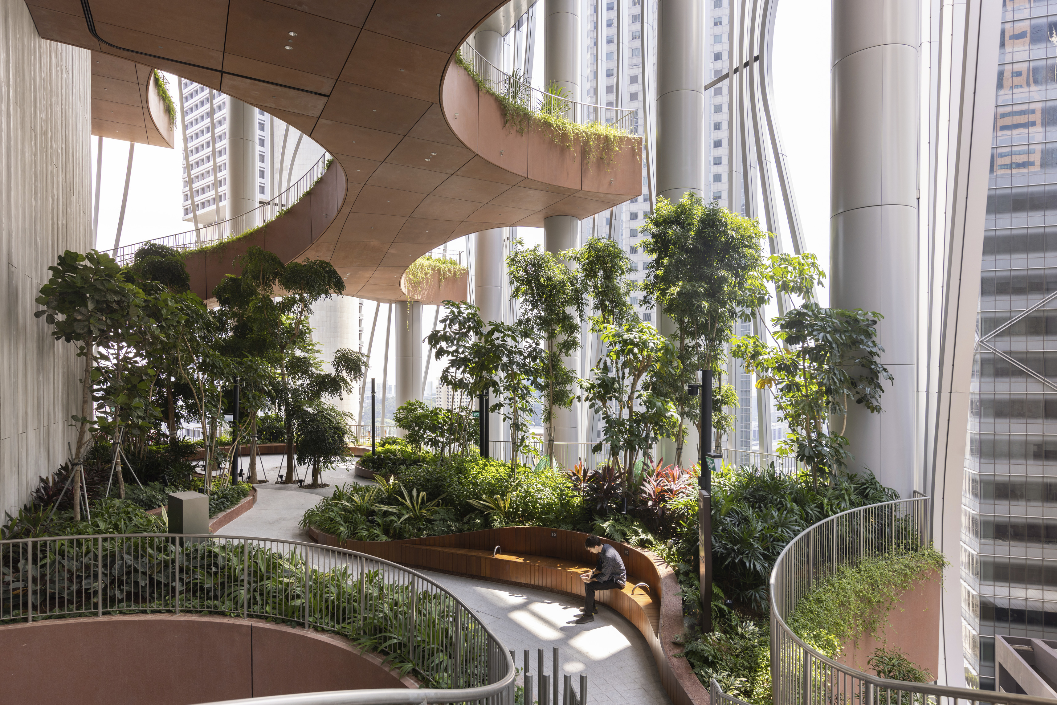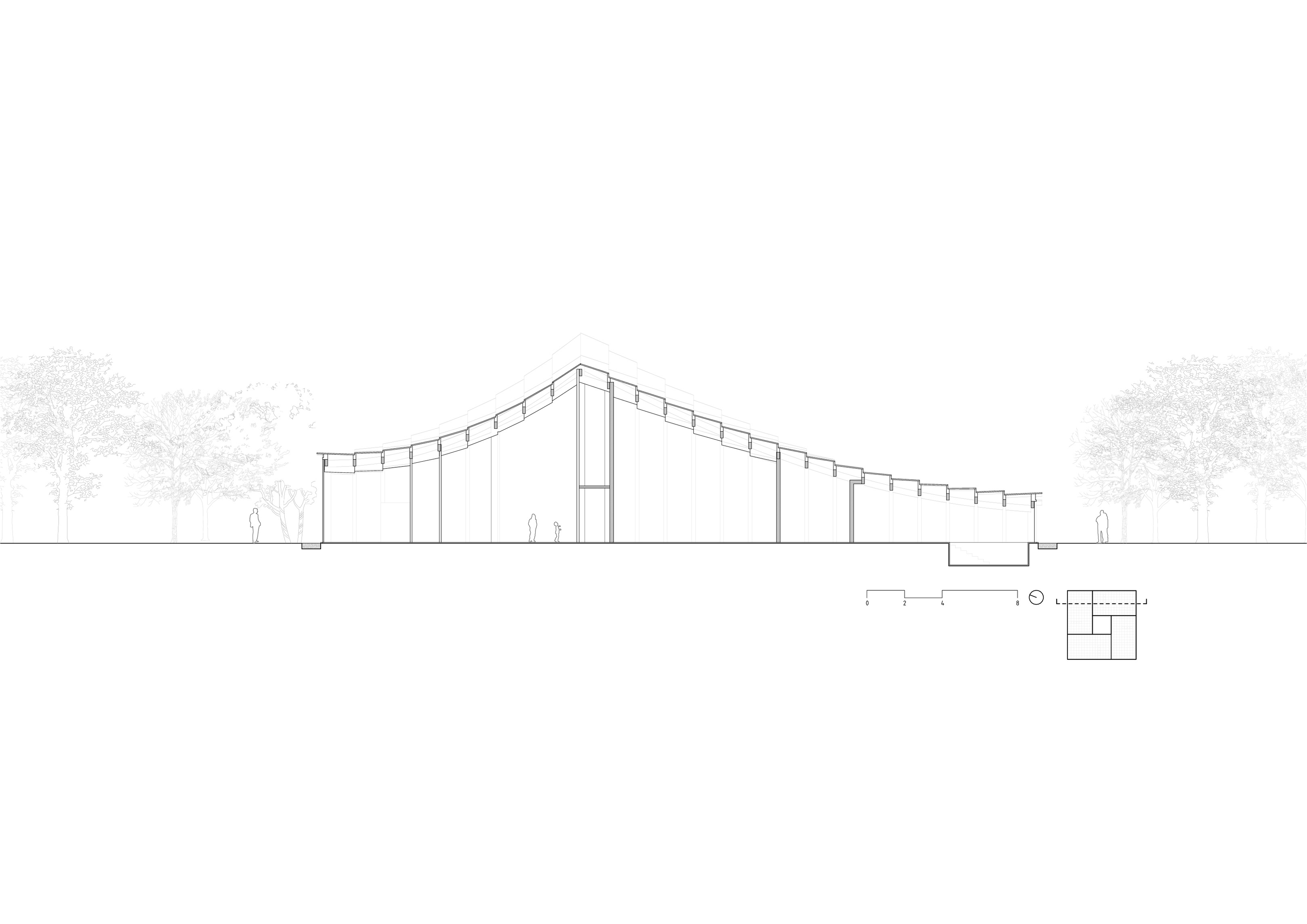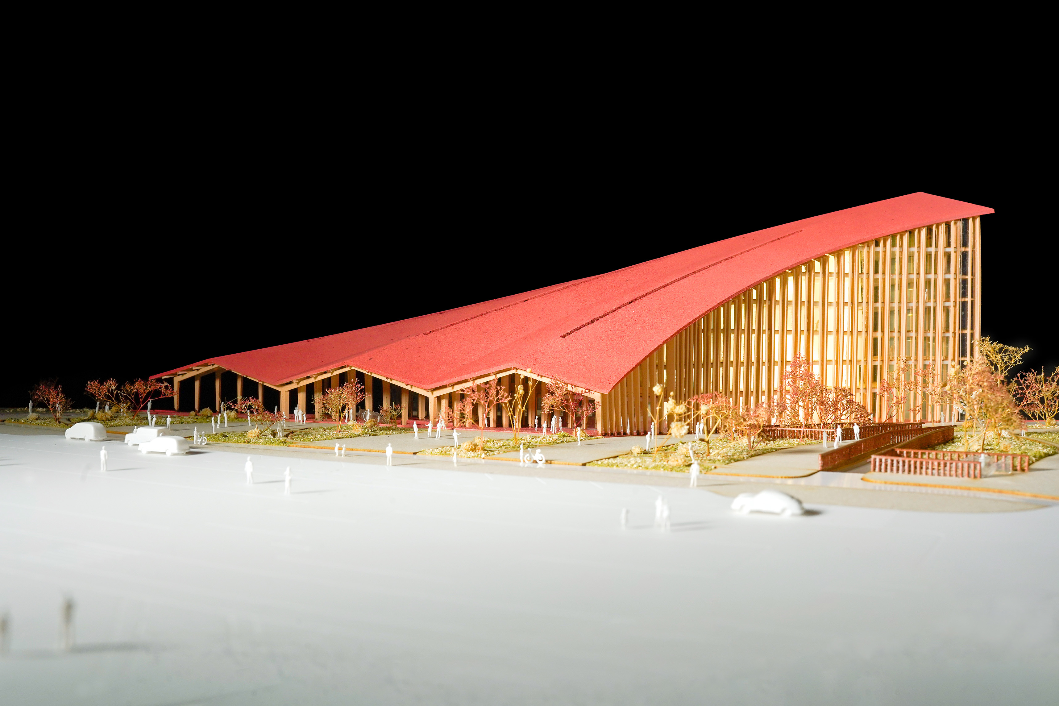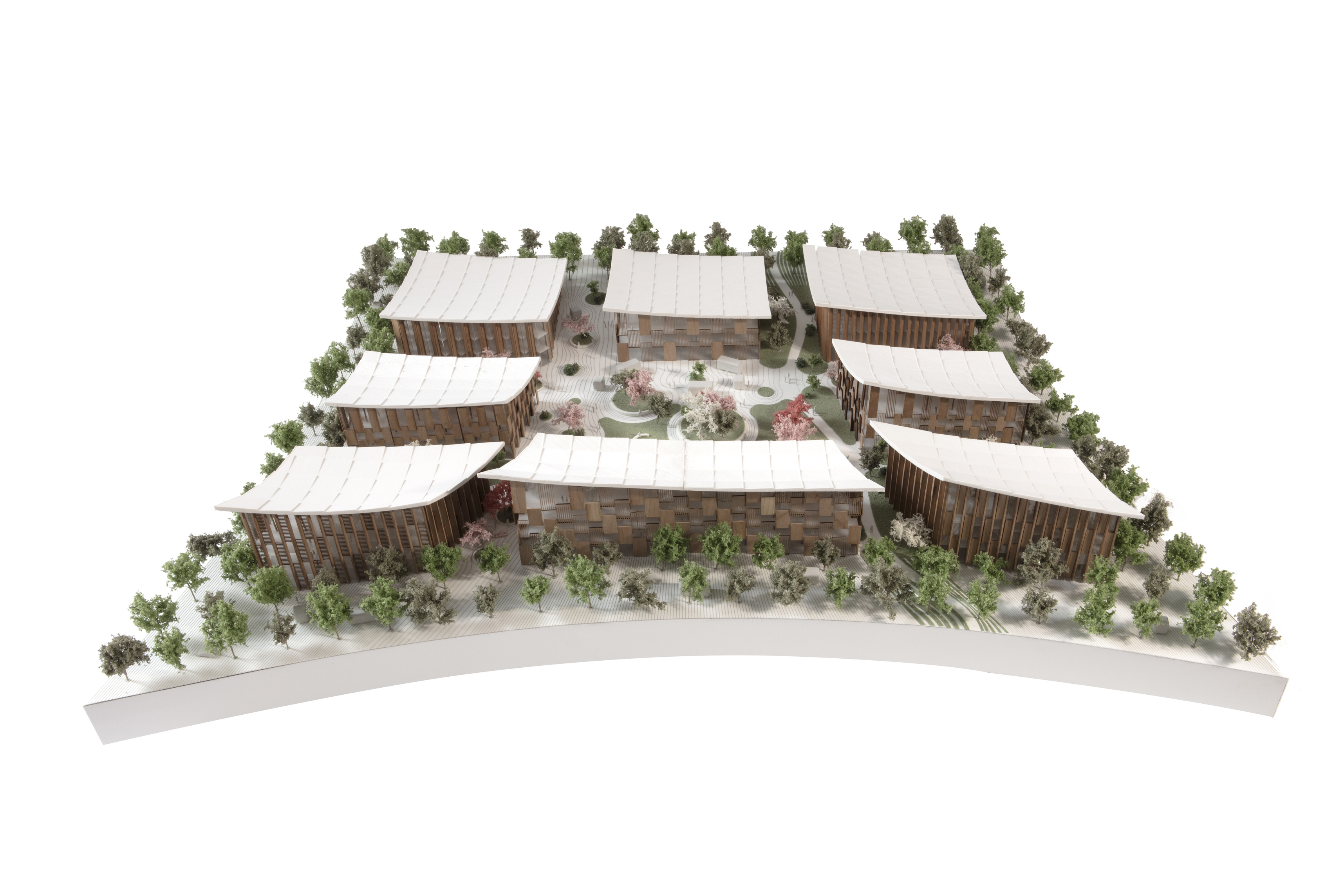 Conceived as a reimagination of the traditional garden ‘lang’ 廊 – a long, covered corridor that traces a path – 12 interconnected pavilions are unified beneath a continuous, ribbon-like roof whose gentle undulations recall the silhouette of tiled eaves.