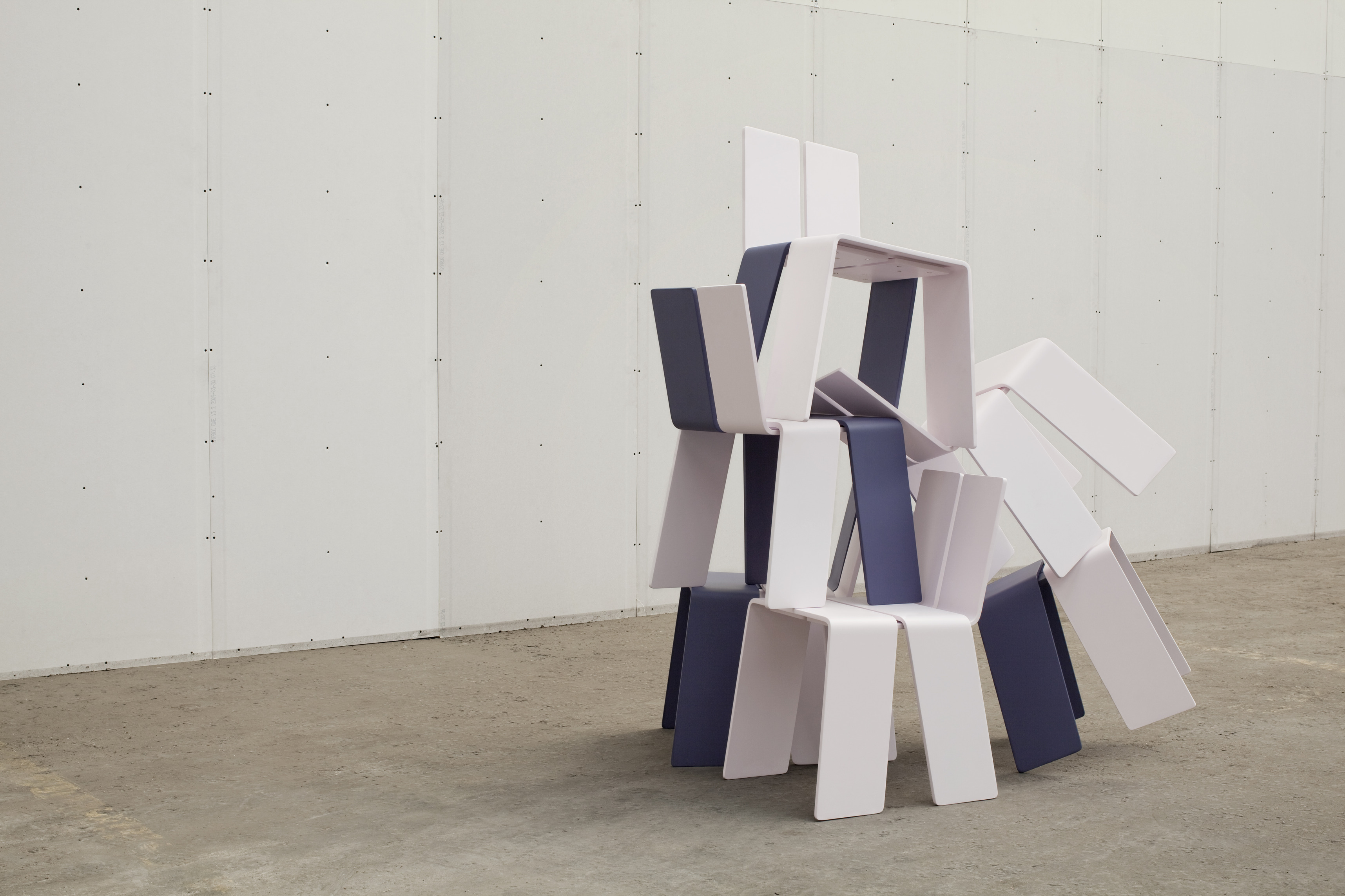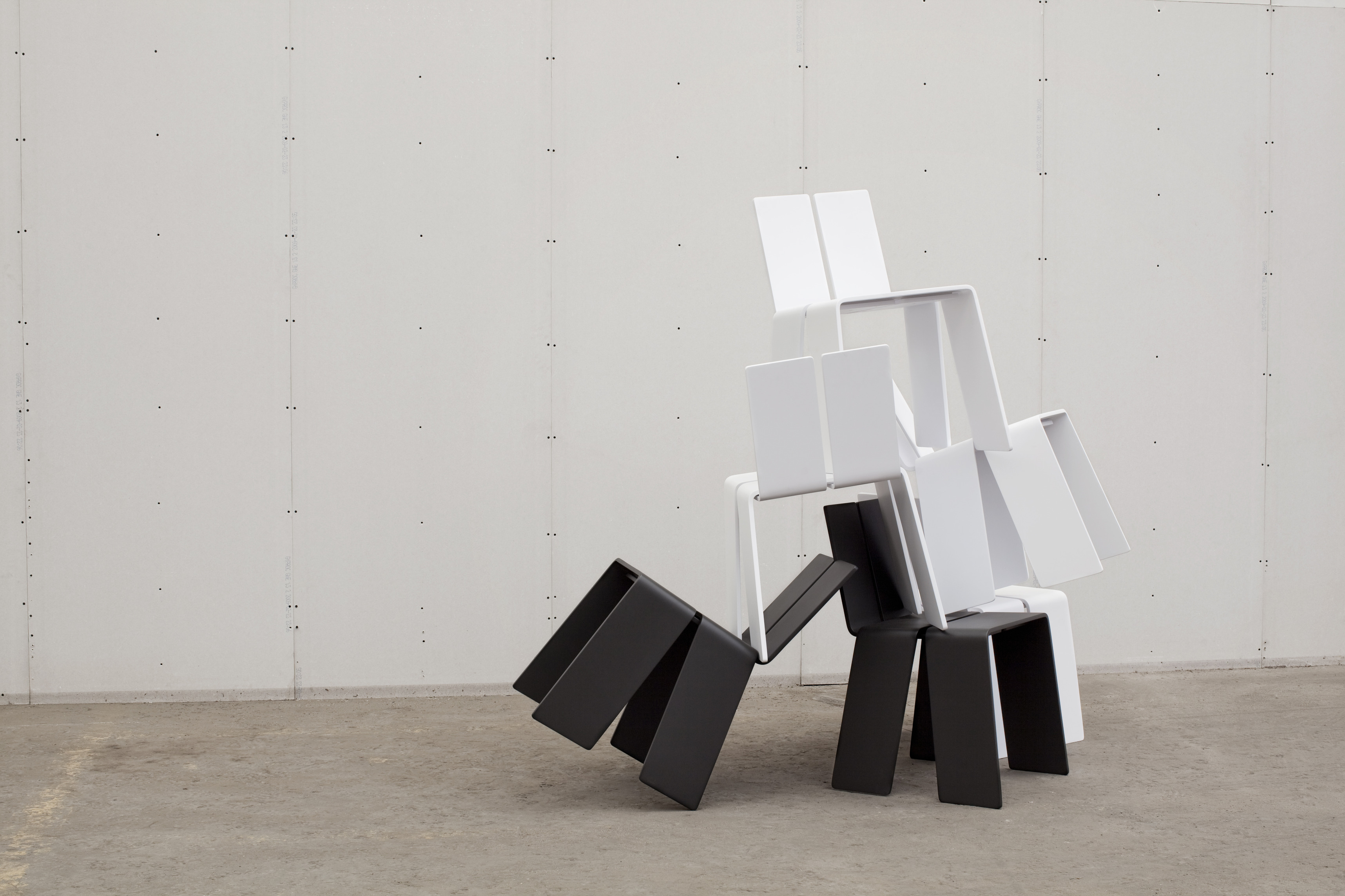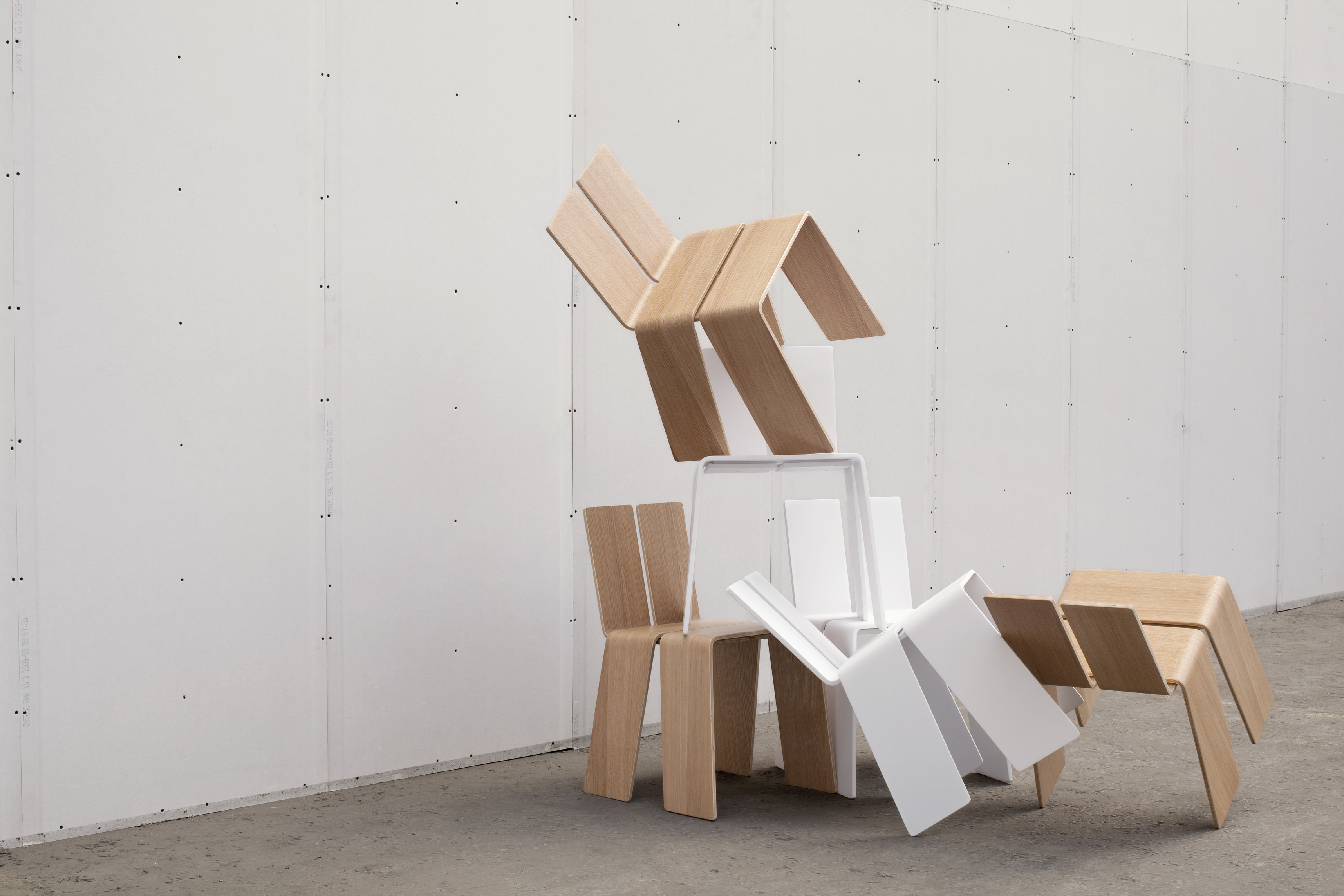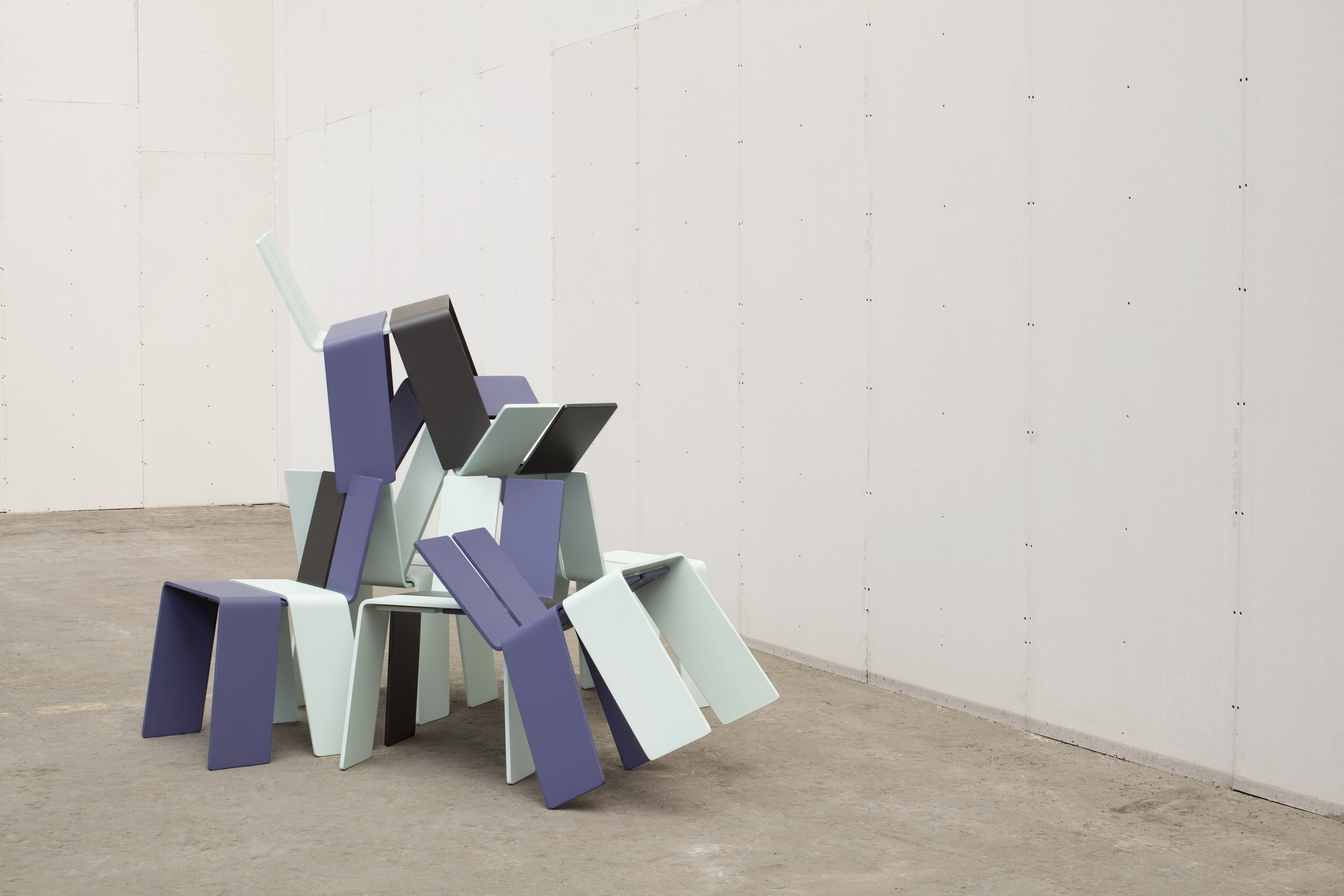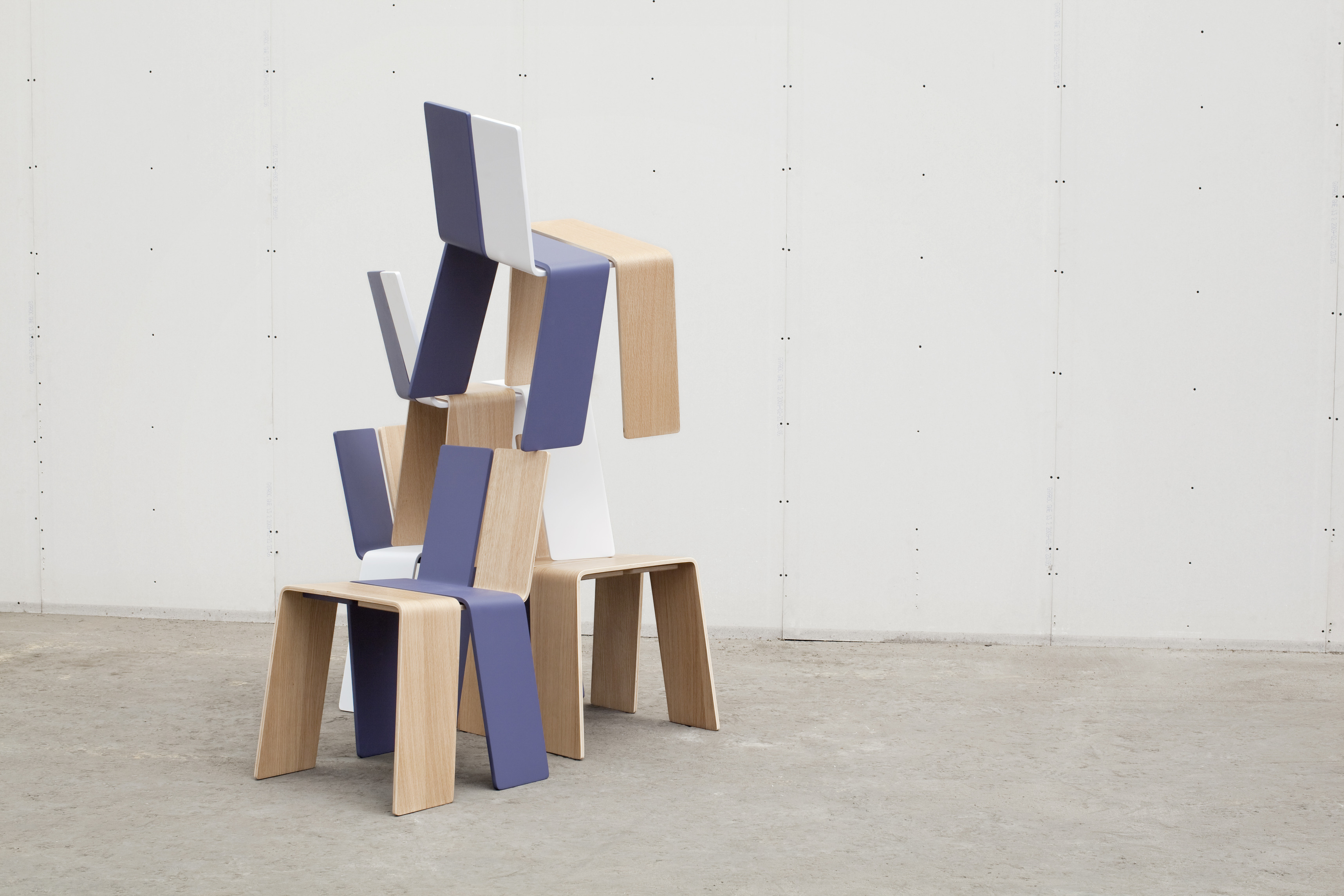 The Shanghay chair is composed of 4 small boards folded around each other to form the simplest chair imaginable, merging legs and seat, back and structure into the 4 constituent parts. Since the chair can be acquired in multiple colors and is so easy to disassemble and reassemble, users are able to create their own hybrid designs by recombining their colors of choice.