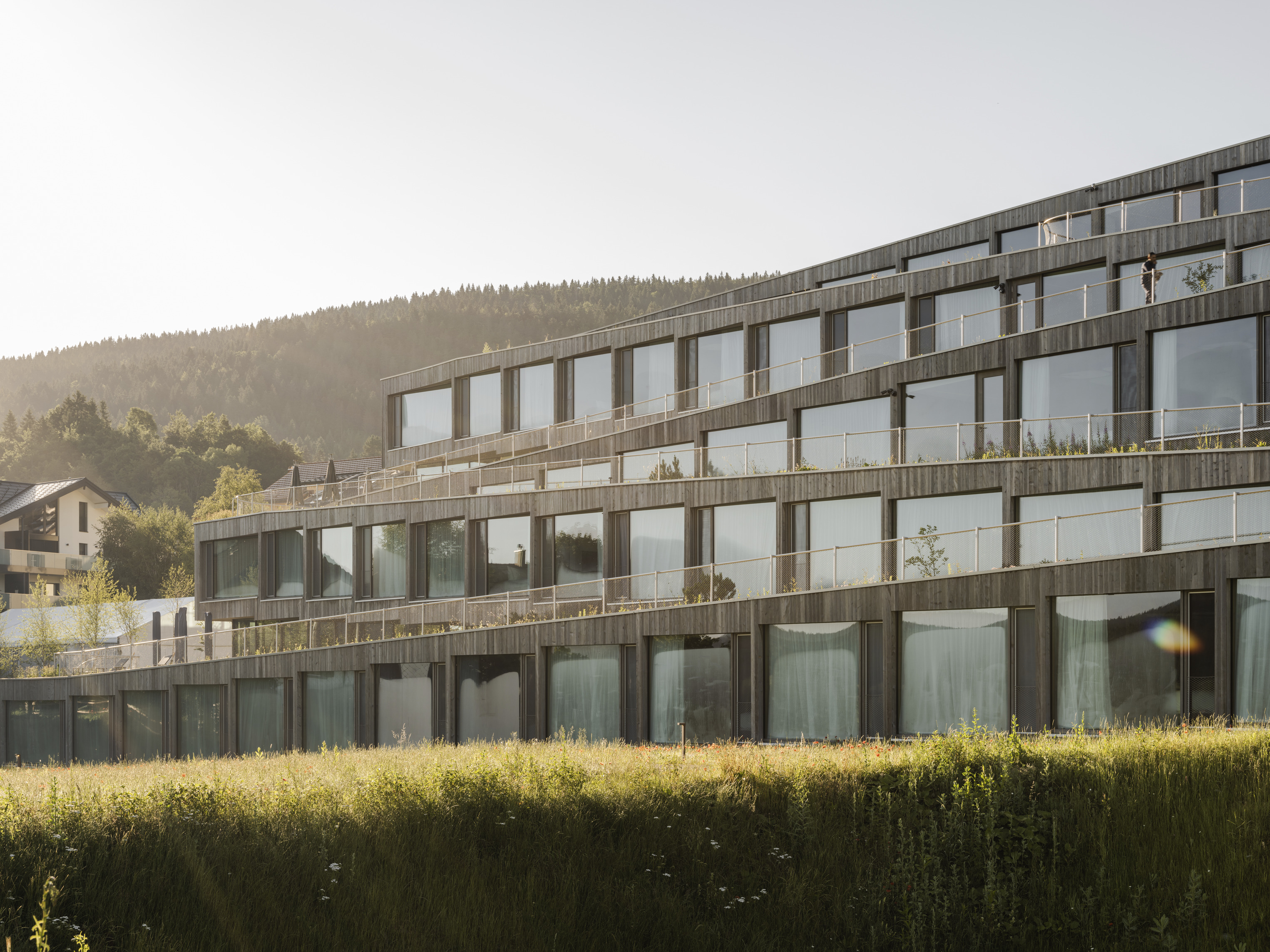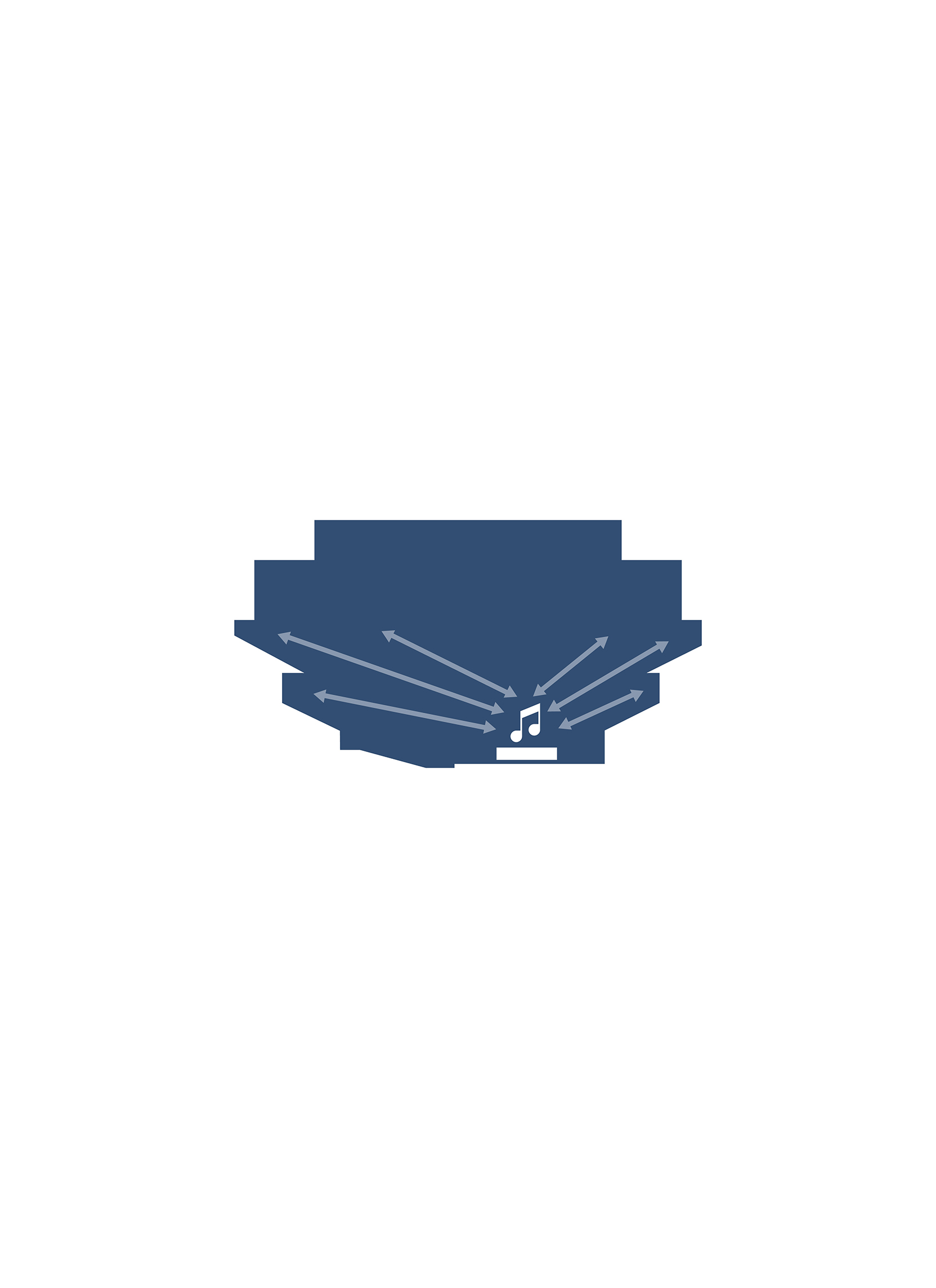 At the heart of the building, the main hall gathers the audience and performers within a room of gently curved balconies. Bands of horizontally layered timber wrap the interior, creating a continuous surface that carries sound evenly through the space.