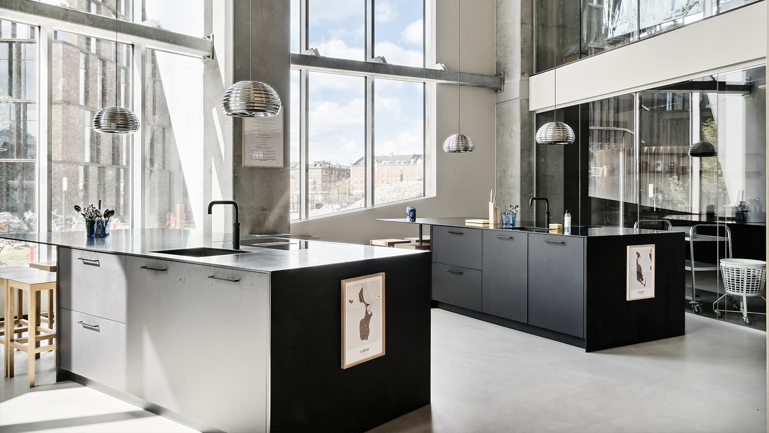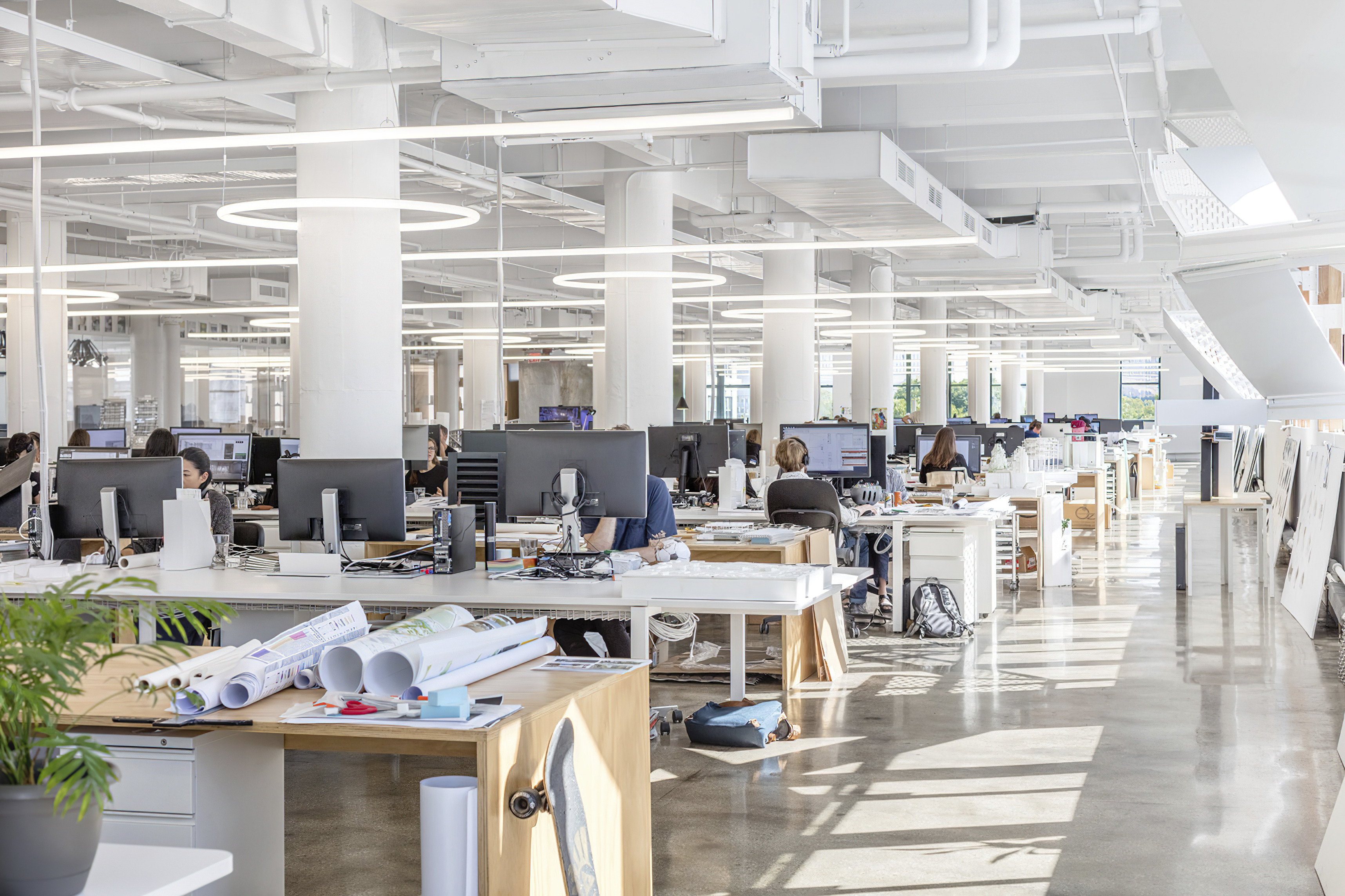 The office follows BIG’s signature palette of materials – galvanized steel and plywood millwork – reflecting the design language of other BIG offices. The plywood tables on wheels – which were designed in-house – are stationed in each desk row, acting as additional informal meeting spaces that encourage collaboration among teams and offer storage for materials and books.