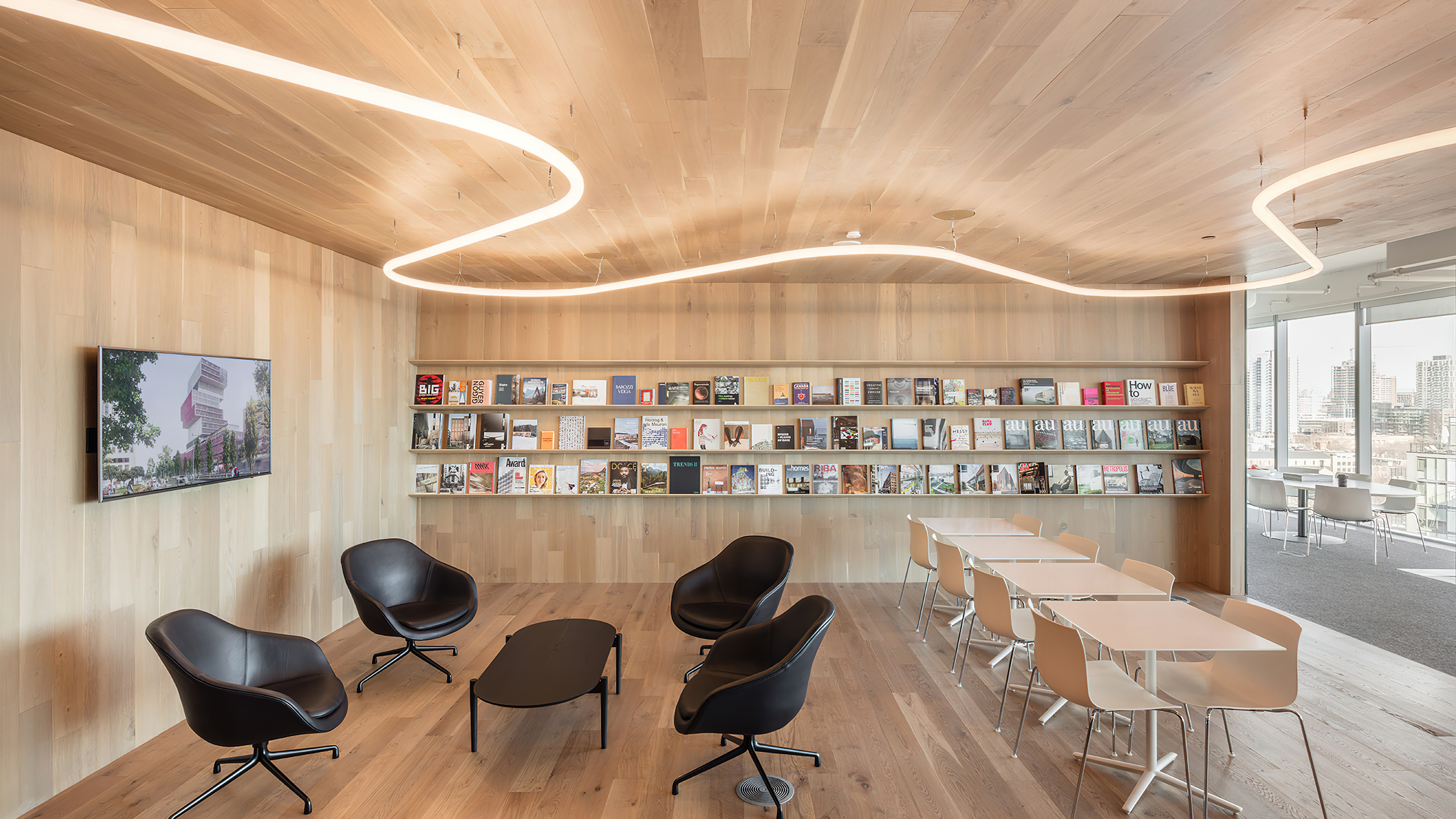 The simple palette of materials and bands of plywood millwork is known from BIG’s other offices.