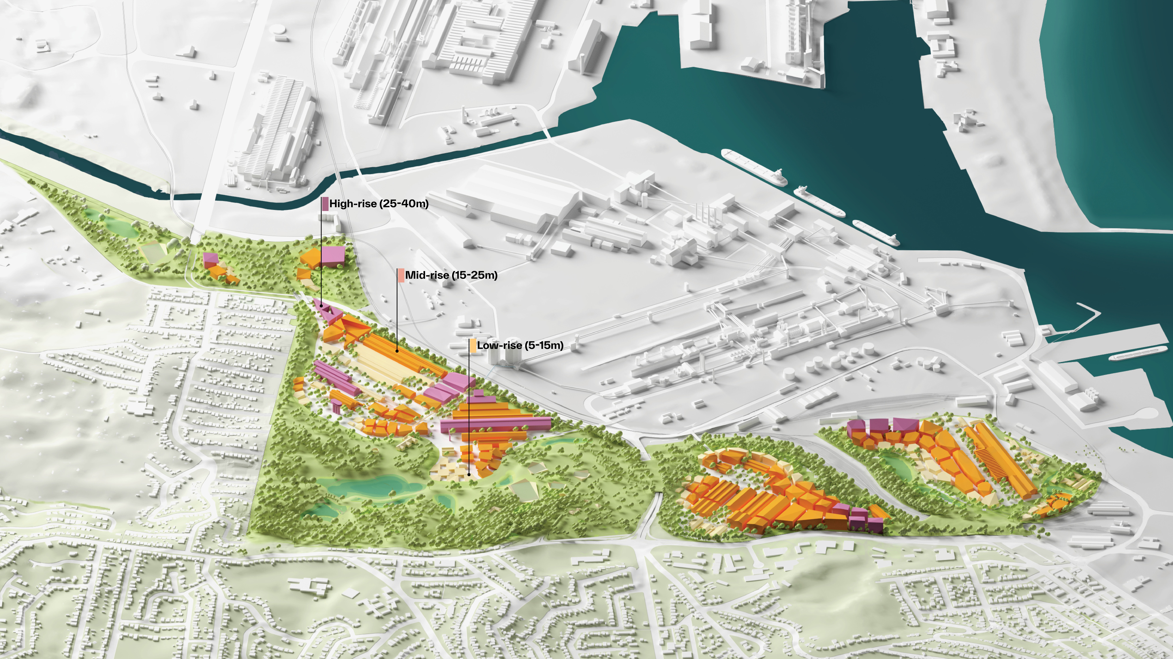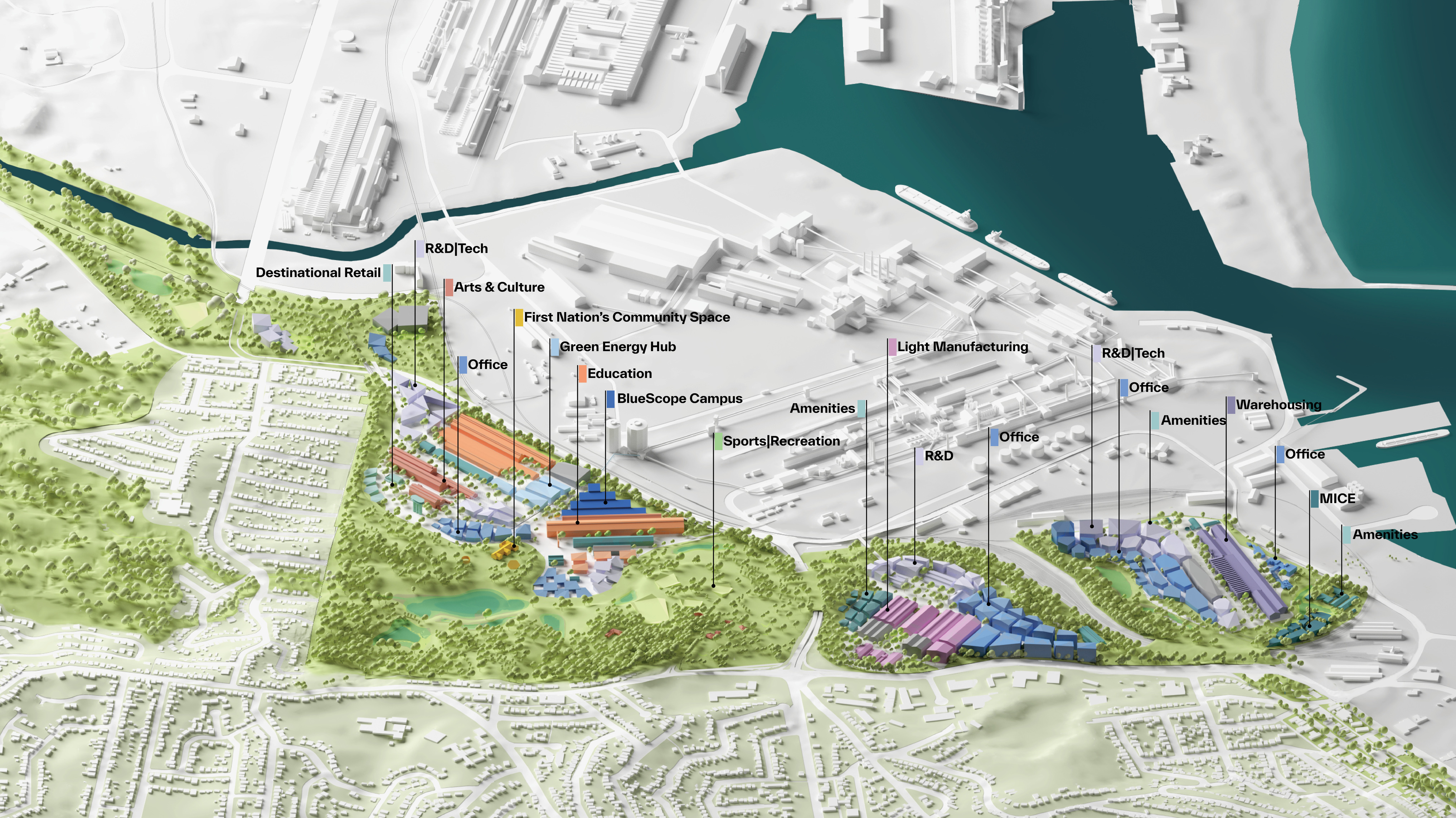 The Port Kembla Masterplan will regenerate 200 ha of surplus land adjoining Bluescope’s Port Kembla Steelworks southwest of Sydney, Australia, and transform the land from a closed off industrial site into a thriving precinct for community, advanced manufacturing, and green technologies. Having played a pivotal role in the Illawarra region for nearly a century, the masterplan envisions Port Kembla Steelworks for the next 100 years to come. The design aims to create facilities for innovation, training, and recreation, seizing 65% of the transformed site as green and blue space and open parklands, while acknowledging Country by addressing Ancestral knowledge and the Dharawal tradition.