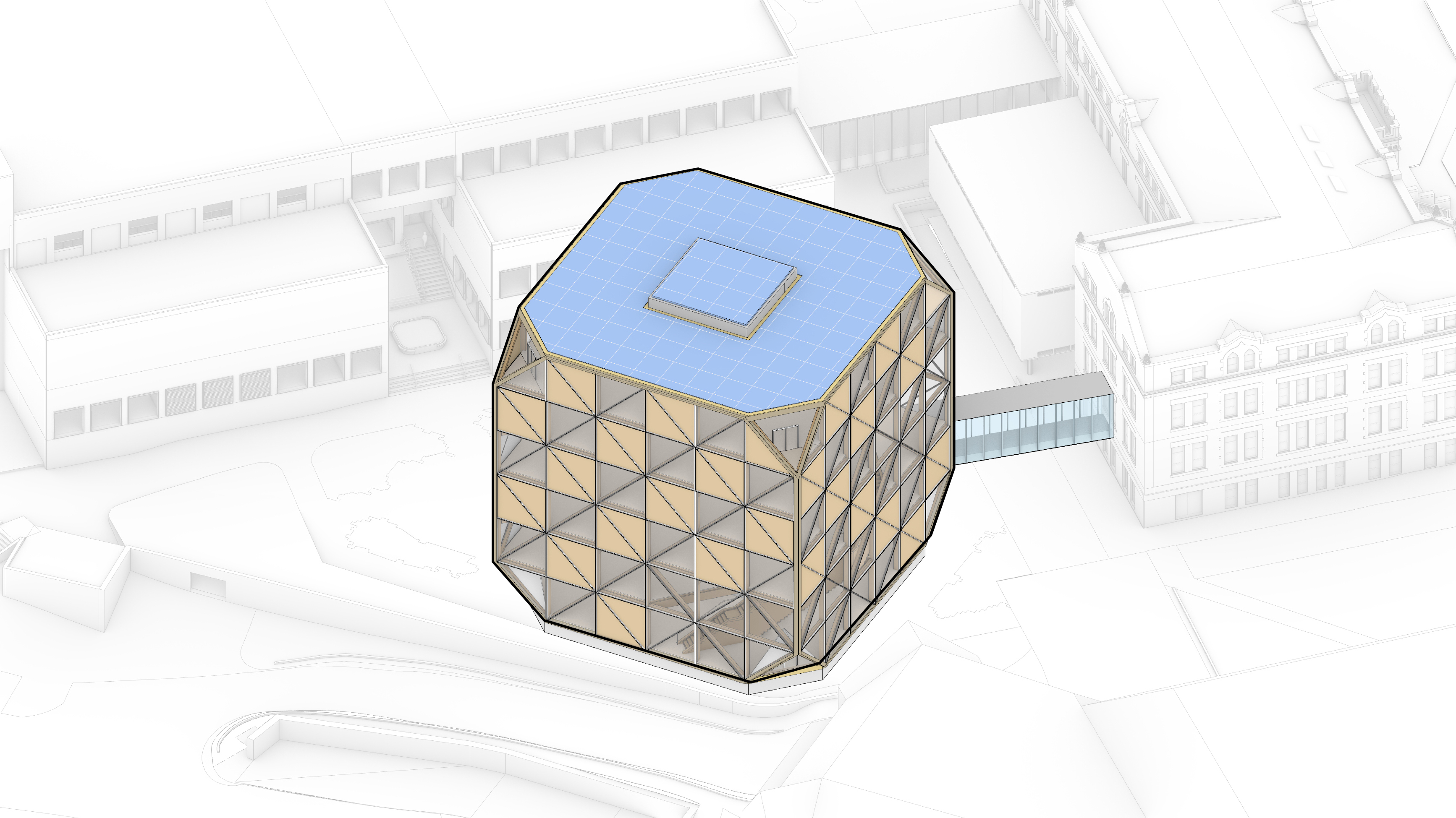 "Where student activities at Johns Hopkins University were once dispersed all over campus and all over town, they are now collected and clustered at the Bloomberg Student Center - a village of timber pavilions climbing the natural hill on the university’s edge. Like the indoor counterpart of The Beach - the circular sloping front lawn of the Homewood campus - the Student Center is open and inviting in all directions. Tugged into the topography, the center is a four-story building where every floor is directly accessible from the outside, from every side. As the individual timber pavilions join together, they leave generous openings in between, allowing daylight and views to reach every corner of the building. At its heart - underneath the solar paneled rooftops - the creative commons is a cascading, four seasons meeting space for students and faculty - academic, cultural, and social activities alike. The mass timber construction not only substantially reduces the embodied carbon footprint of the building, but also provides an atmosphere of welcoming warmth and inviting informality."