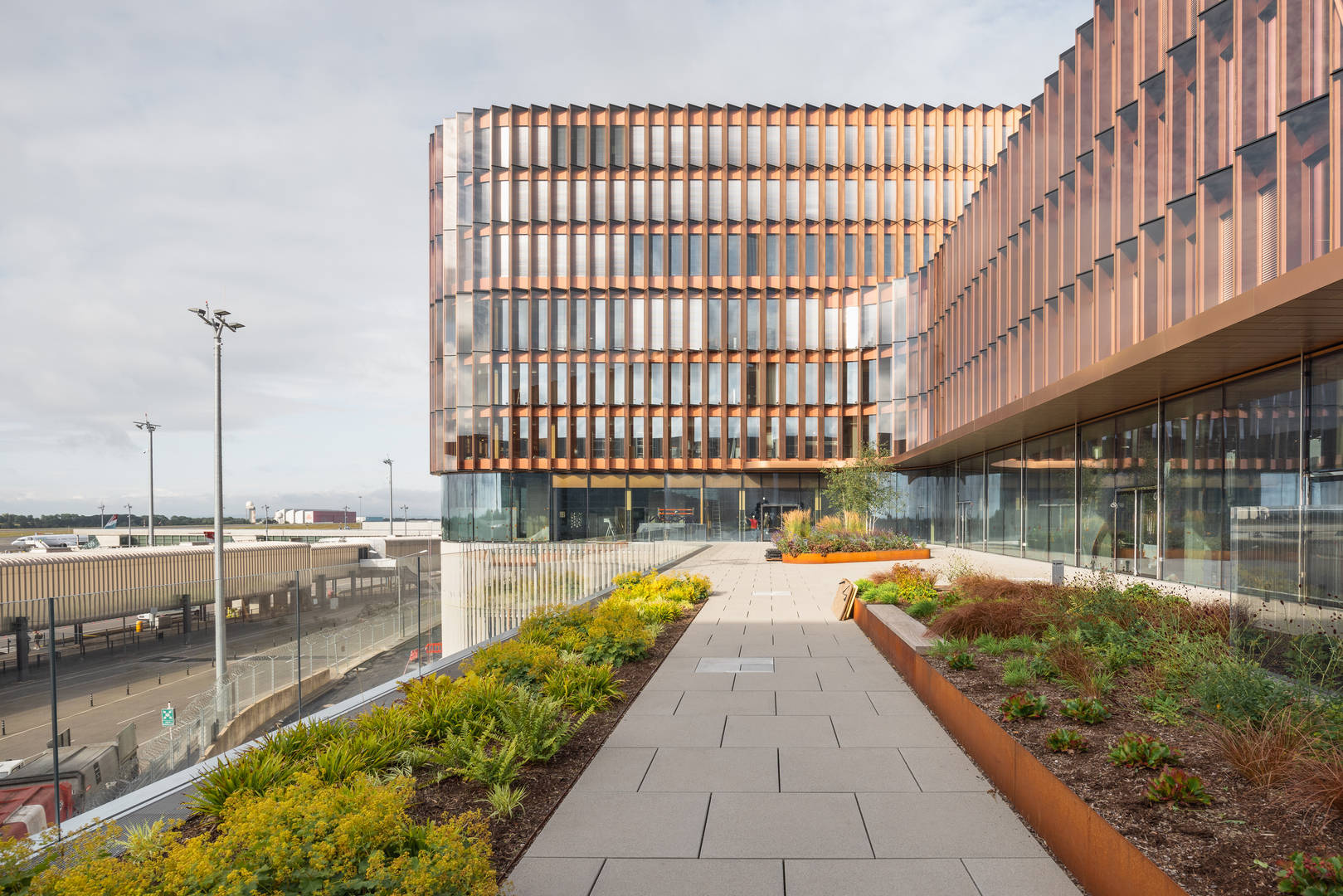 Zurich Airport’s new Dock A – designed by BIG, Itten+Brechbühl AG, Buro Happold, PIRMIN JUNG, NACO, EBP, Haerter & Partner AG, TLP, and many others – includes Schengen and Non-Schengen gates, airside retail, lounges, offices, the new air traffic control tower, and an extension of the immigration hall. The design is conceived as a mass timber space frame that is structural design, spatial experience, architectural finish, and organizational principle in one. The structure is made from timber, and the roof is entirely clad in solar shingles, turning sunlight into a power source.